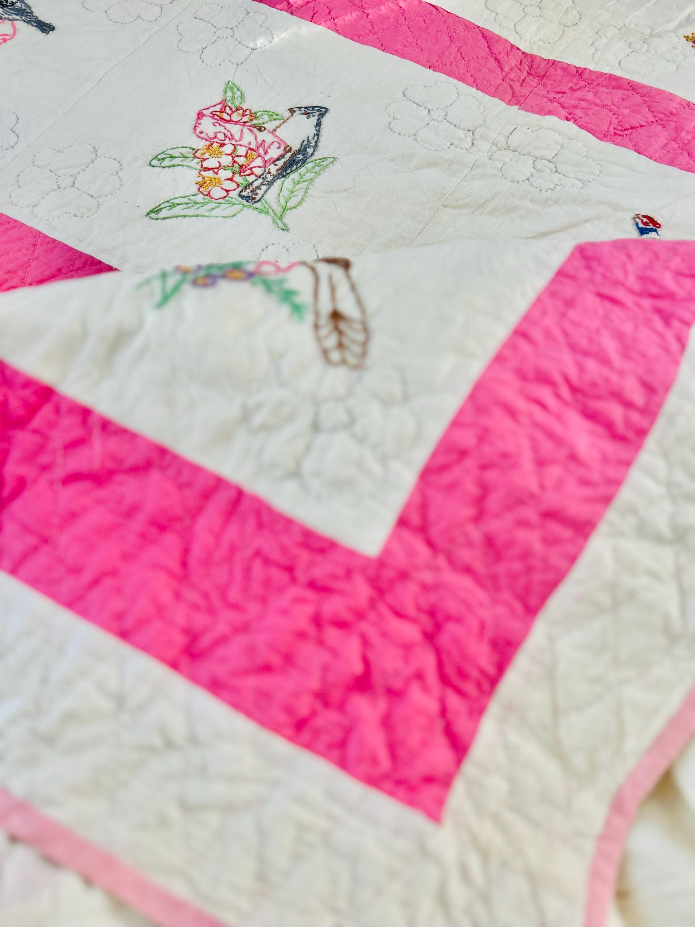 It has a four-sided border of a pink and white stripes. The back is white cotton while the binding is light pink that has been hand-stitched to both sides. The cotton batting is-lightweight.