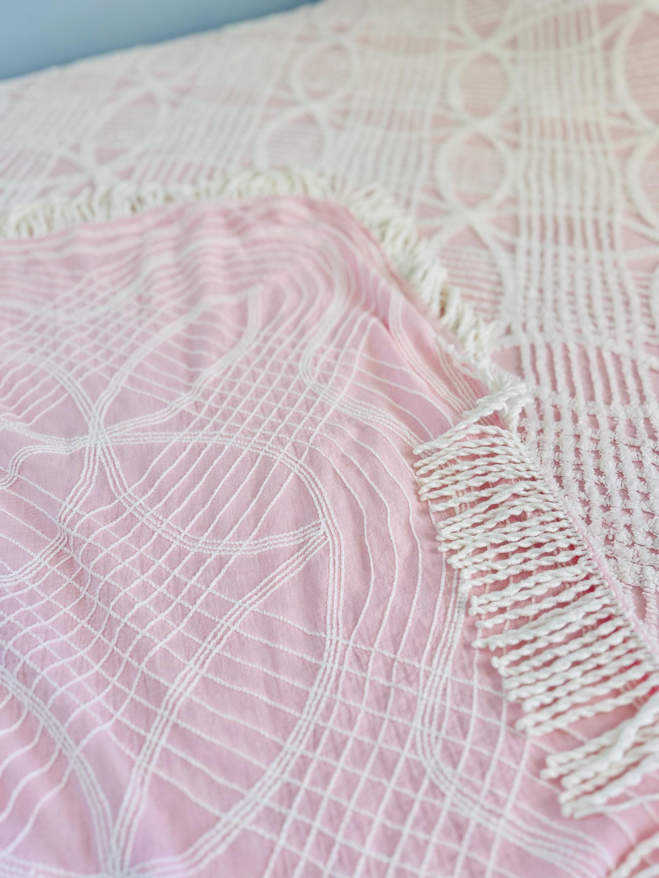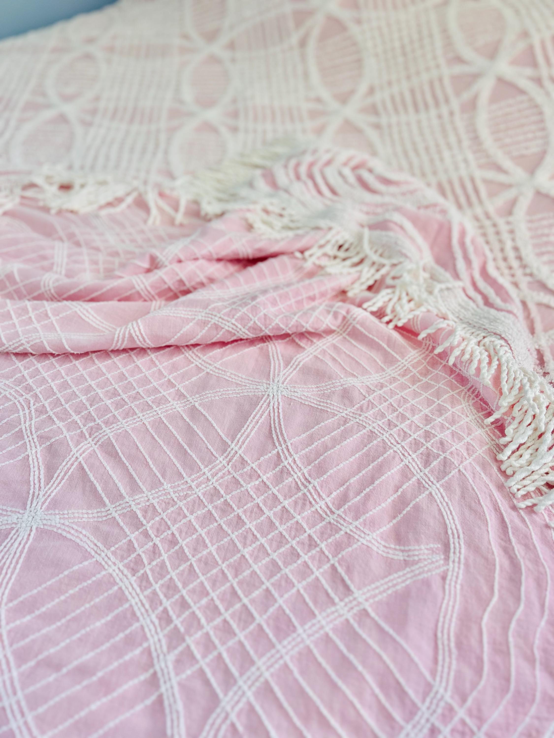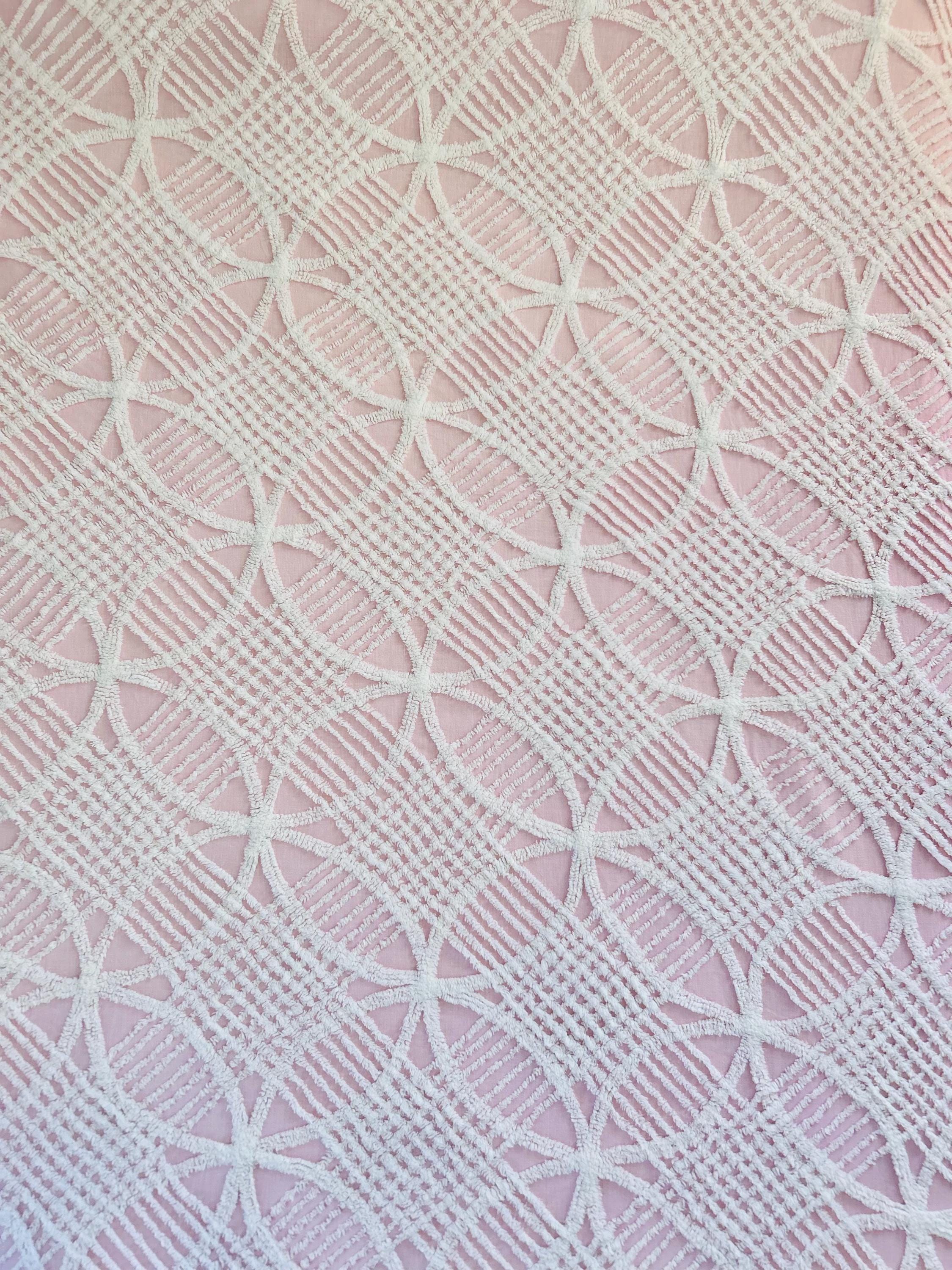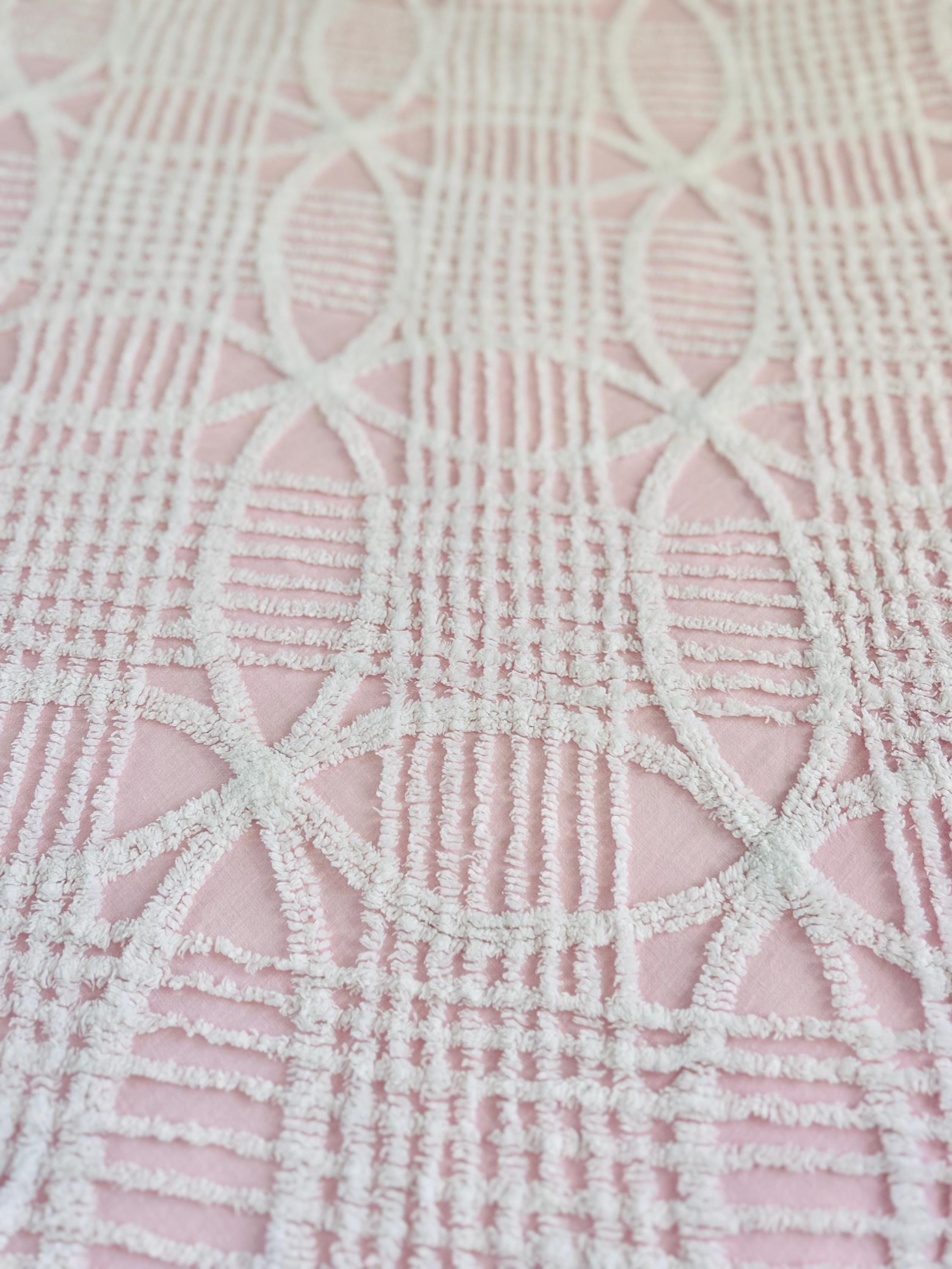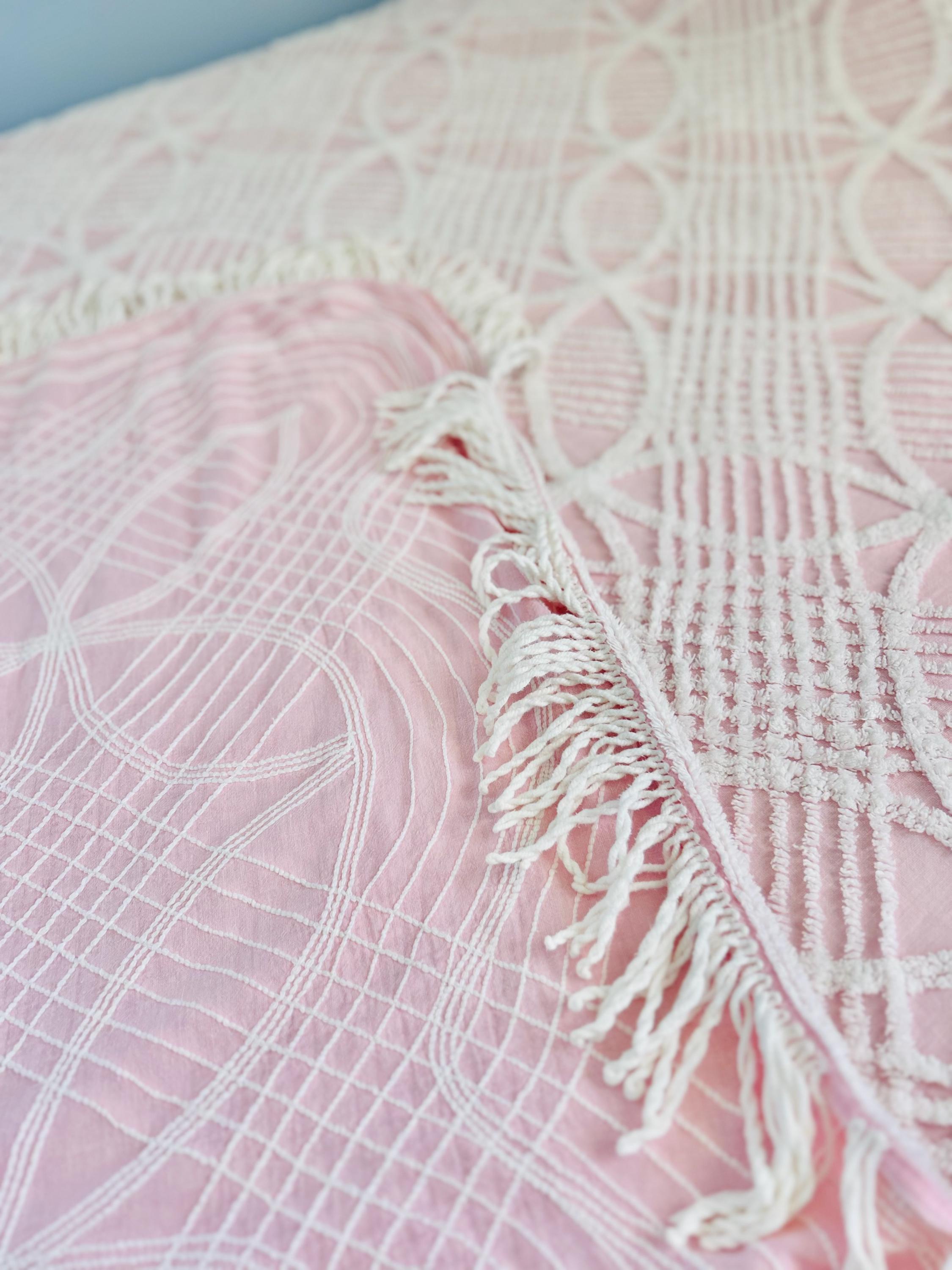 Pink and White Mid-Century Modern Chenille bedspread, 1950-1960s. It is in excellent condition - pink and lovely with no bald spots, holes or stains. It has white fringe around three sides. (see photos).