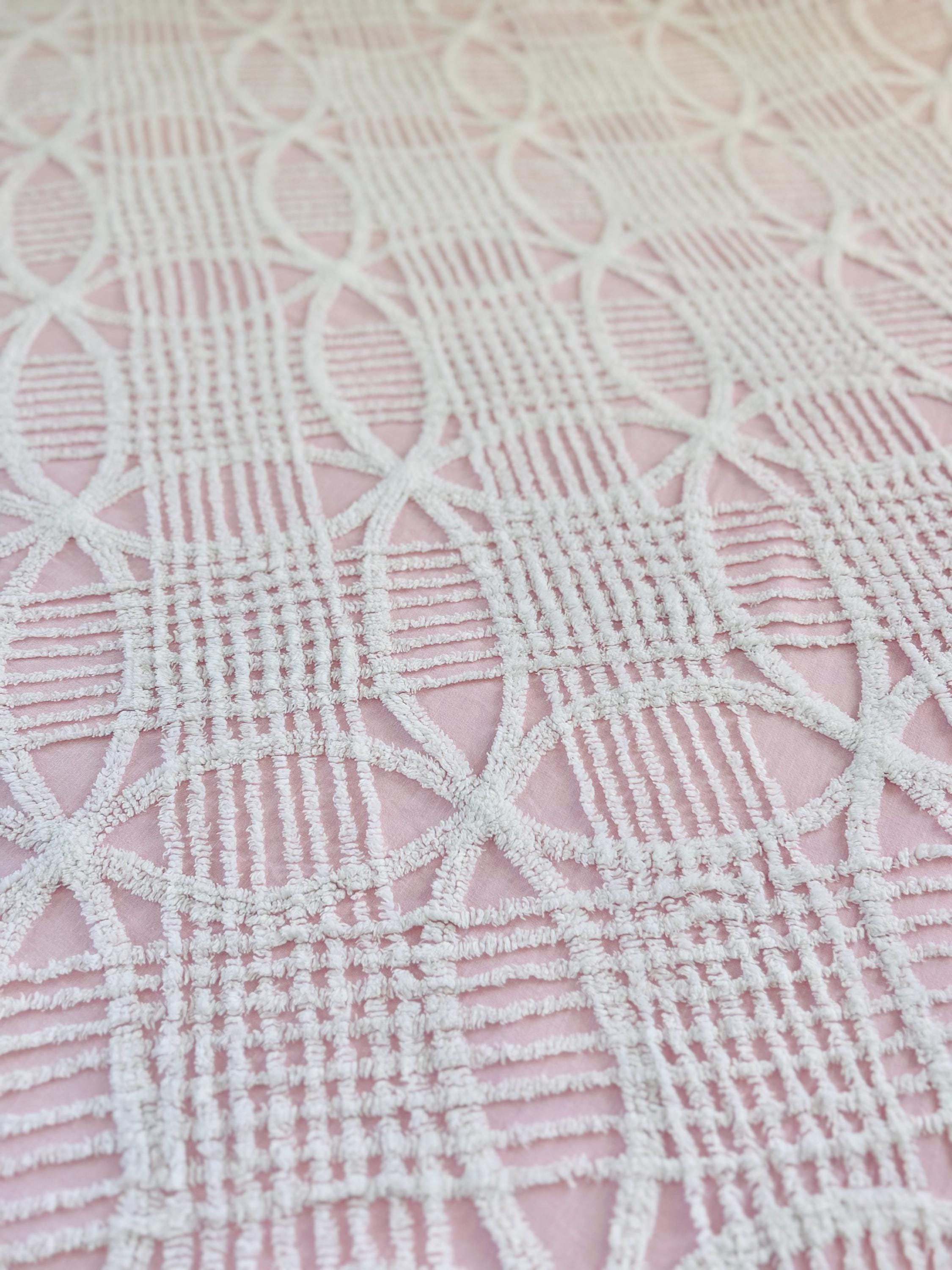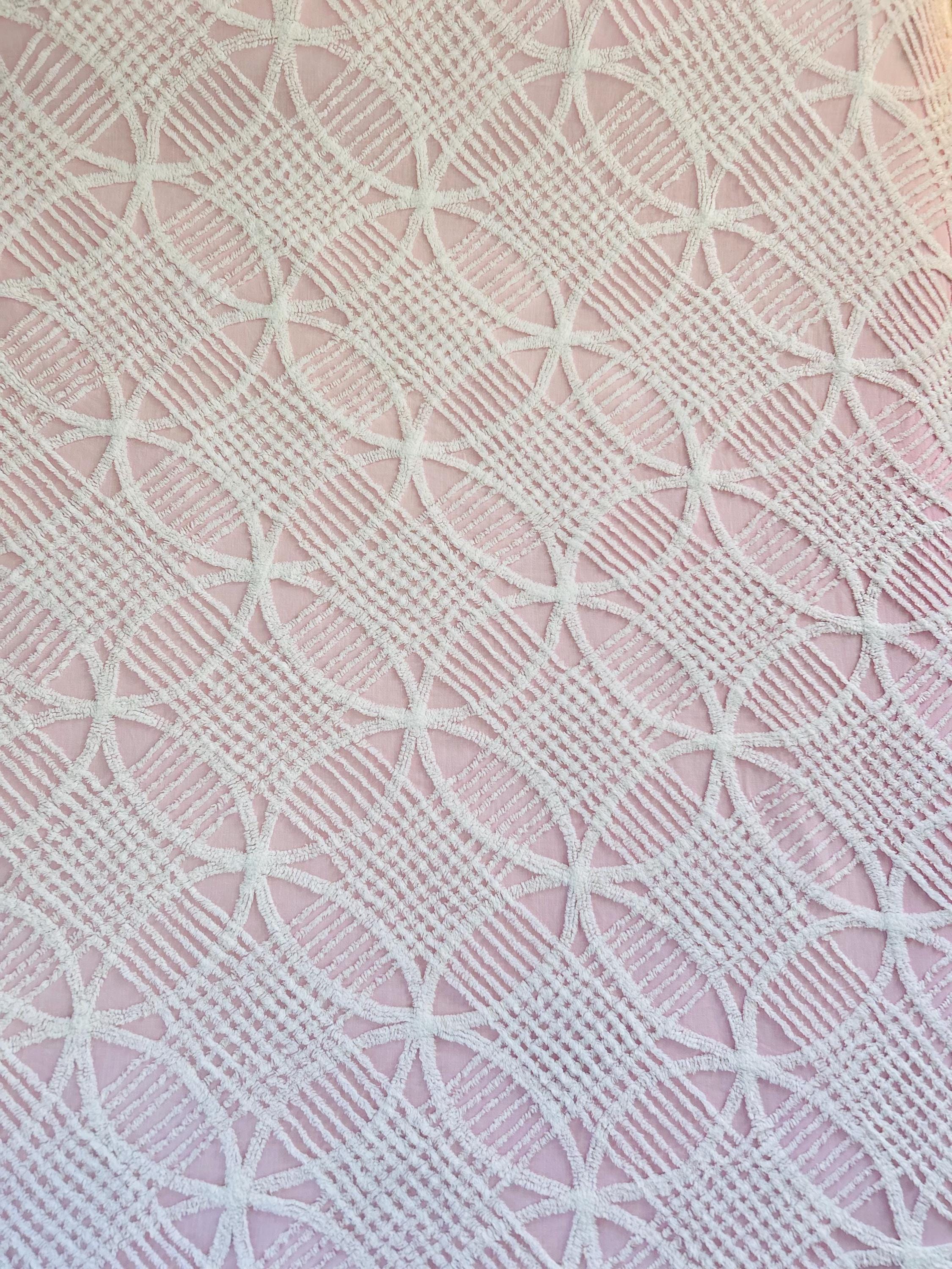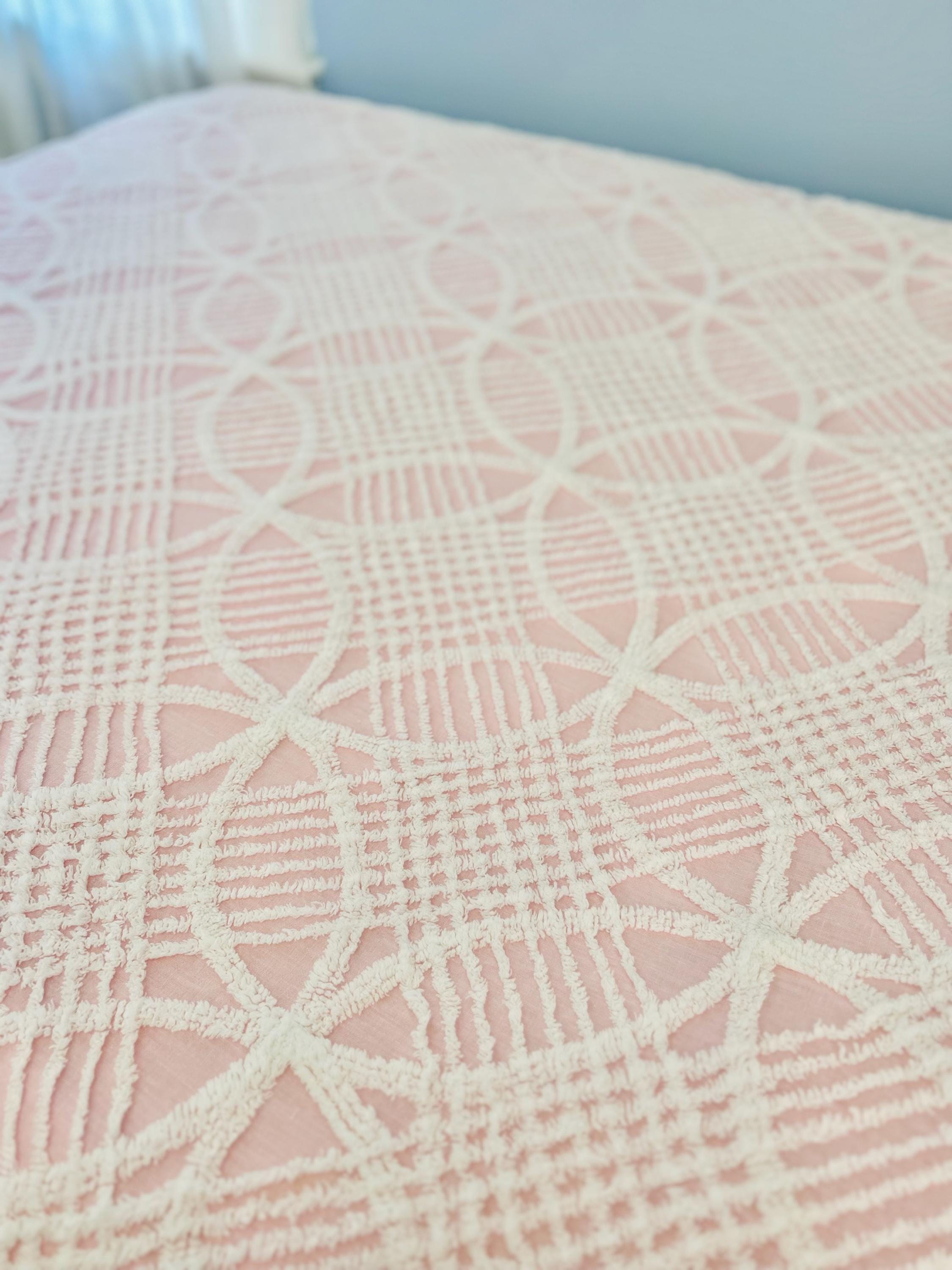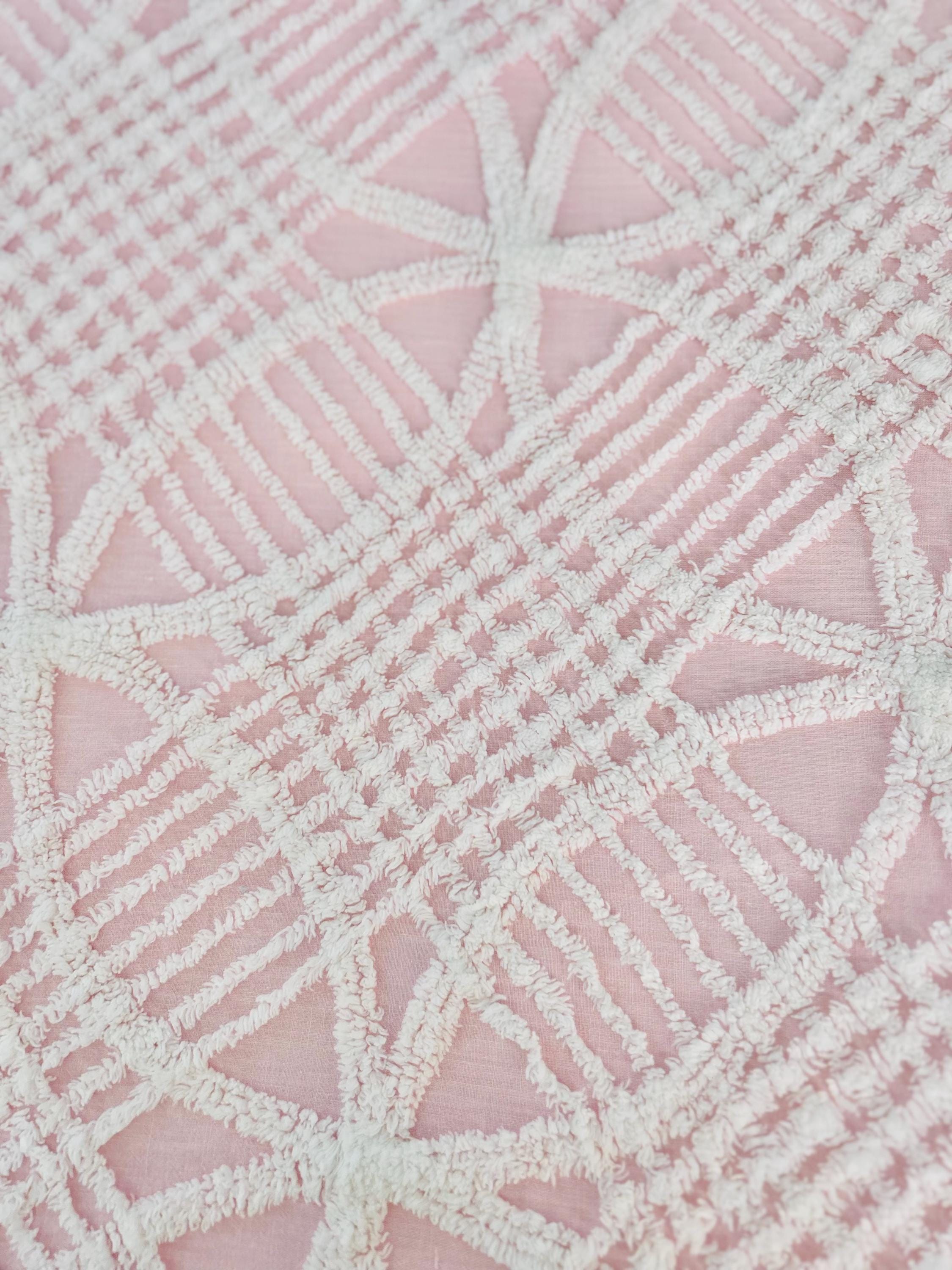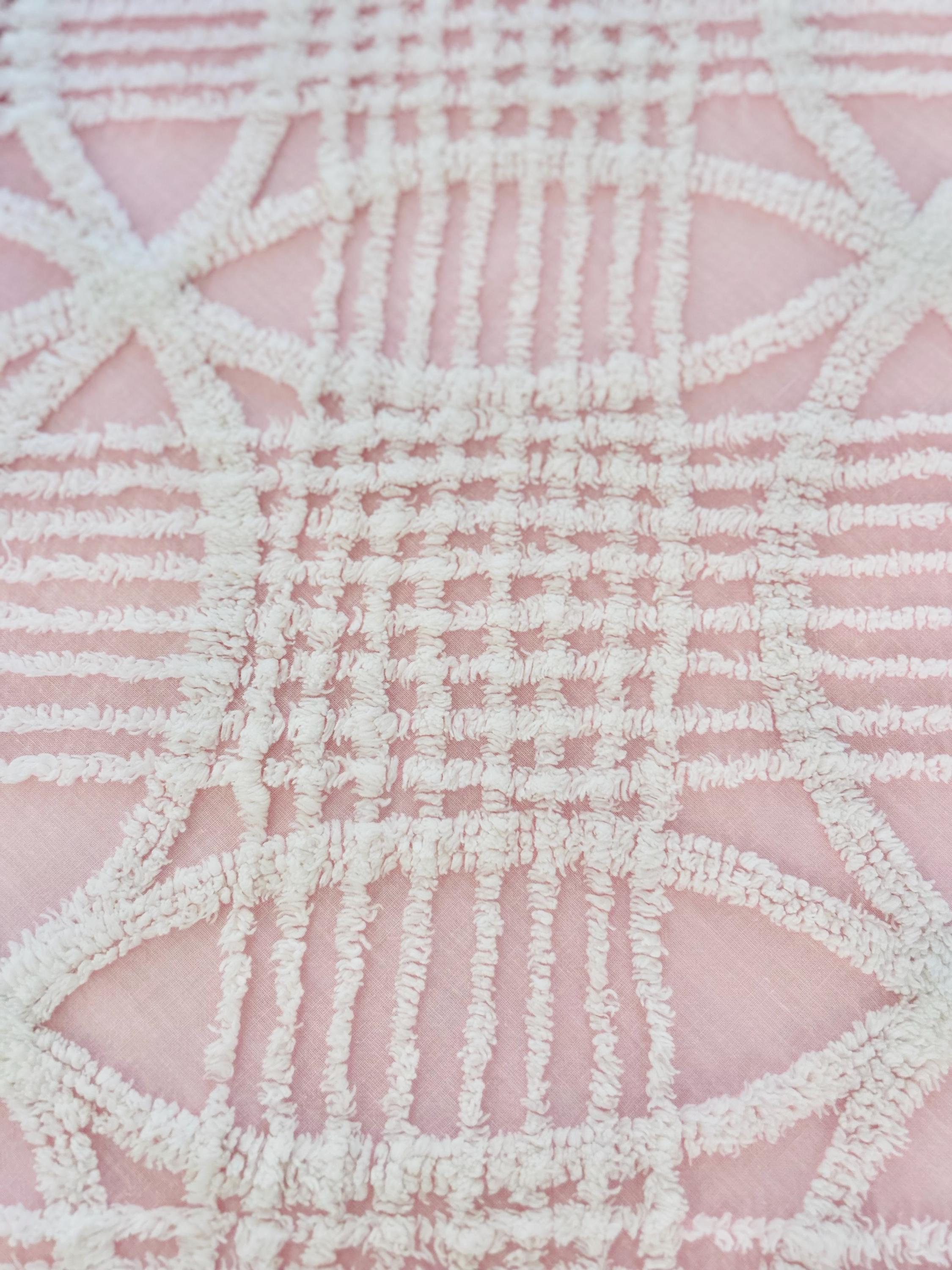 Pink and White Mid-Century Modern Chenille bedspread, 1950-1960s. It is in excellent condition - pink and lovely with no bald spots, holes or stains. It has white fringe around three sides. (see photos).