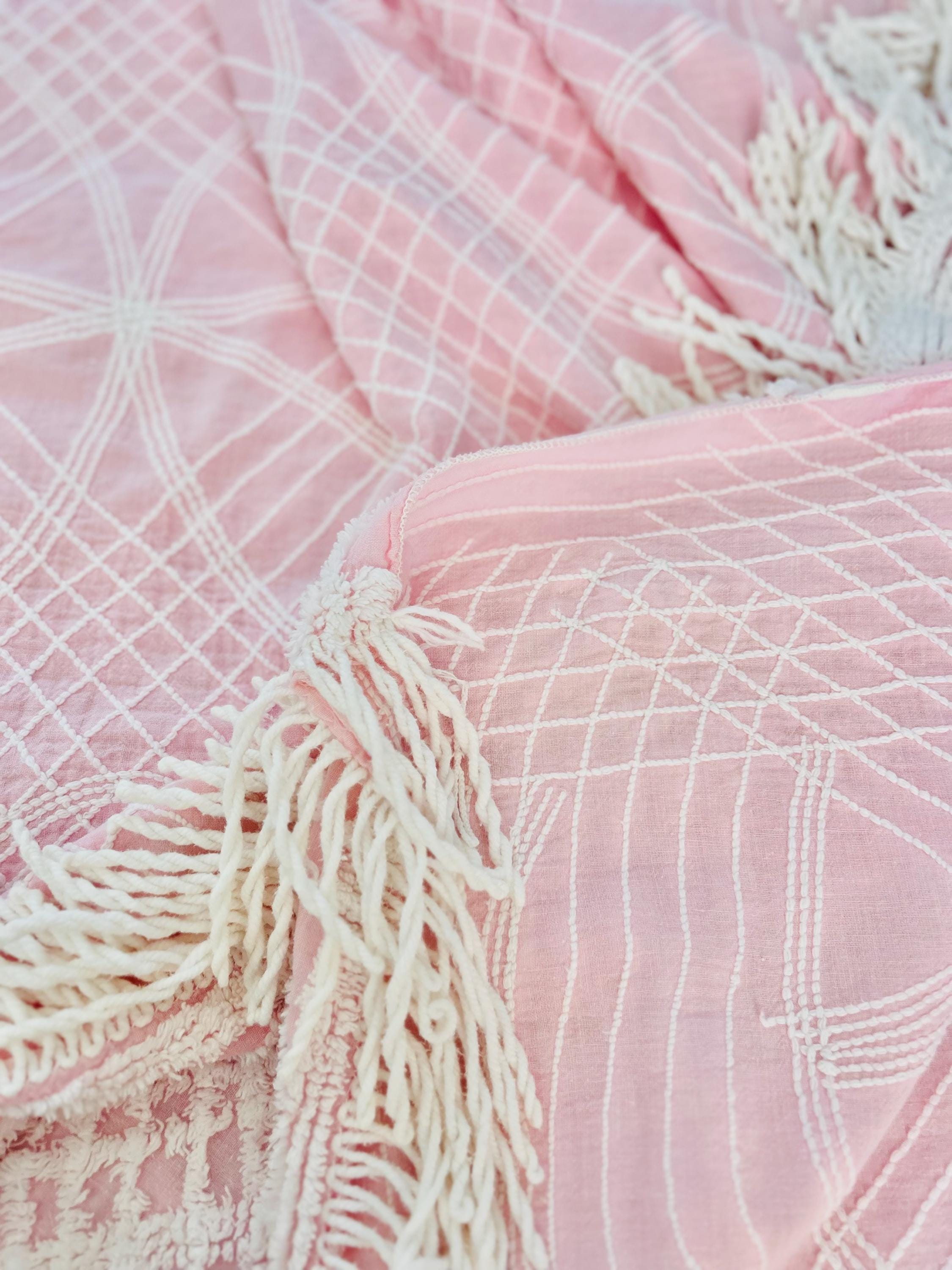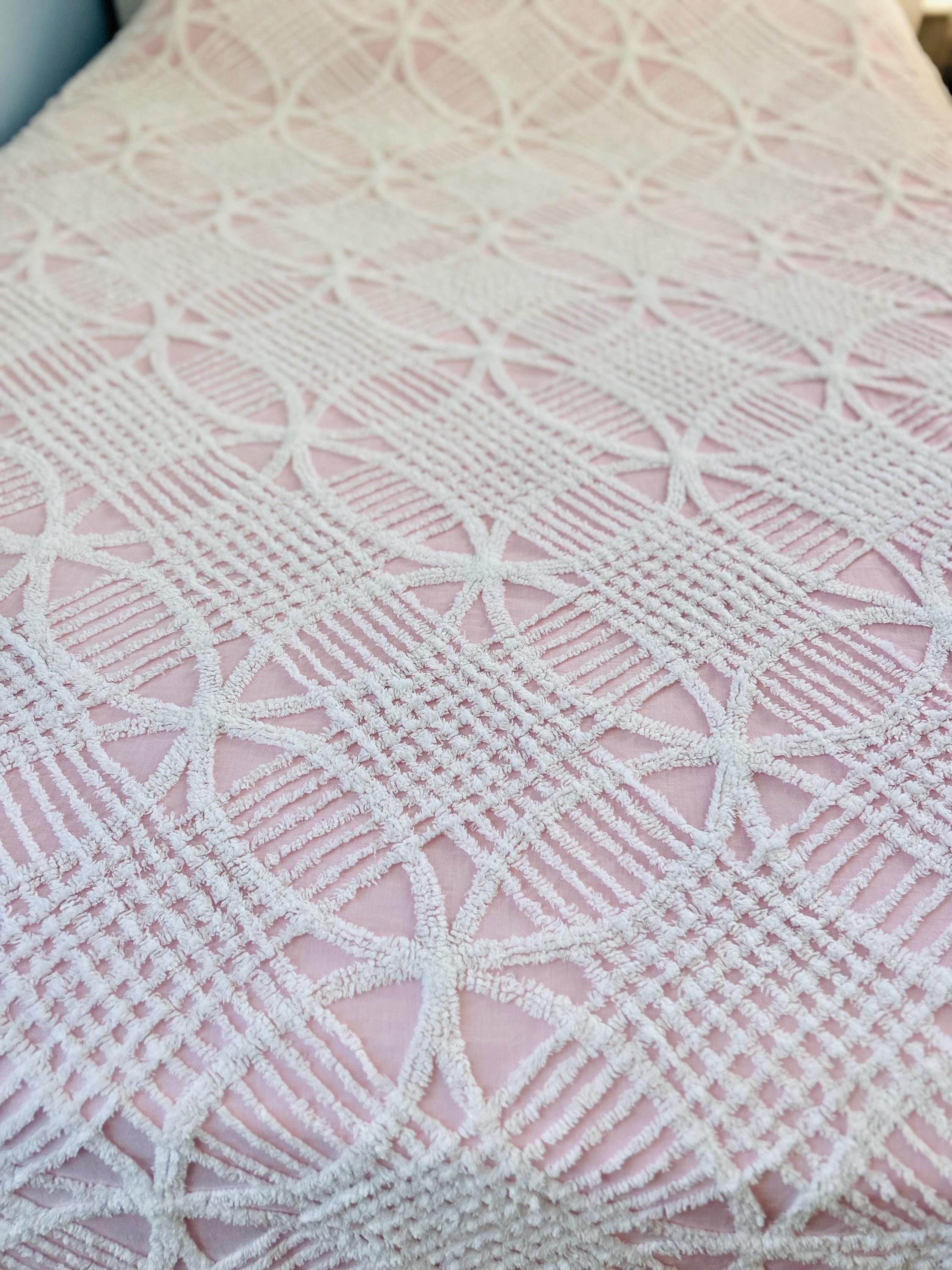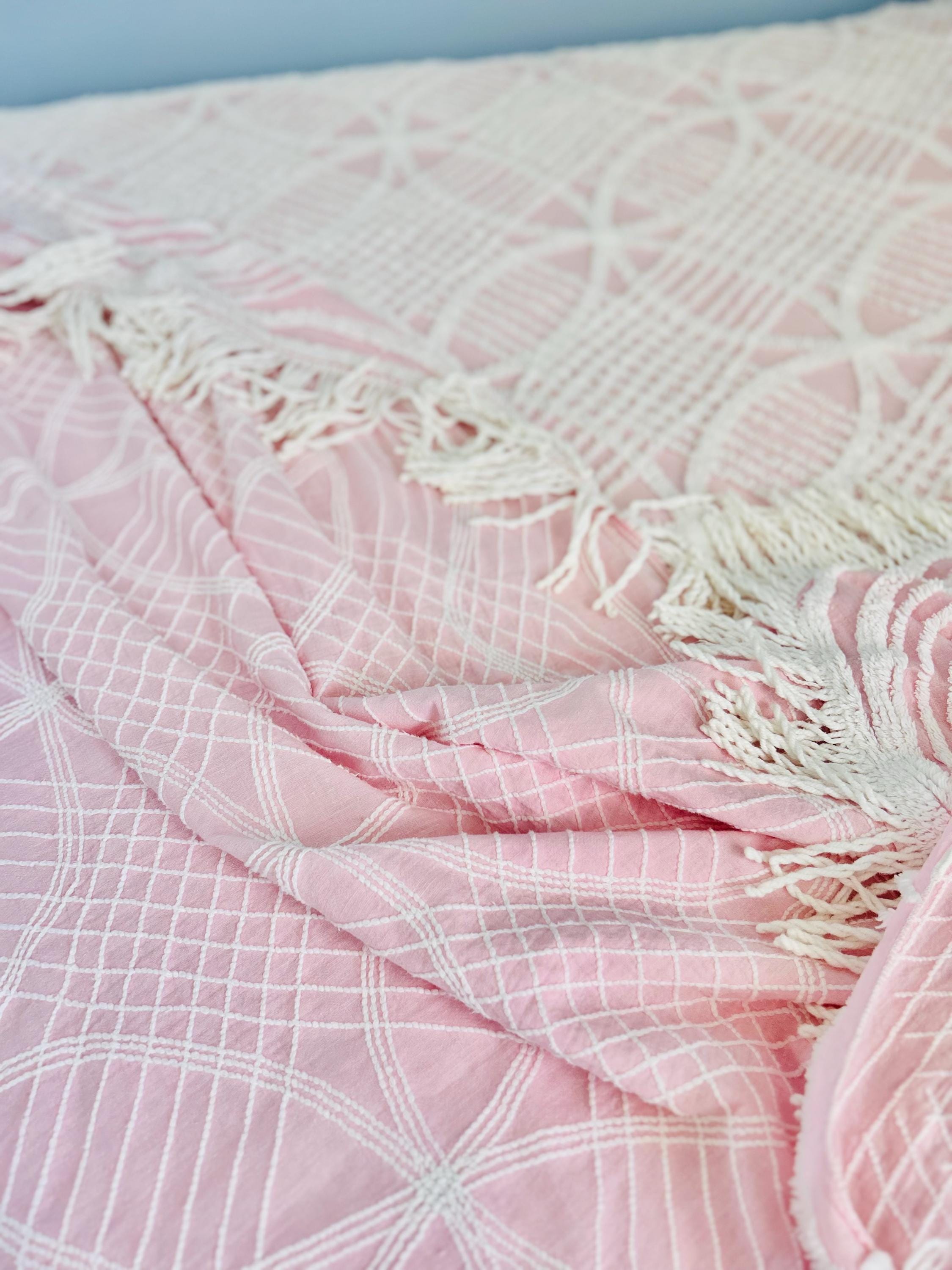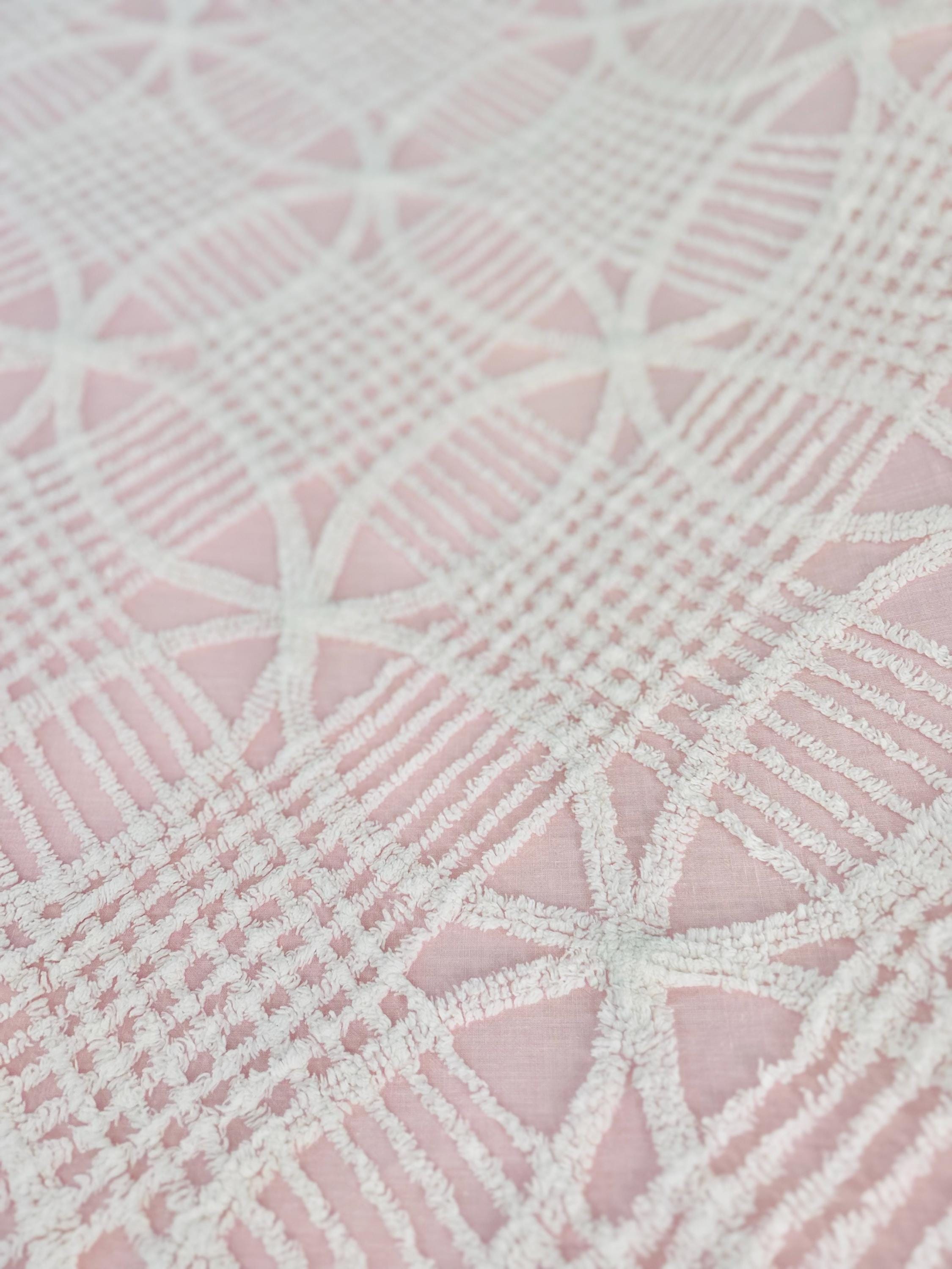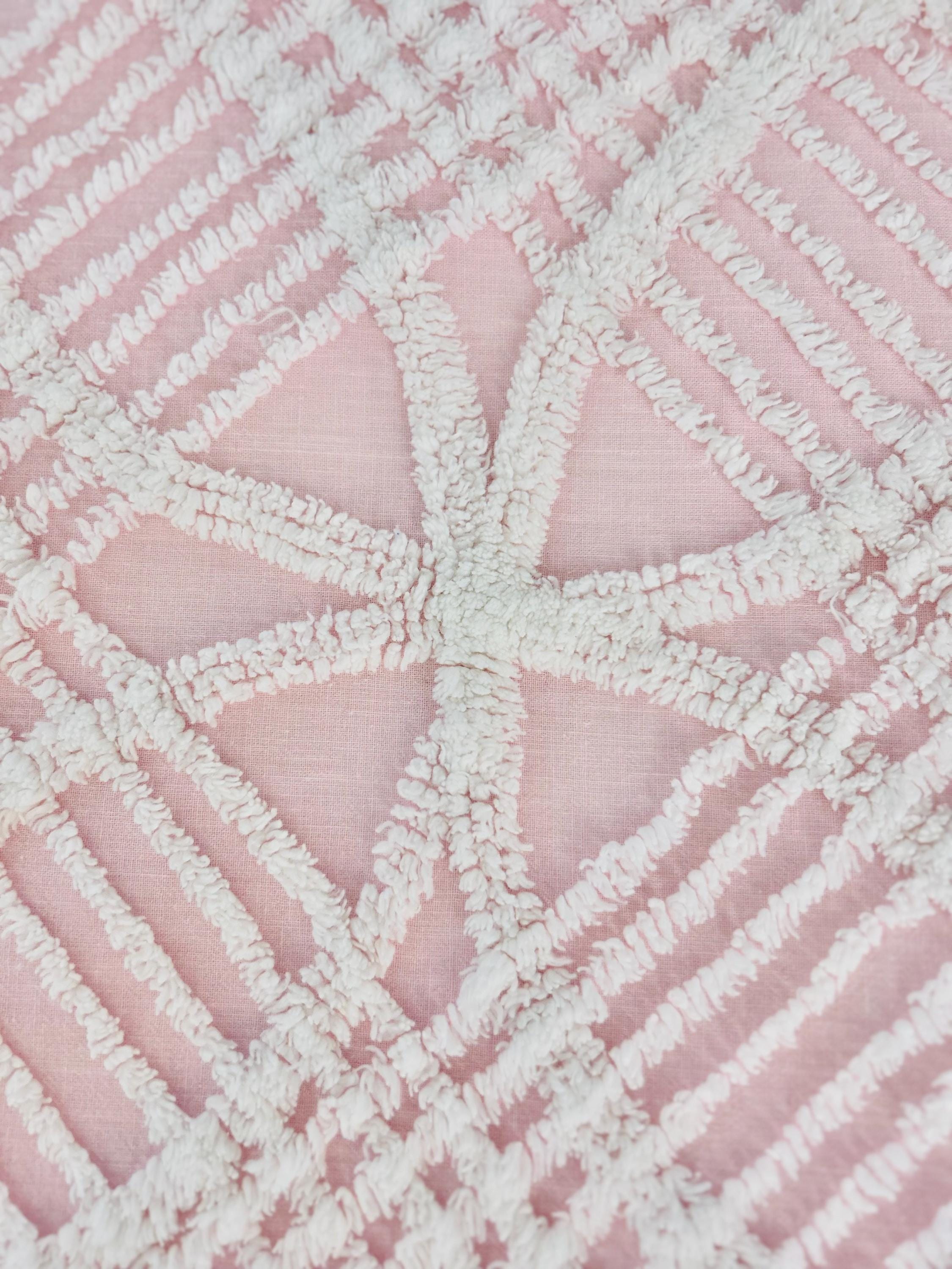 Pink and White Mid-Century Modern Chenille bedspread, 1950-1960s. It is in excellent condition - pink and lovely with no bald spots, holes or stains. It has white fringe around three sides. (see photos).