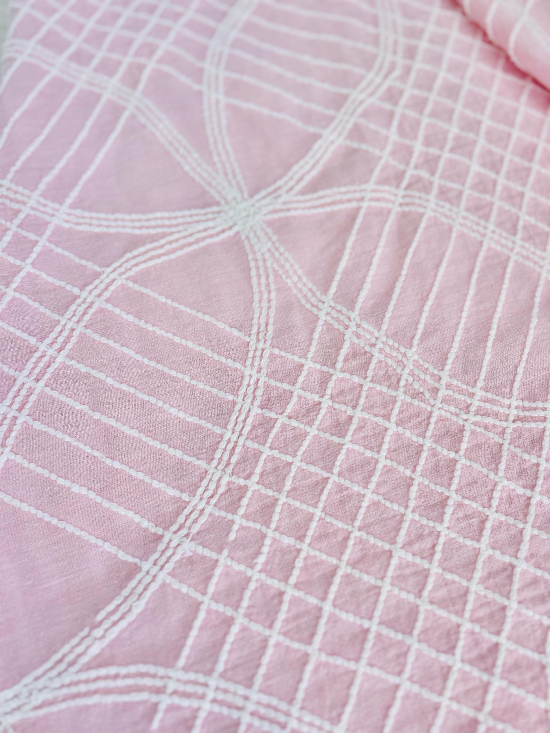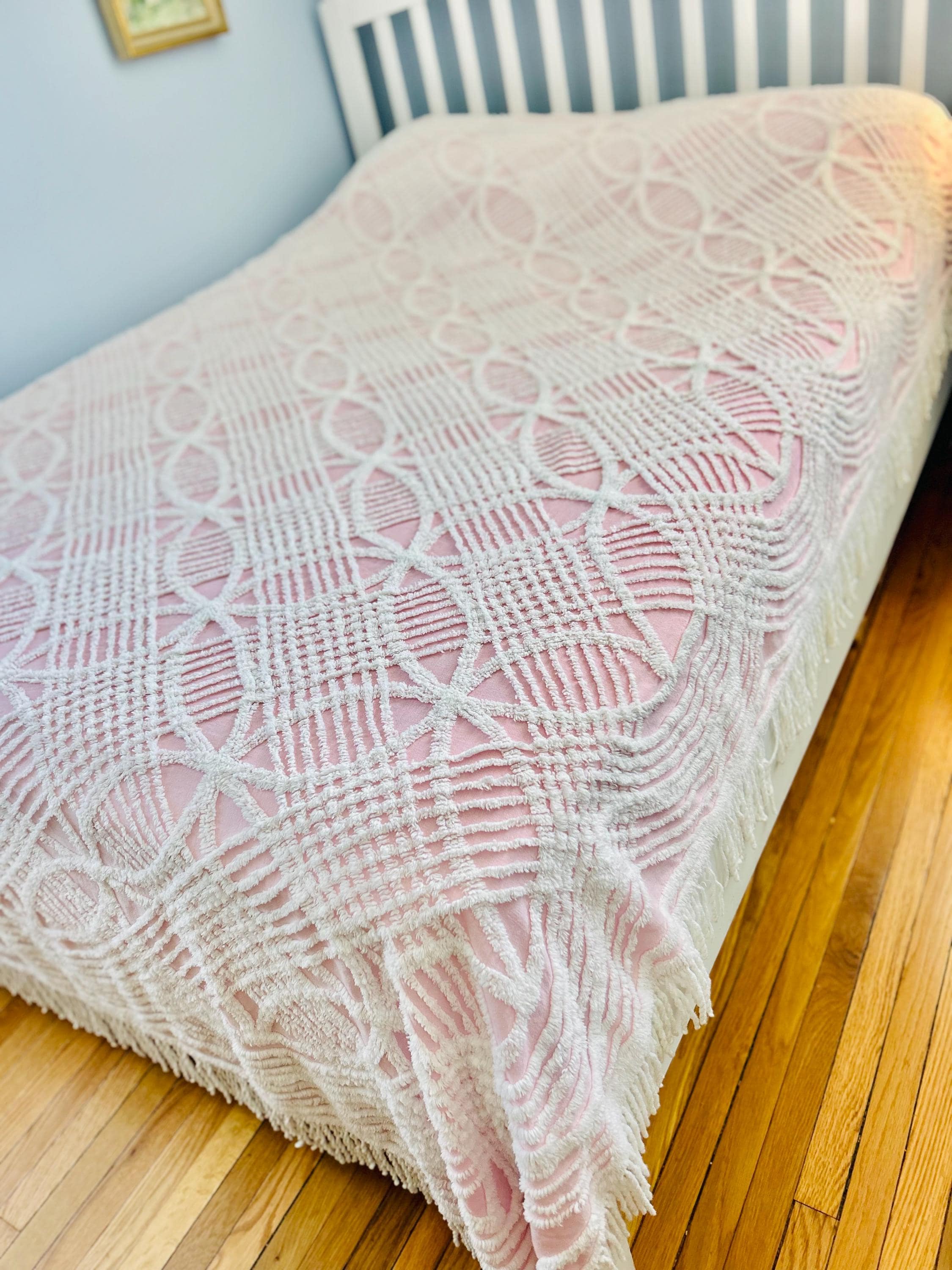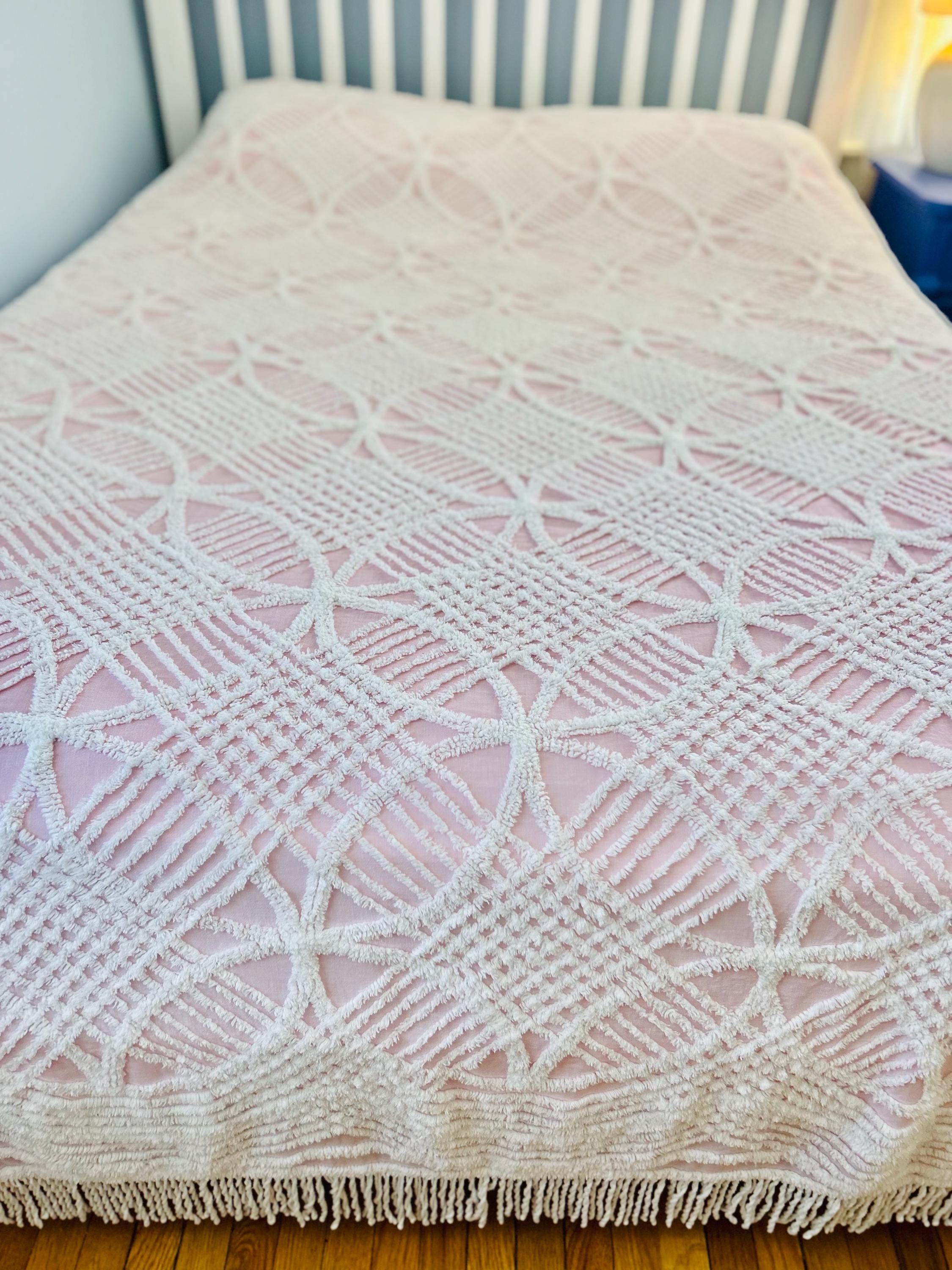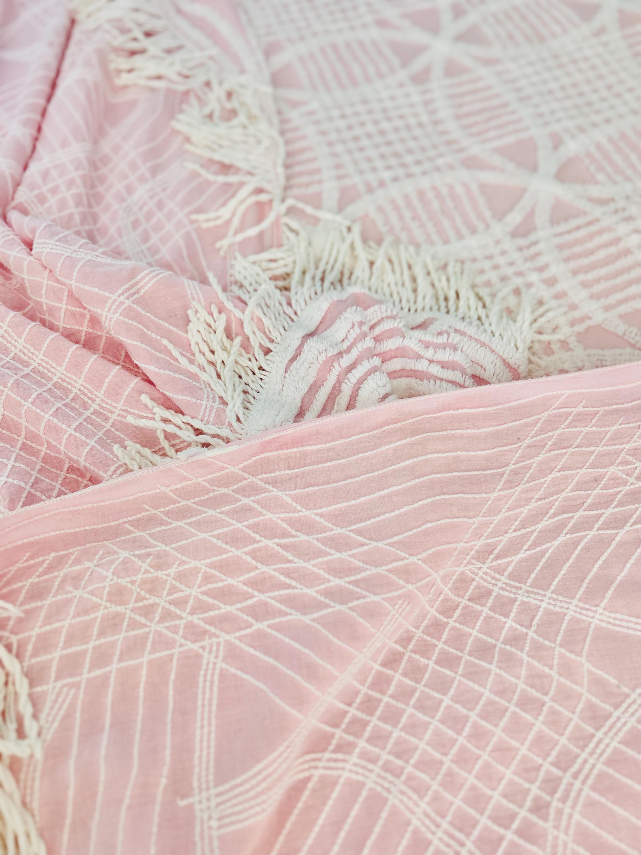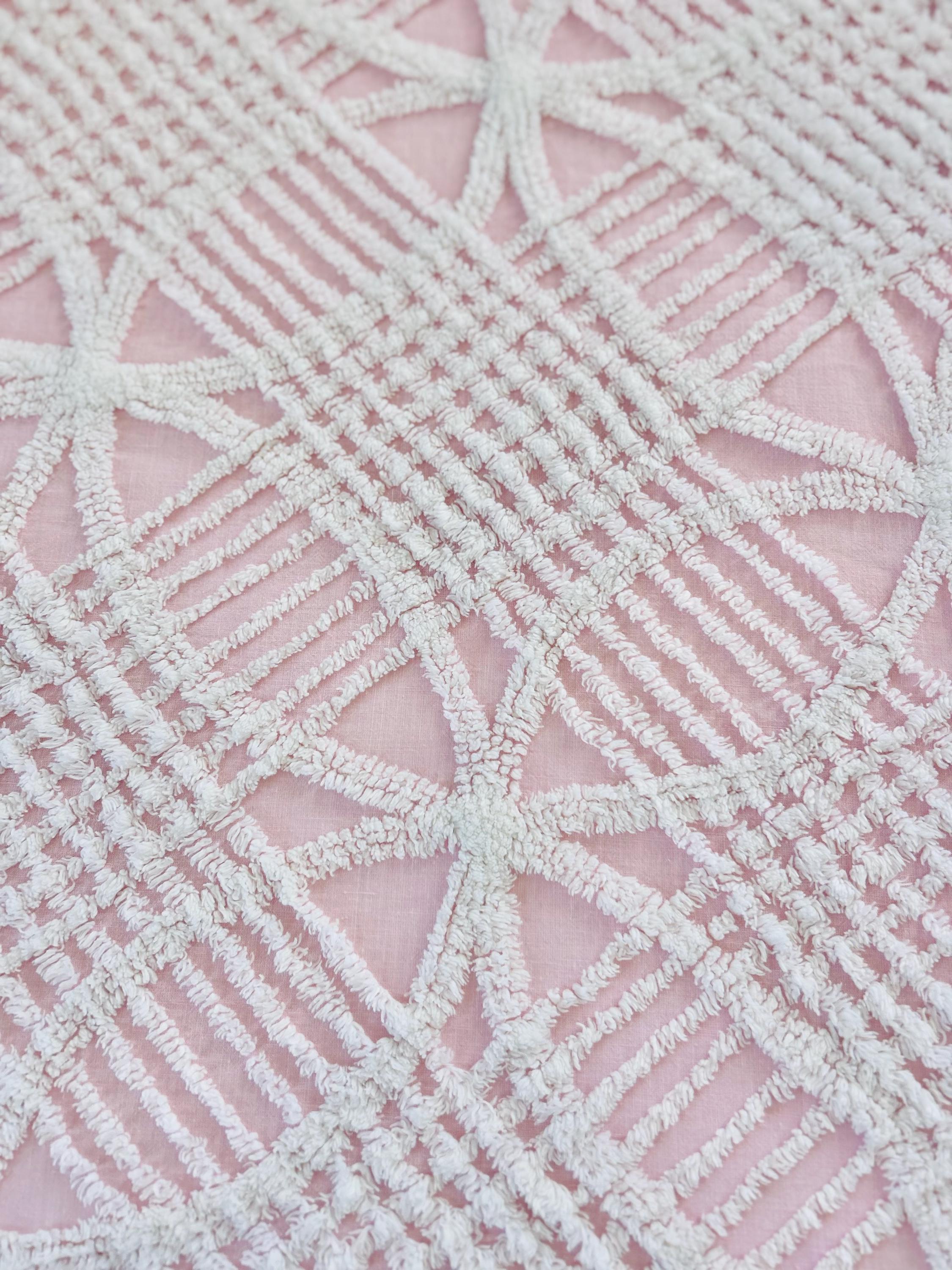 Pink and White Mid-Century Modern Chenille bedspread, 1950-1960s. It is in excellent condition - pink and lovely with no bald spots, holes or stains. It has white fringe around three sides. (see photos).