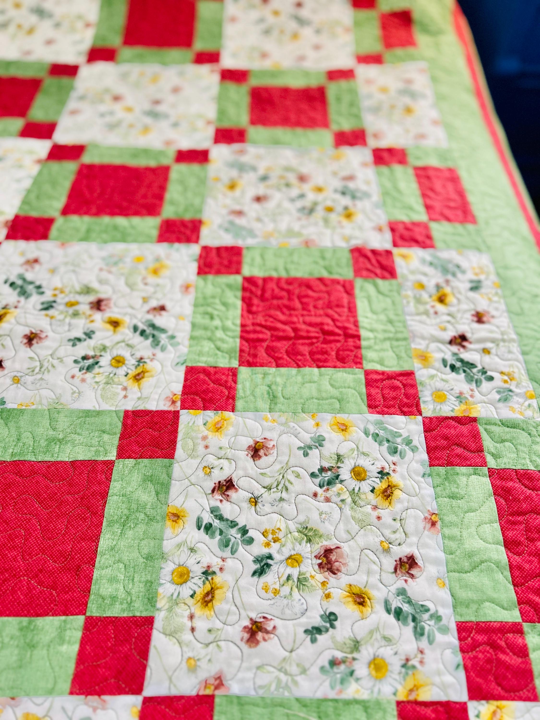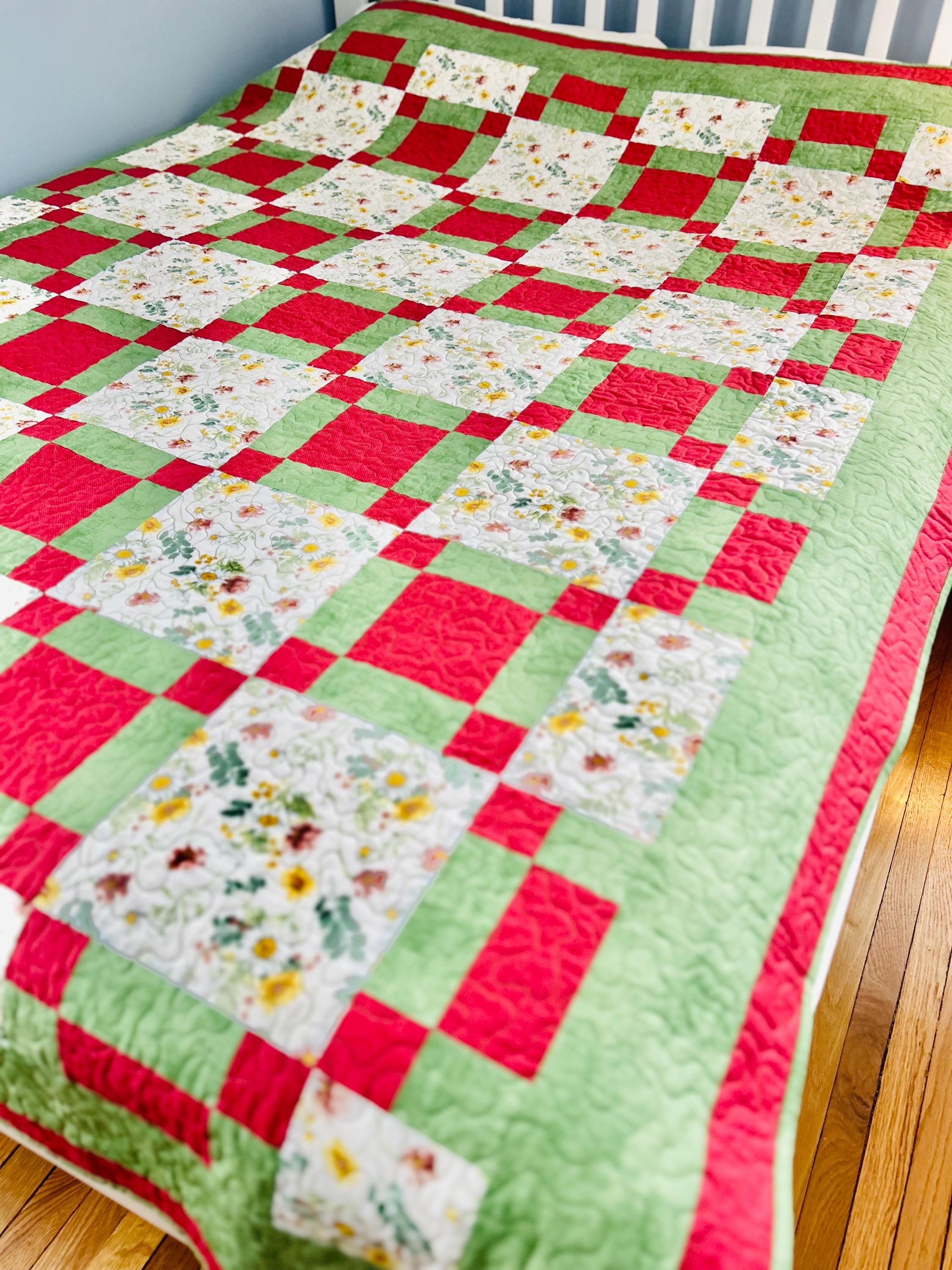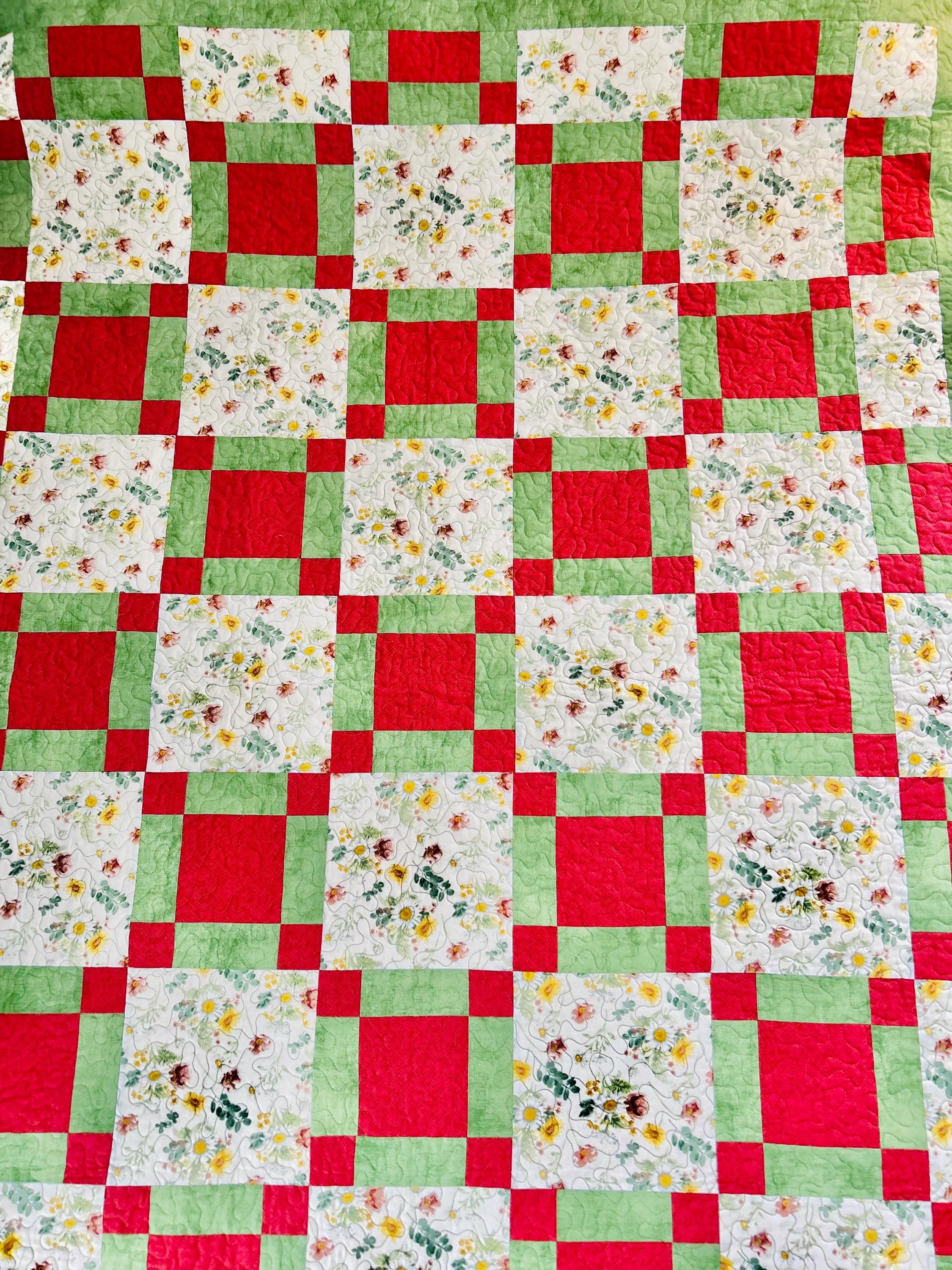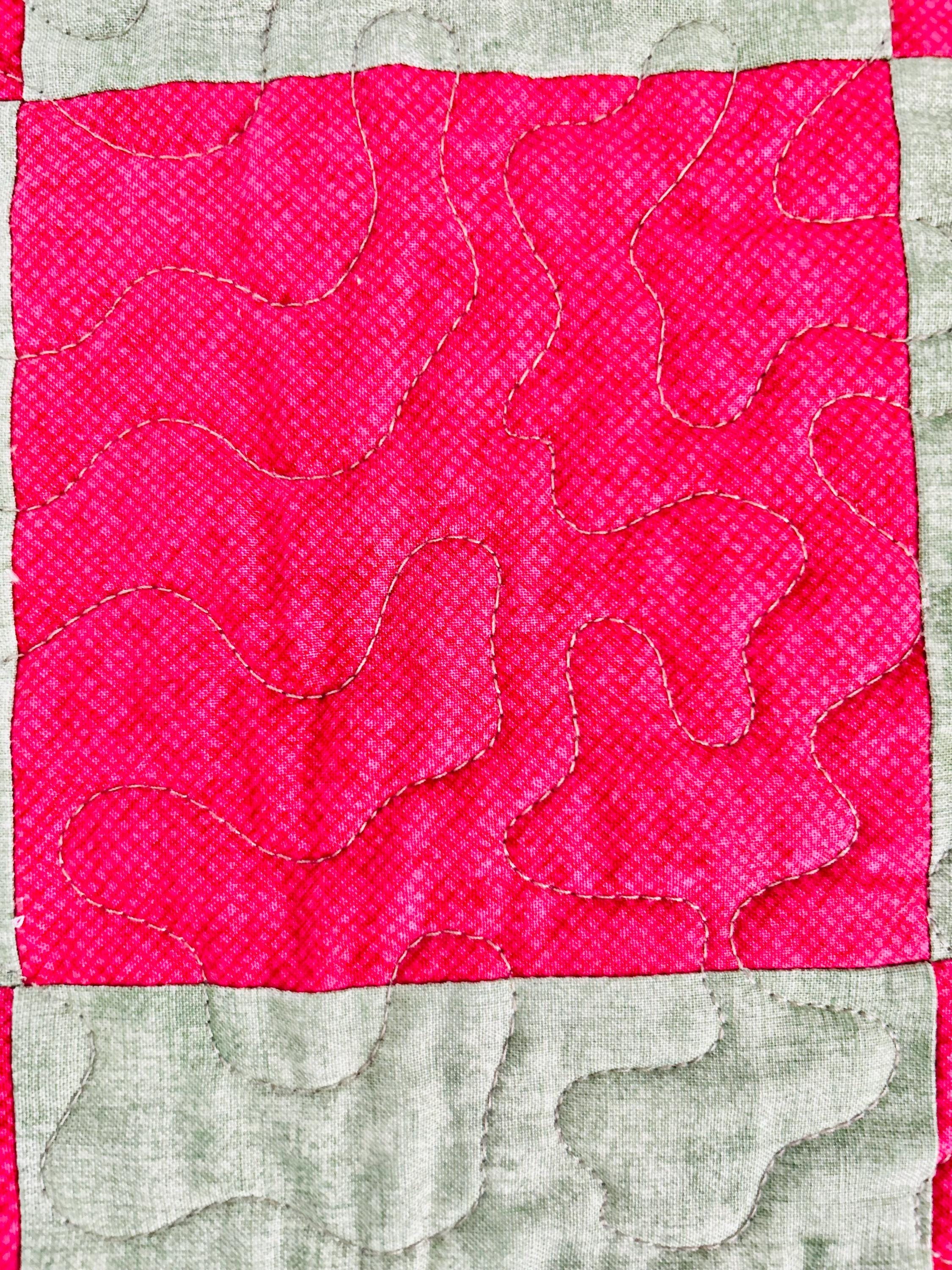 Beautiful Nine Patch Quilt in high quality cottons in pinks and greens, circa 2000. It has been expertly long-arm quilted in curlicues and loops.