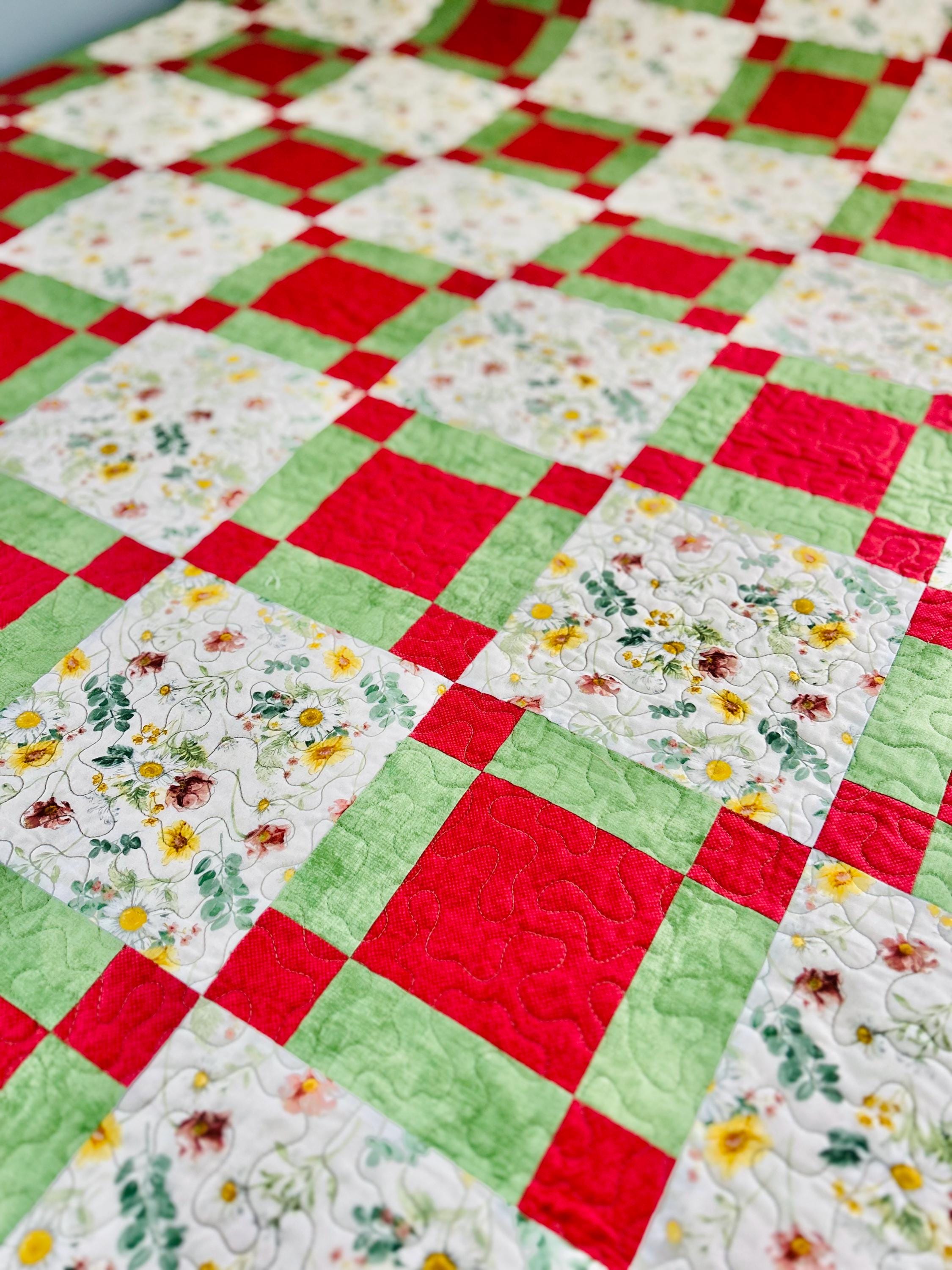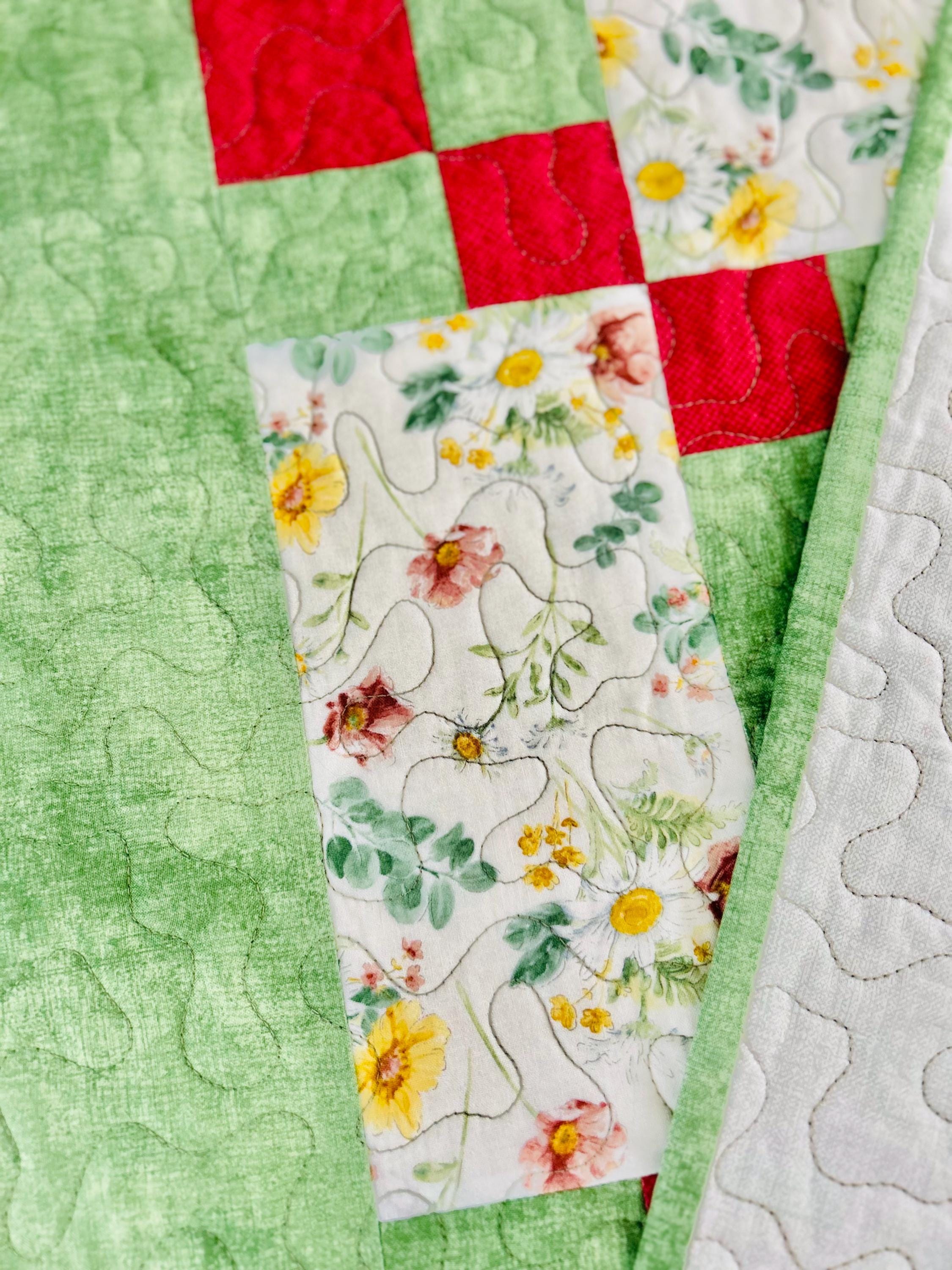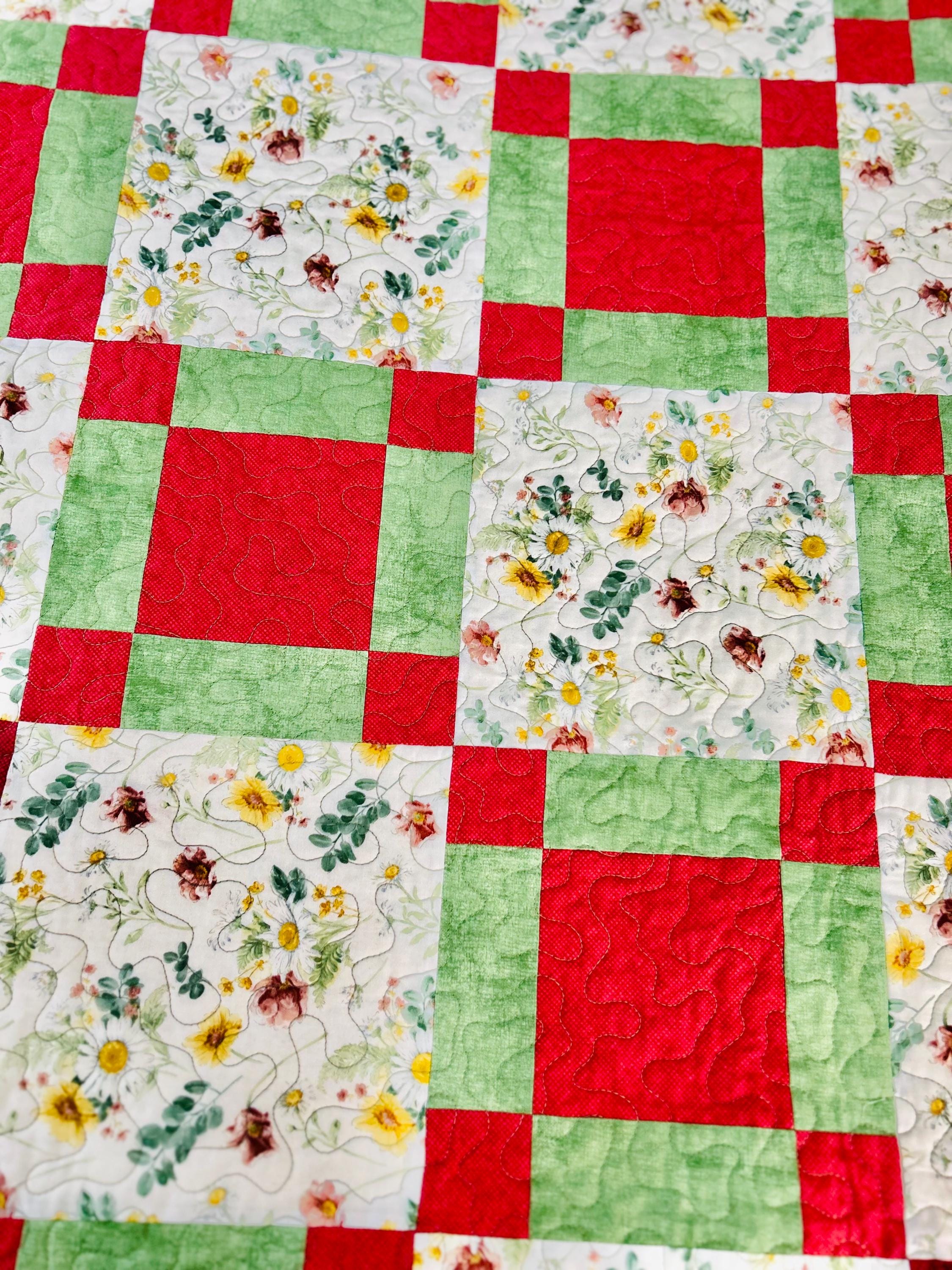 Beautiful Nine Patch Quilt in high quality cottons in pinks and greens, circa 2000. It has been expertly long-arm quilted in curlicues and loops.