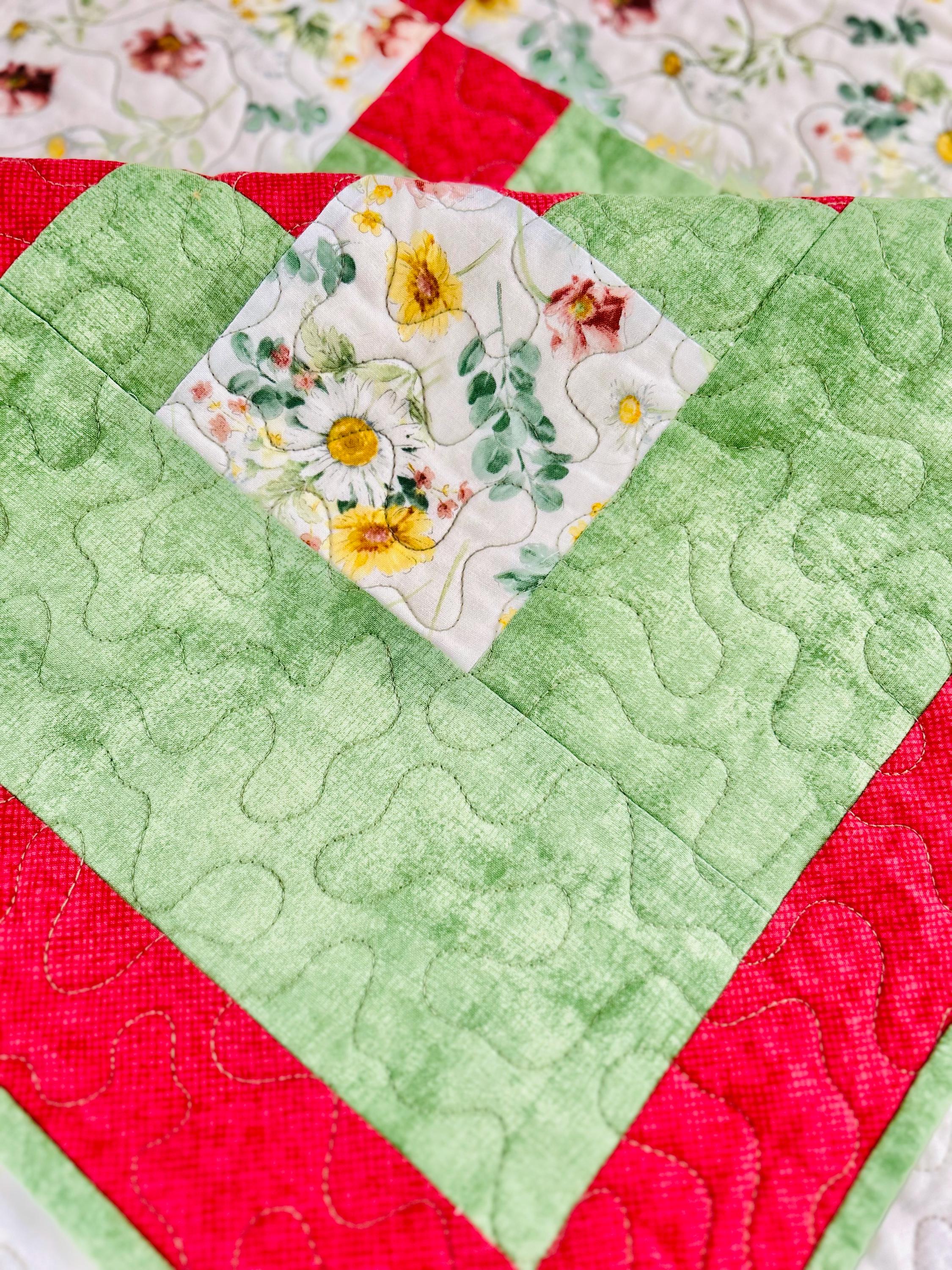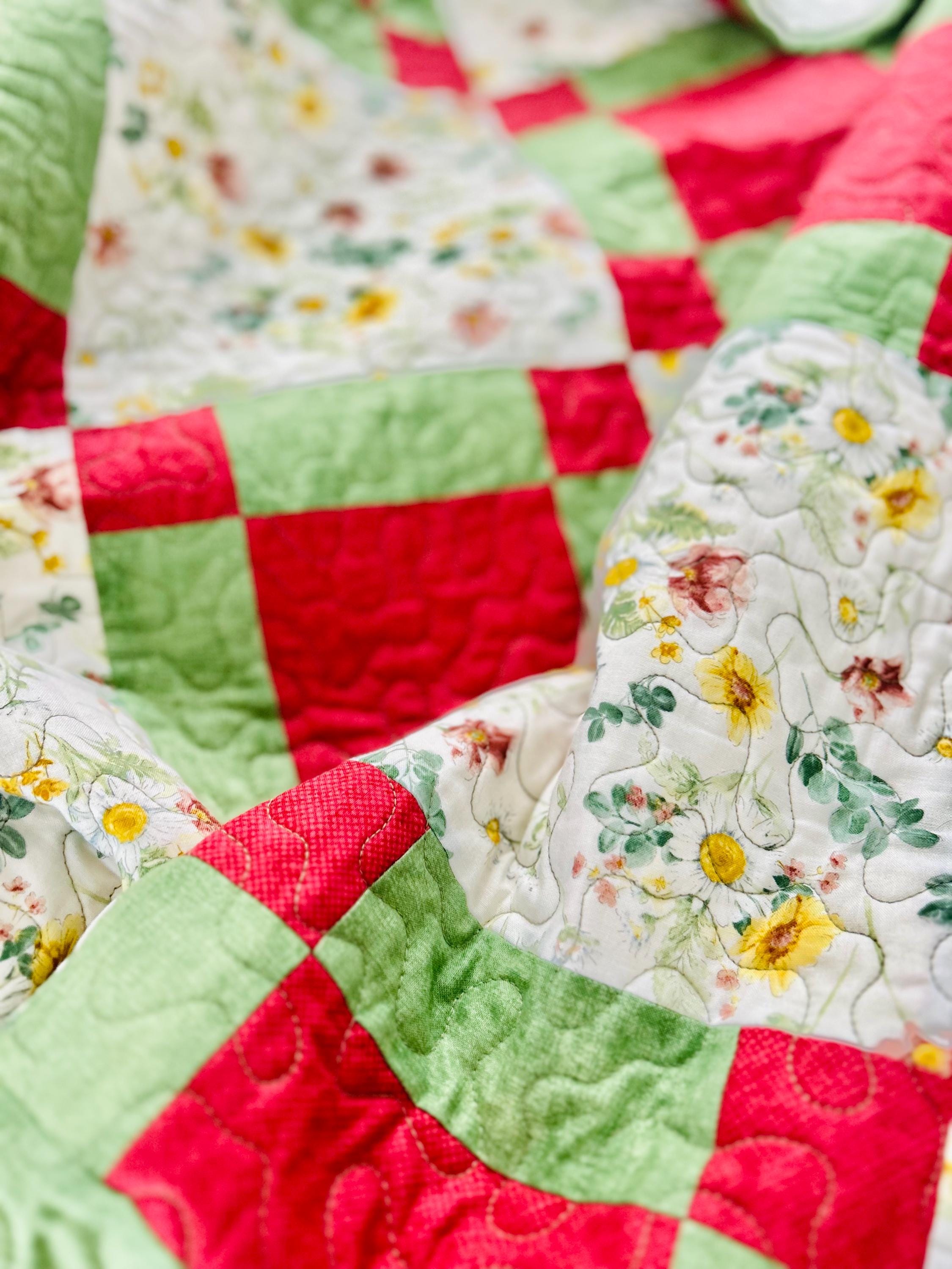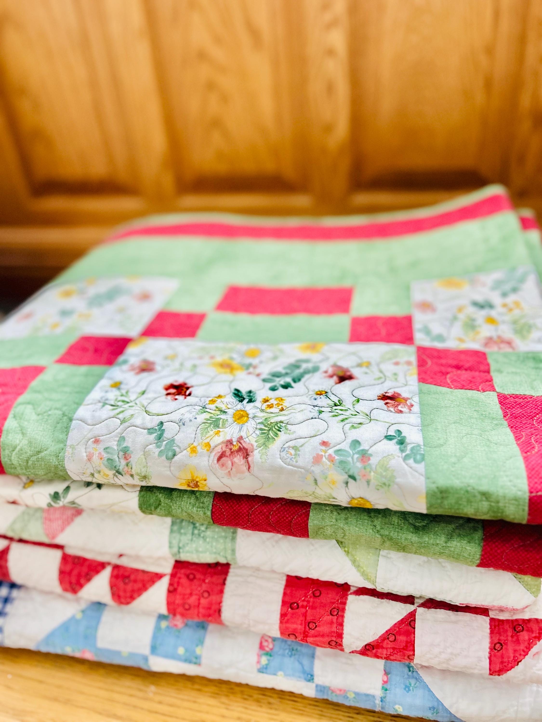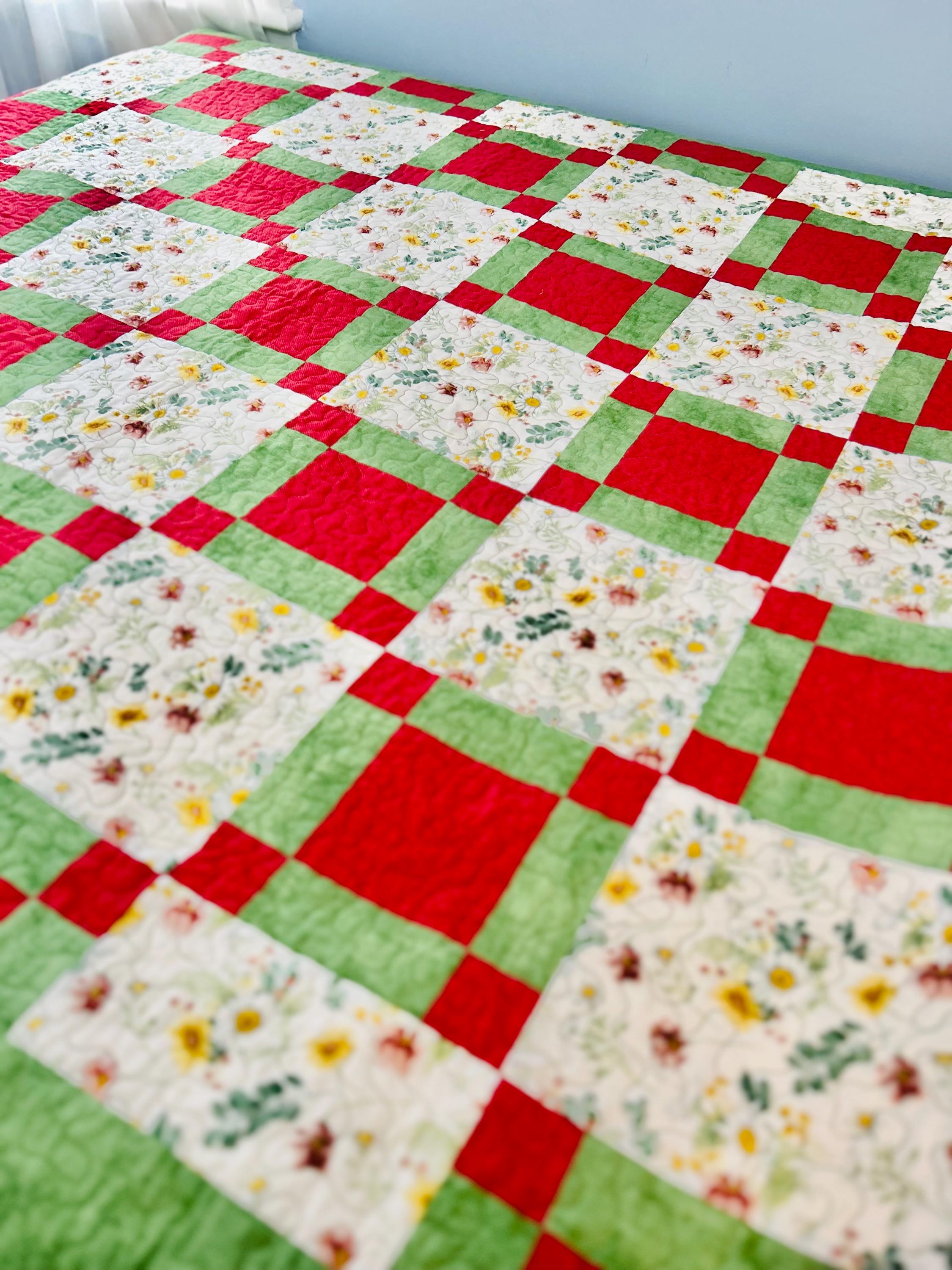 Beautiful Nine Patch Quilt in high quality cottons in pinks and greens, circa 2000. It has been expertly long-arm quilted in curlicues and loops.