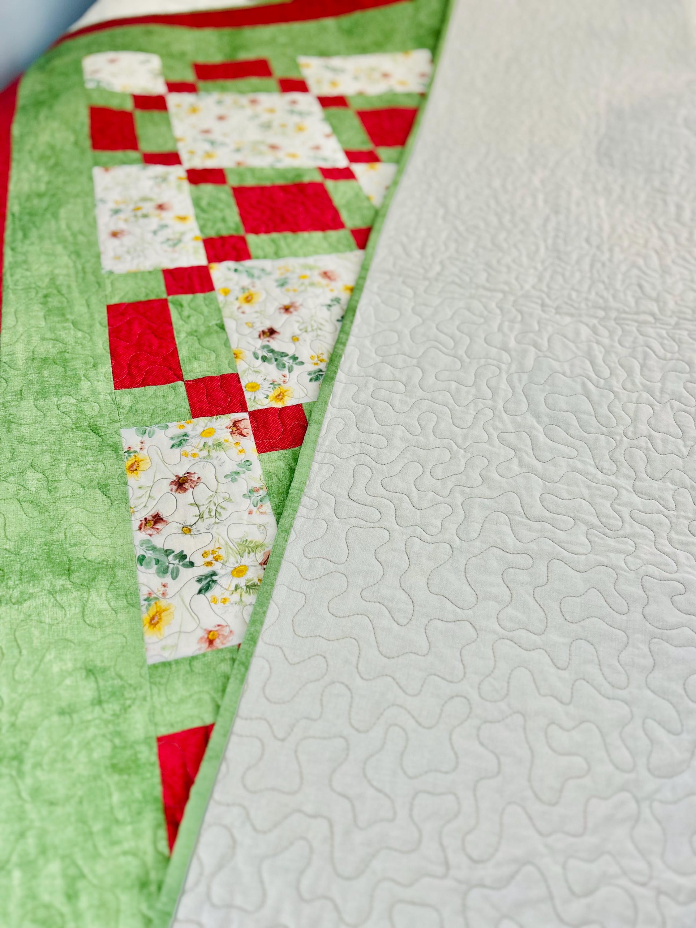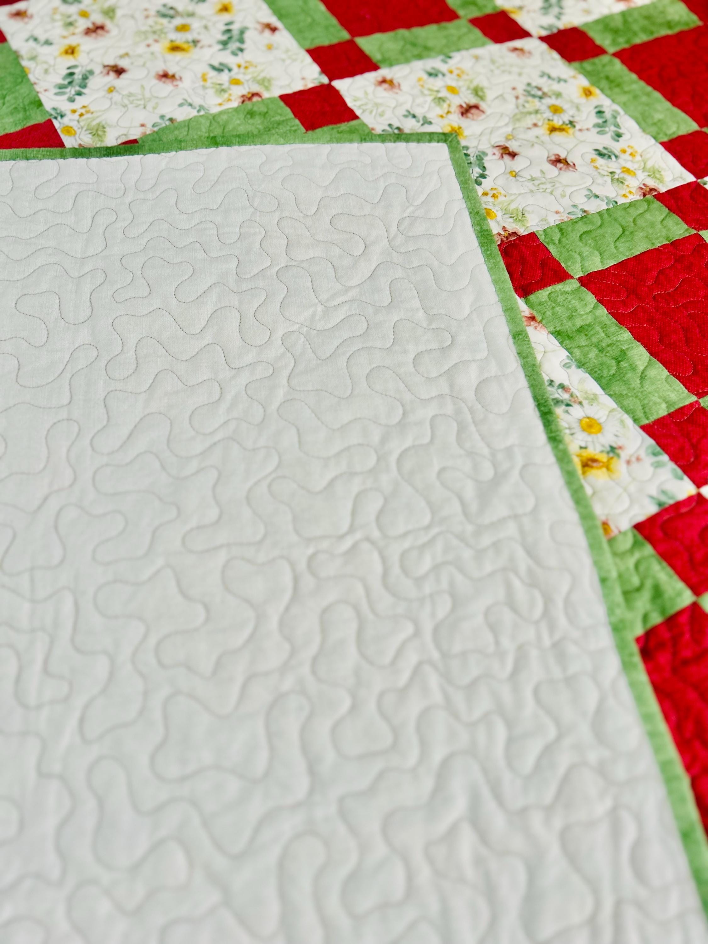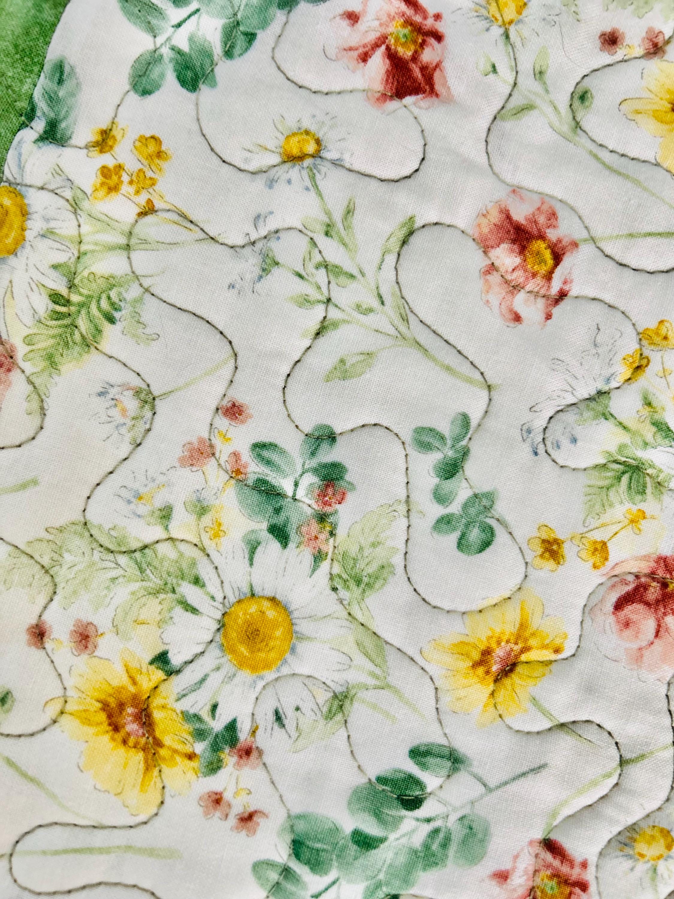 The back is white cotton, while the binding is green cotton that has been machine stitched to the front and hand-stitched to the back. The batting is lightweight.