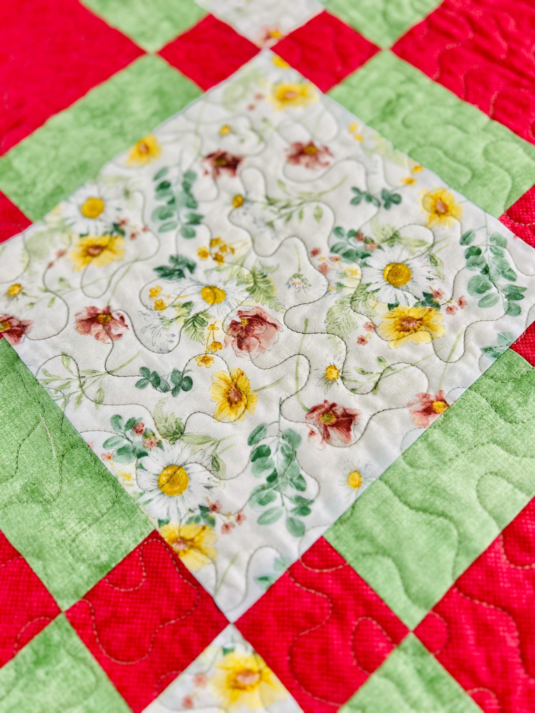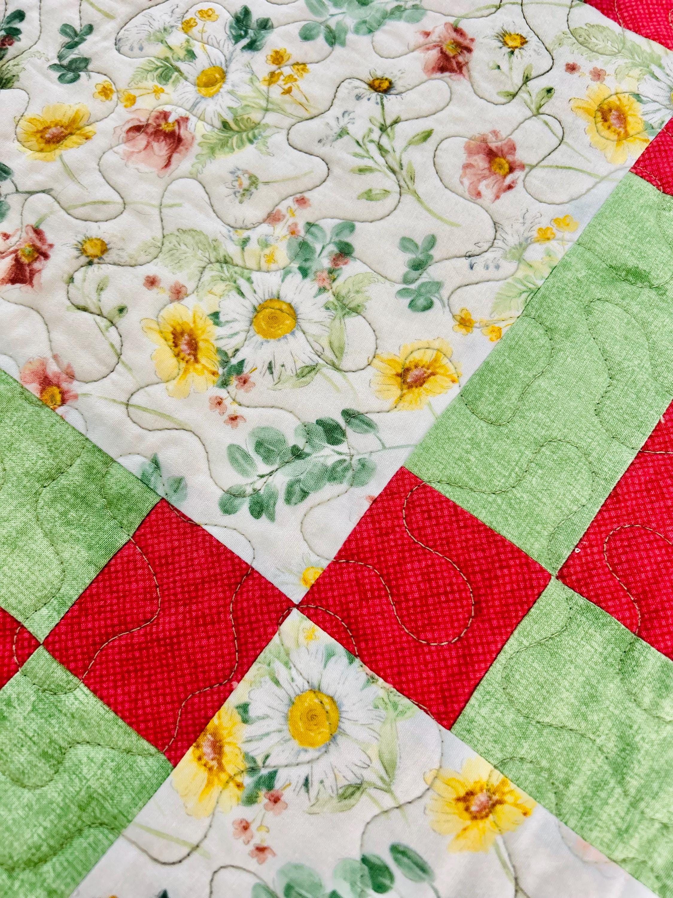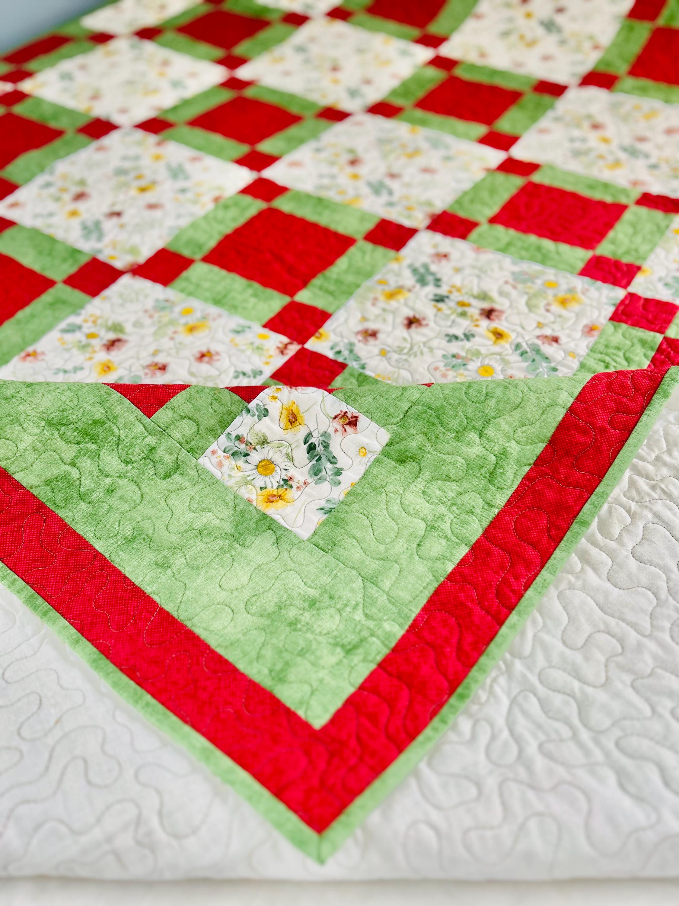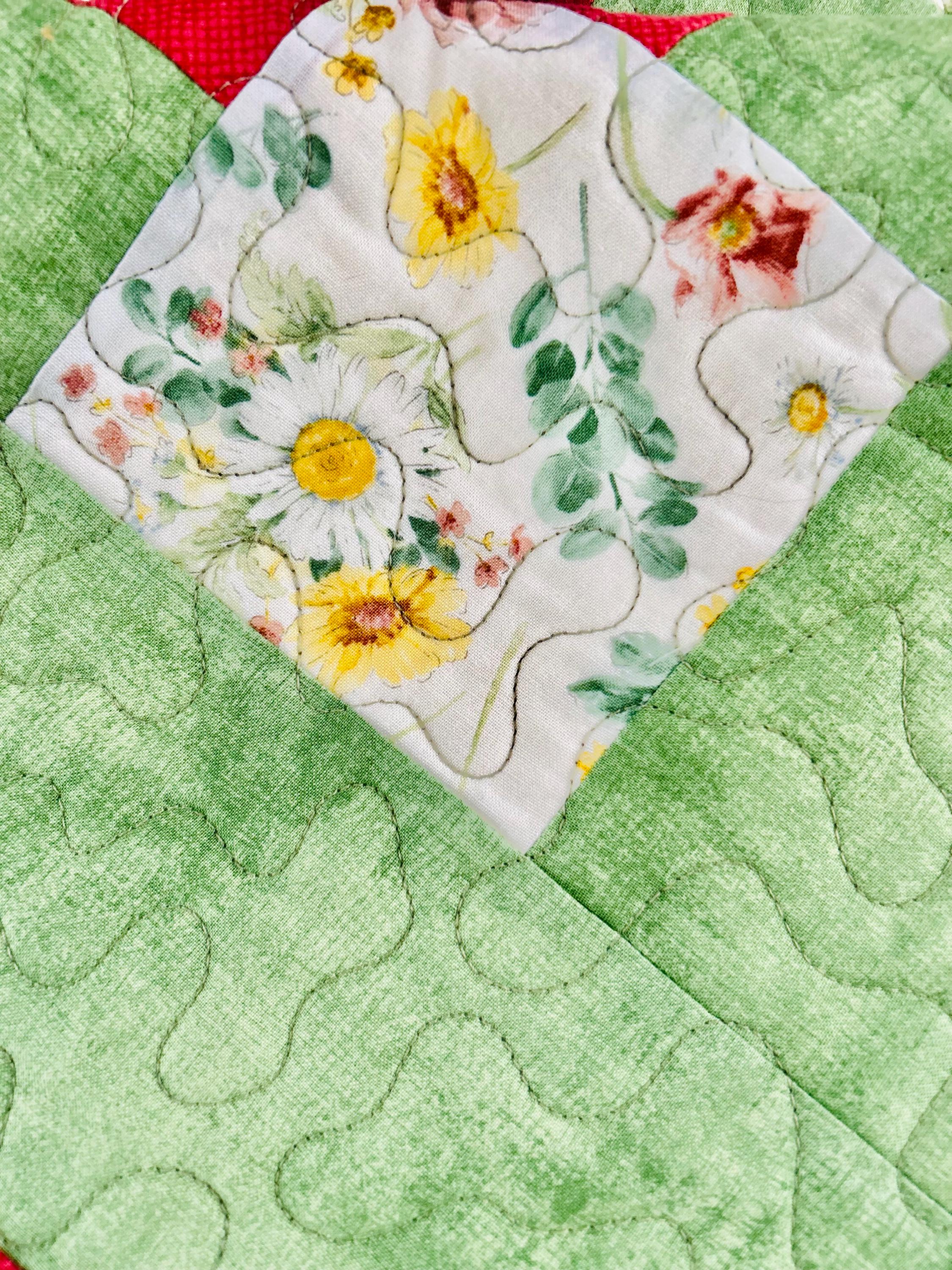 The back is white cotton, while the binding is green cotton that has been machine stitched to the front and hand-stitched to the back. The batting is lightweight.