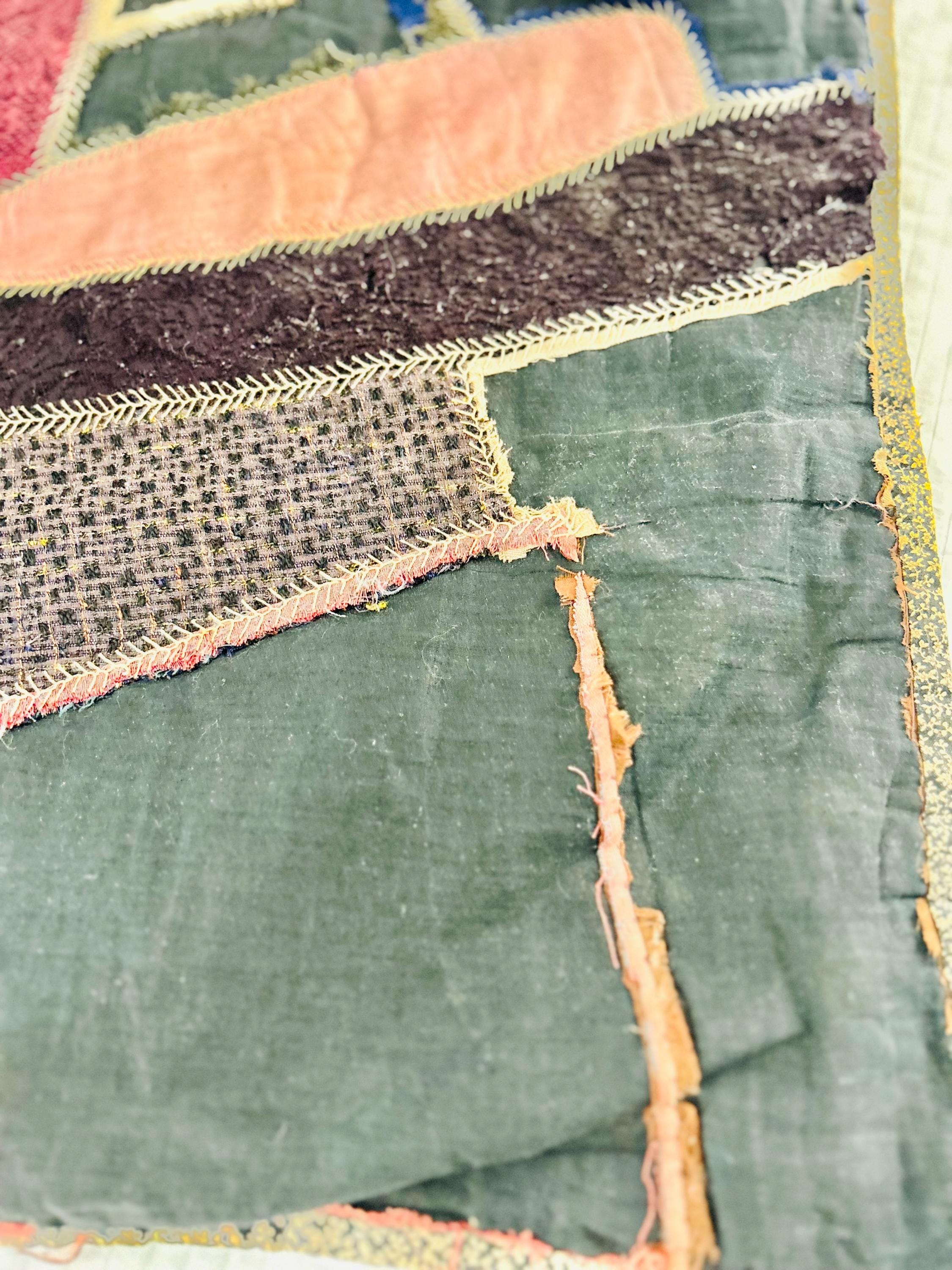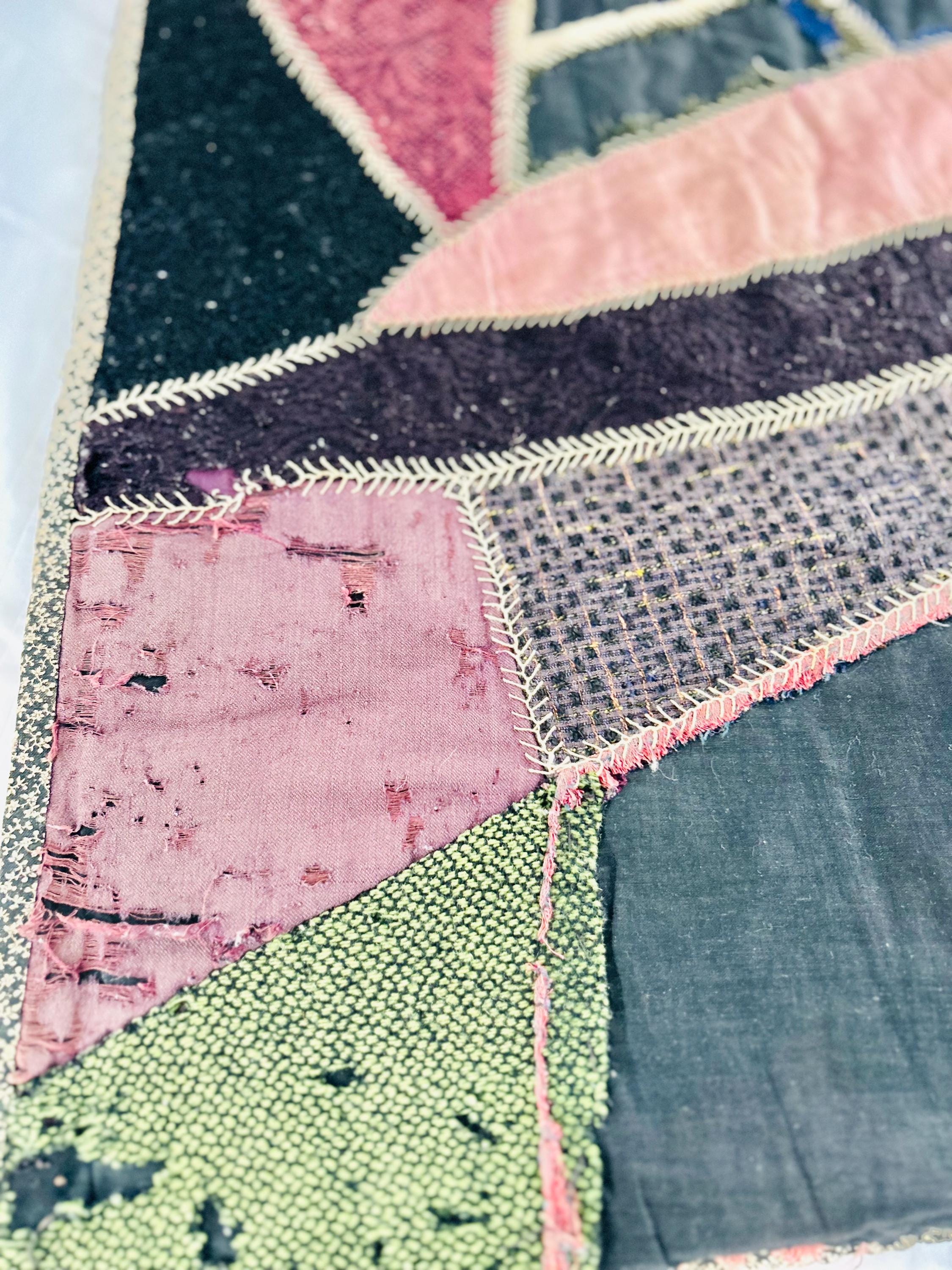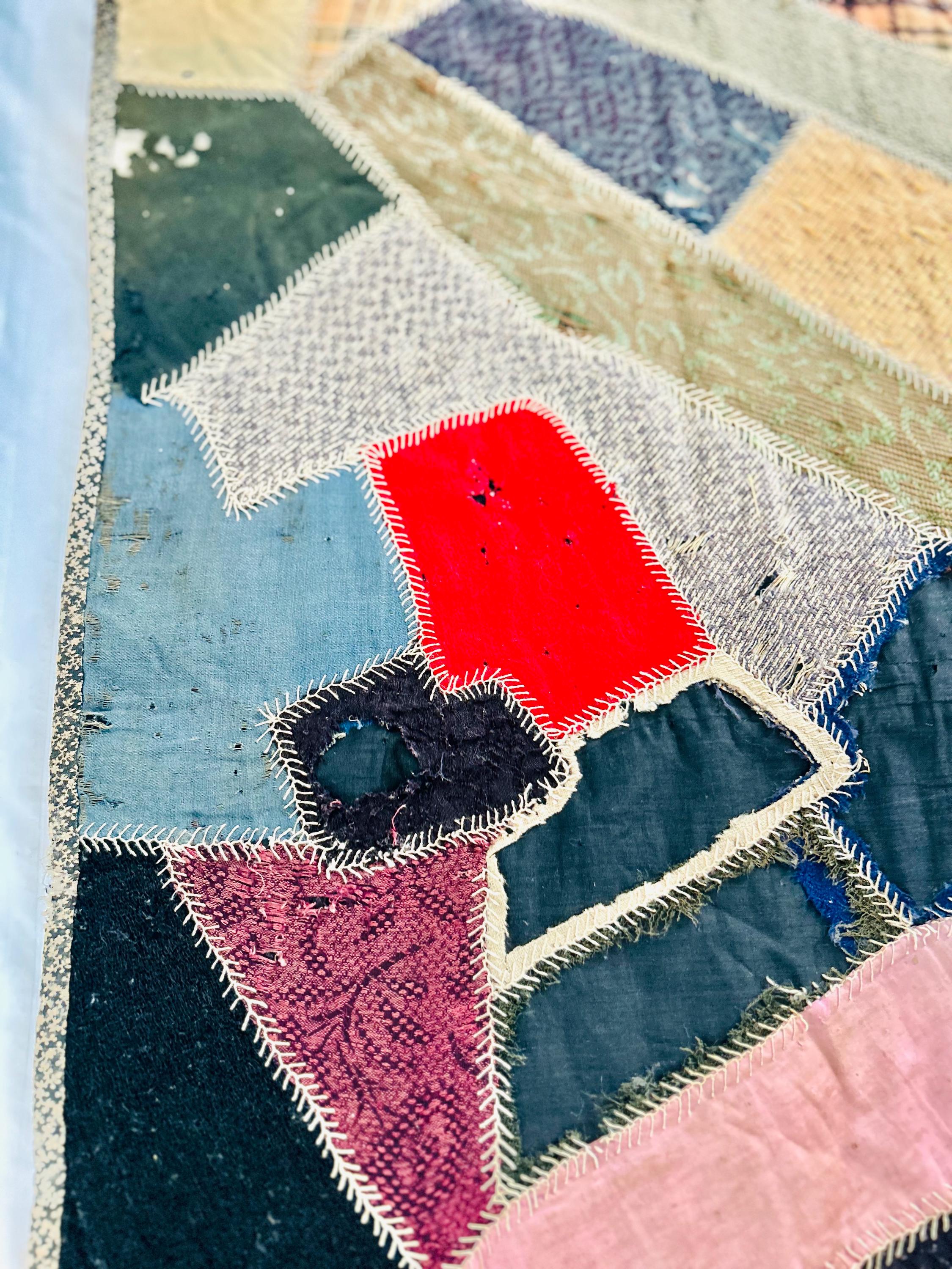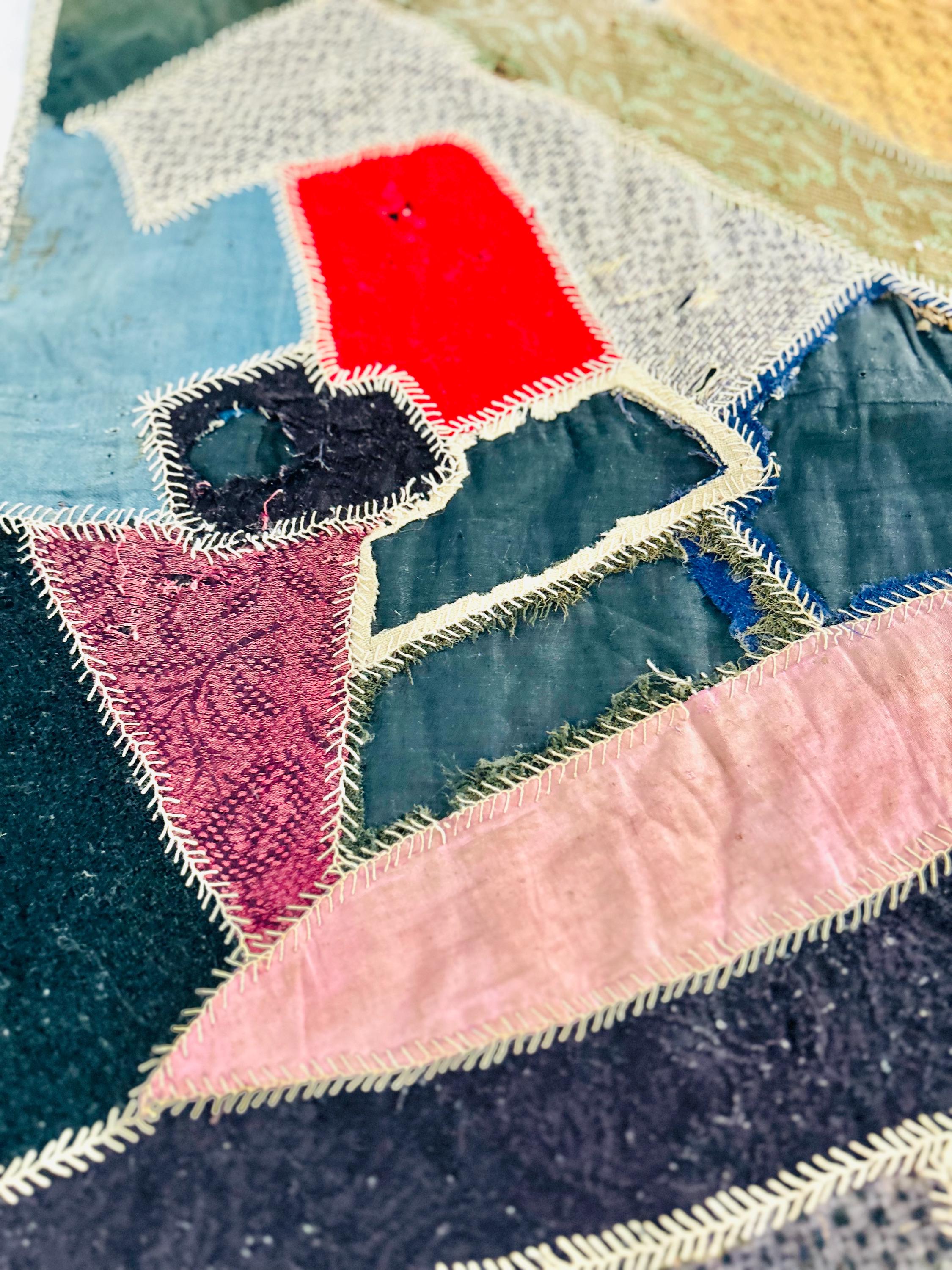 As indicated above, this crazy quilt runner is showing its age. Most of the silk fabrics have shattered and some of the wools and brocades have holes that do not go through to the back. The chintz back is in excellent condition.