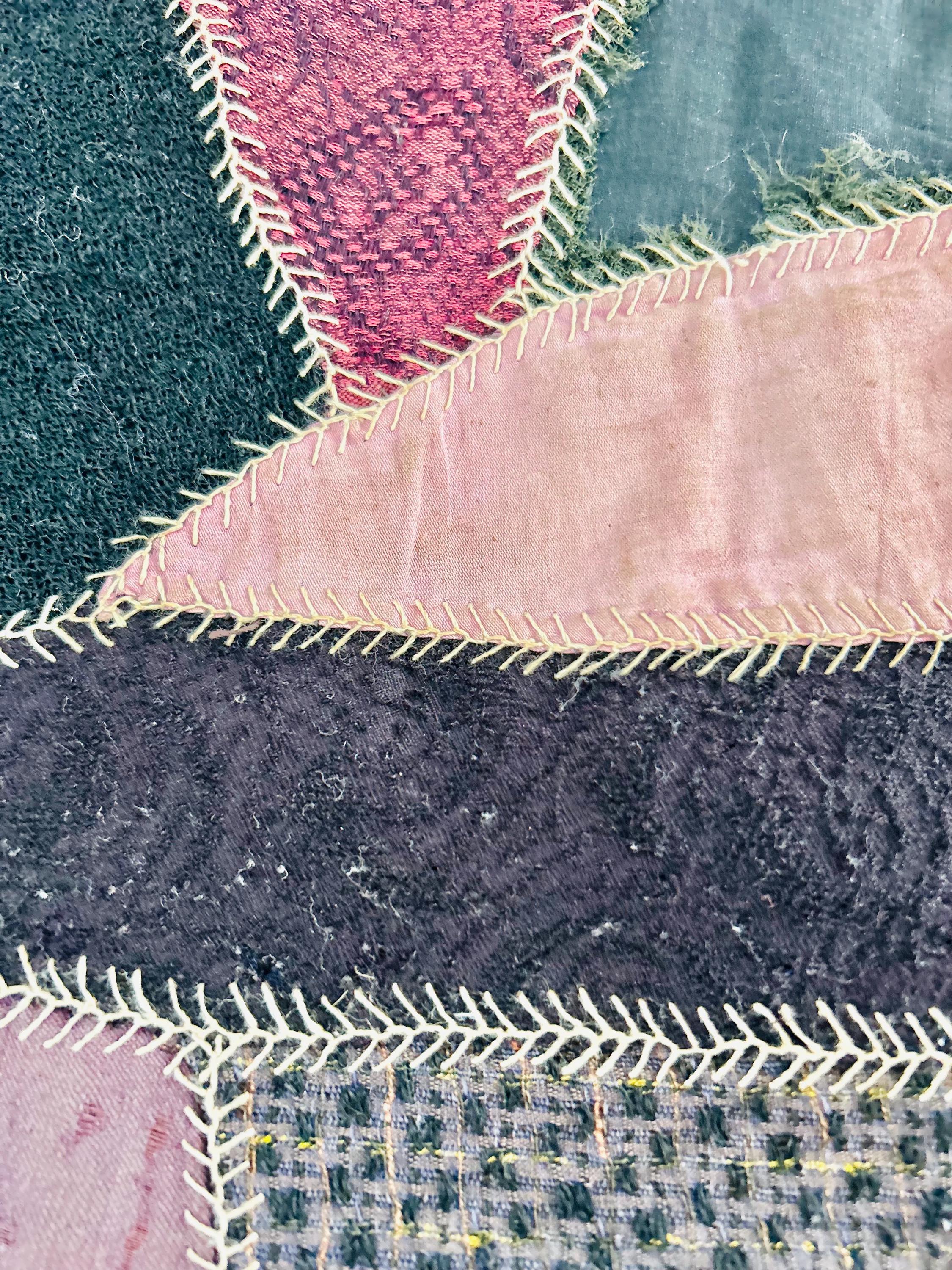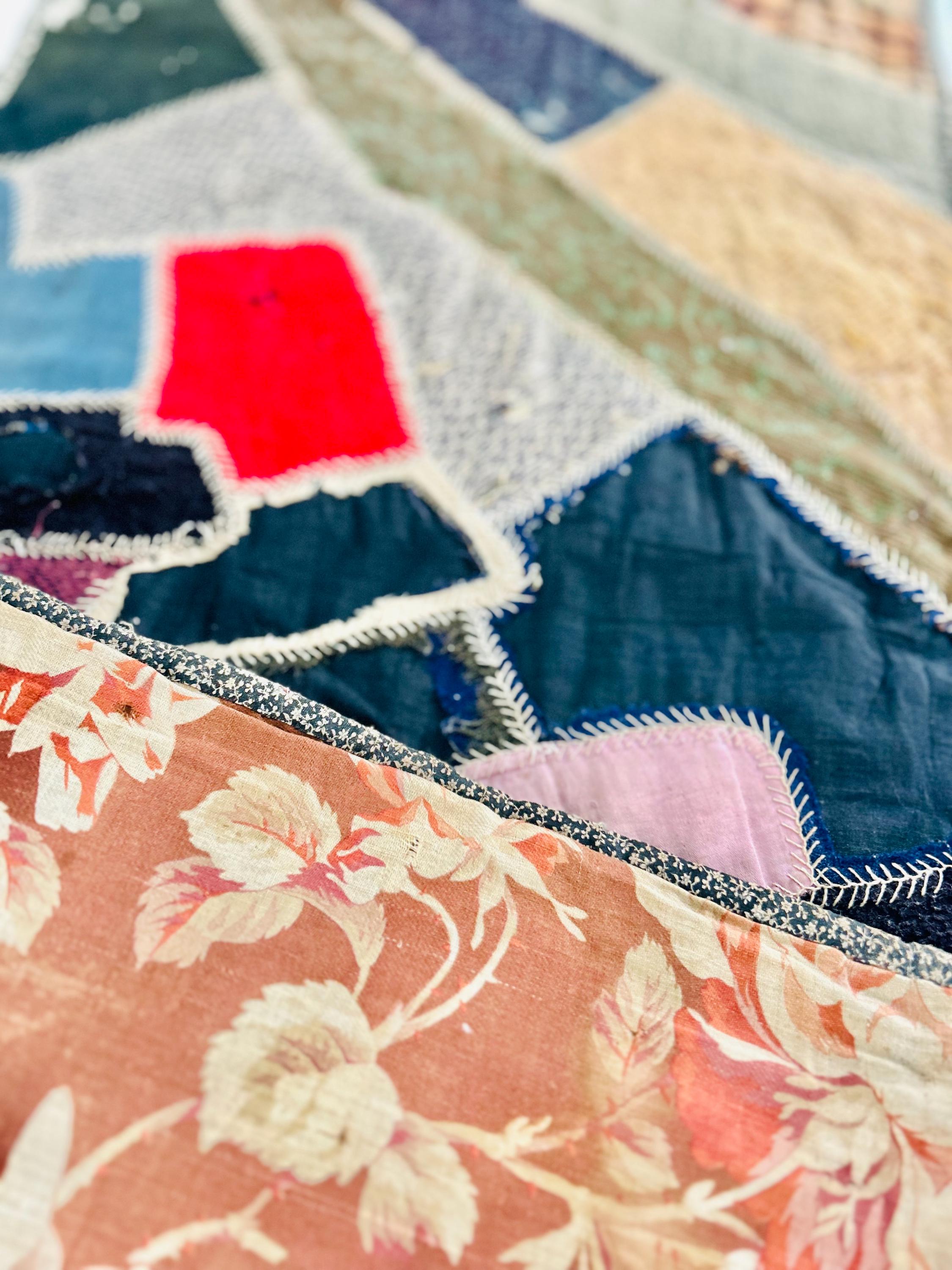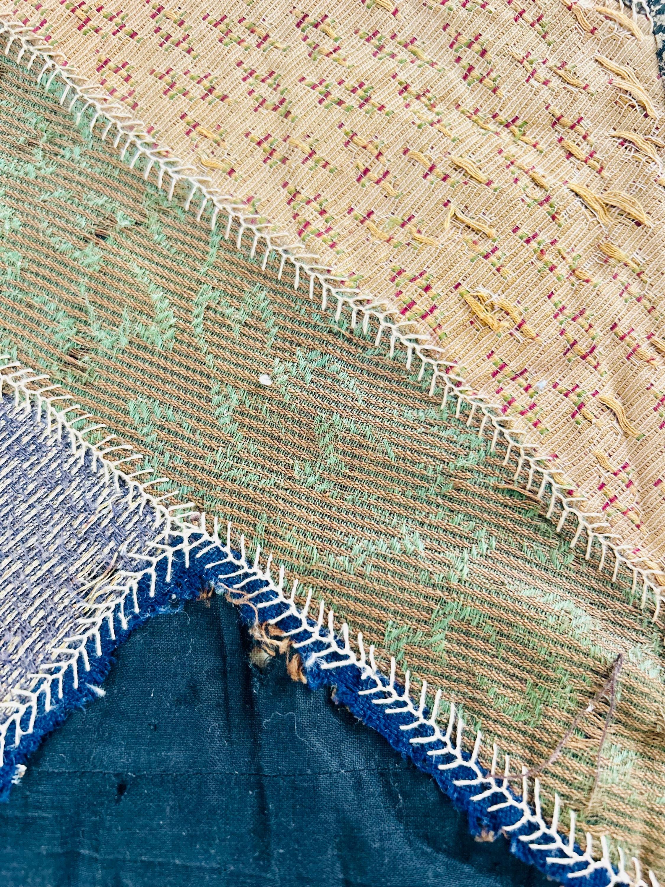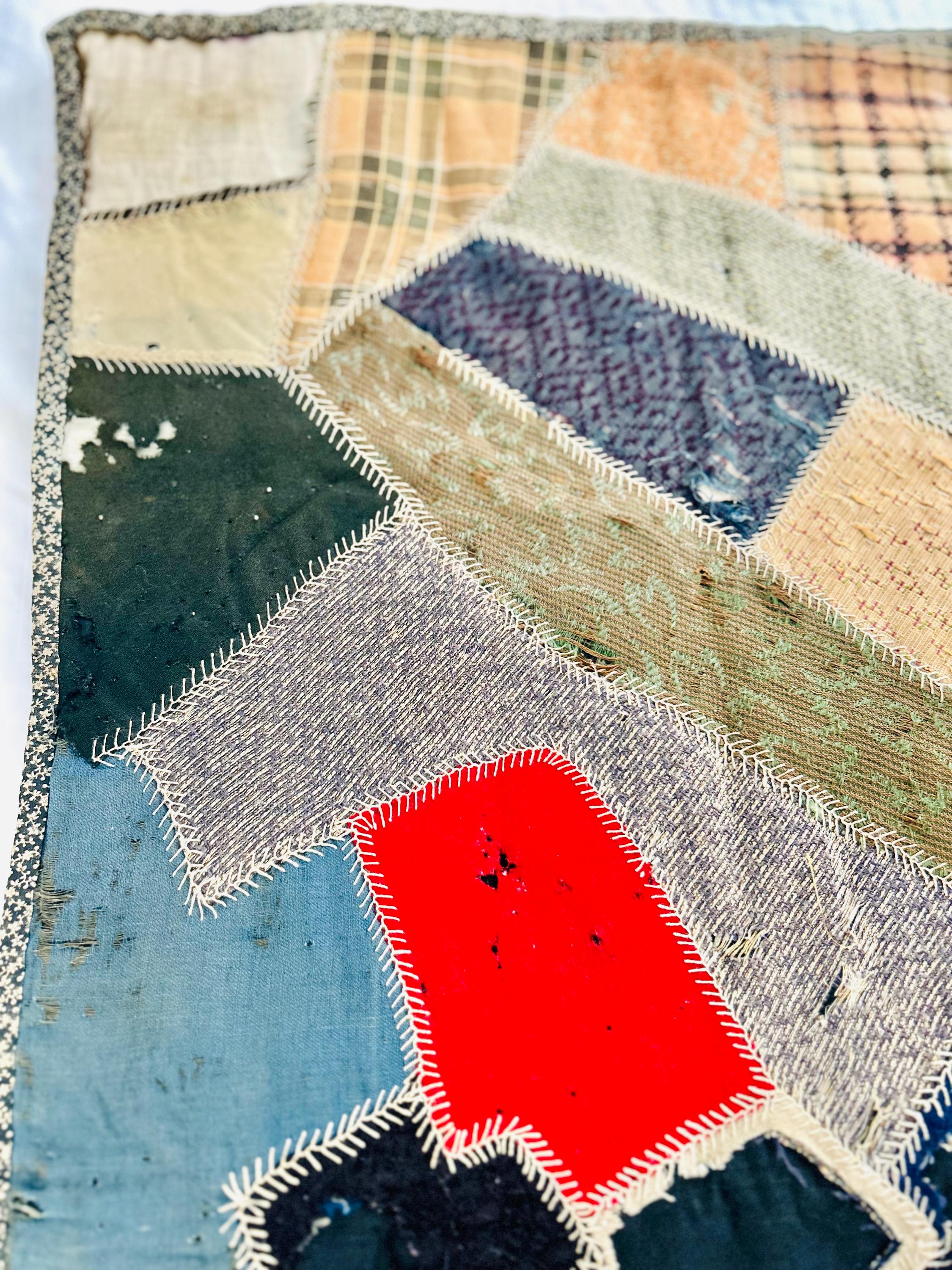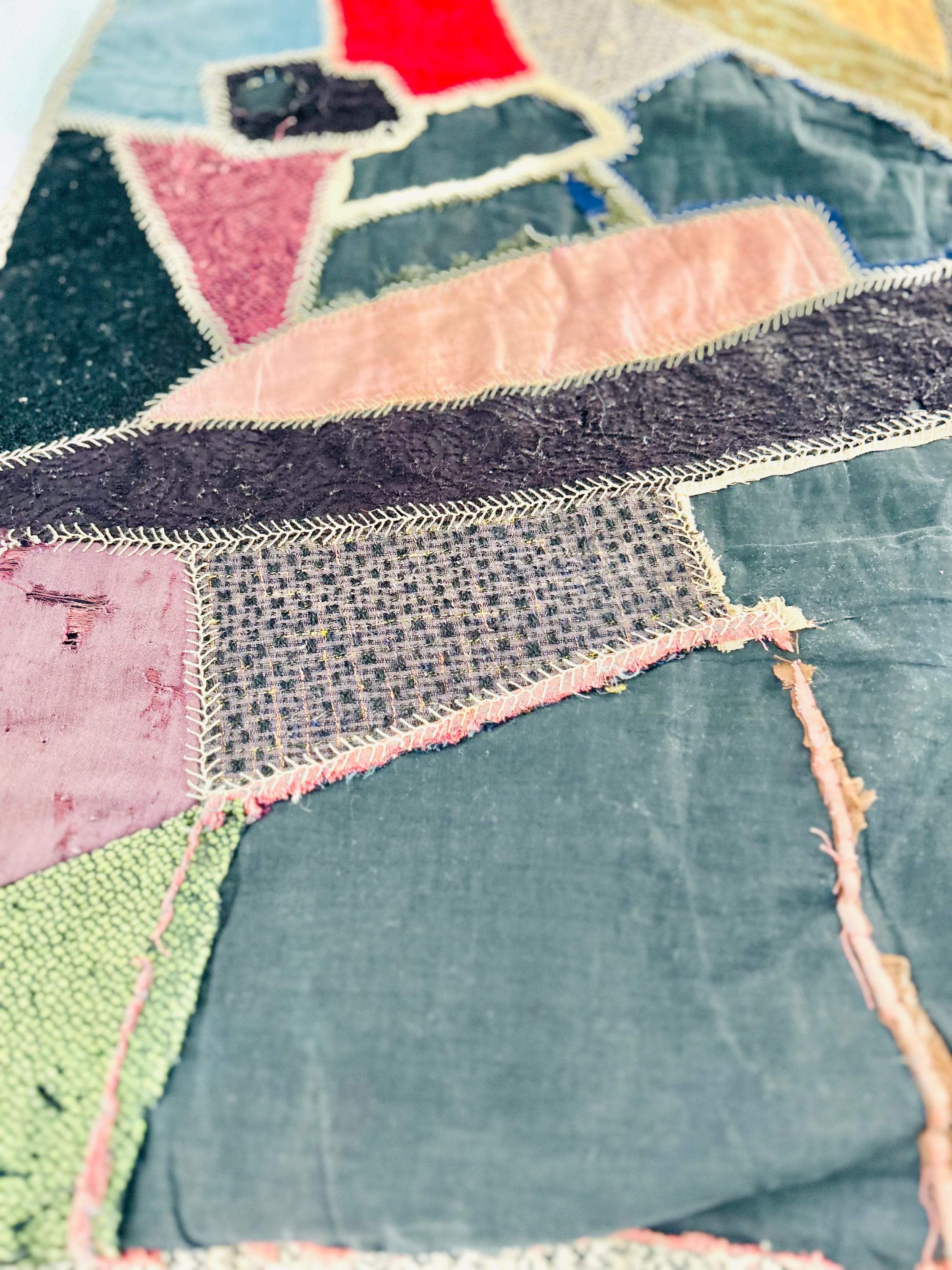 As indicated above, this crazy quilt runner is showing its age. Most of the silk fabrics have shattered and some of the wools and brocades have holes that do not go through to the back. The chintz back is in excellent condition.