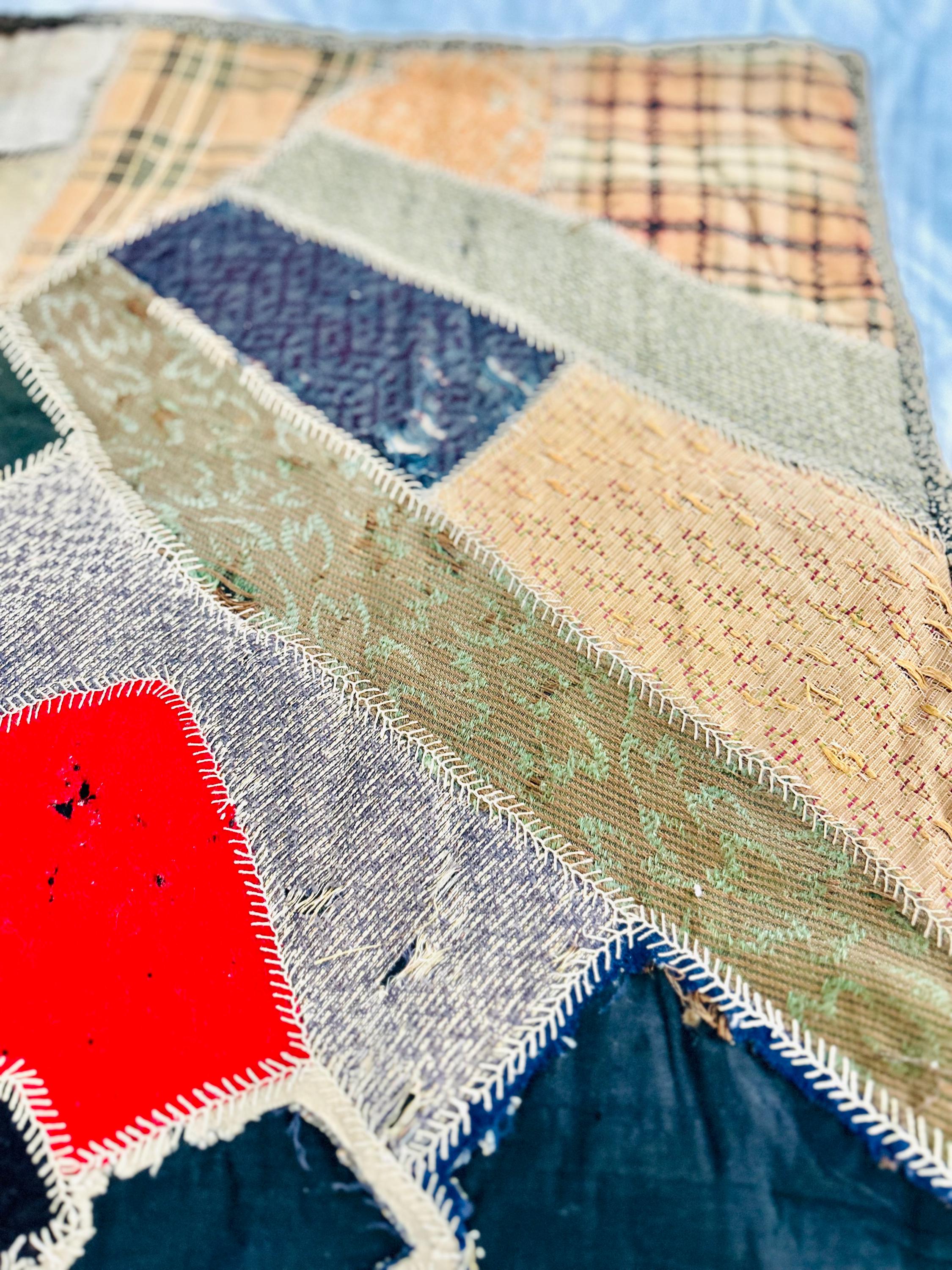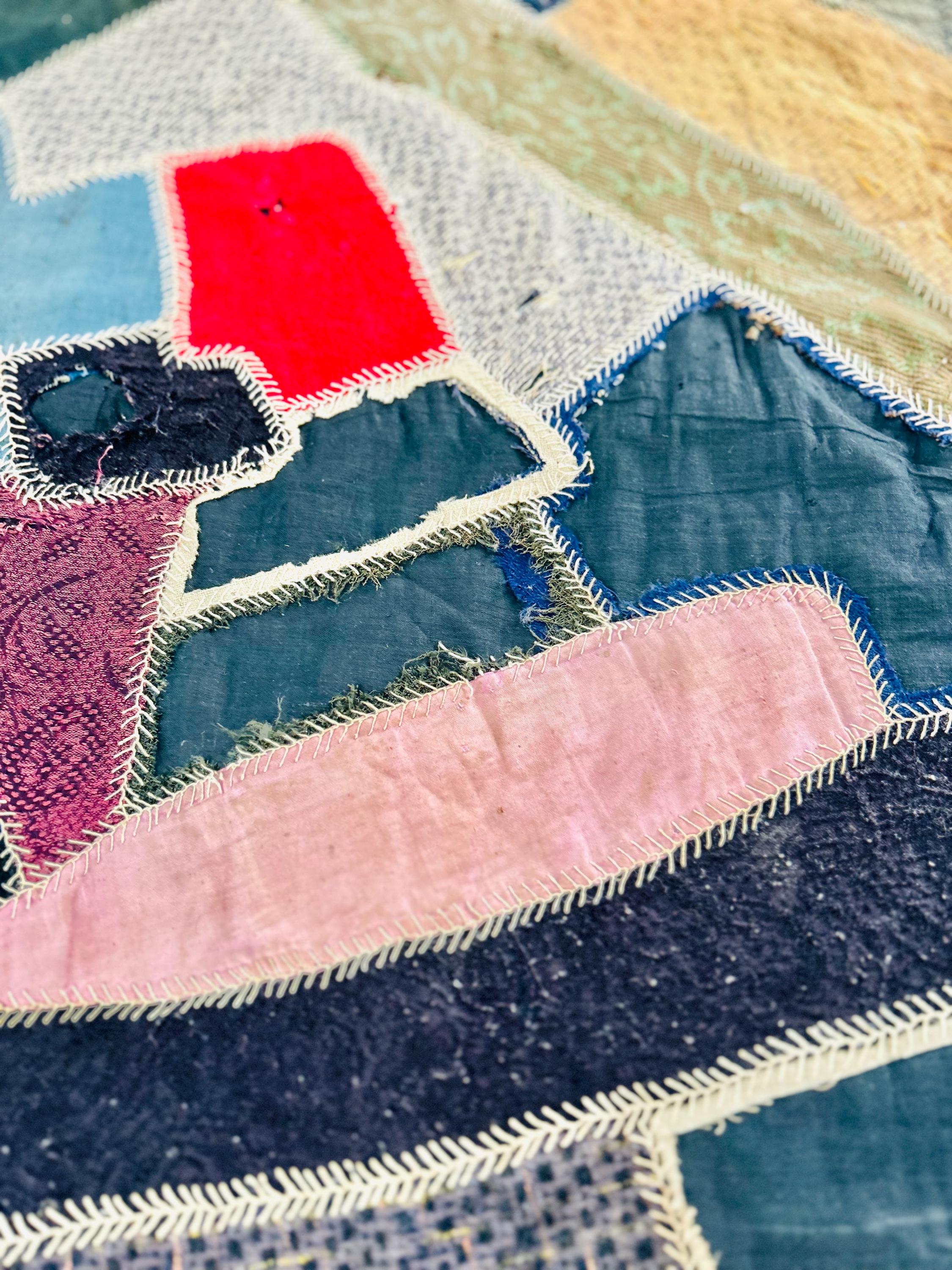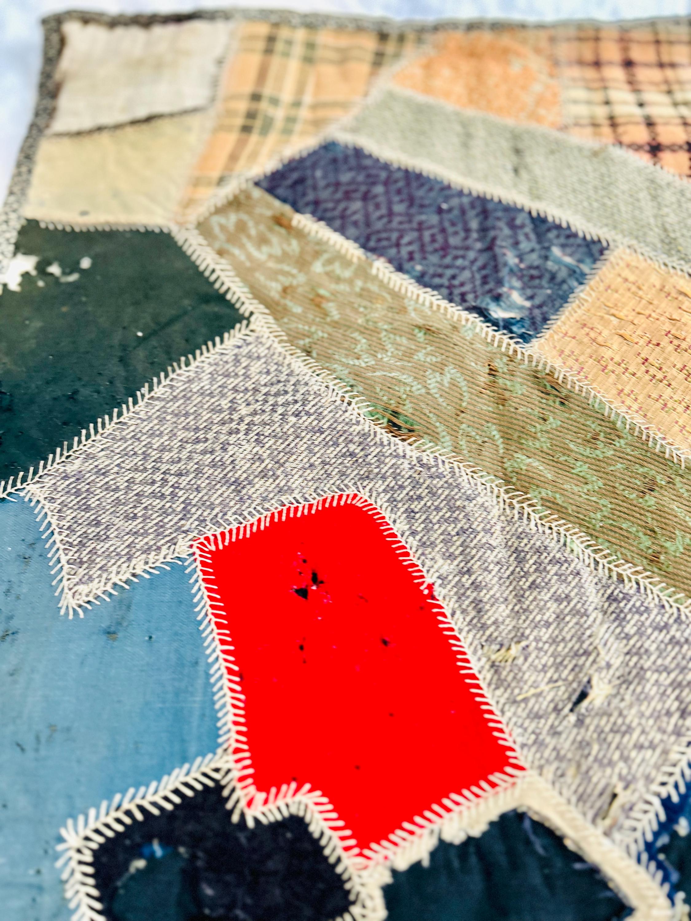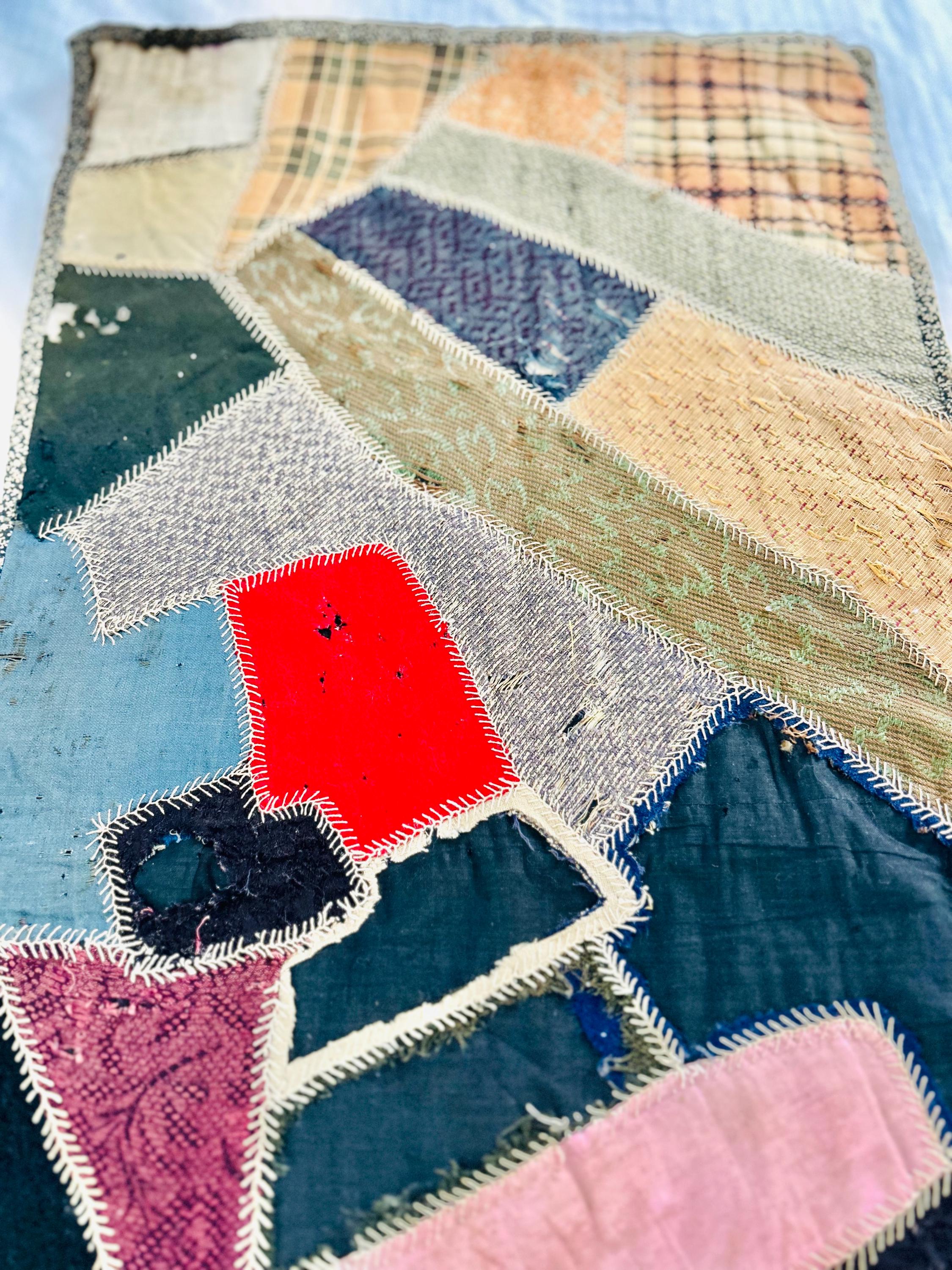 As indicated above, this crazy quilt runner is showing its age. Most of the silk fabrics have shattered and some of the wools and brocades have holes that do not go through to the back. The chintz back is in excellent condition.