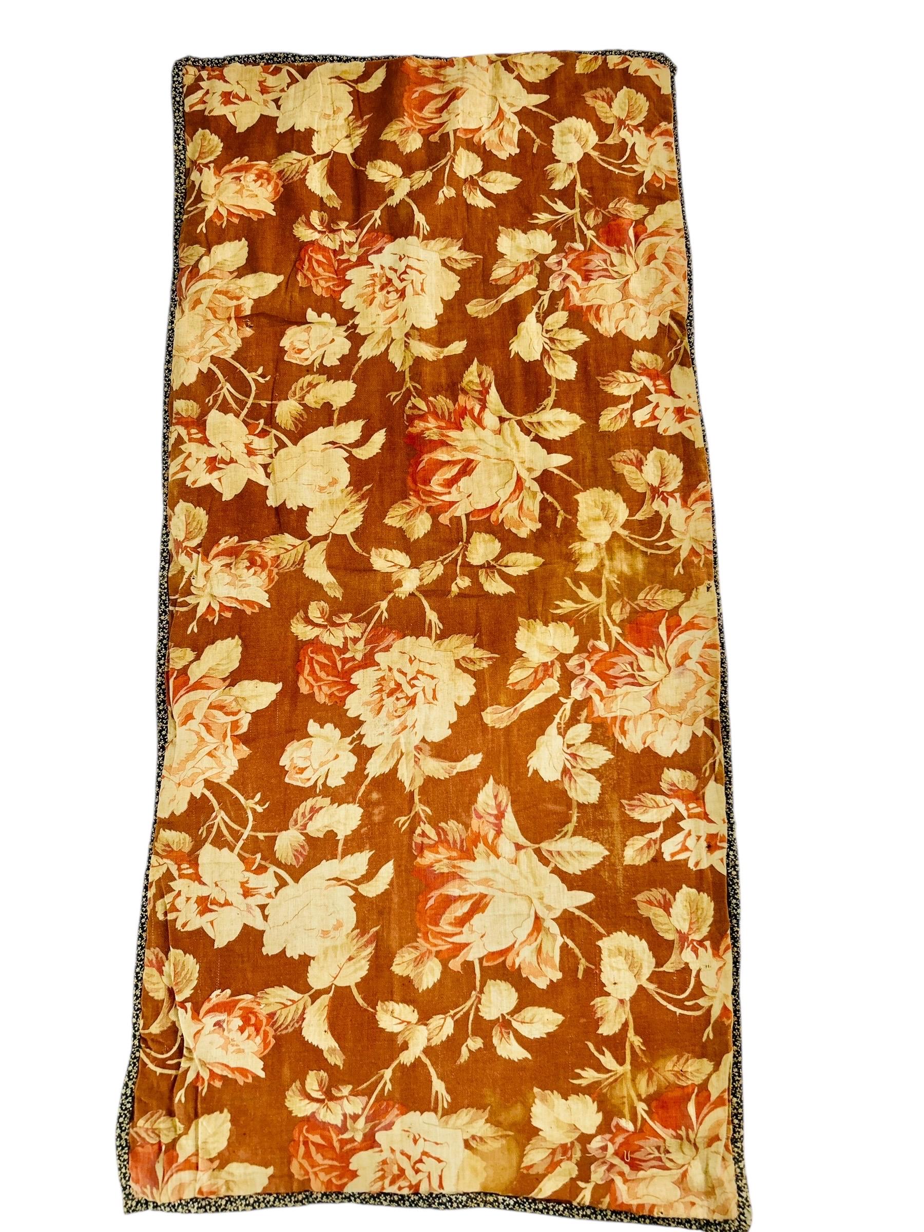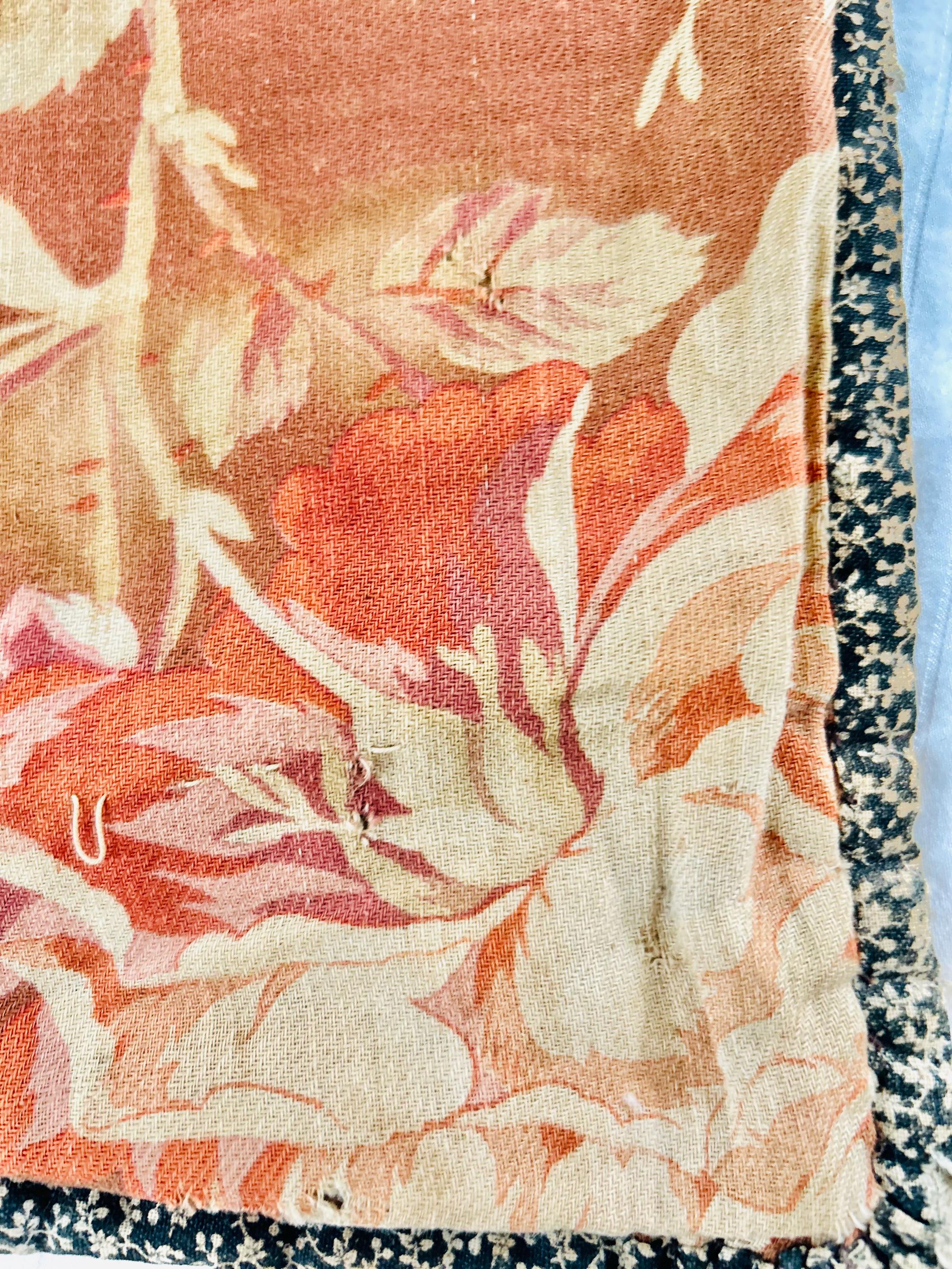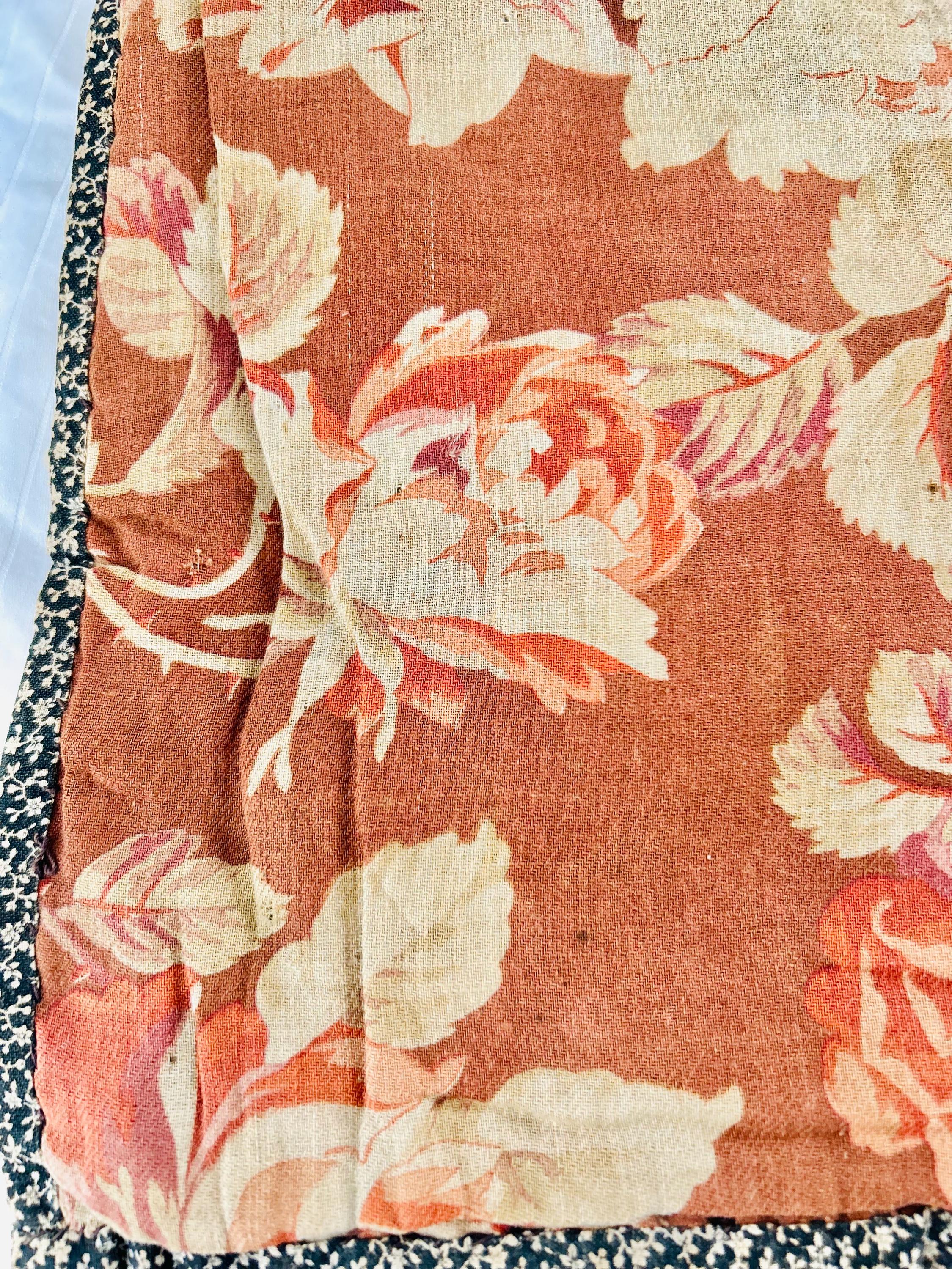 The back is a beautiful floral chintz fabric while the binding appears to be newer than the rest of the materials and is a tiny black floral cotton that has been hand-stitched to both sides.