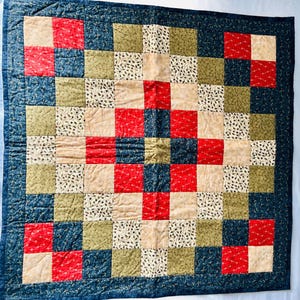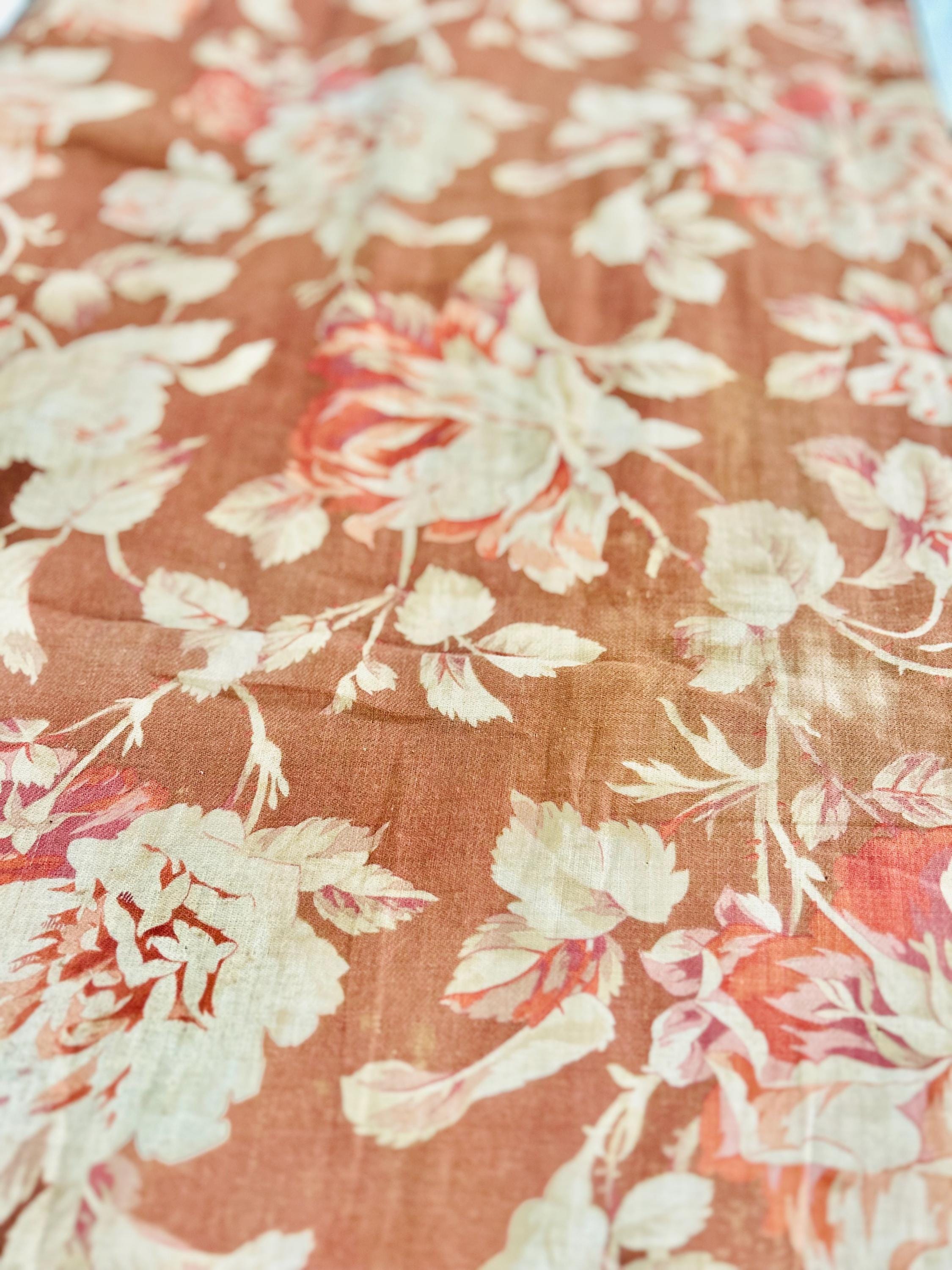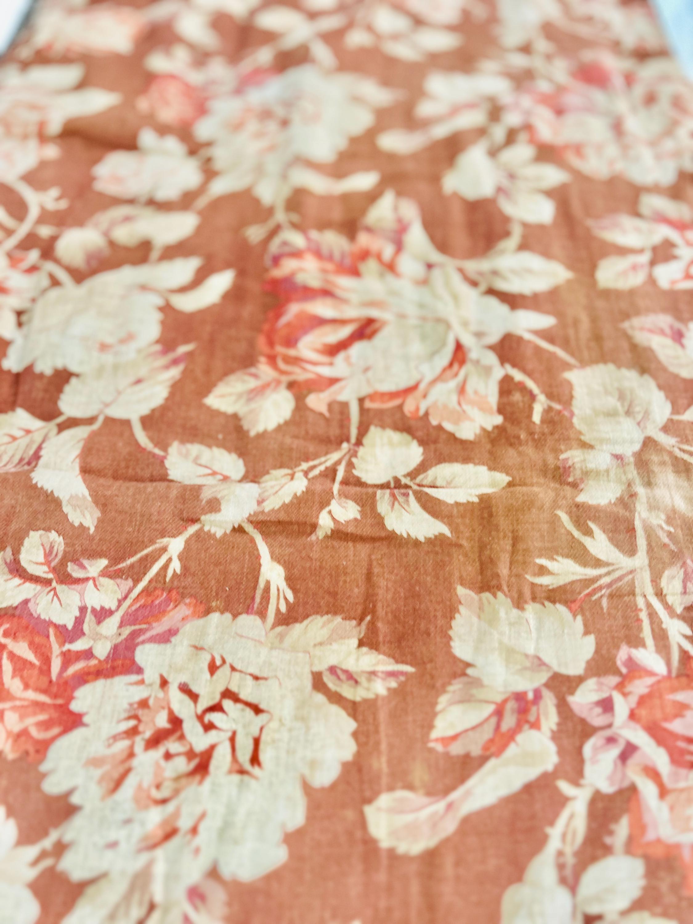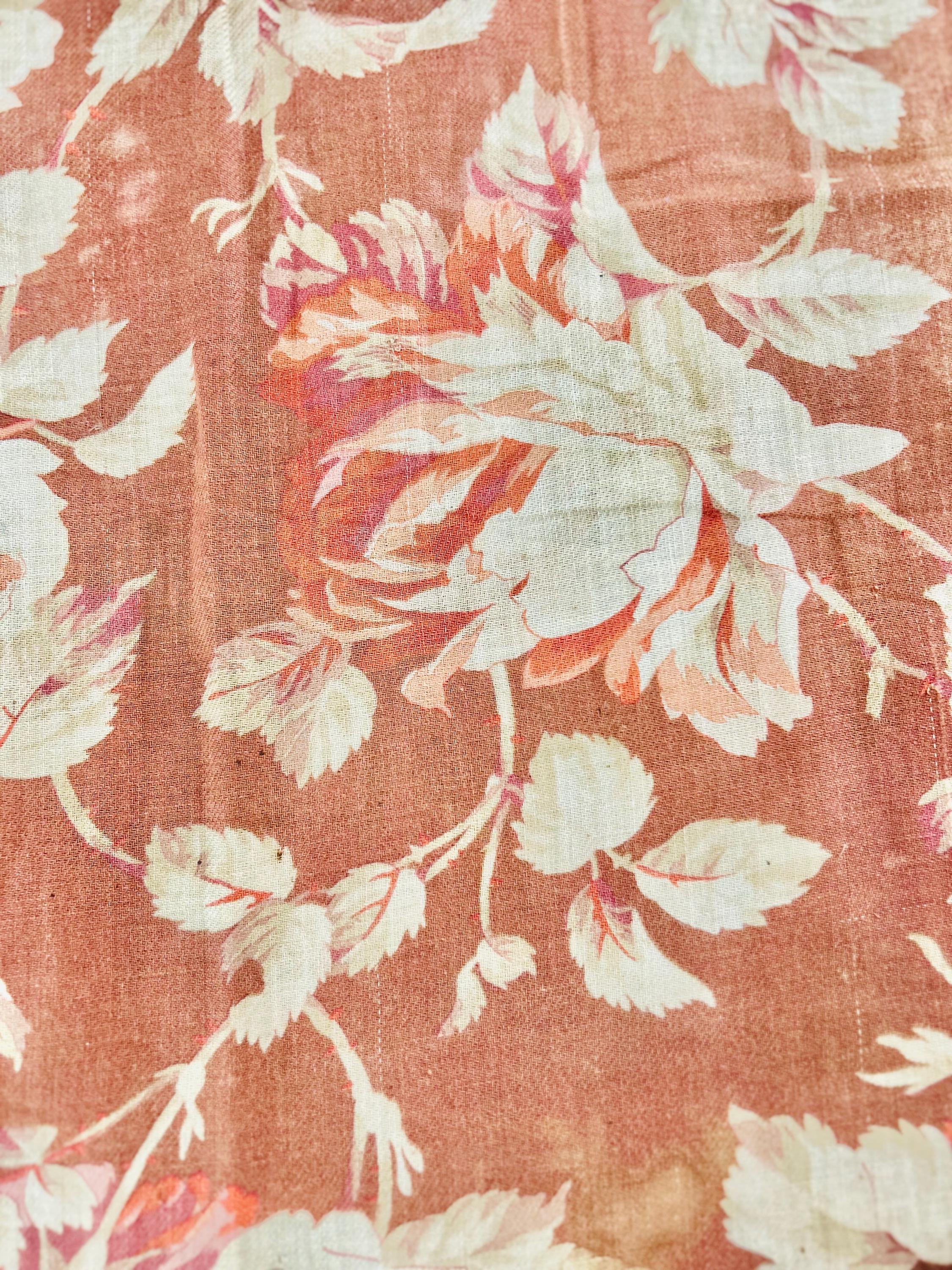 The back is a beautiful floral chintz fabric while the binding appears to be newer than the rest of the materials and is a tiny black floral cotton that has been hand-stitched to both sides.