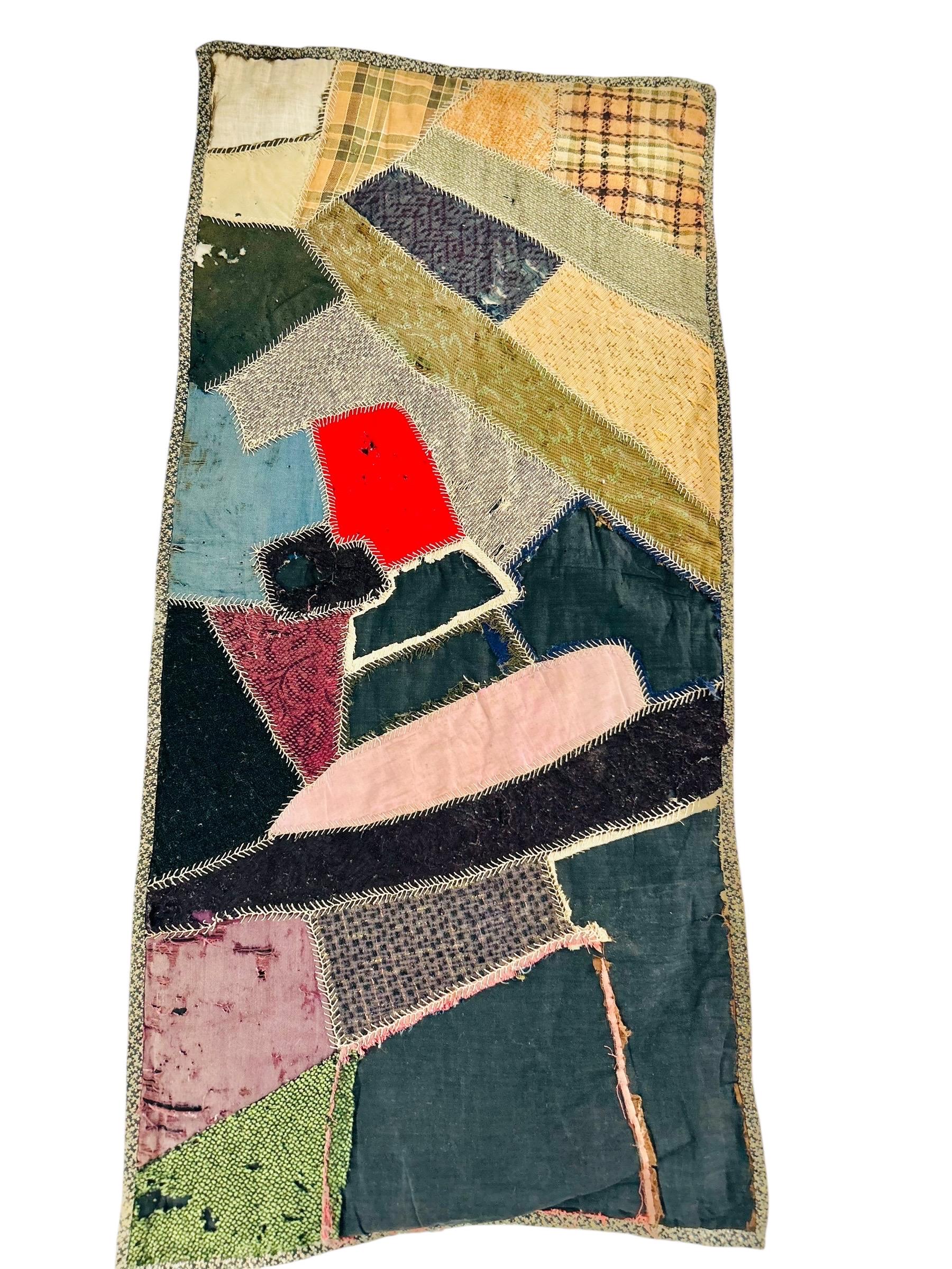 This very old Crazy Quilt Table Runner, circa 1870-1890s; is hand embroidered and incorporates a variety of fabrics including silks (many of which have shattered), old velvets, brocades and wools,