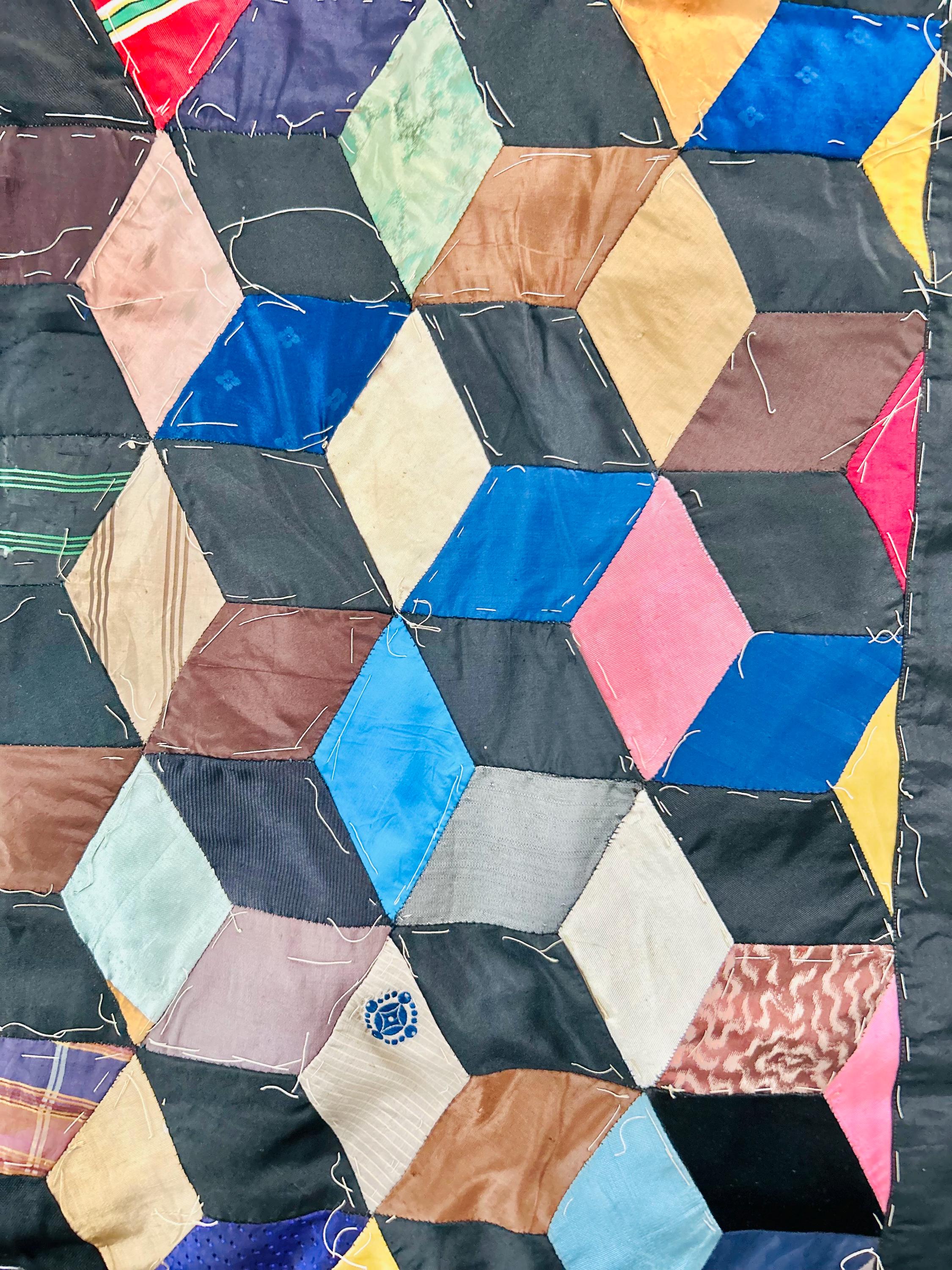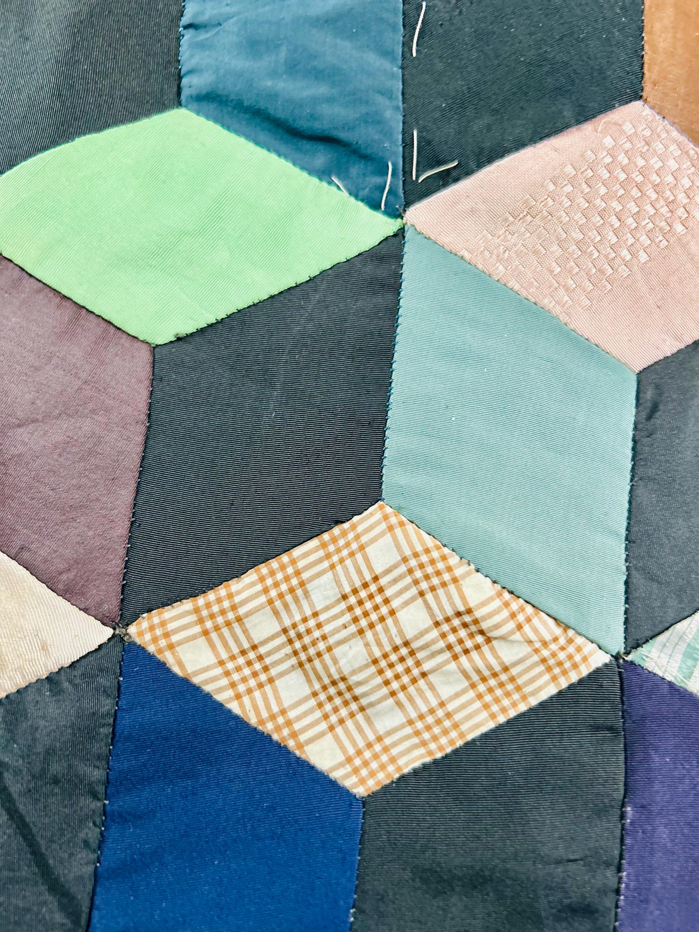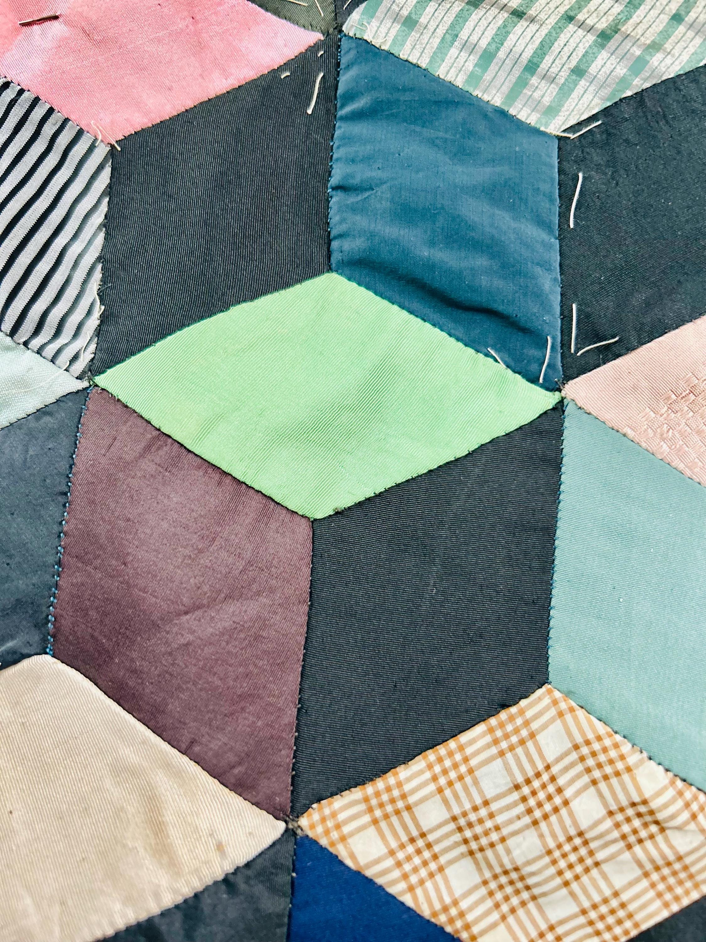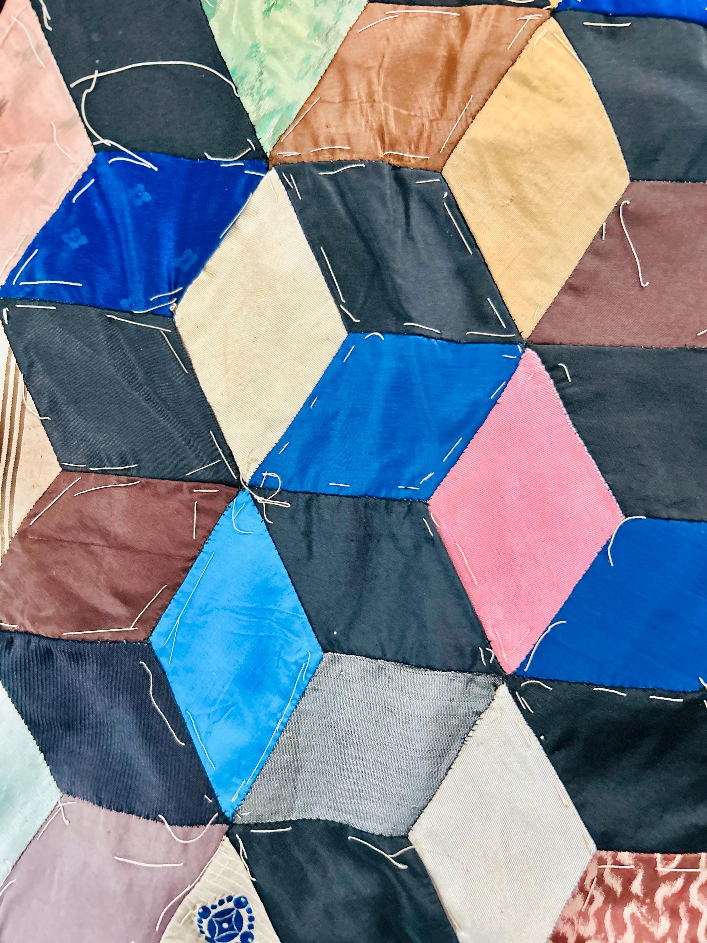 This early 20th Century Silk Quilt TOP ONLY is in a Tumbling Blocks design and has been paper pieced, with some of the paper not yet removed from the diamond pieces. While the paper is easily removed, I have left it intact and the handwriting and advertising is still visible from the back. See photos.