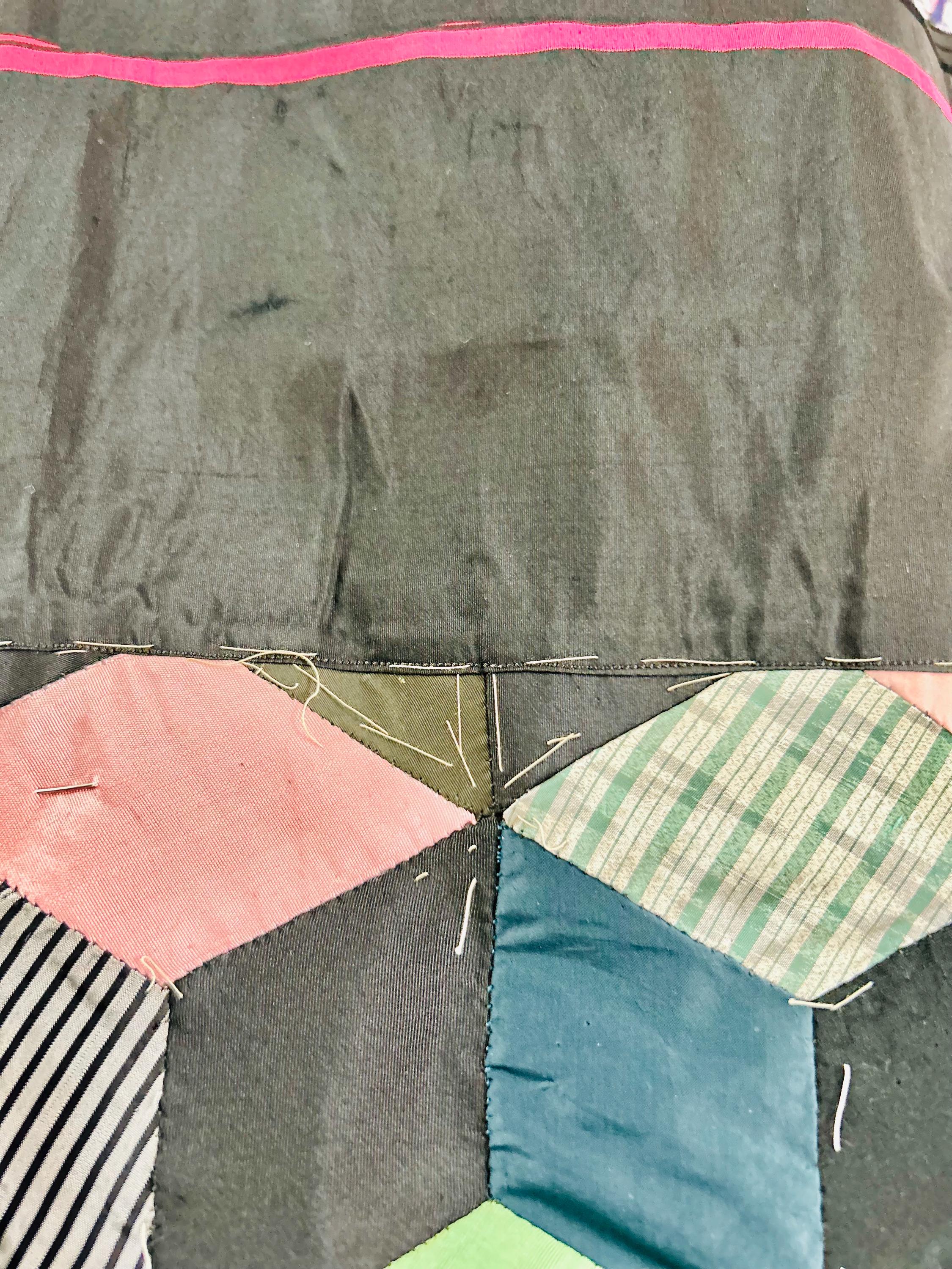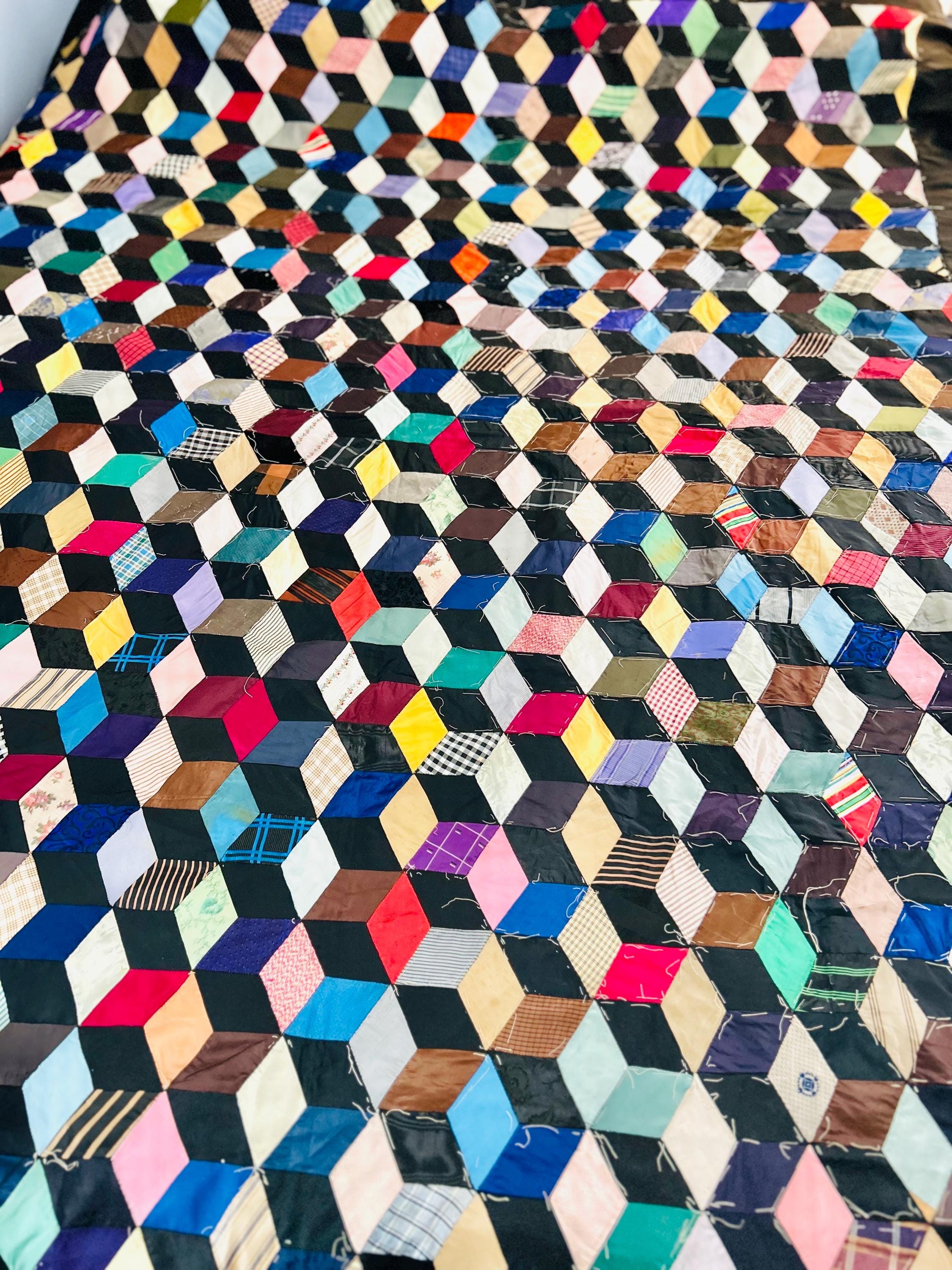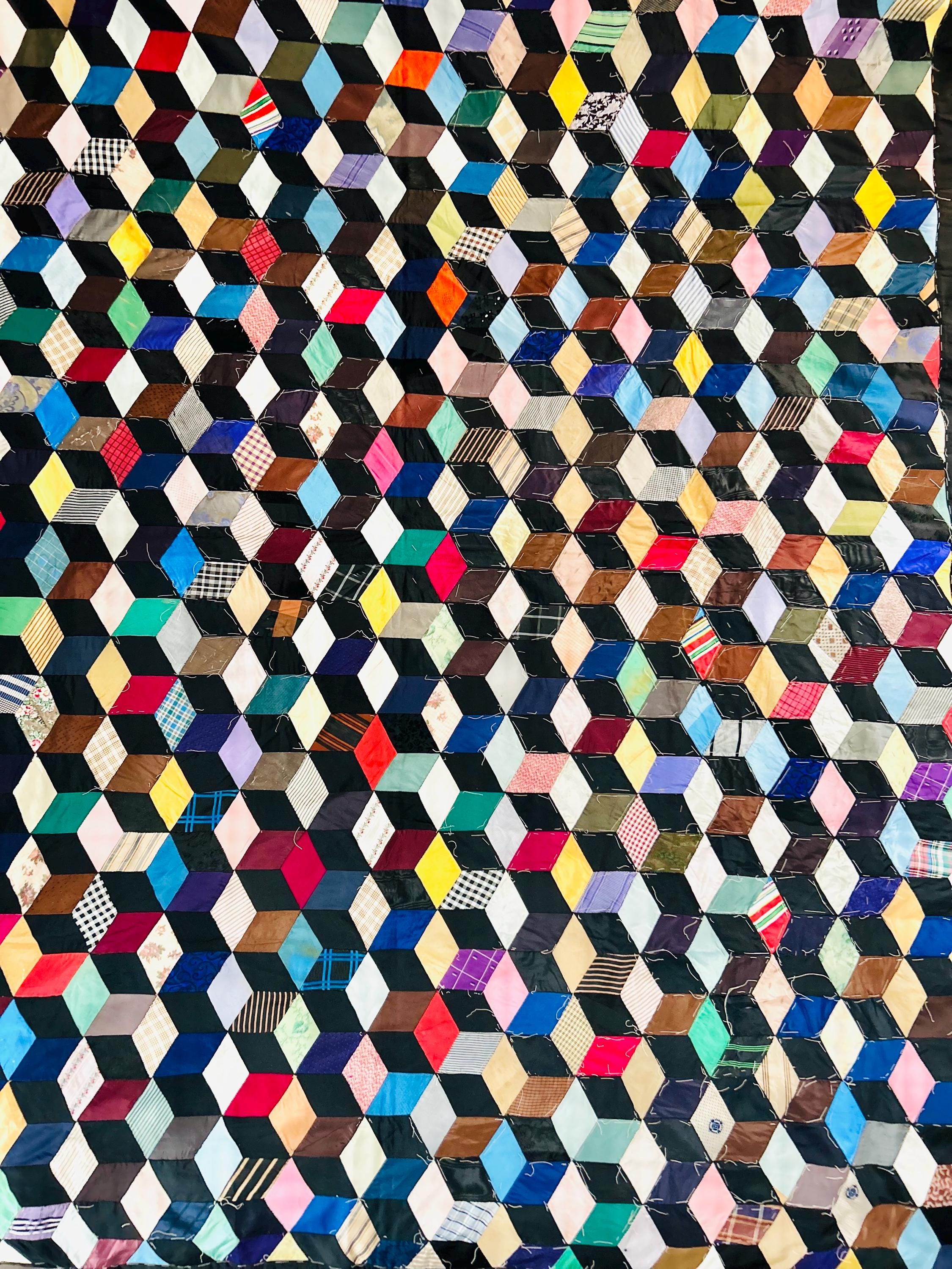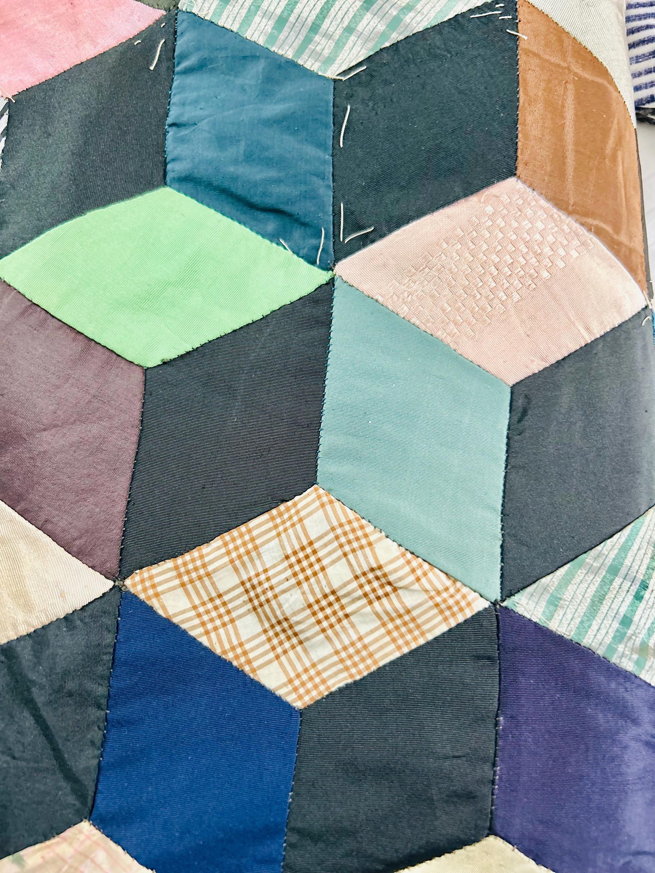 This early 20th Century Silk Quilt TOP ONLY is in a Tumbling Blocks design and has been paper pieced, with some of the paper not yet removed from the diamond pieces. While the paper is easily removed, I have left it intact and the handwriting and advertising is still visible from the back. See photos.