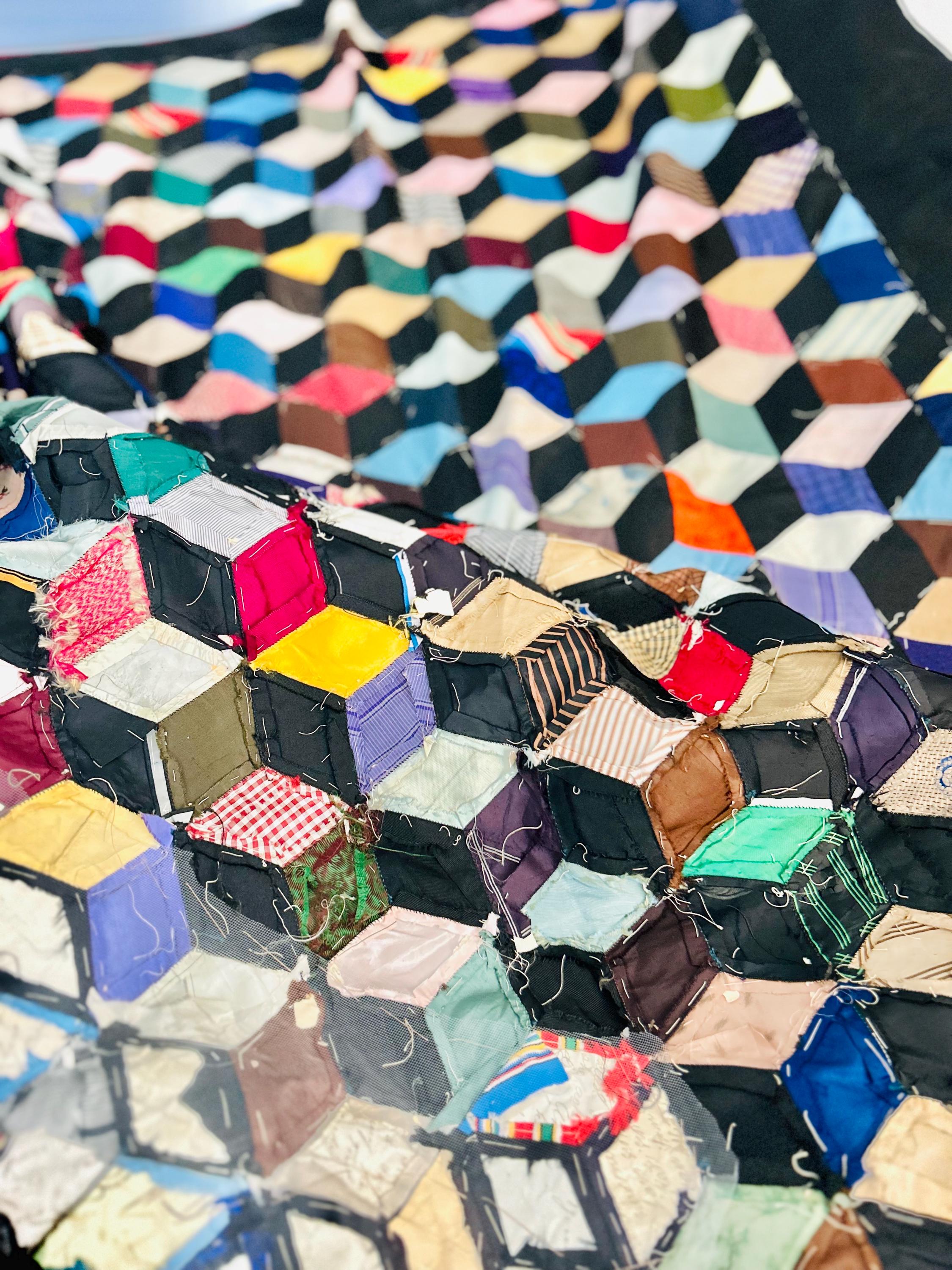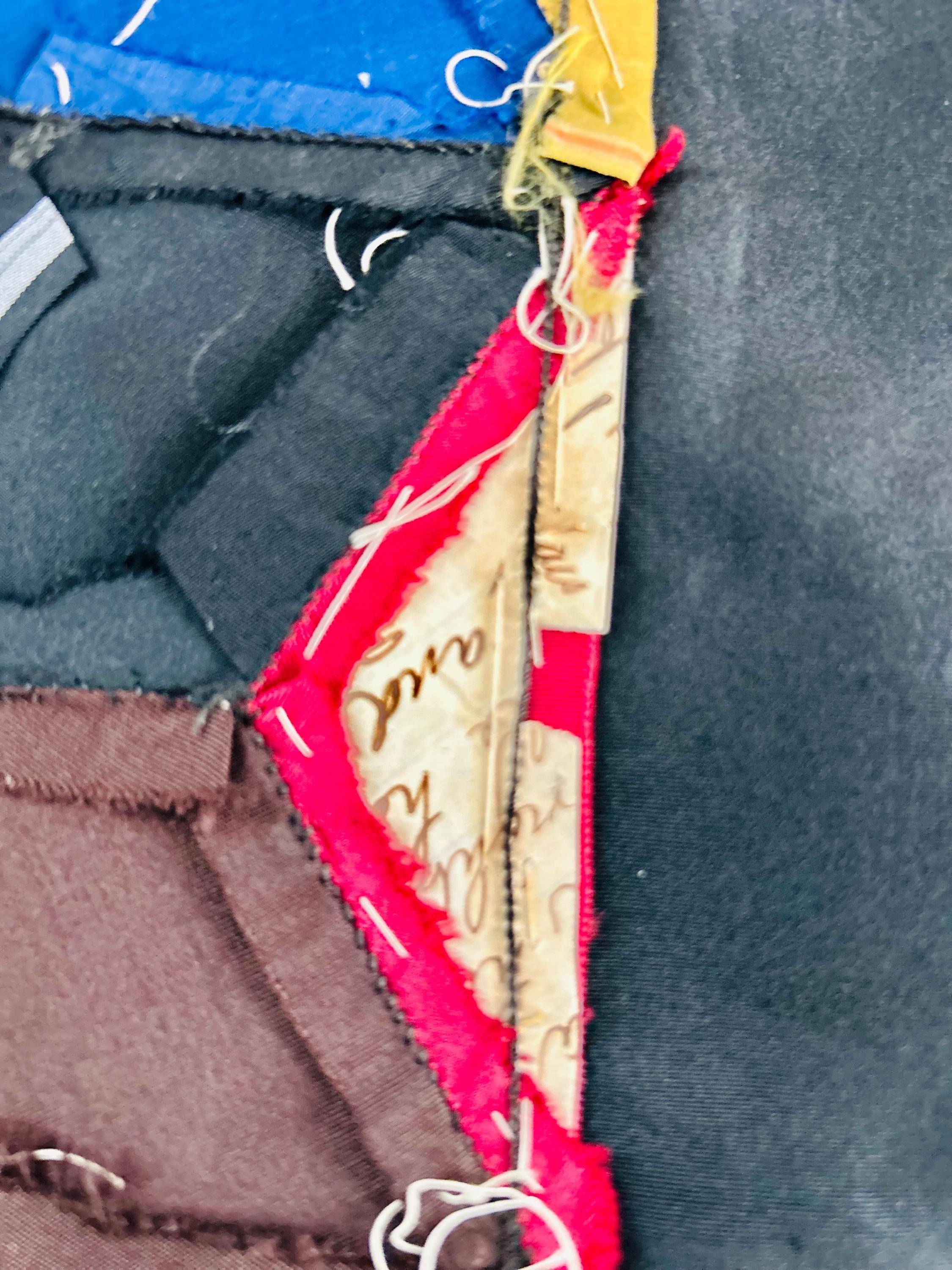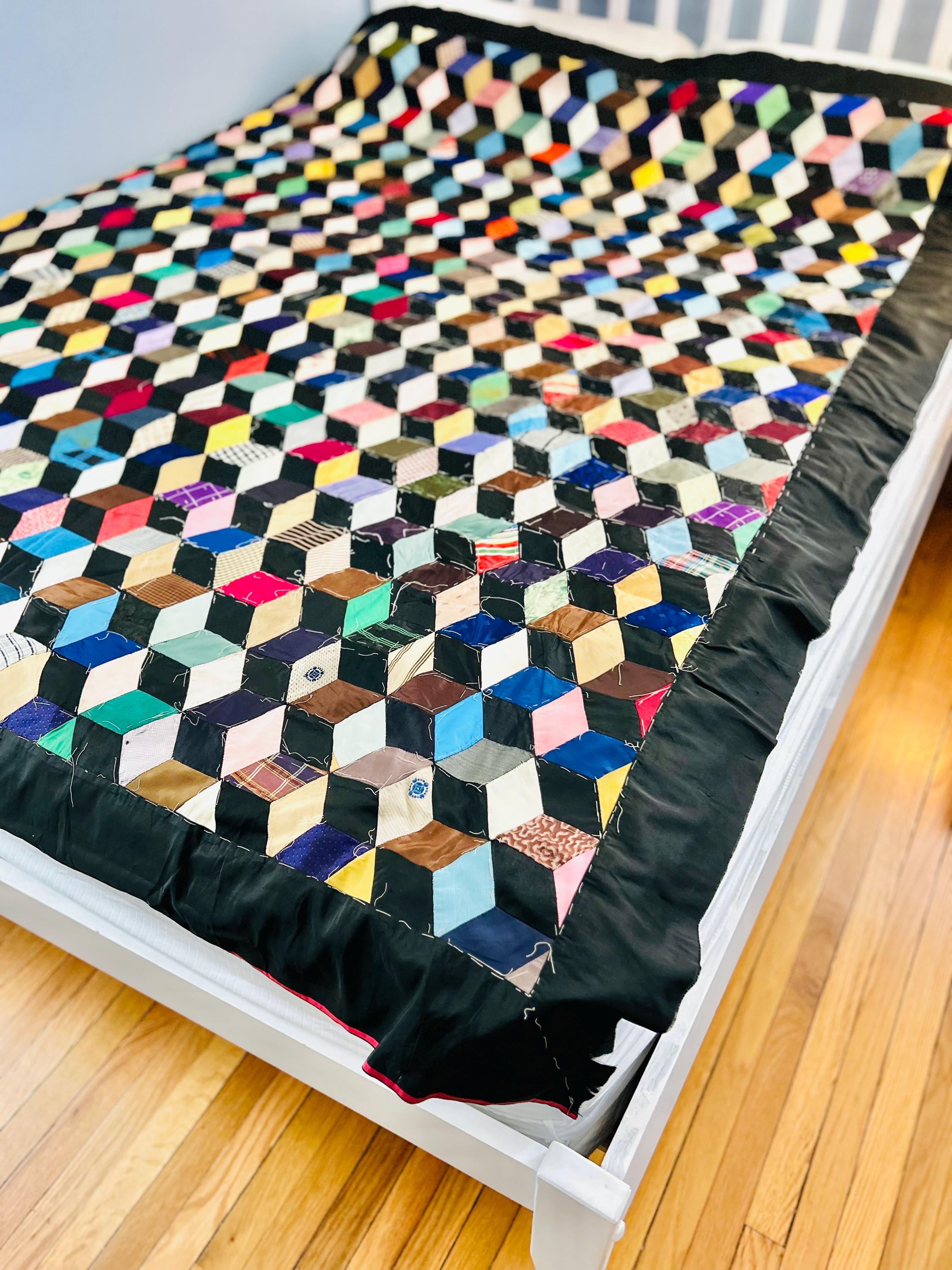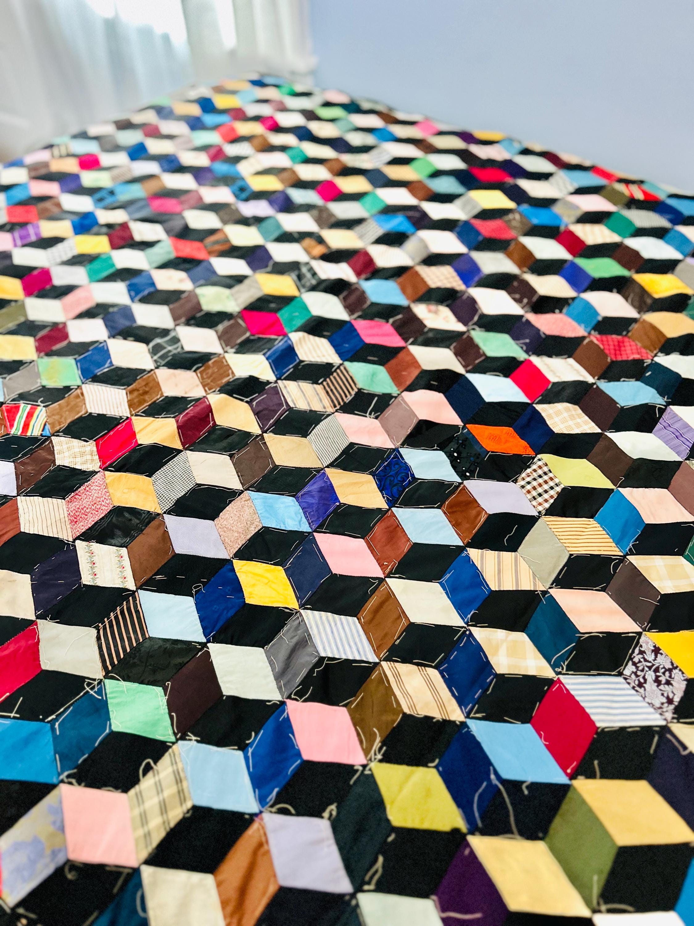 This early 20th Century Silk Quilt TOP ONLY is in a Tumbling Blocks design and has been paper pieced, with some of the paper not yet removed from the diamond pieces. While the paper is easily removed, I have left it intact and the handwriting and advertising is still visible from the back. See photos.