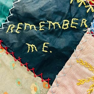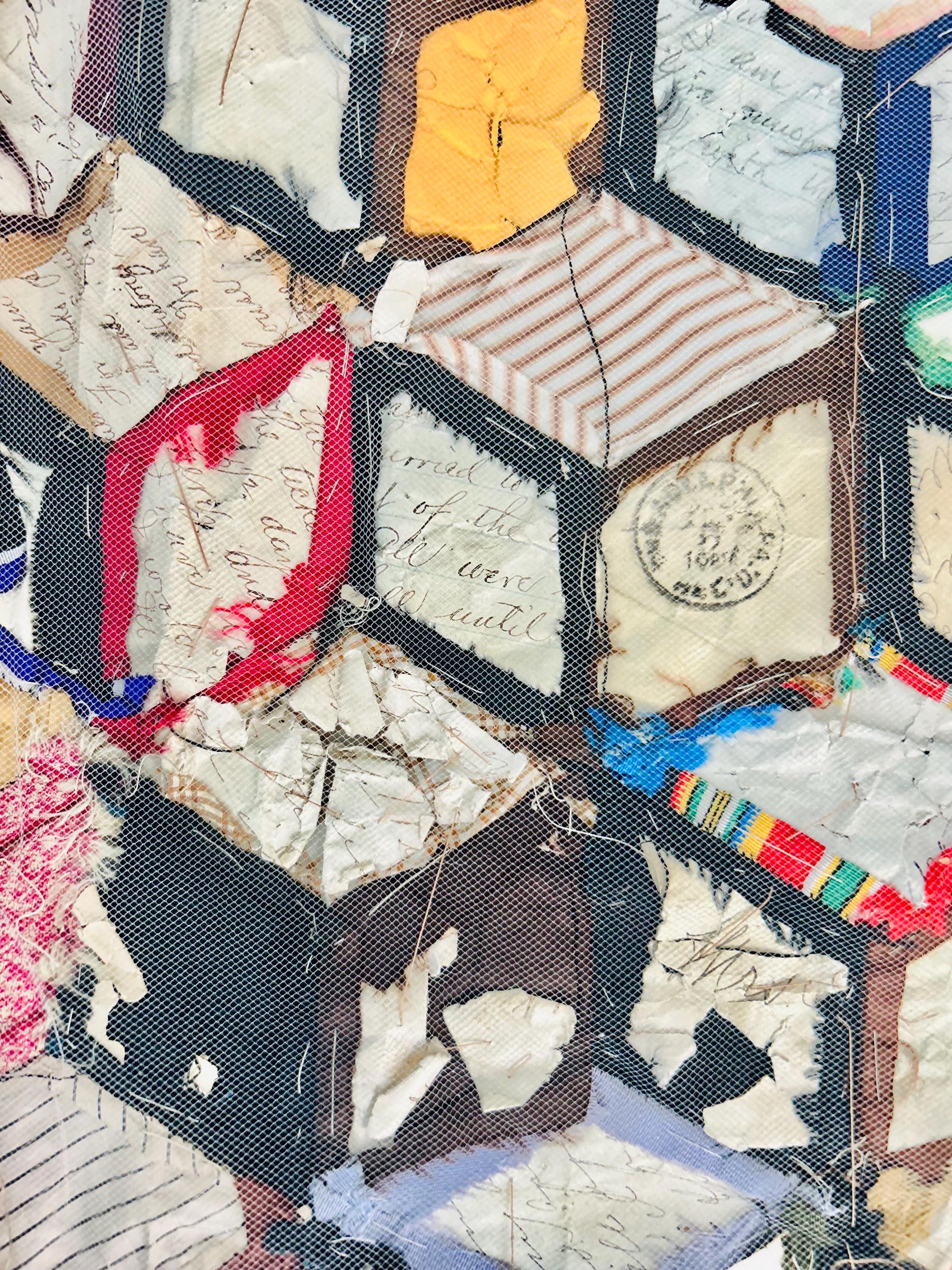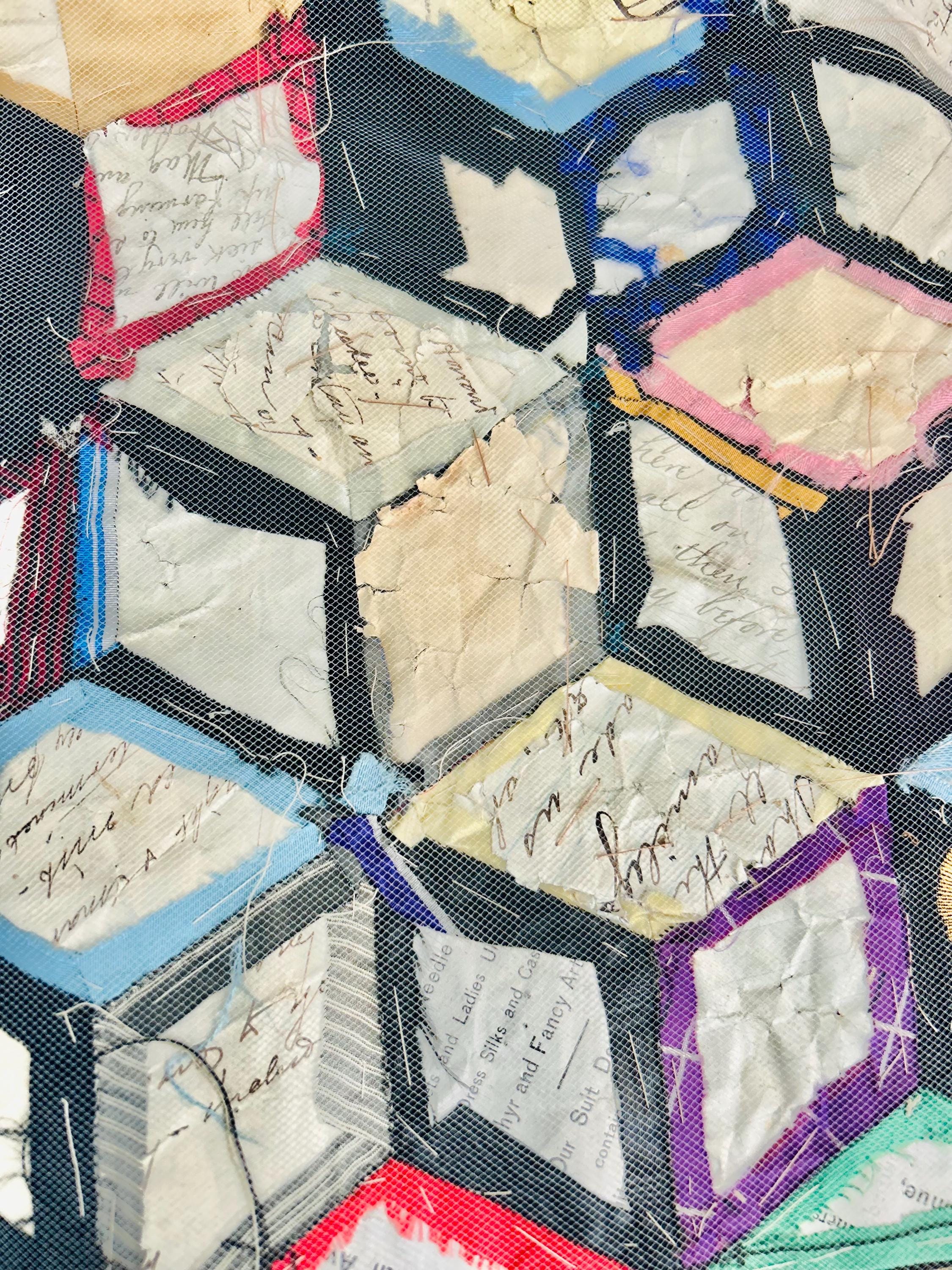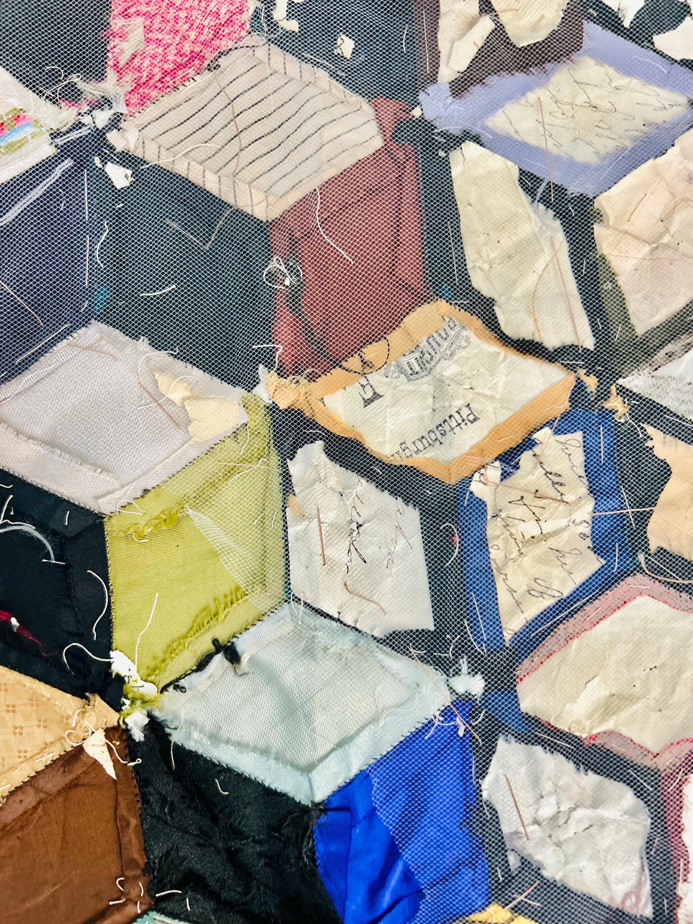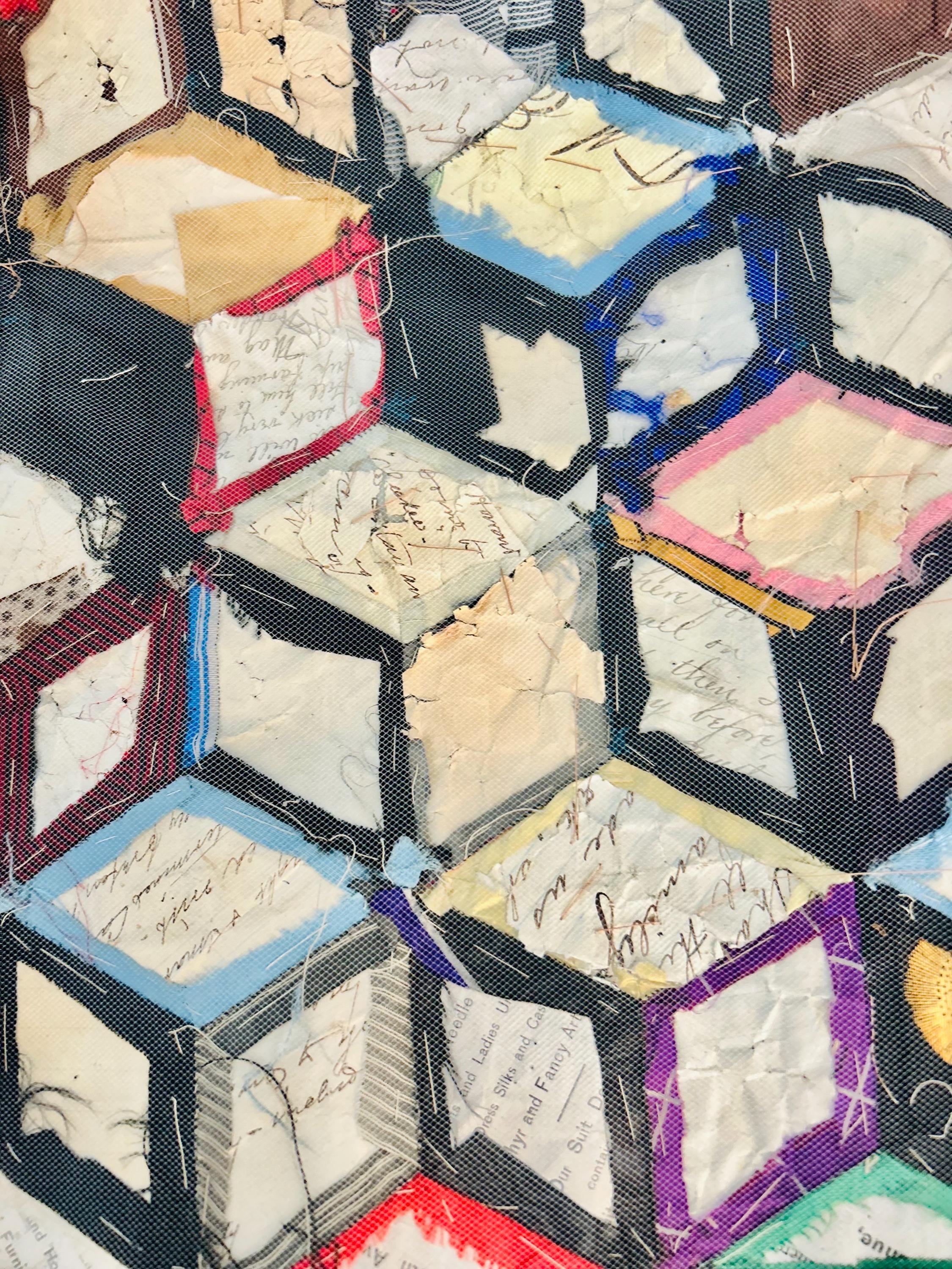 This early 20th Century Silk Quilt TOP ONLY is in a Tumbling Blocks design and has been paper pieced, with some of the paper not yet removed from the diamond pieces. While the paper is easily removed, I have left it intact and the handwriting and advertising is still visible from the back. See photos.
