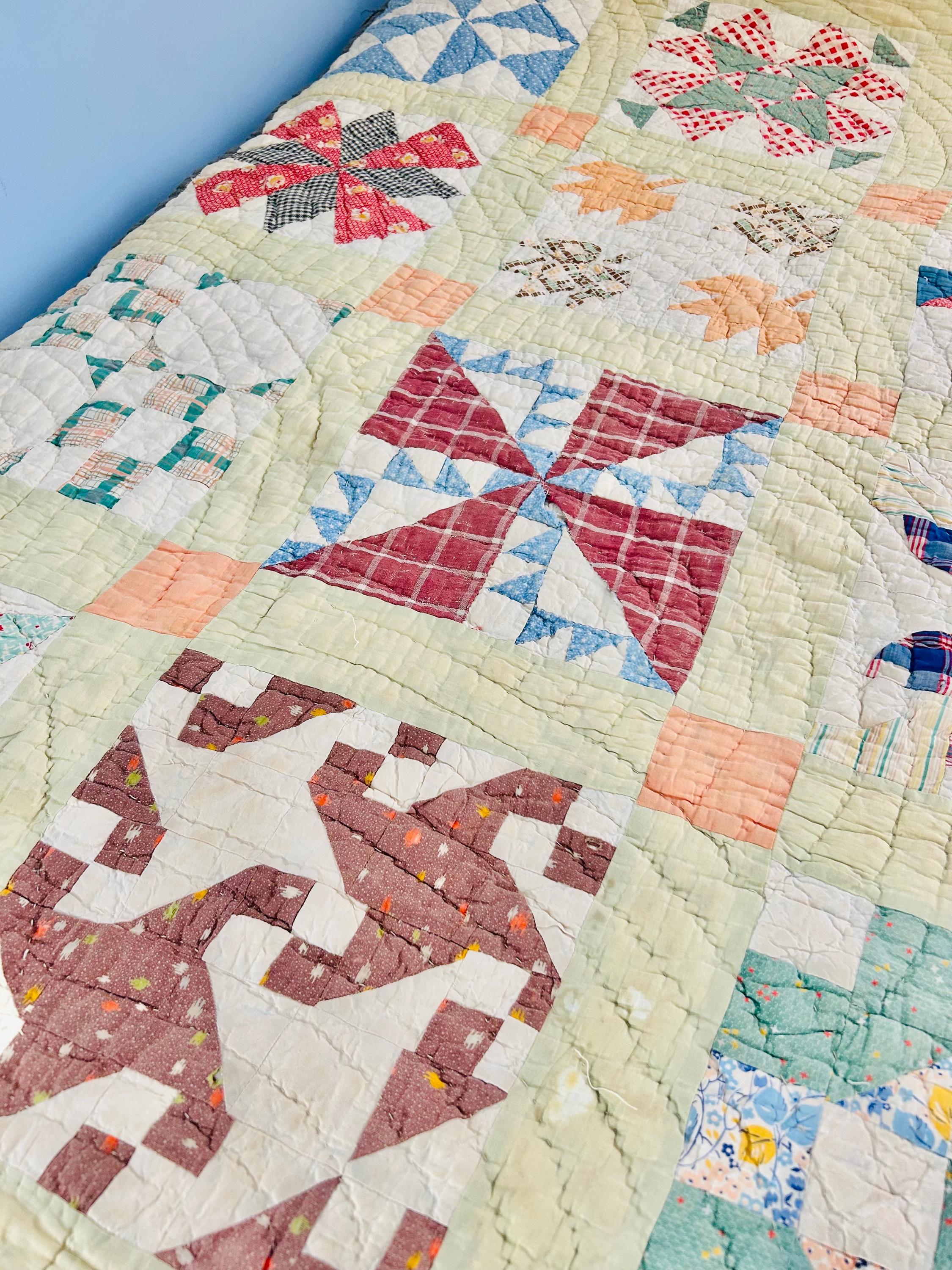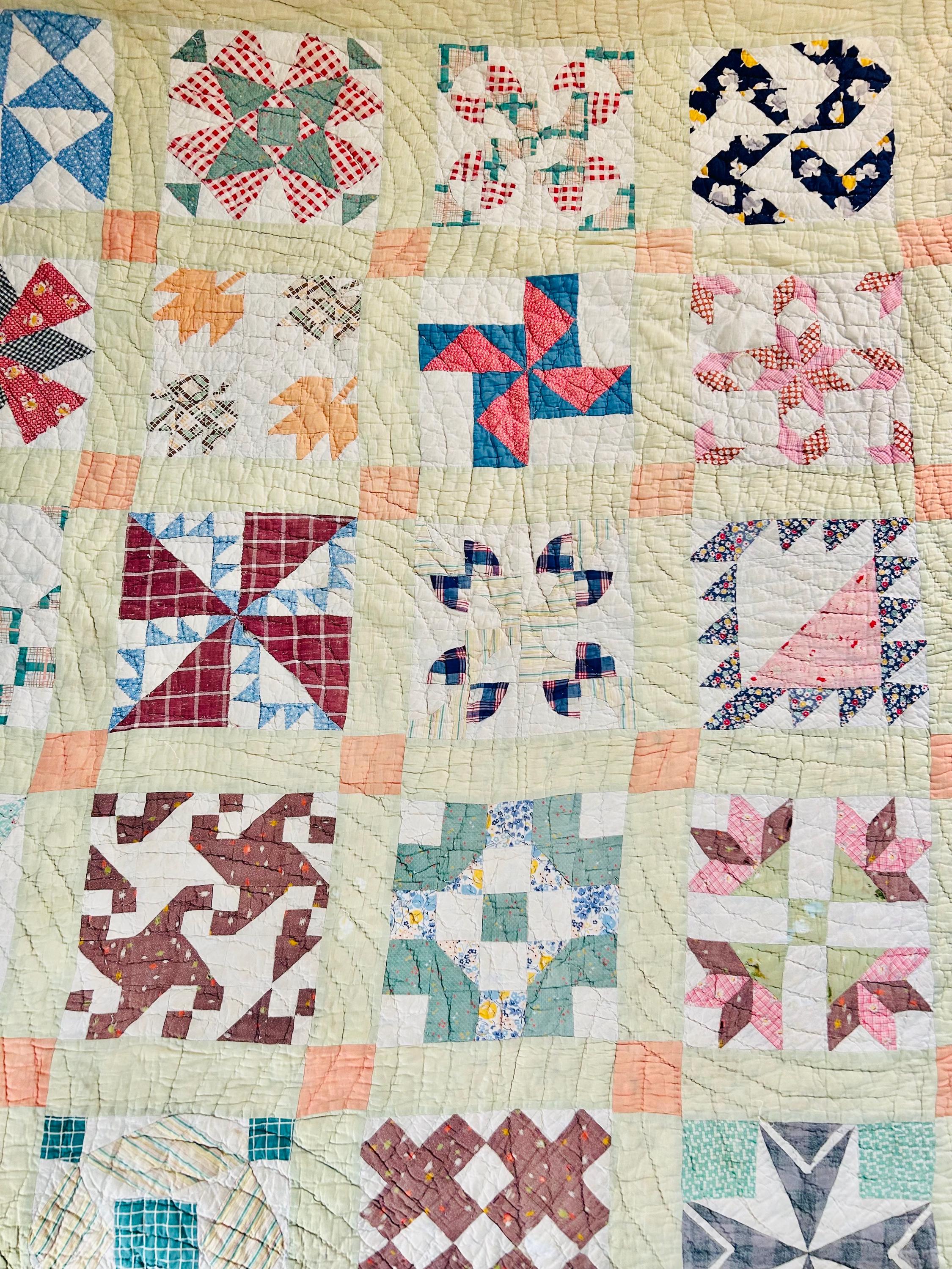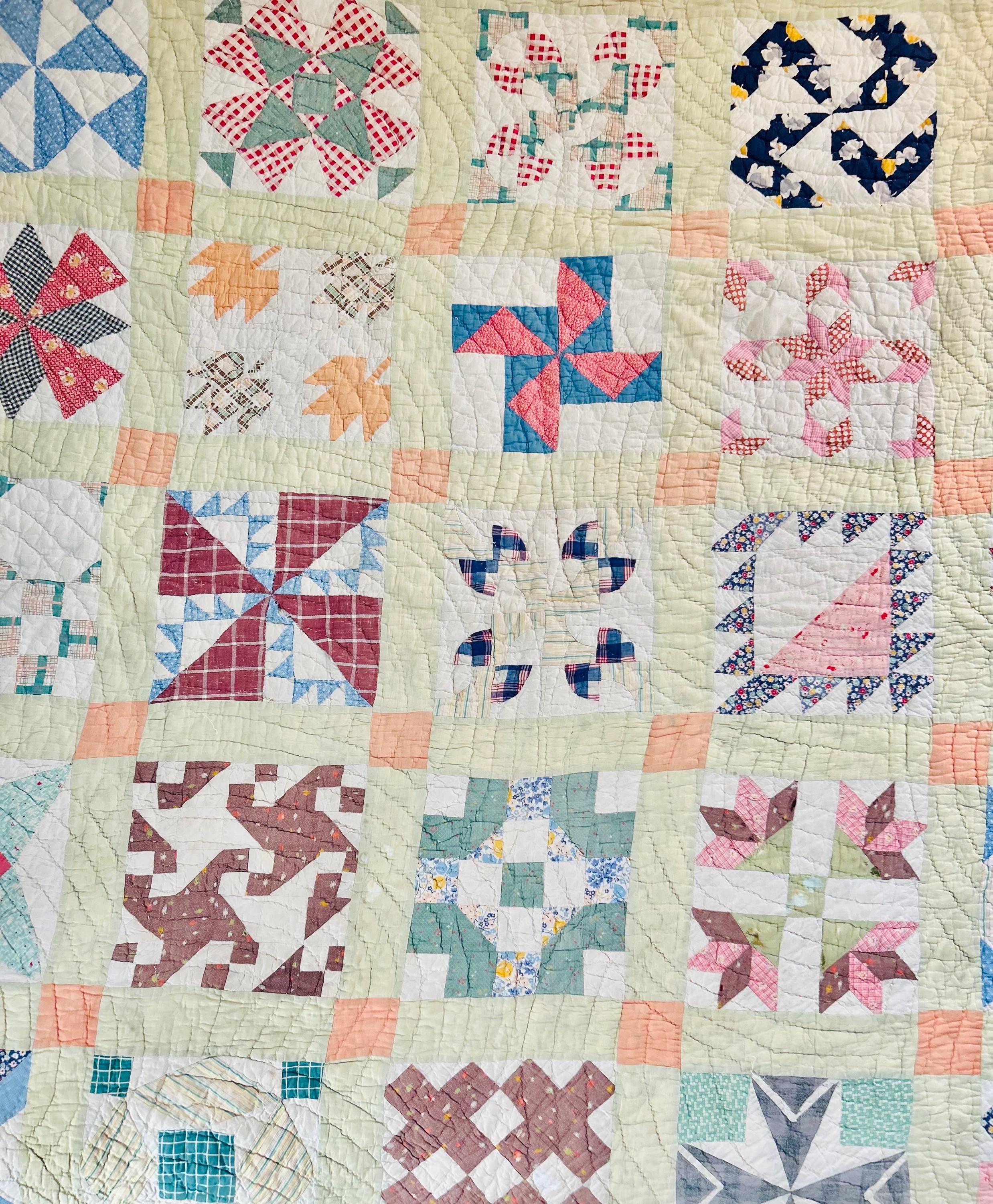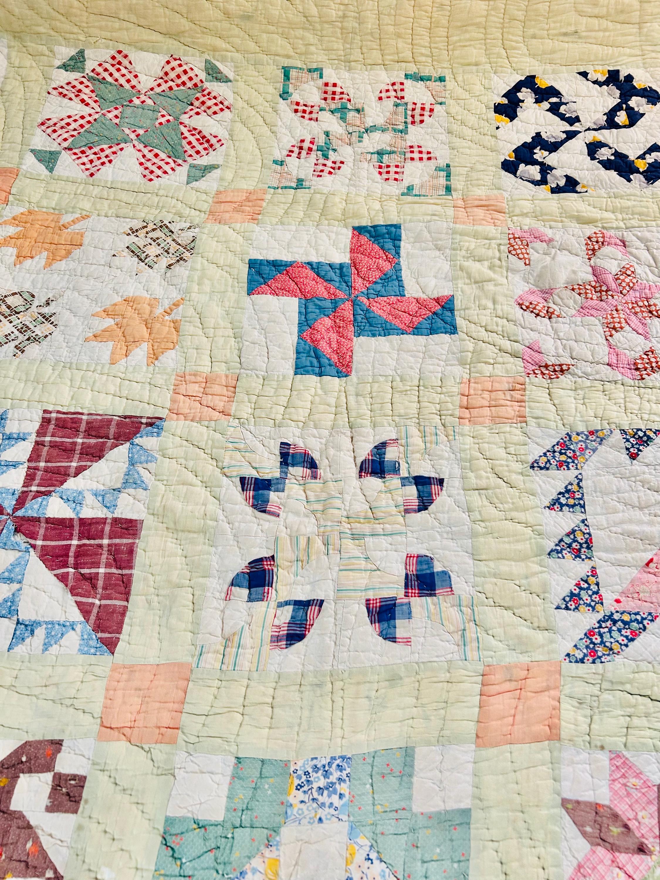 This wonderful old Sampler Quilt, circa 1880-1910, features 25 different patterns framed by pale green sashing with peach square separations. It has a five-inch border on two sides and has been hand-quilted in a repeating shell pattern from border to border.