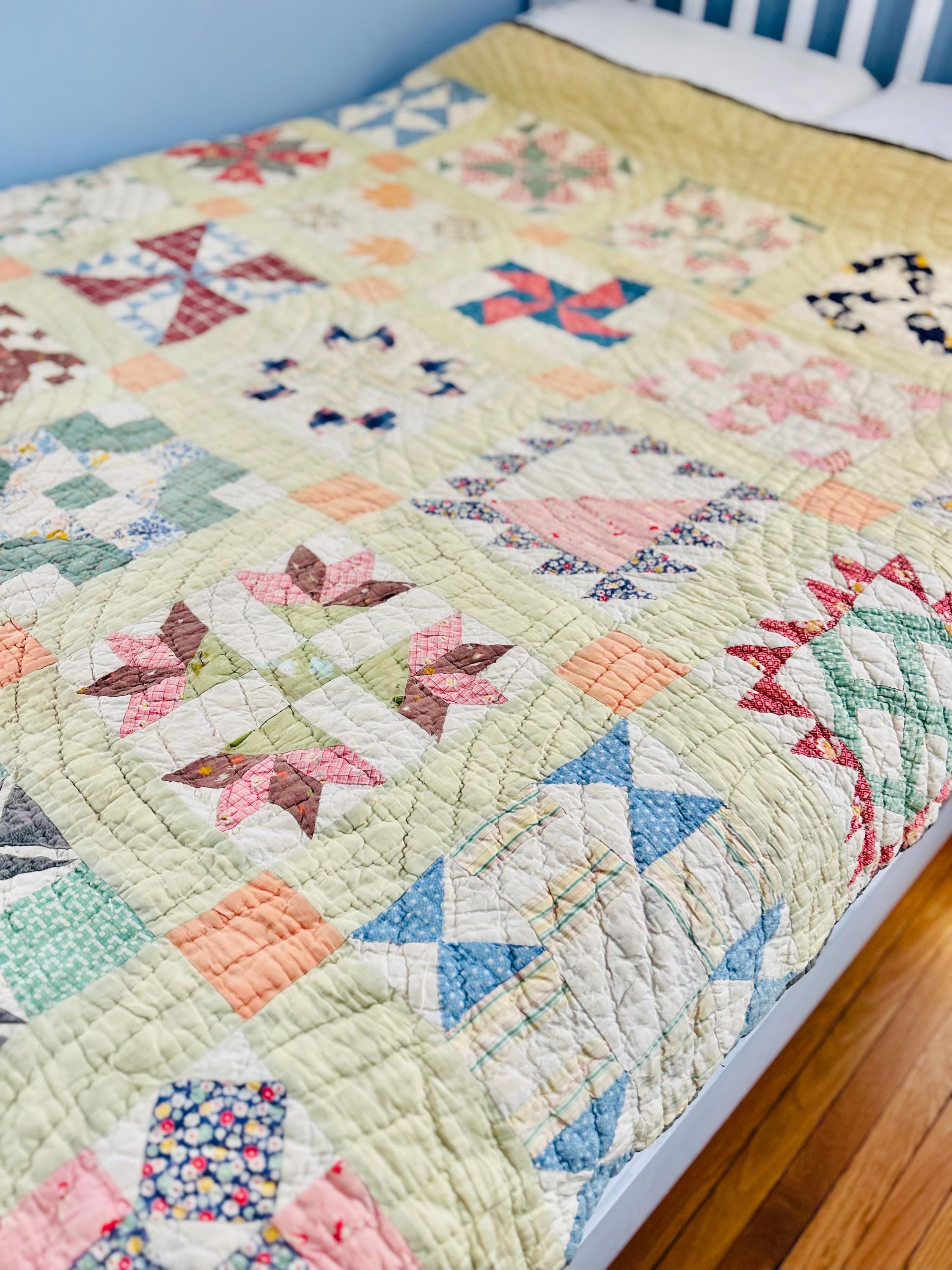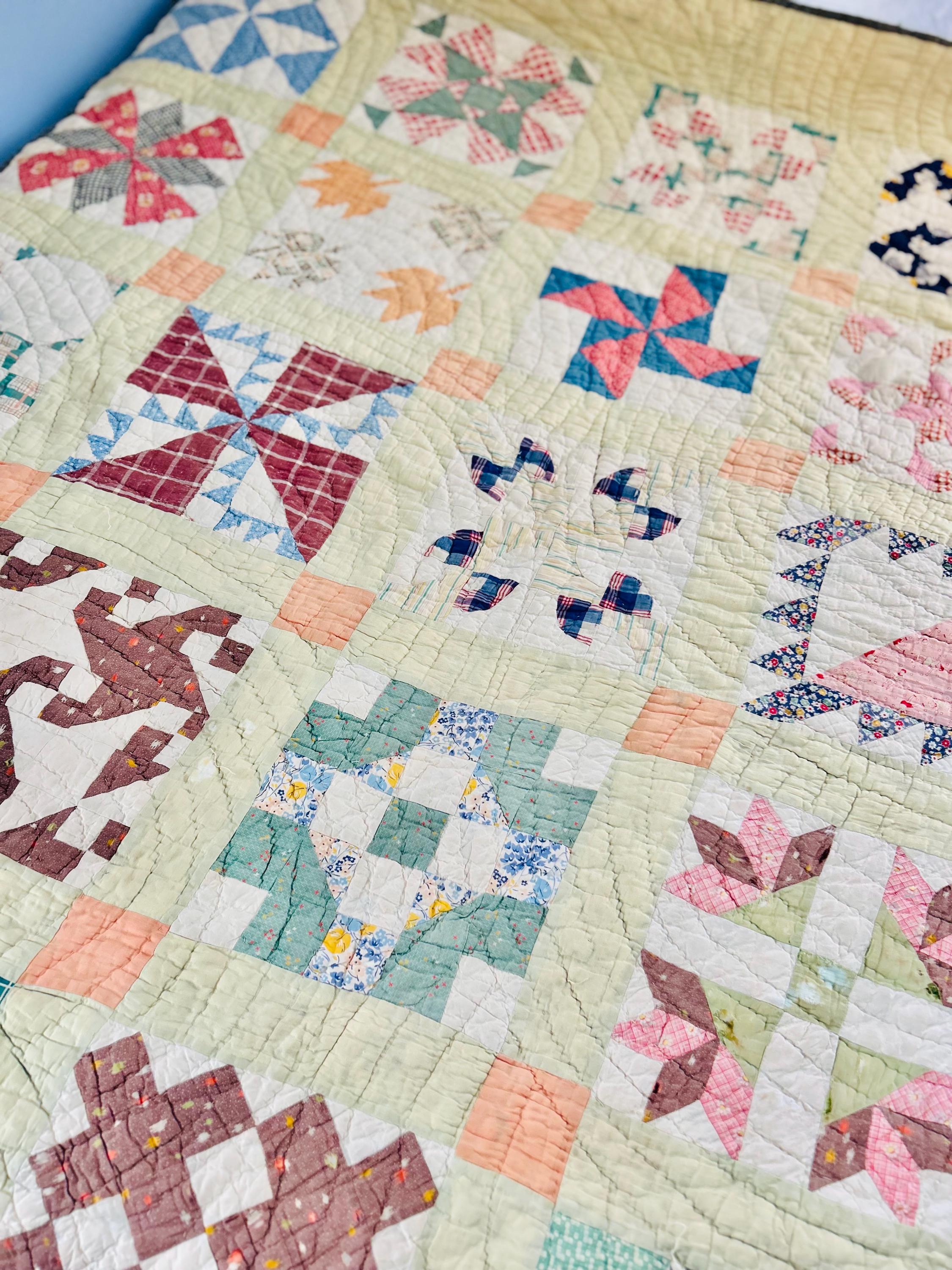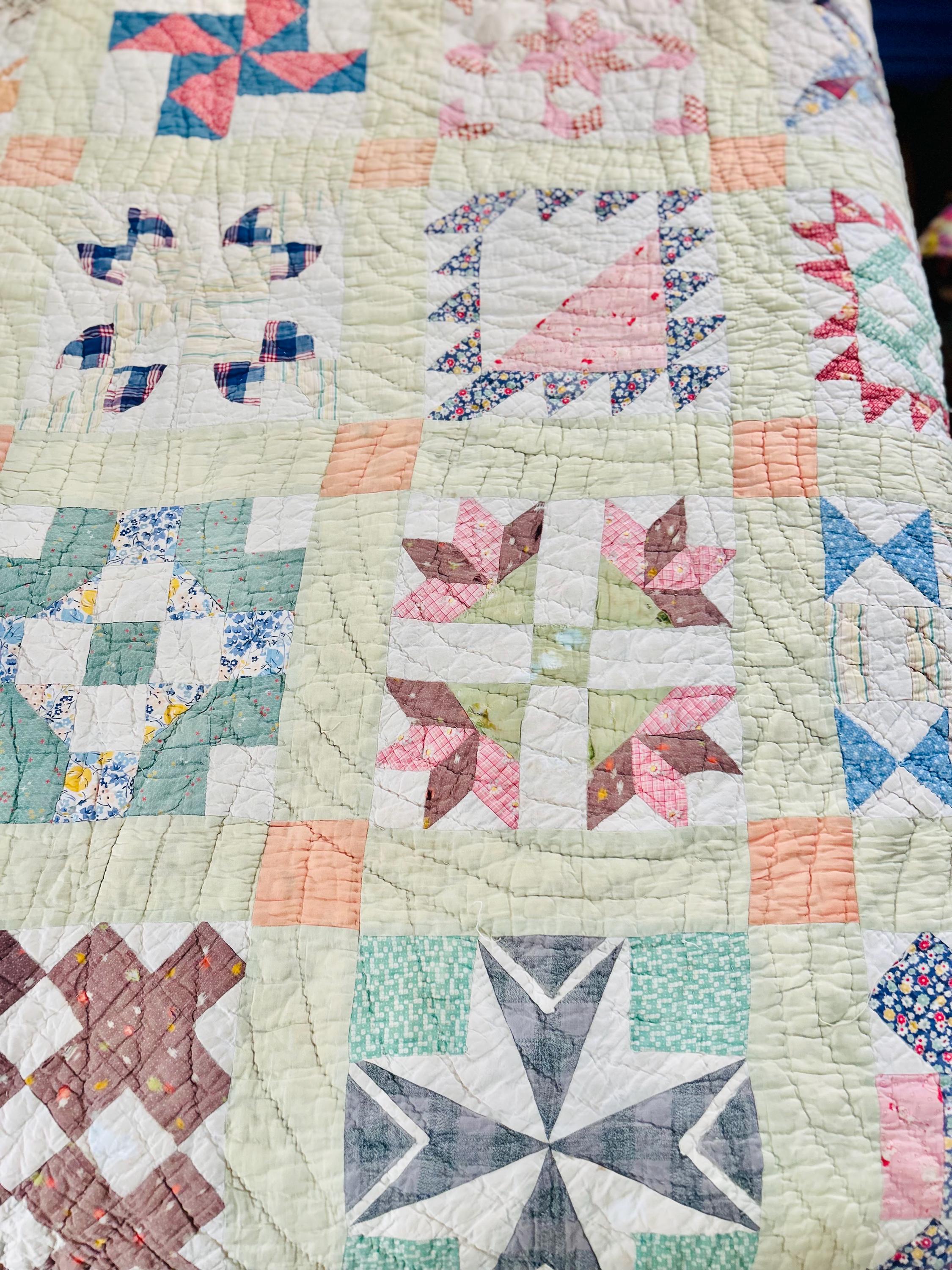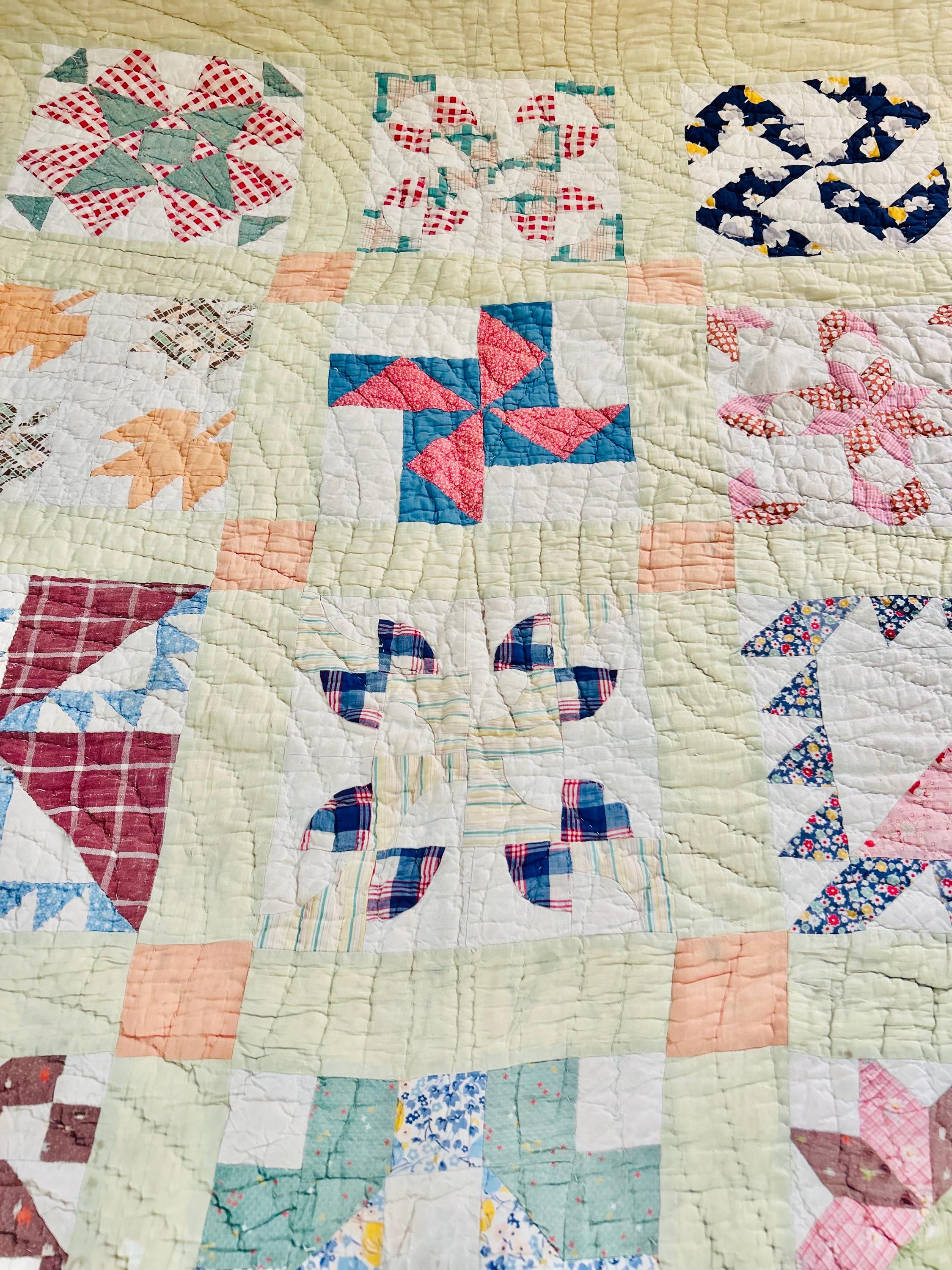 This wonderful old Sampler Quilt, circa 1880-1910, features 25 different patterns framed by pale green sashing with peach square separations. It has a five-inch border on two sides and has been hand-quilted in a repeating shell pattern from border to border.