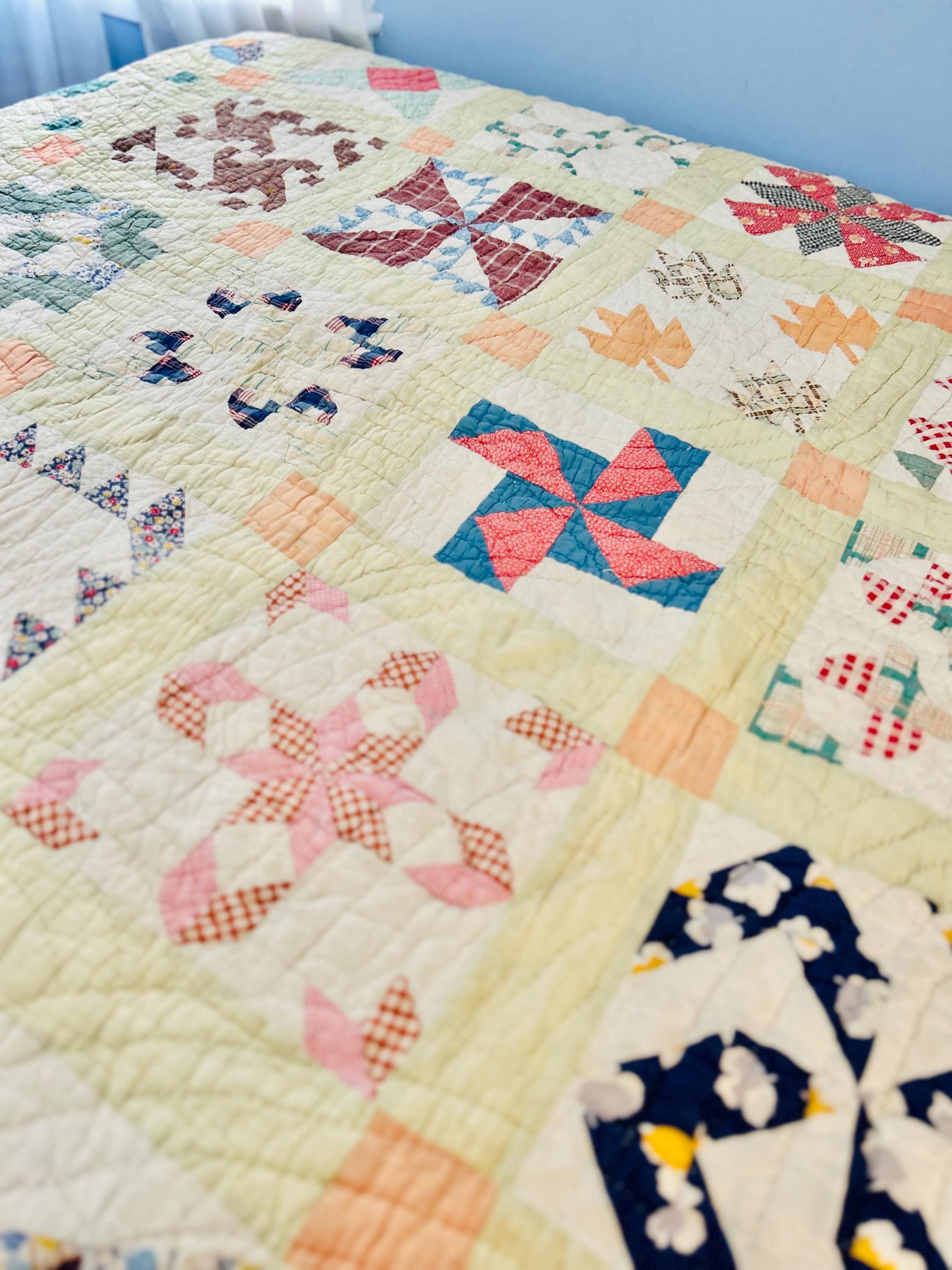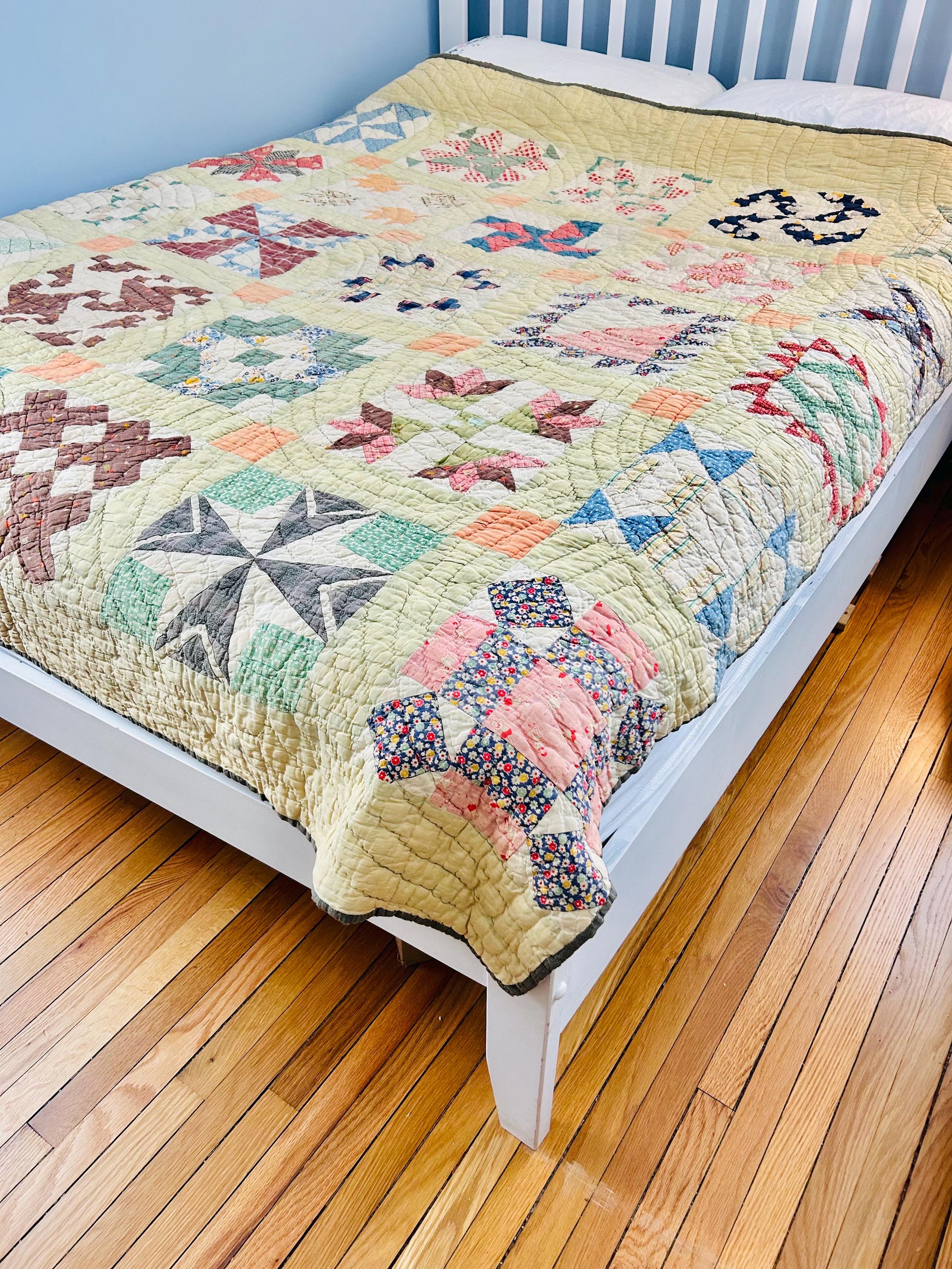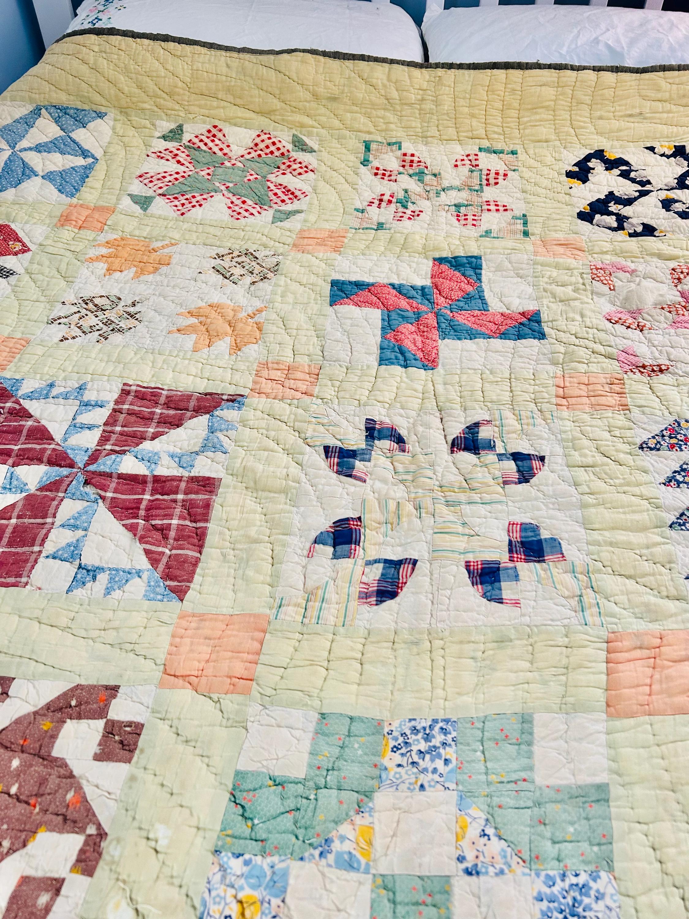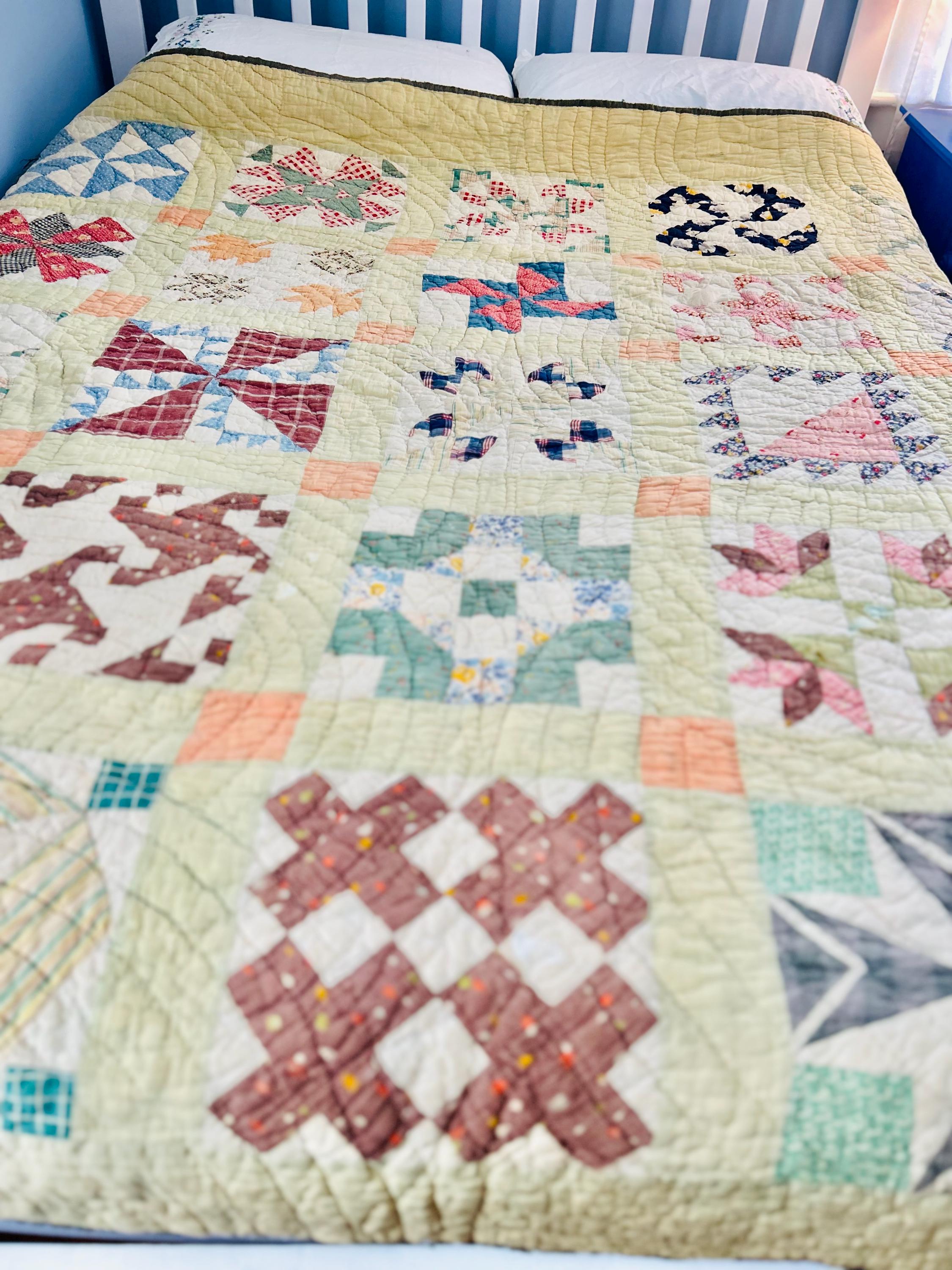 This wonderful old Sampler Quilt, circa 1880-1910, features 25 different patterns framed by pale green sashing with peach square separations. It has a five-inch border on two sides and has been hand-quilted in a repeating shell pattern from border to border.