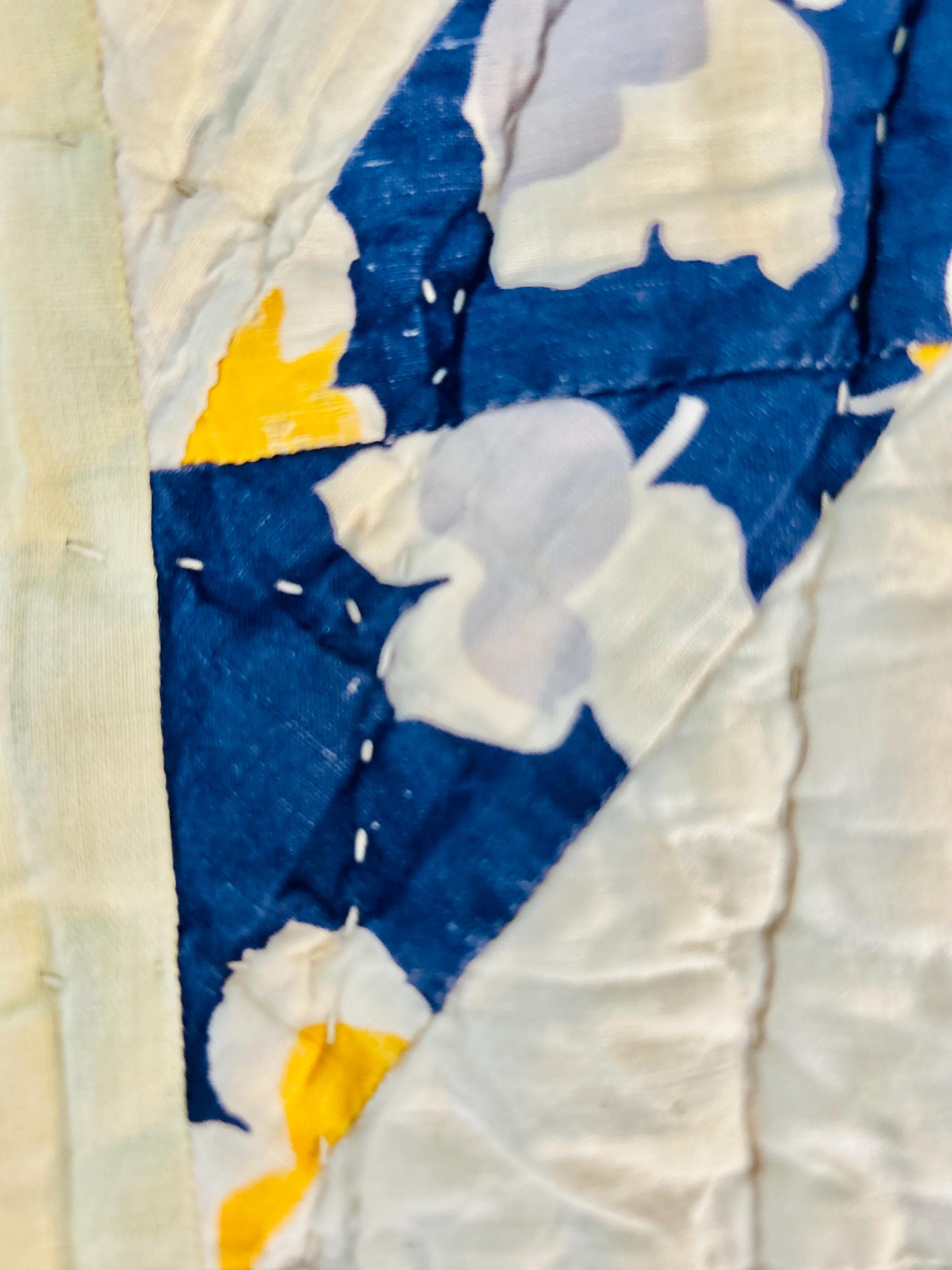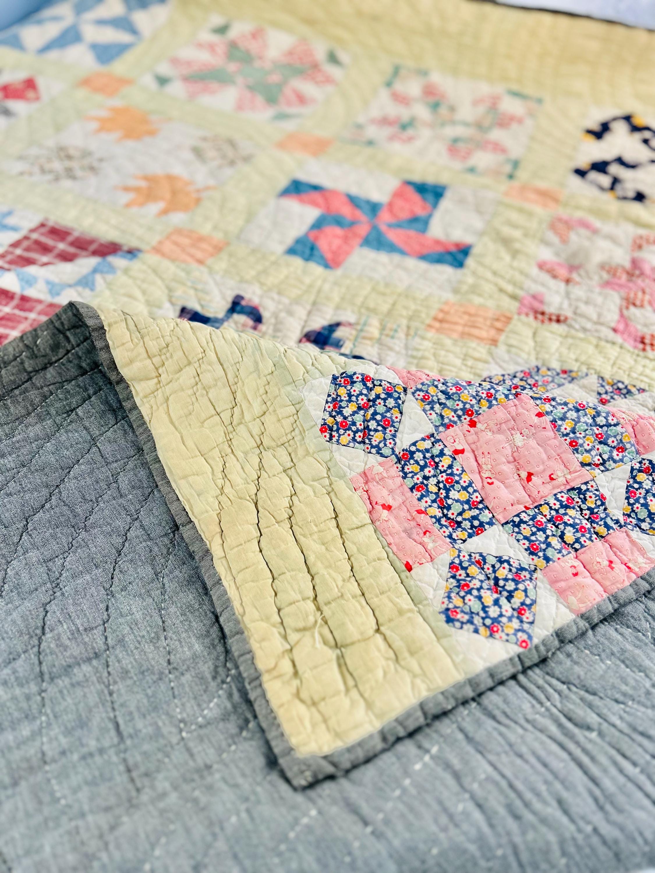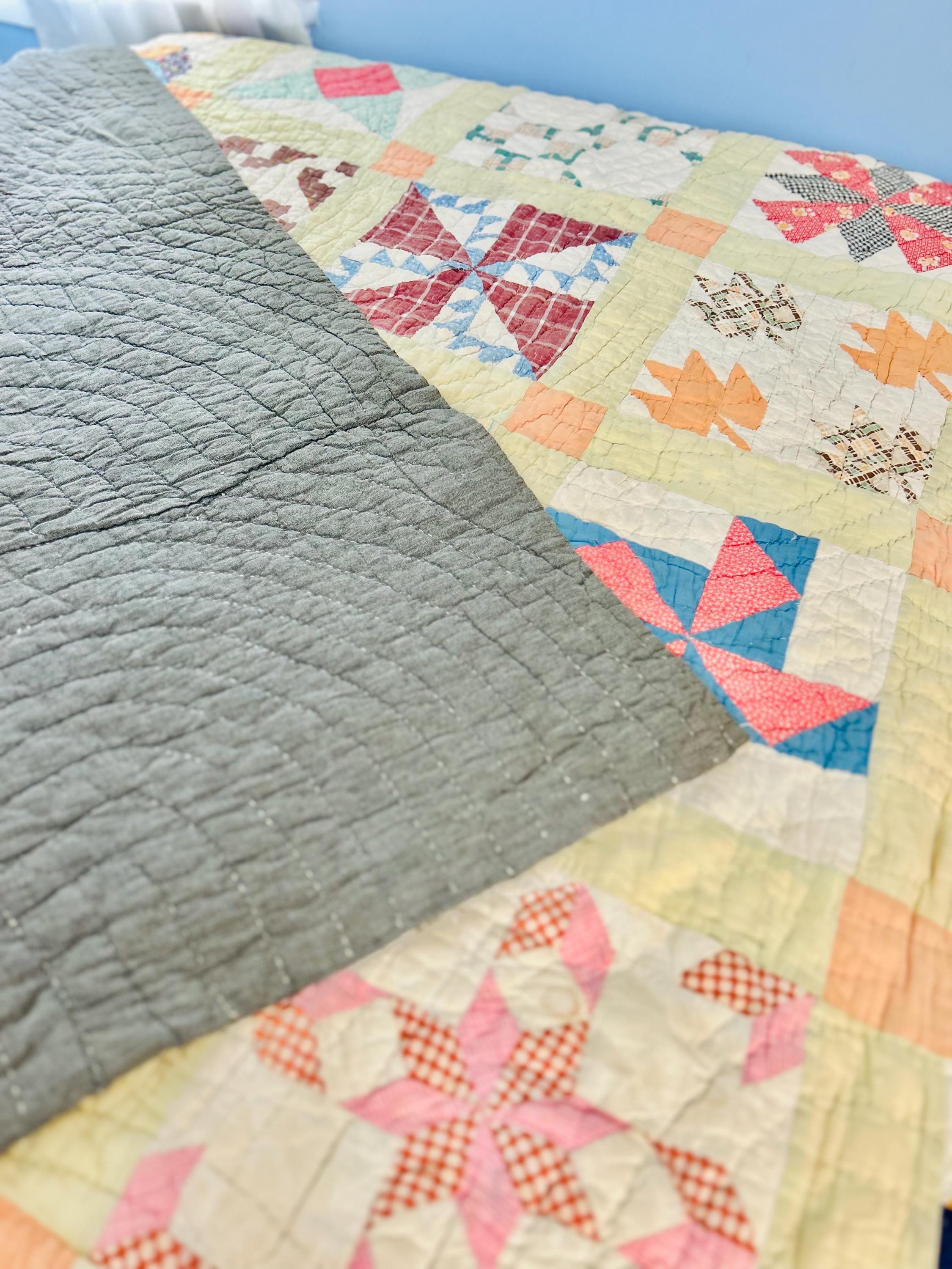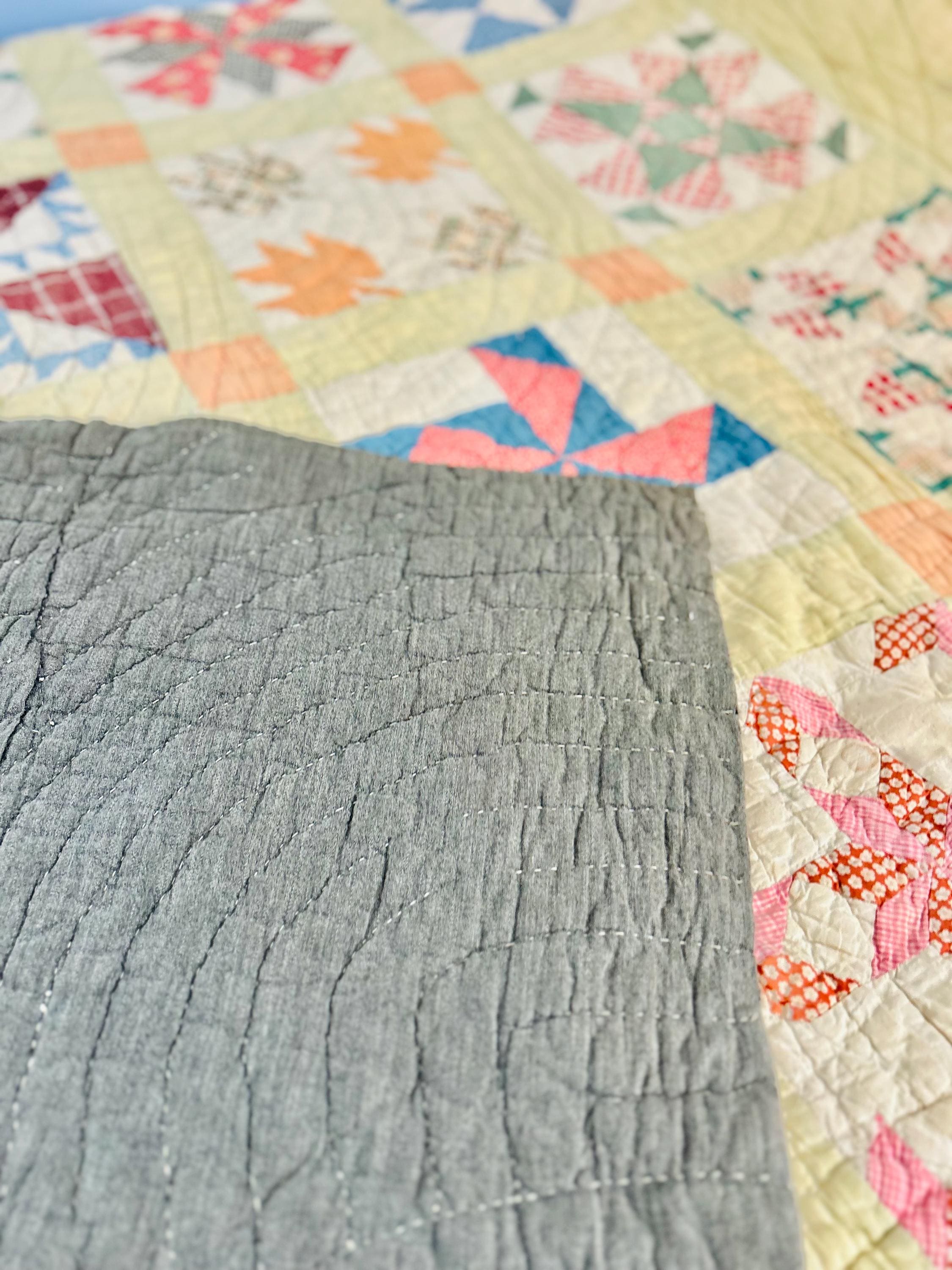 The back is a dark grey muslin that has been turned to the front and hand-stitched to form the binding. The cotton batting is unsized and lightweight.