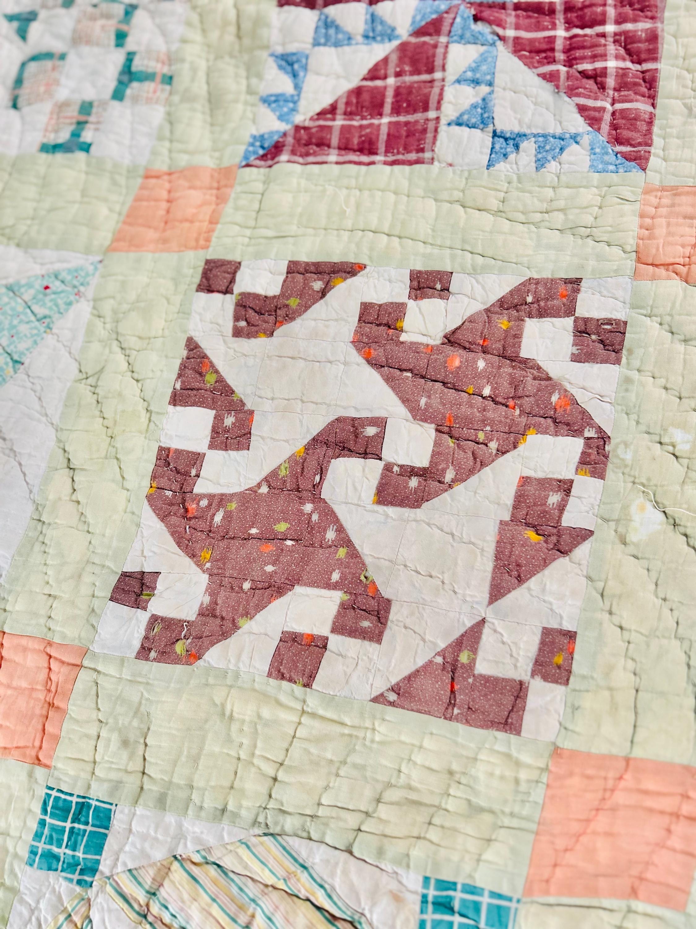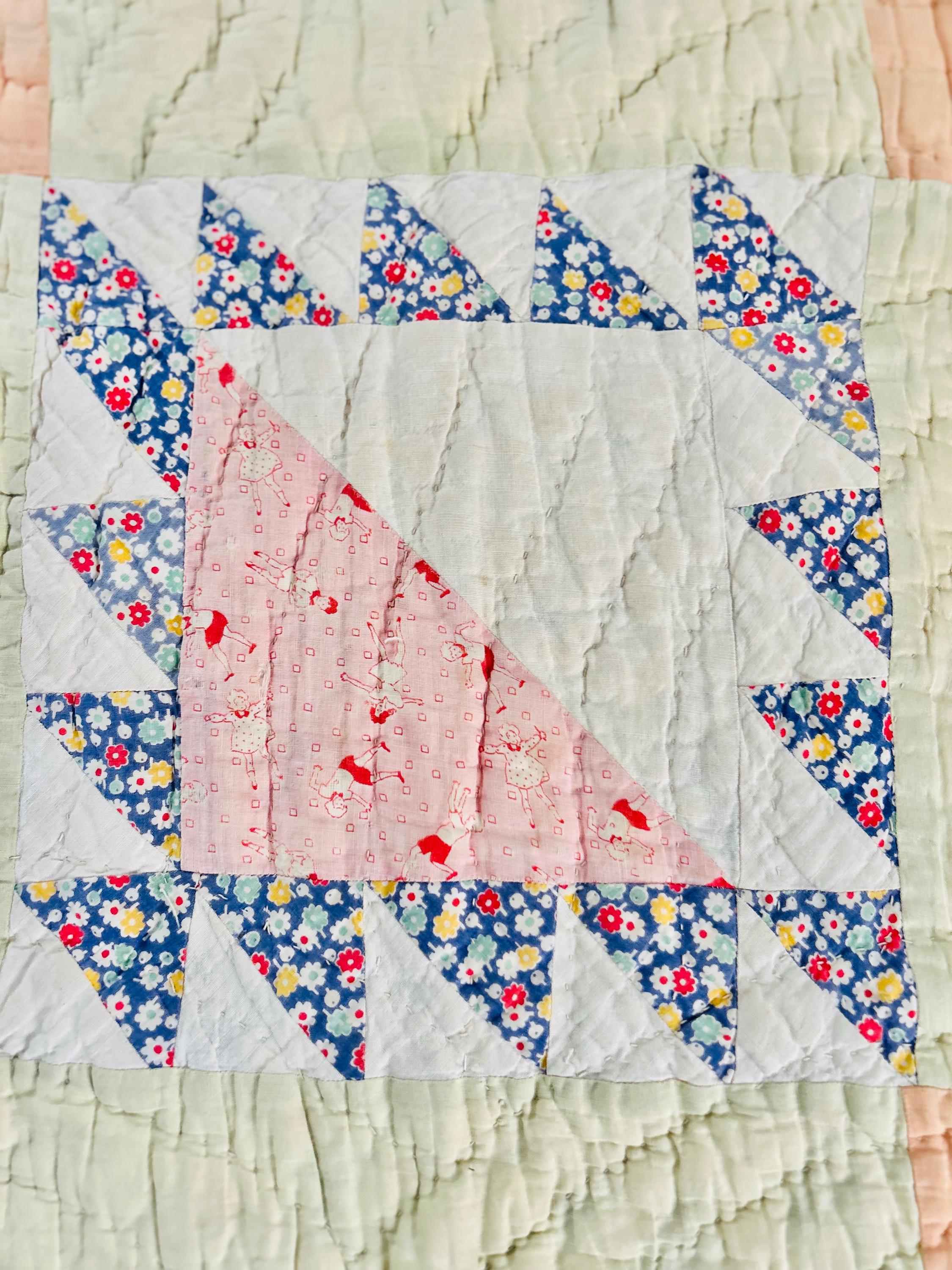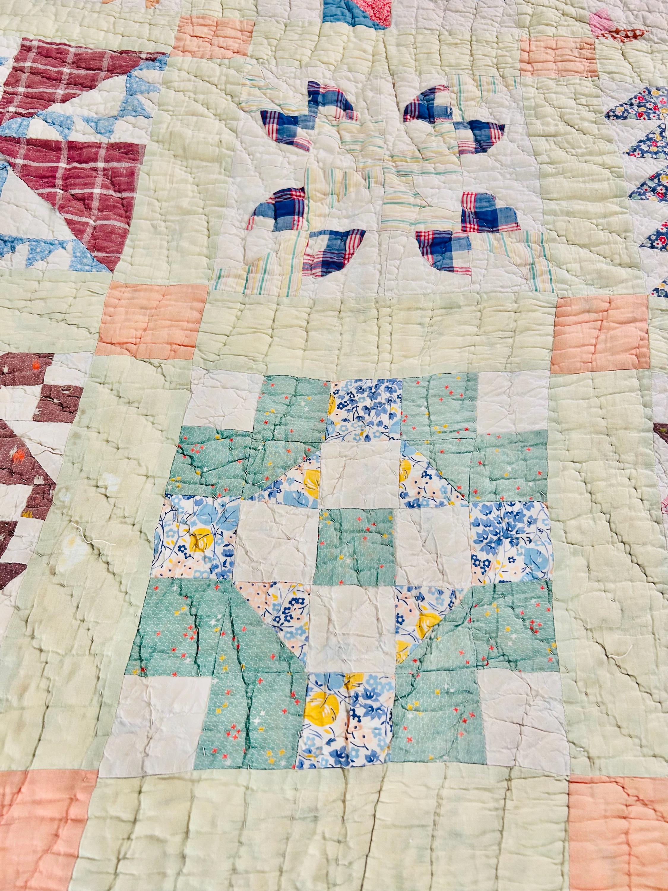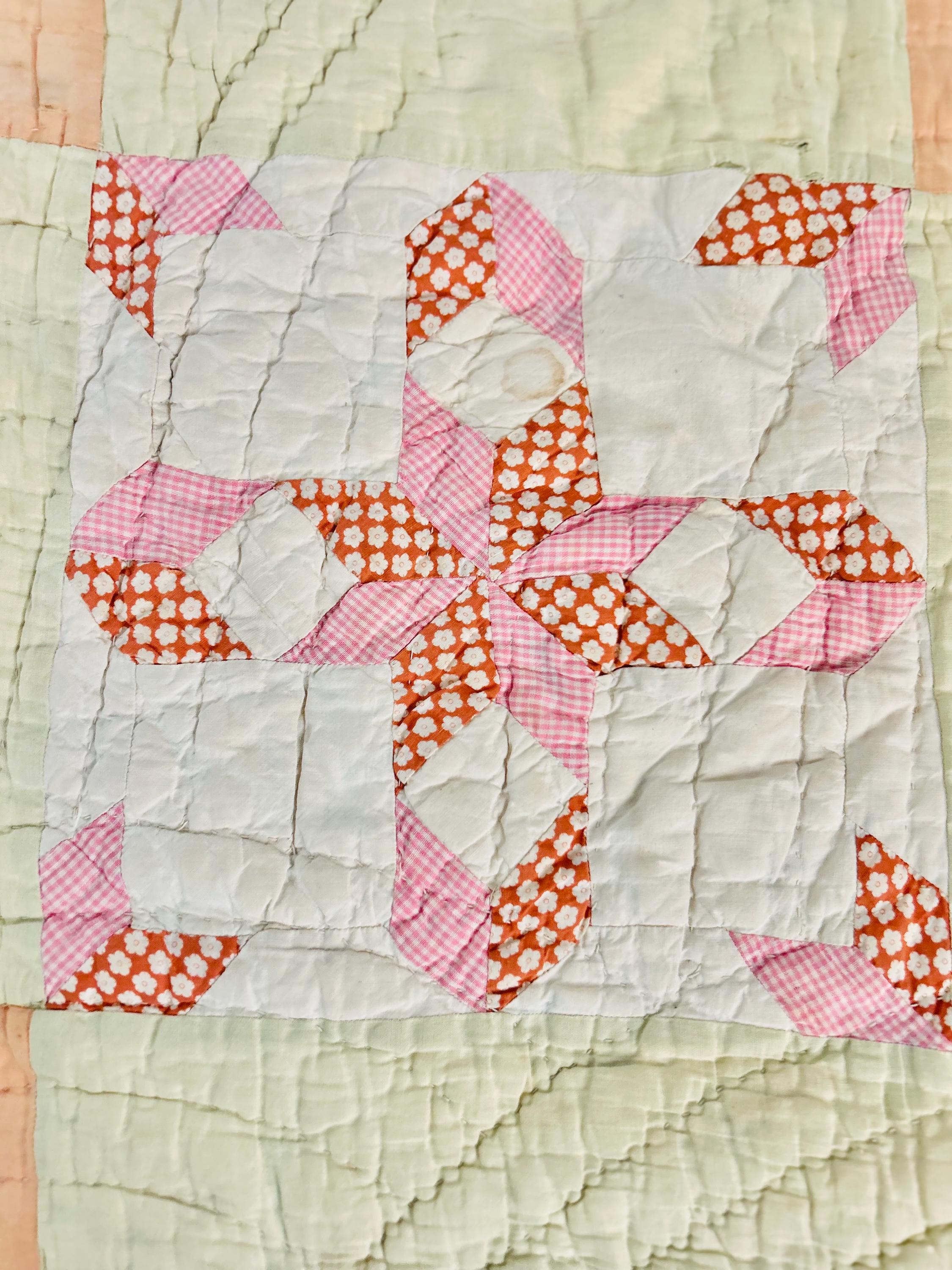 The quilt is in excellent antique condition with one dark spot the size of a nickel on one light green border.
