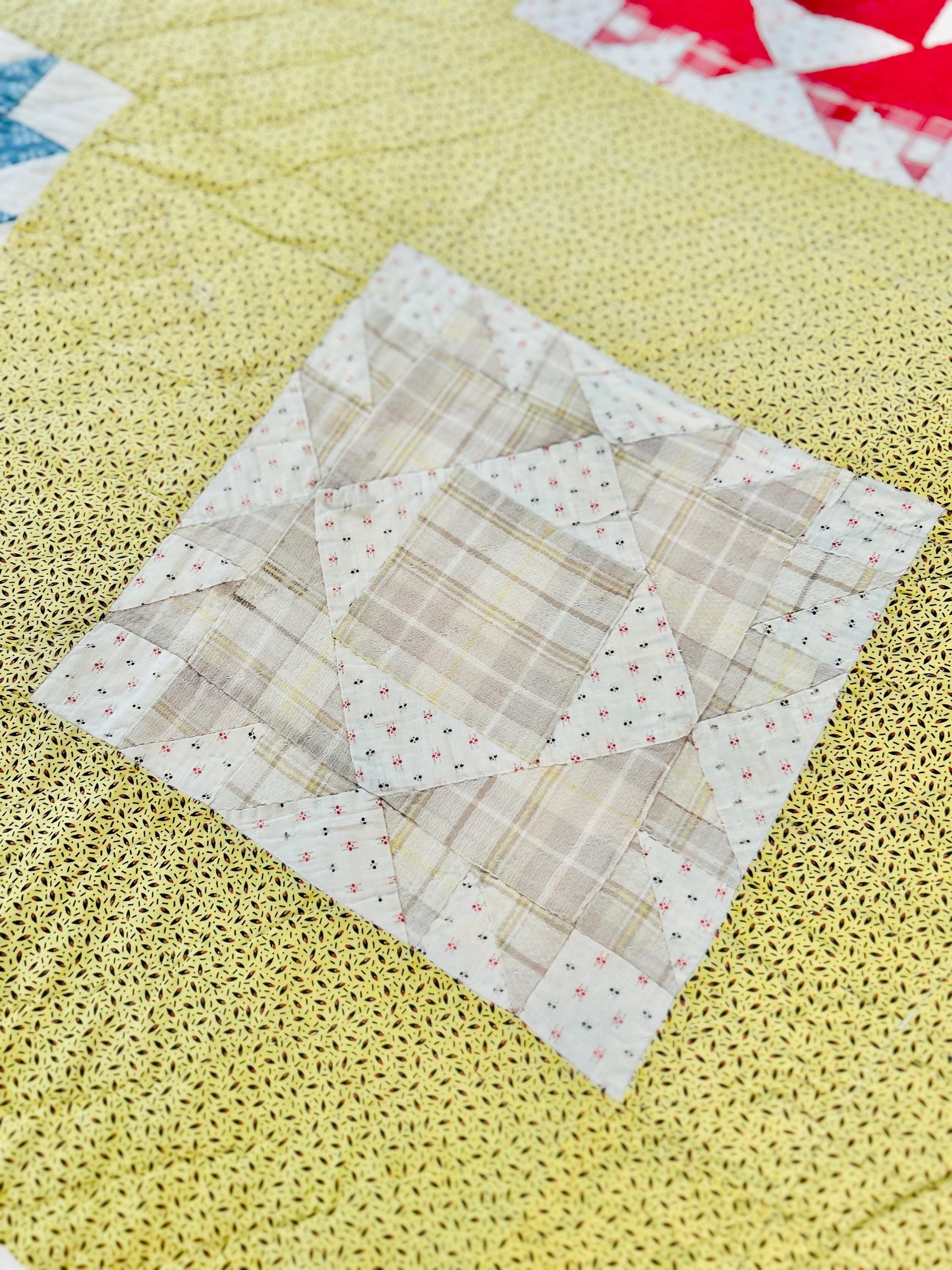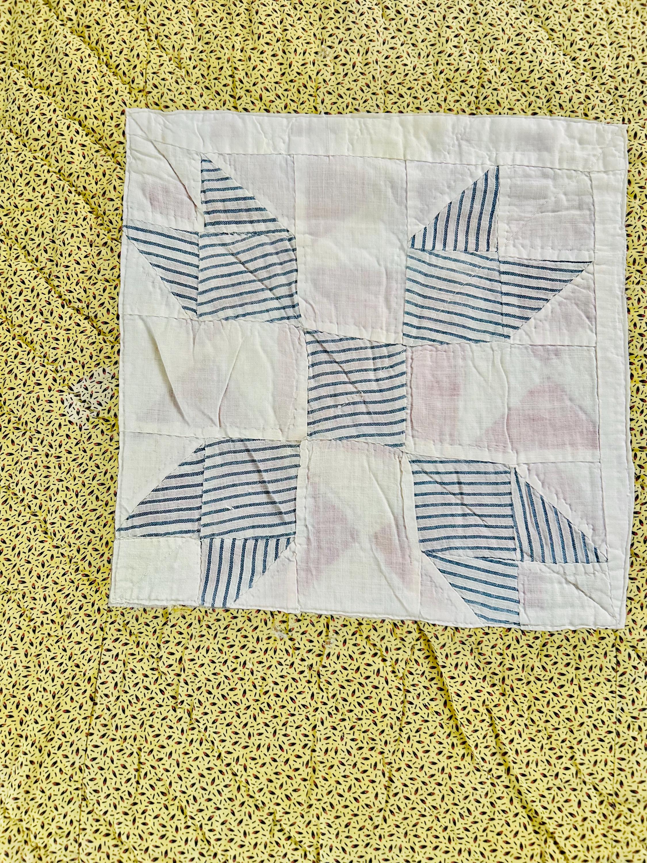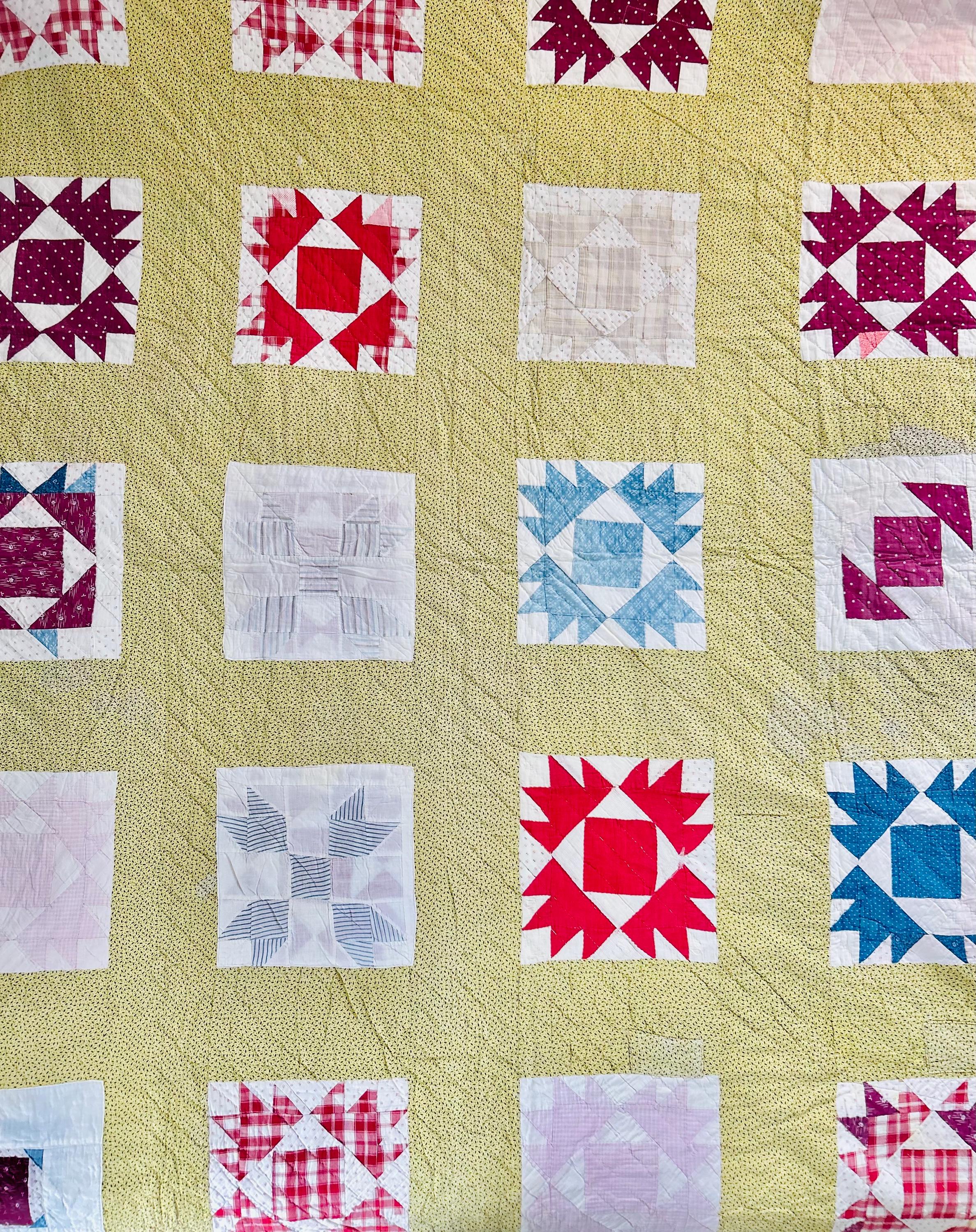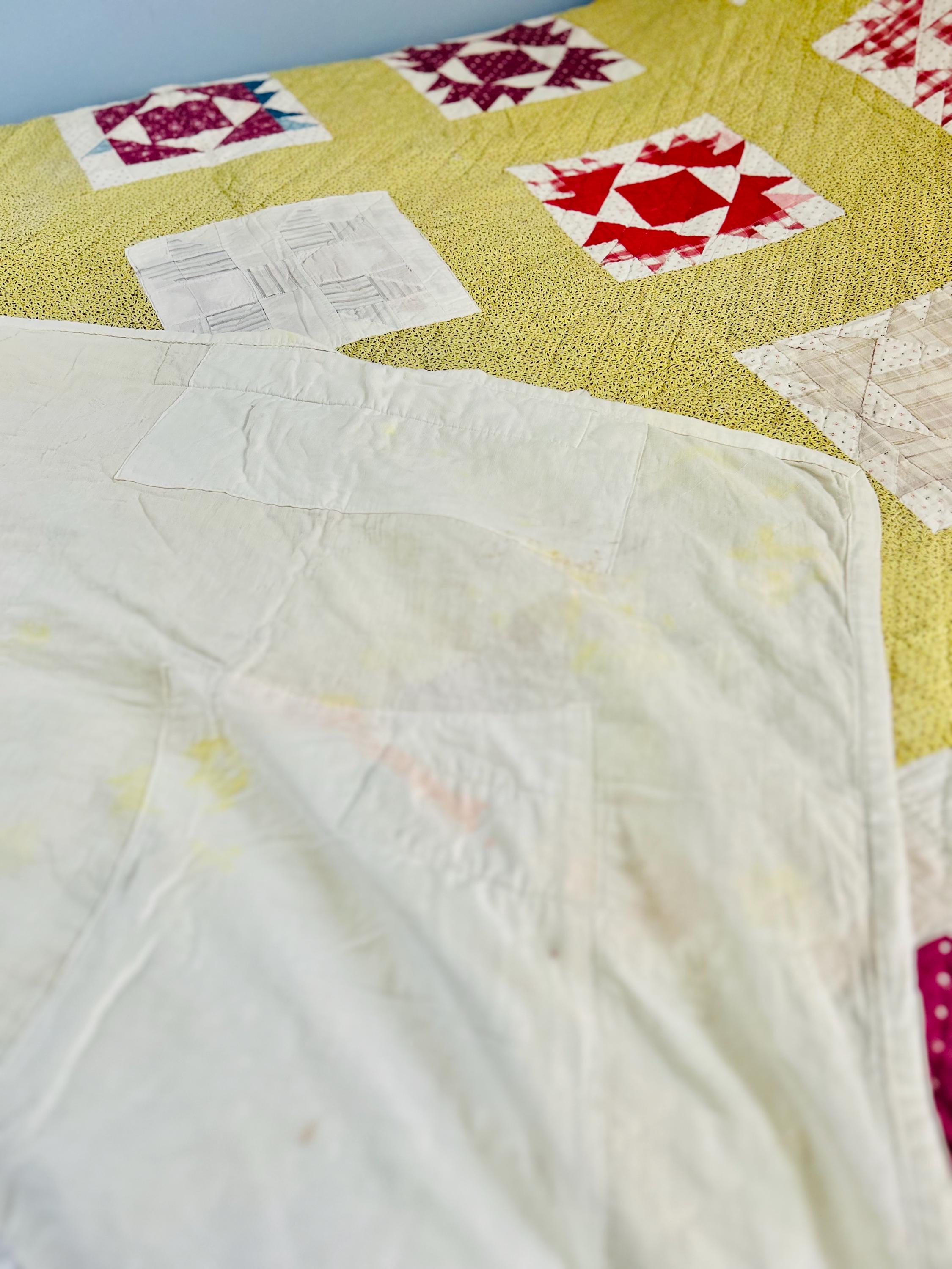 The back is off-white muslin that has multiple old repairs (see photos) and the binding, an off-white cotton, has been machine stitched to both sides and appears newer than the rest of the quilt. The cotton batting is lightweight.