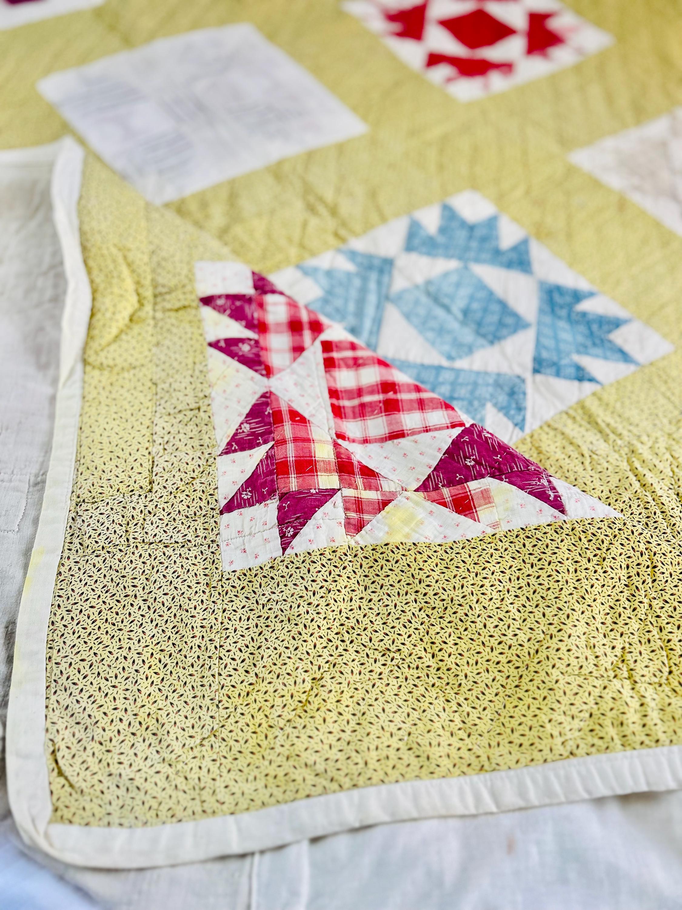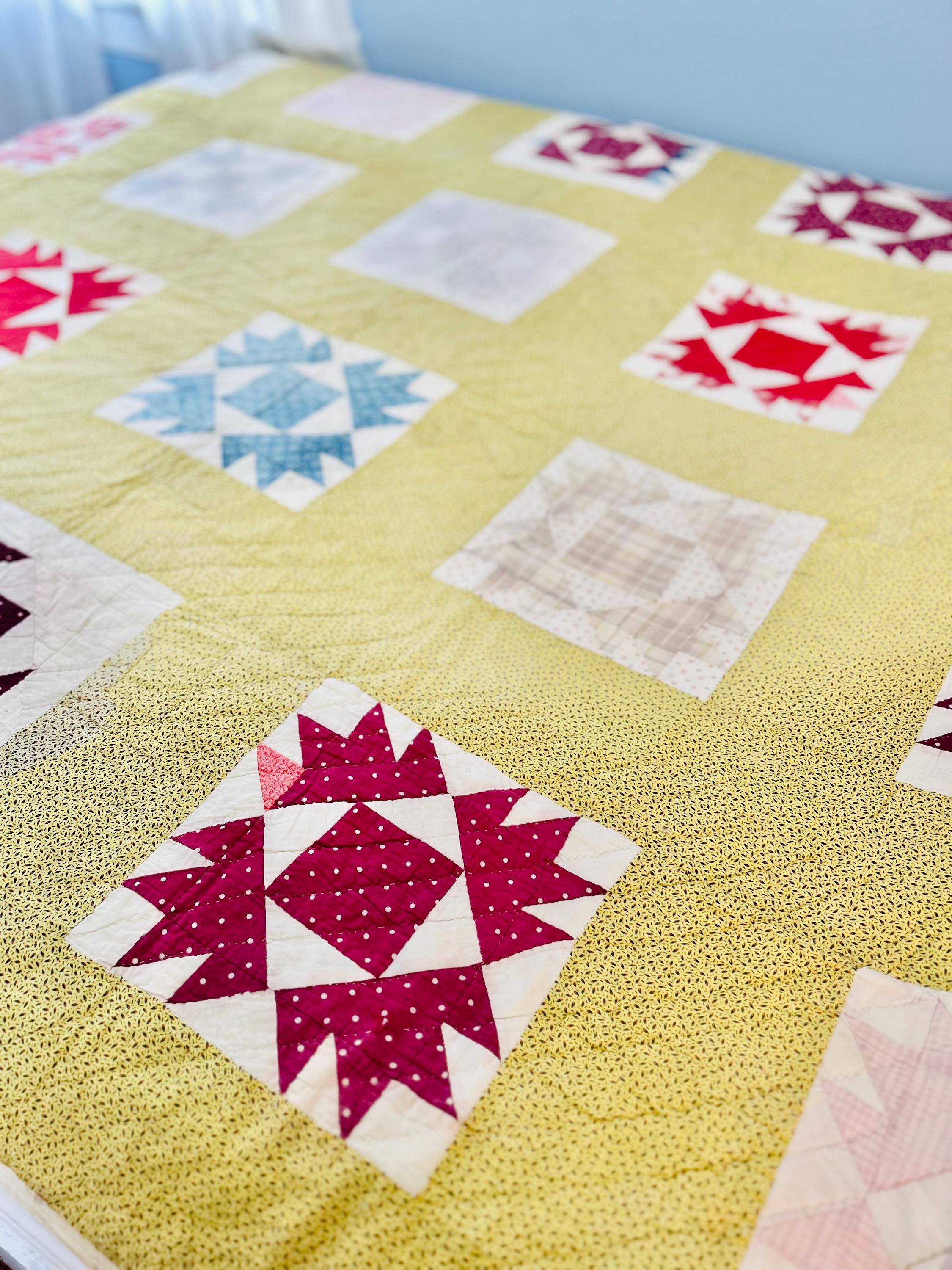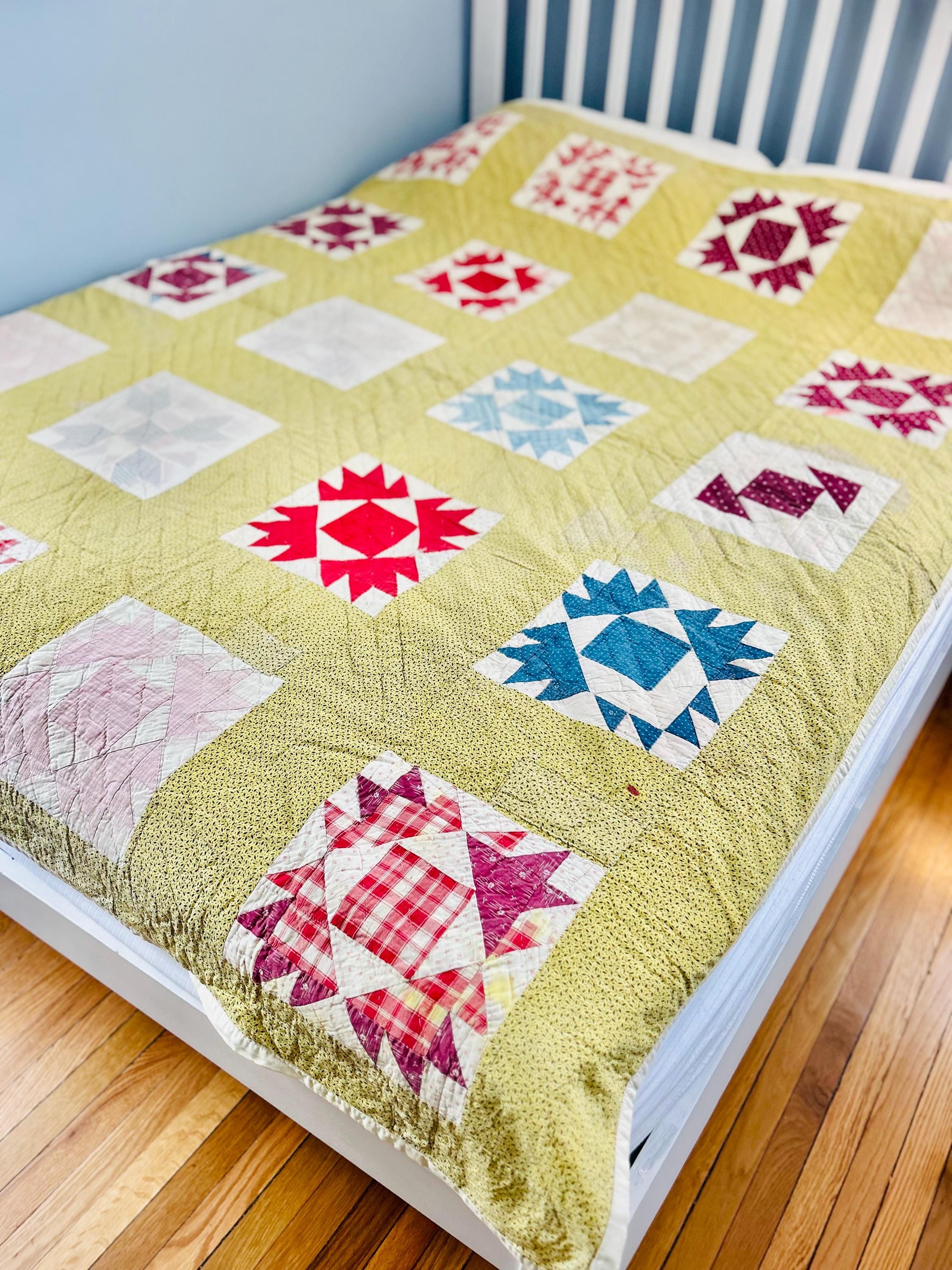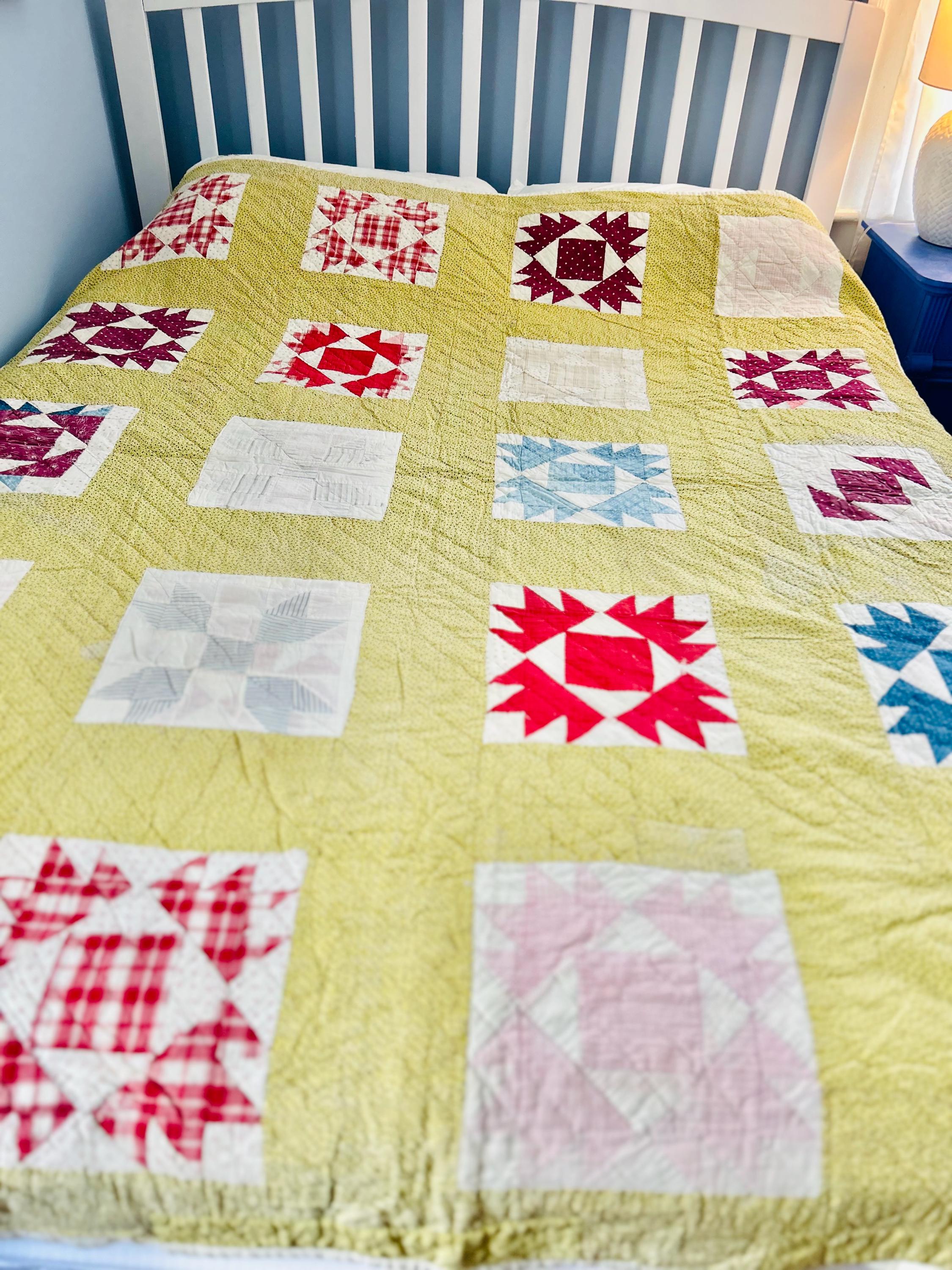 The quilt has been soaked, hand-washed and line-dried and measures 63 inches by 80 inches. It comes from a smoke-free and pet-free home. Shown on a queen-size bed.