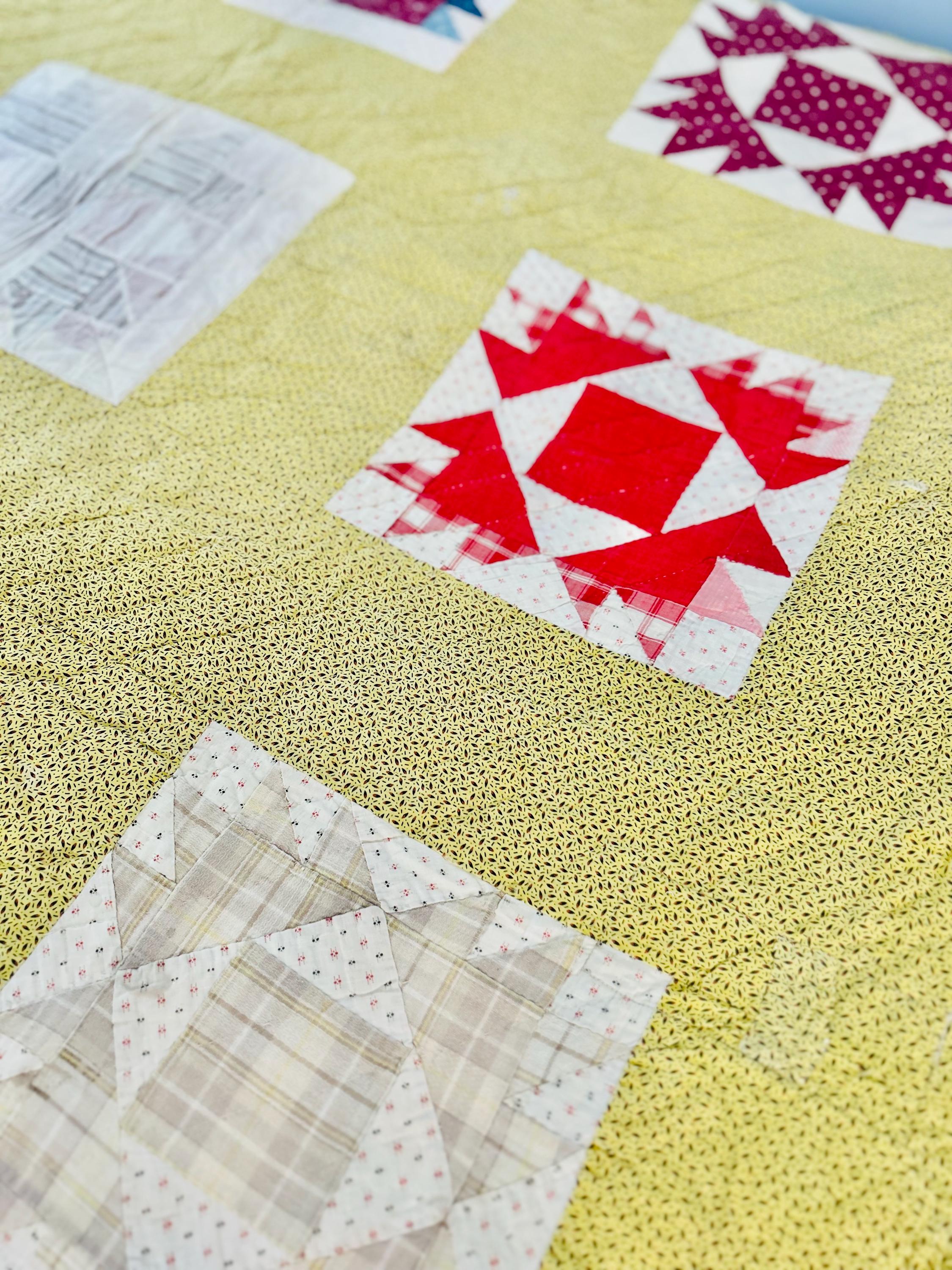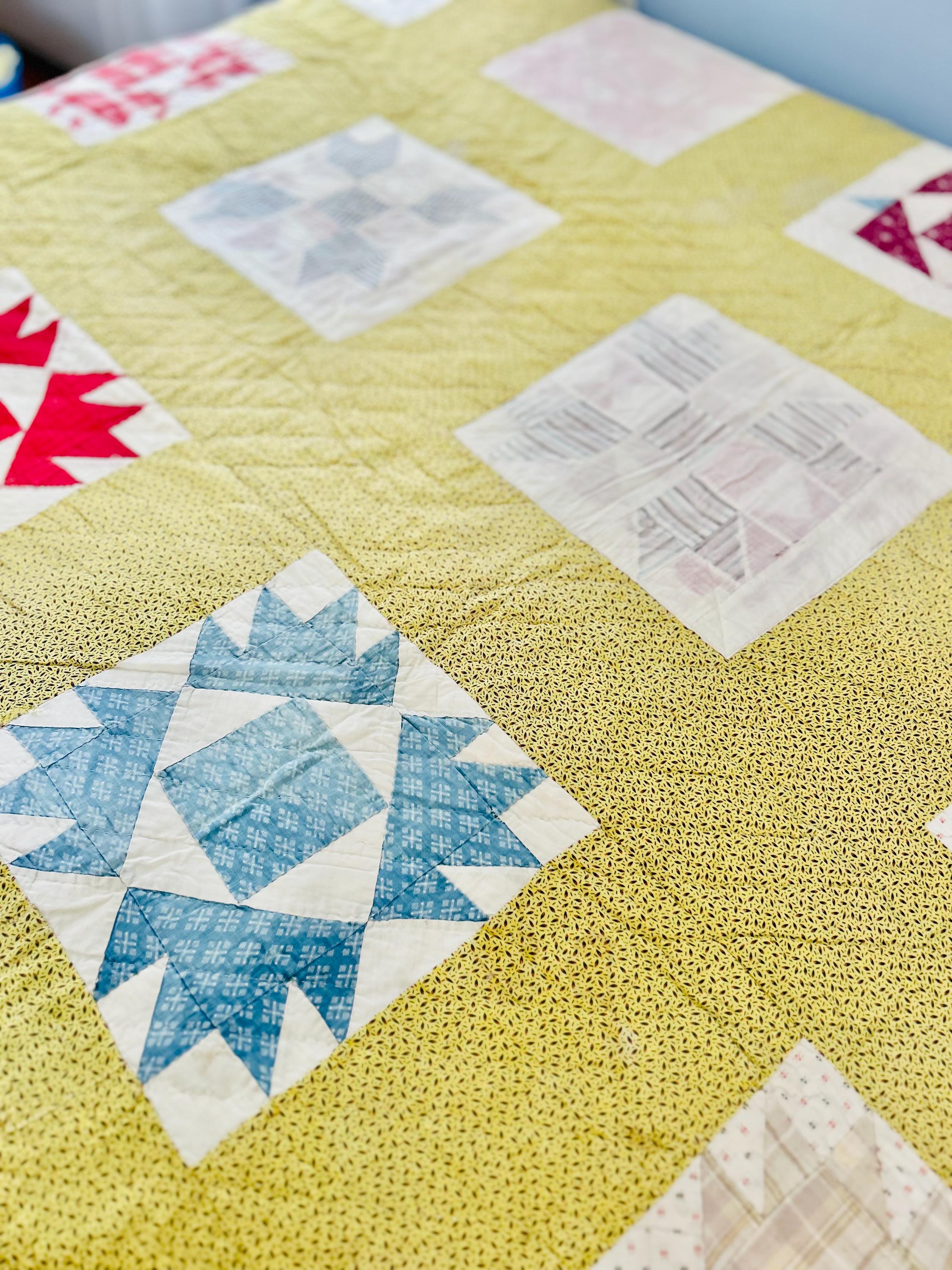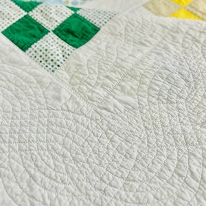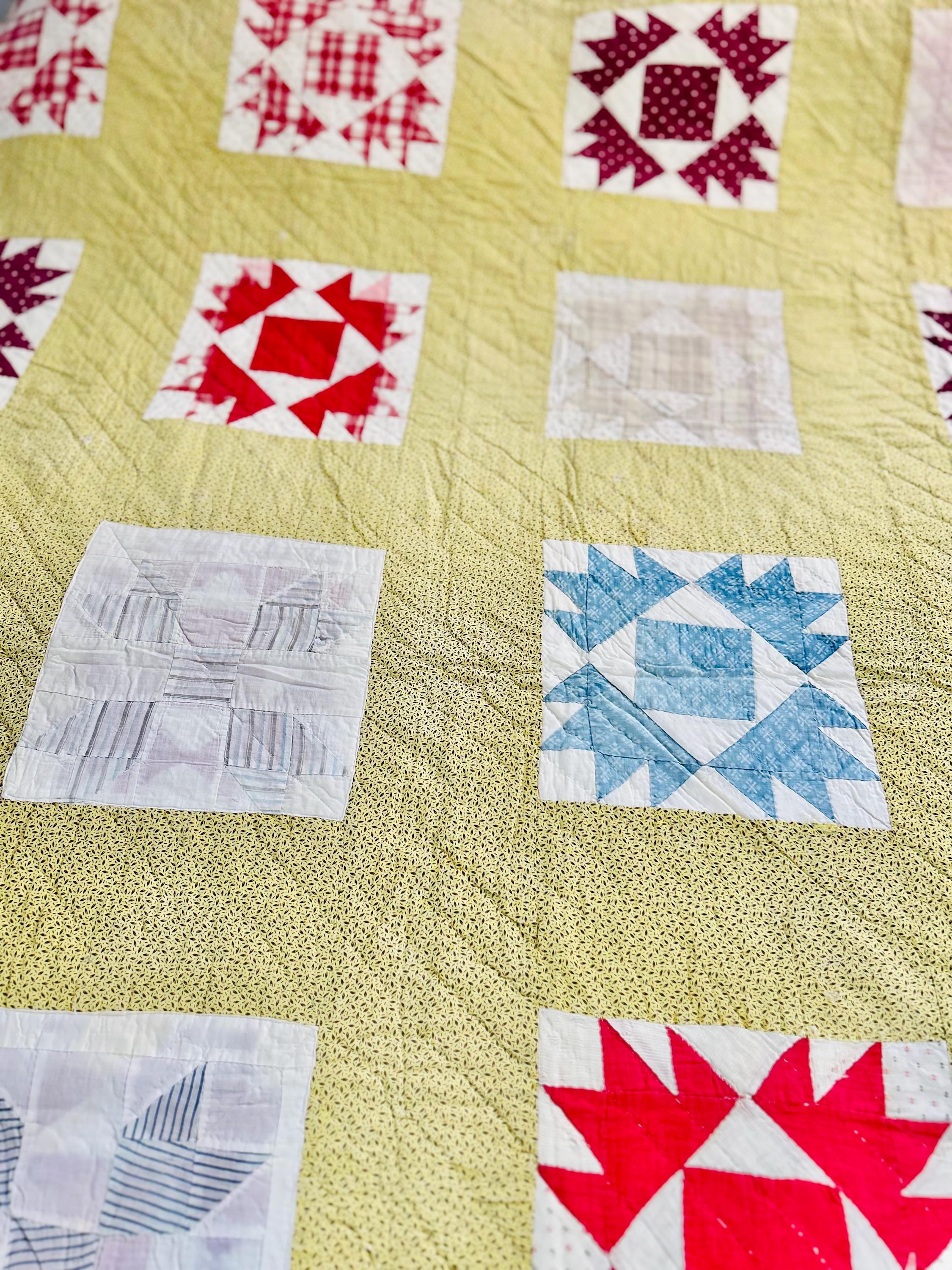 The quilt has been soaked, hand-washed and line-dried and measures 63 inches by 80 inches. It comes from a smoke-free and pet-free home. Shown on a queen-size bed.
