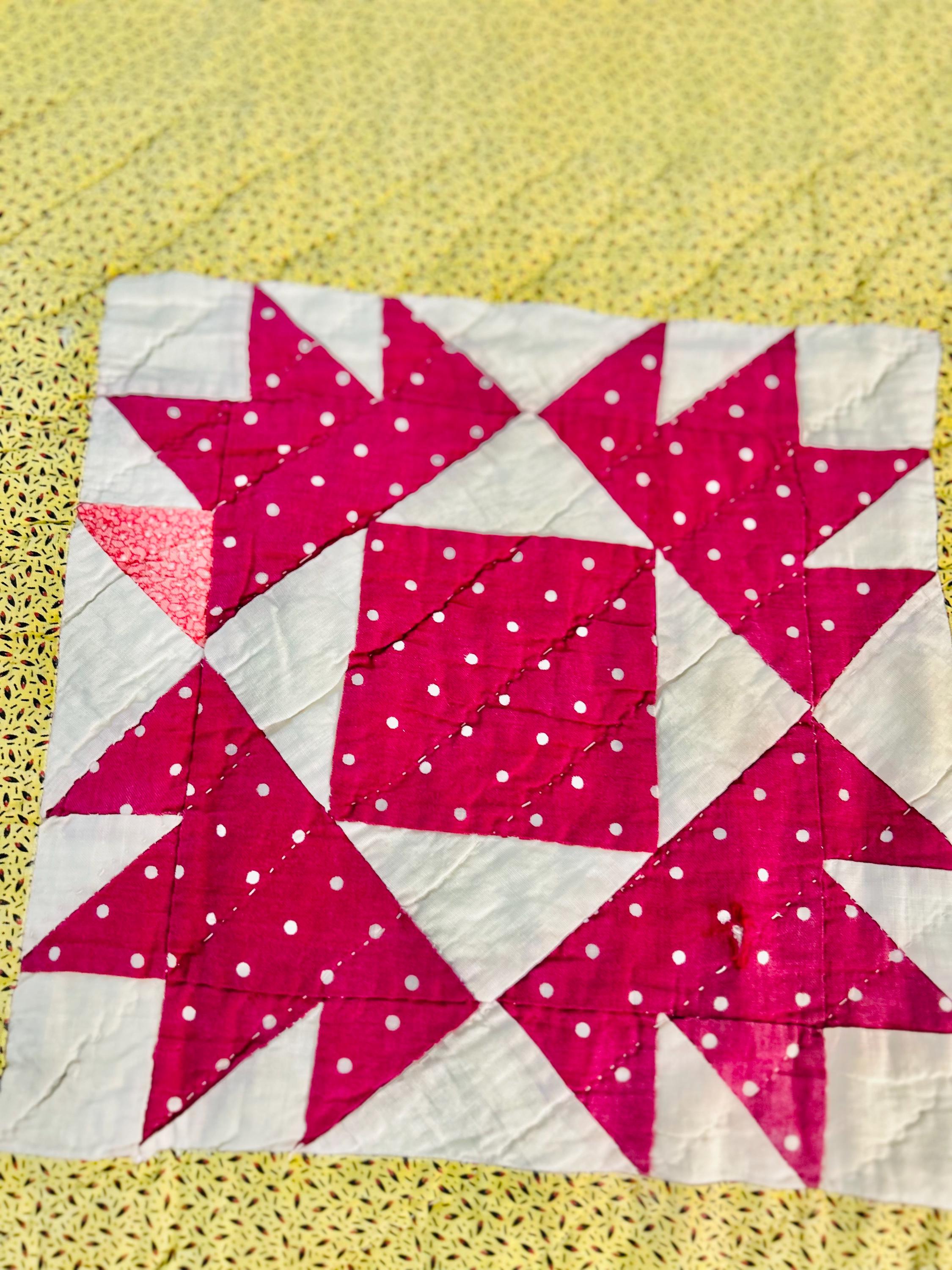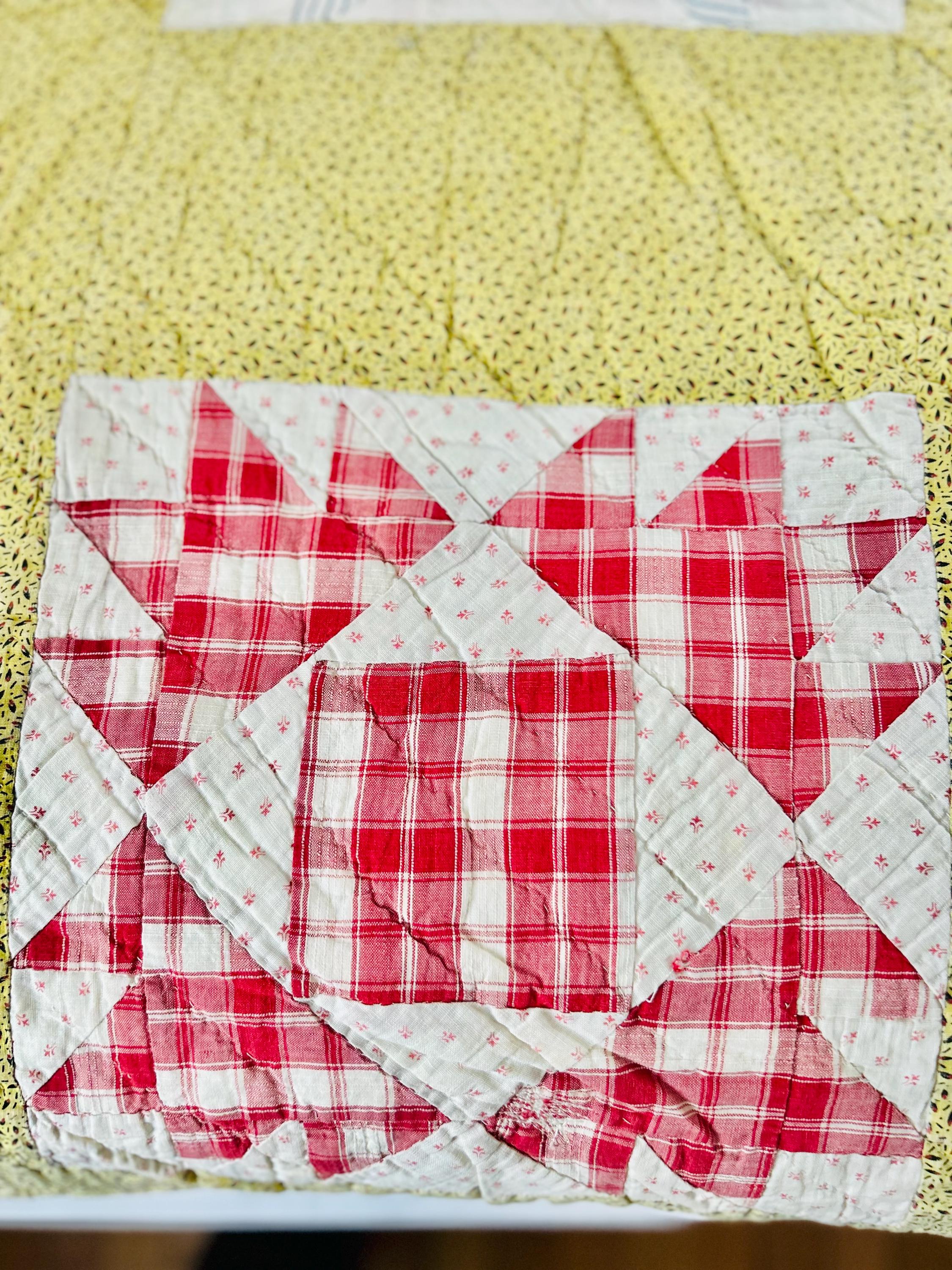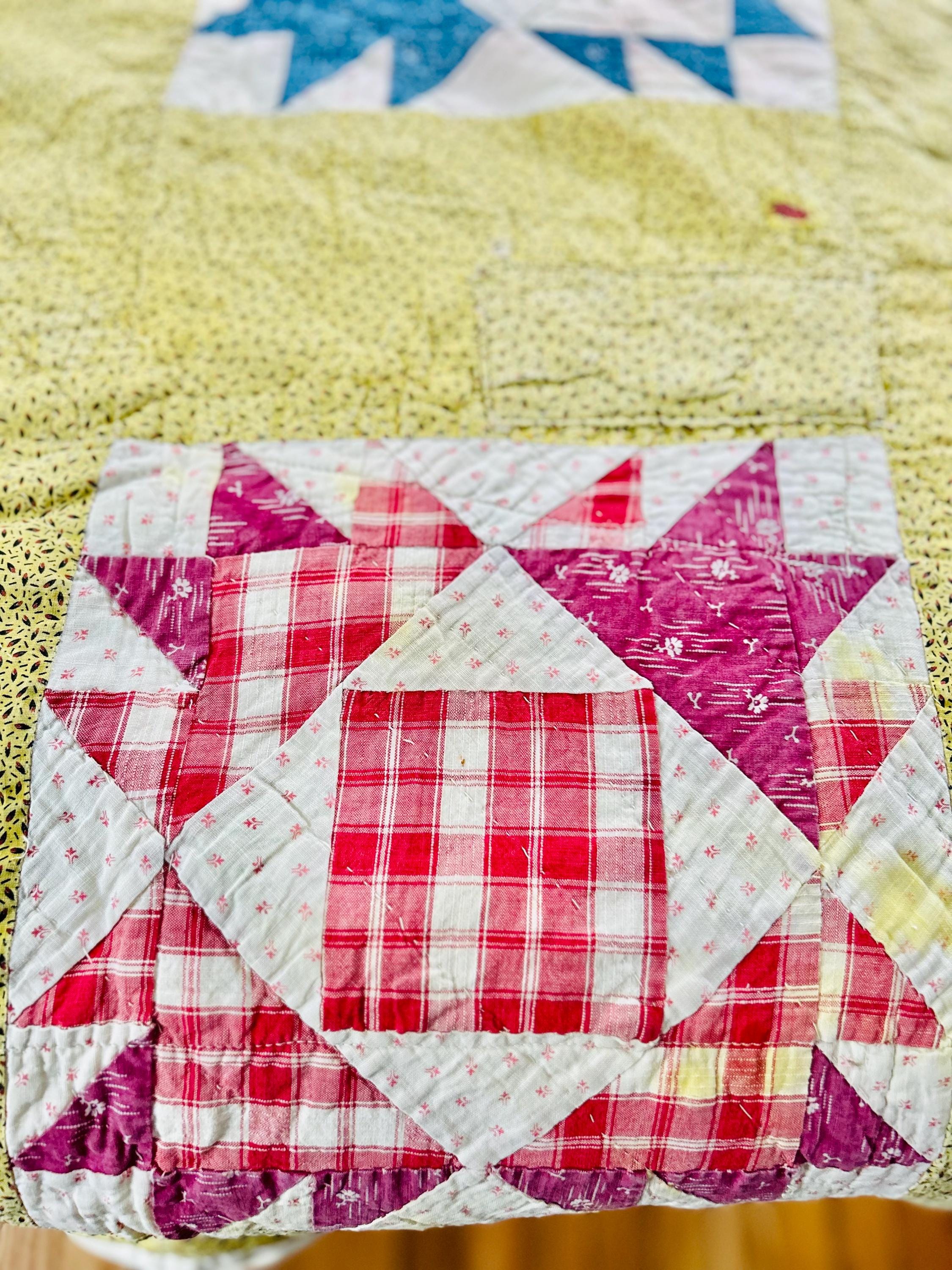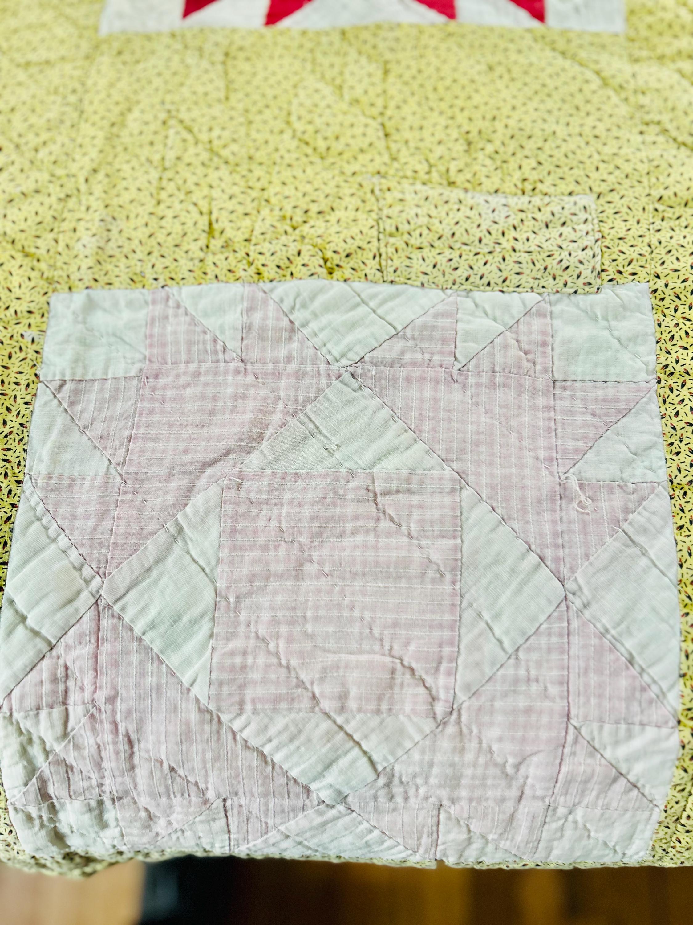 The quilt is in excellent antique condition with one tiny (1/8 inch) dark mark on the sashing, the repairs as mentioned above and minor yellow color transfer on the back (see photos).