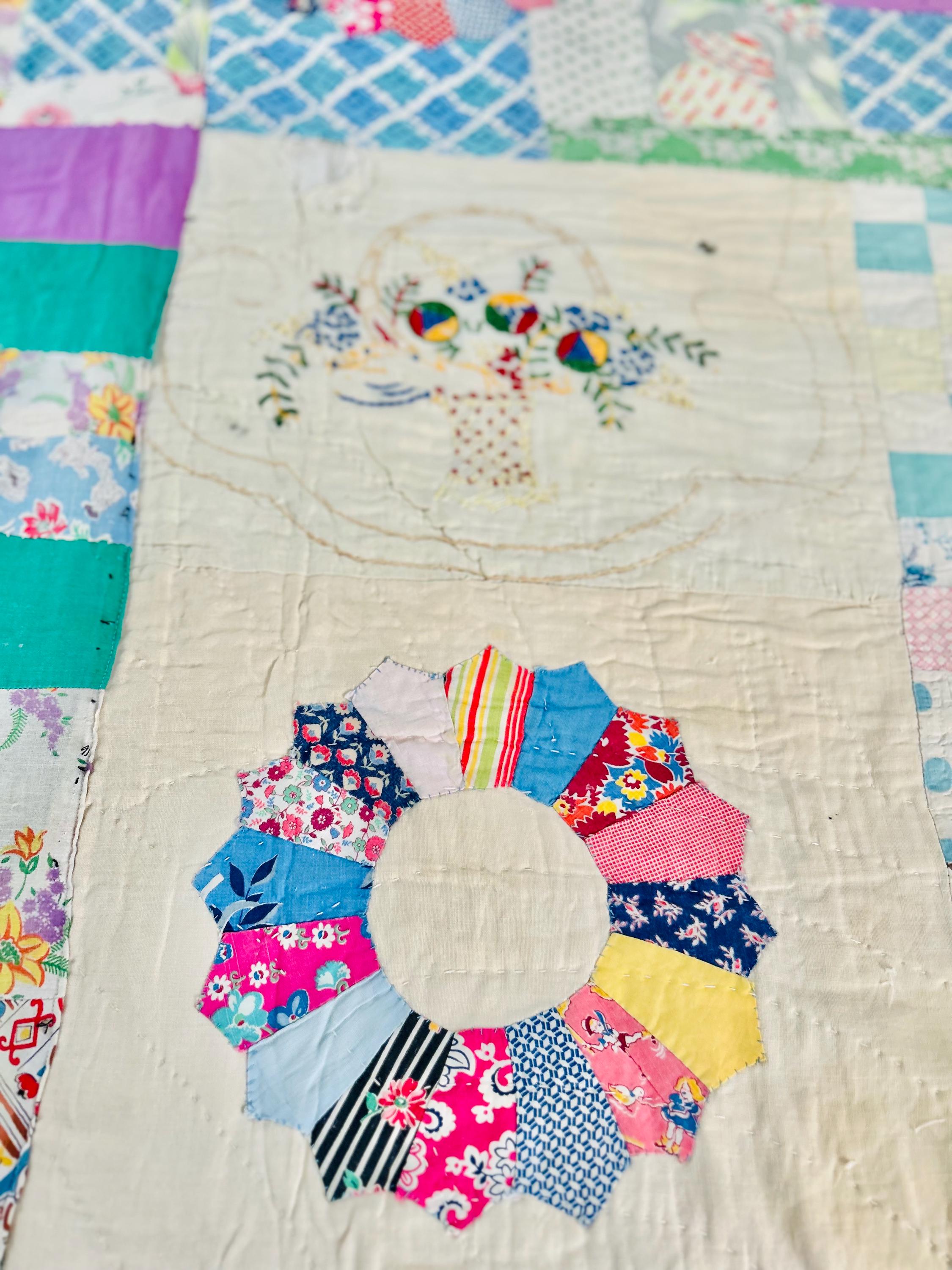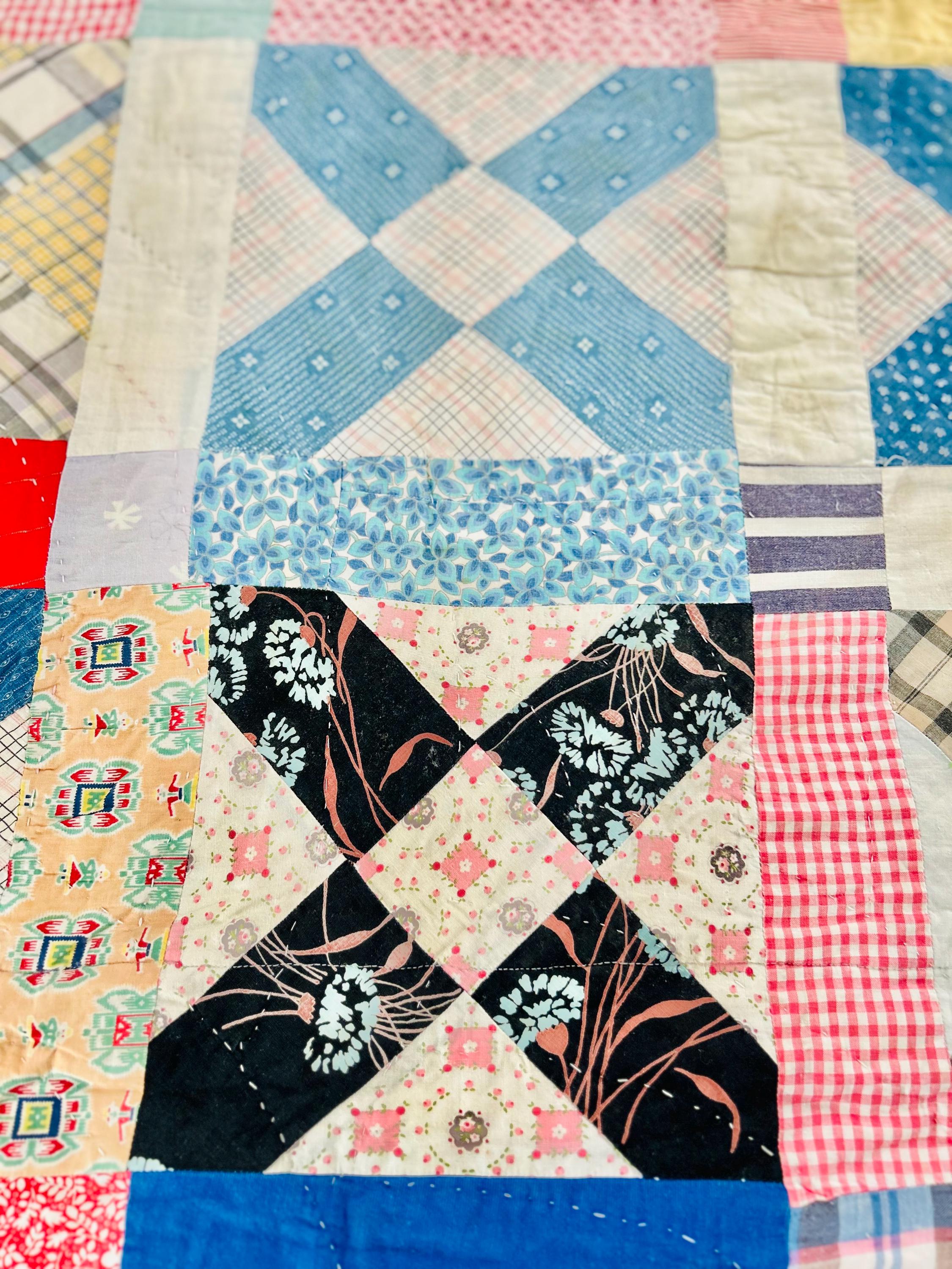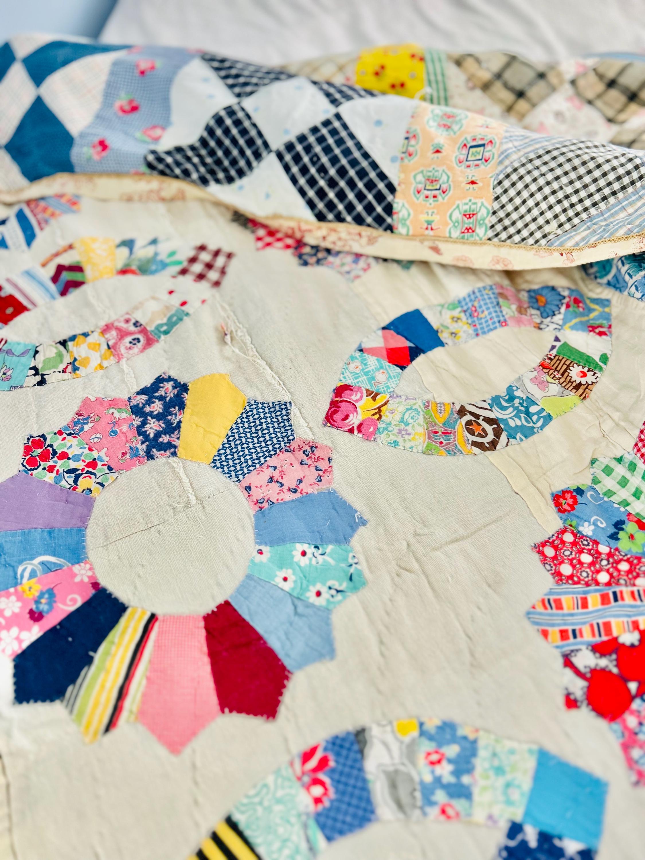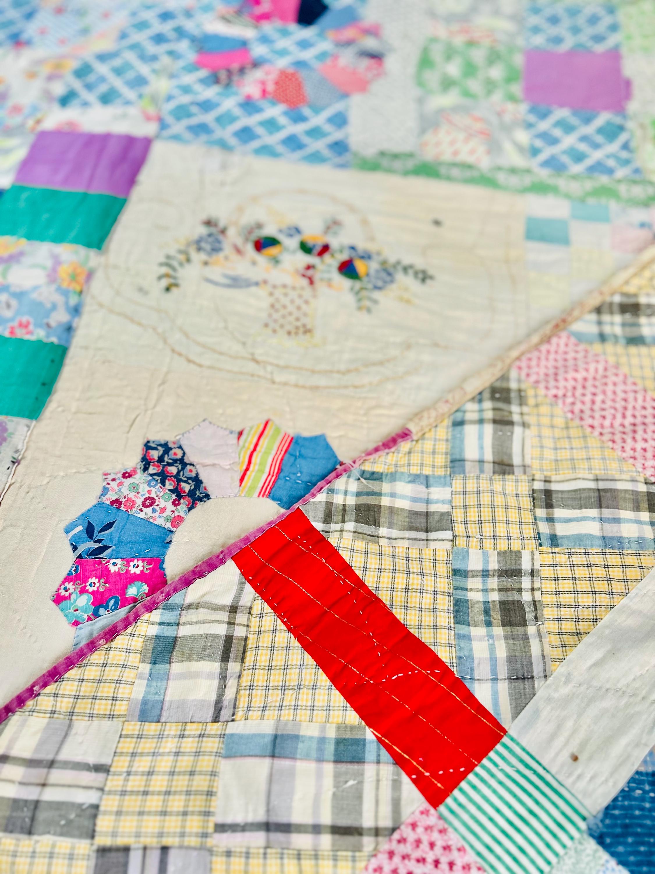 This early 20th Century Double-Sided Quilt is one-of-a-kind. One side is a patchwork Crow's Foot pattern while the other is a compilation of random blocks of Dresden Plate, Double-Wedding-Ring and even an embroidered basket of flowers along with a half-dozen big and small patches of historic fabrics in a Crazy-Quilt-type pattern.