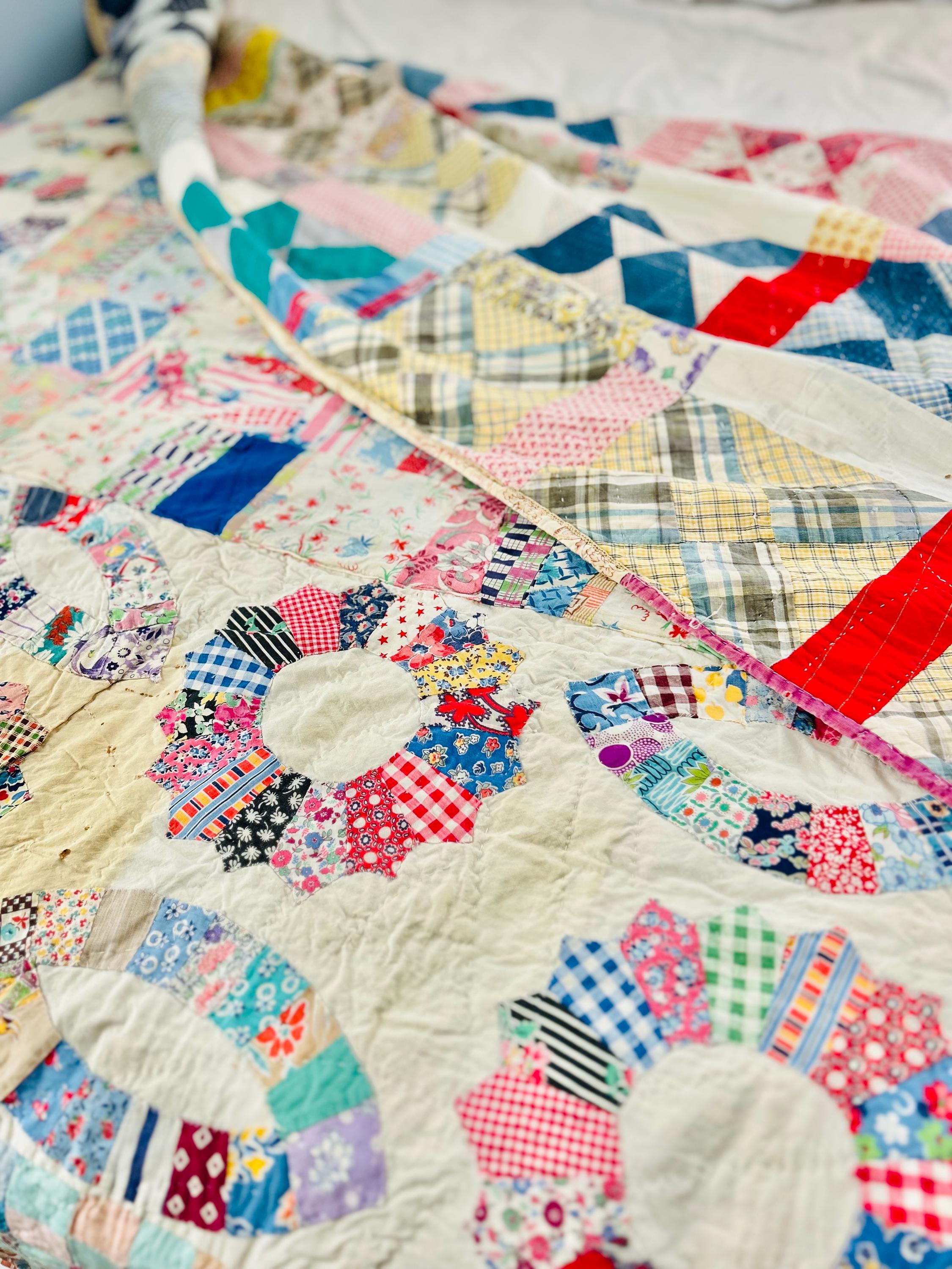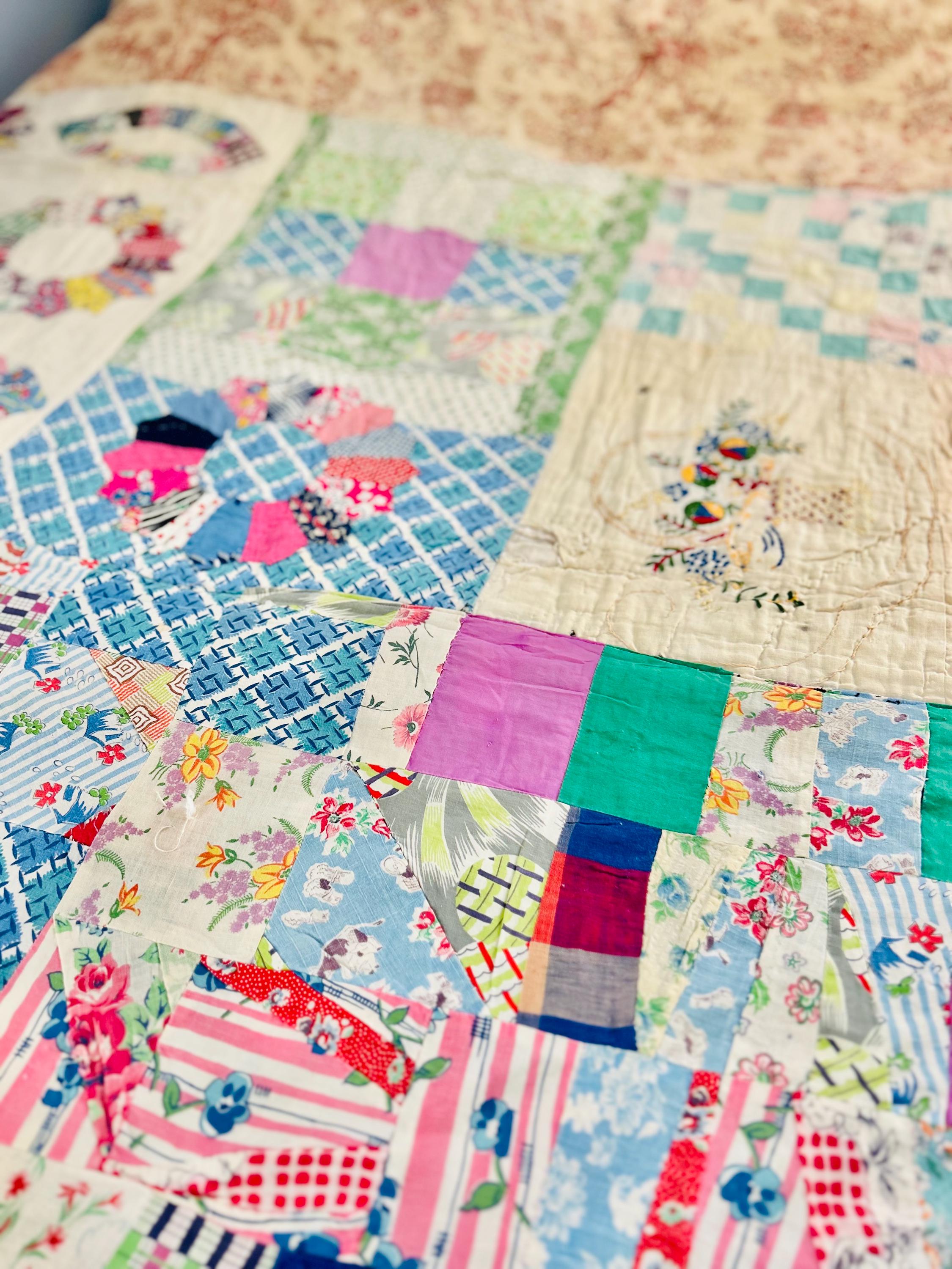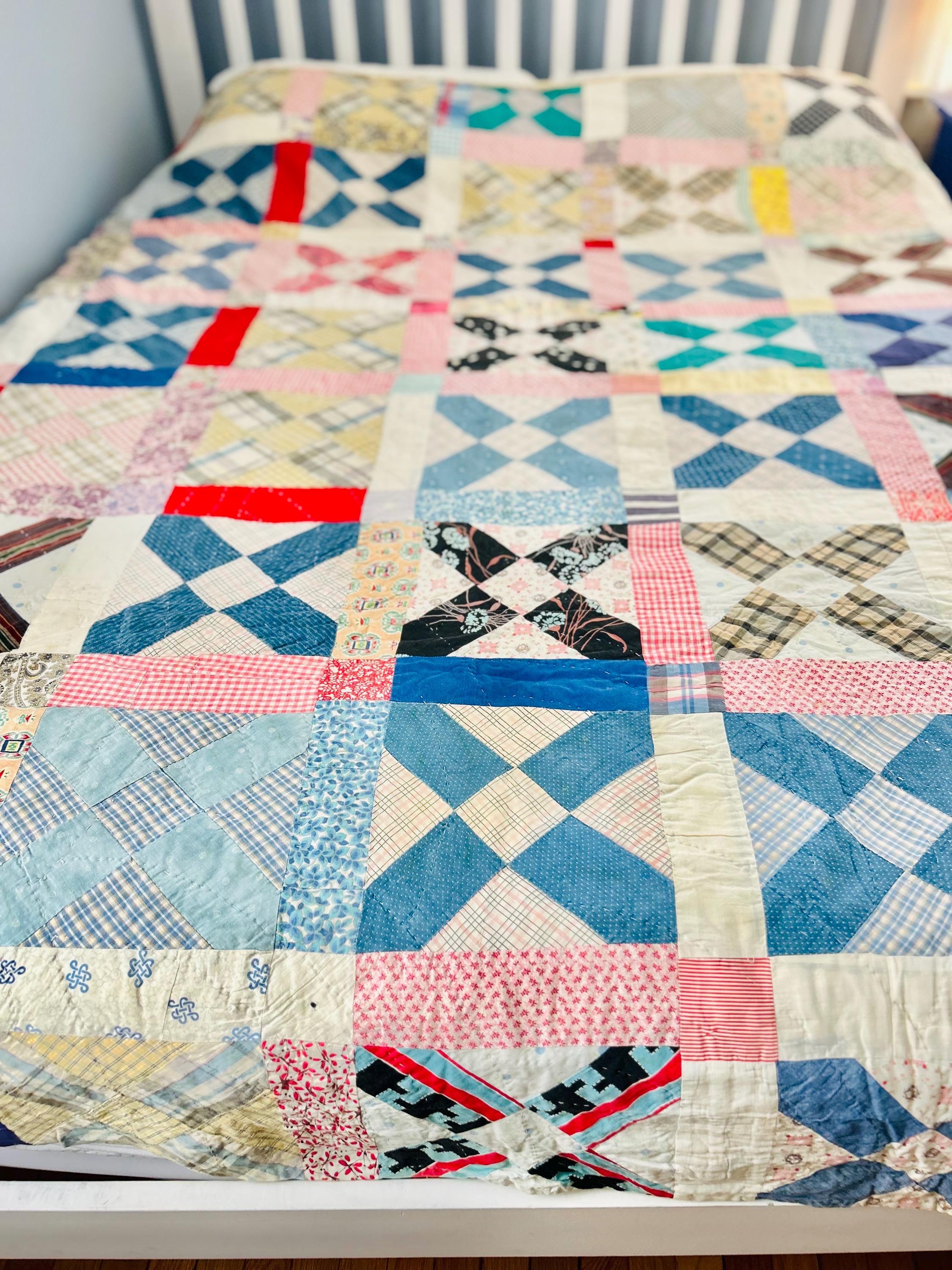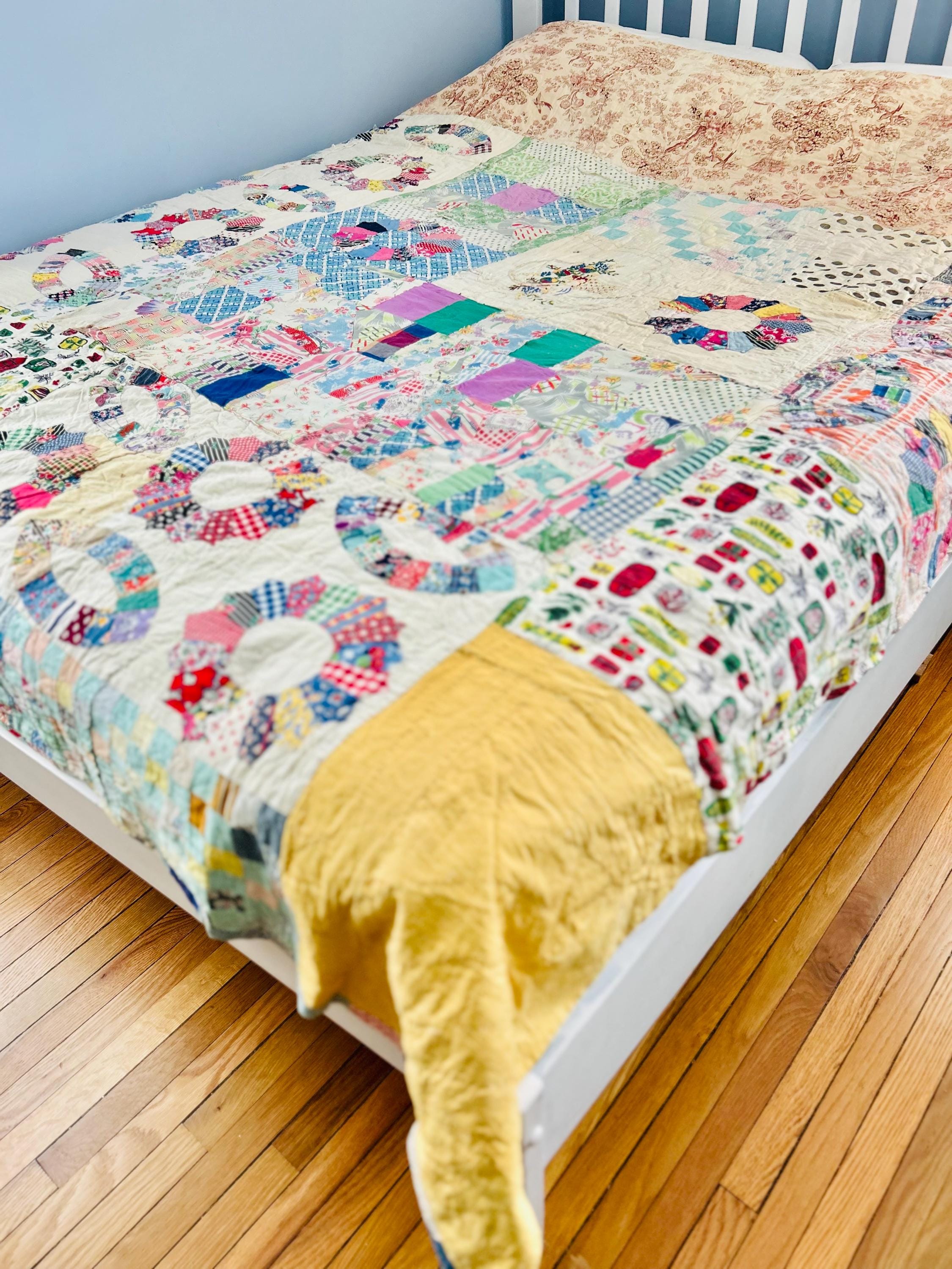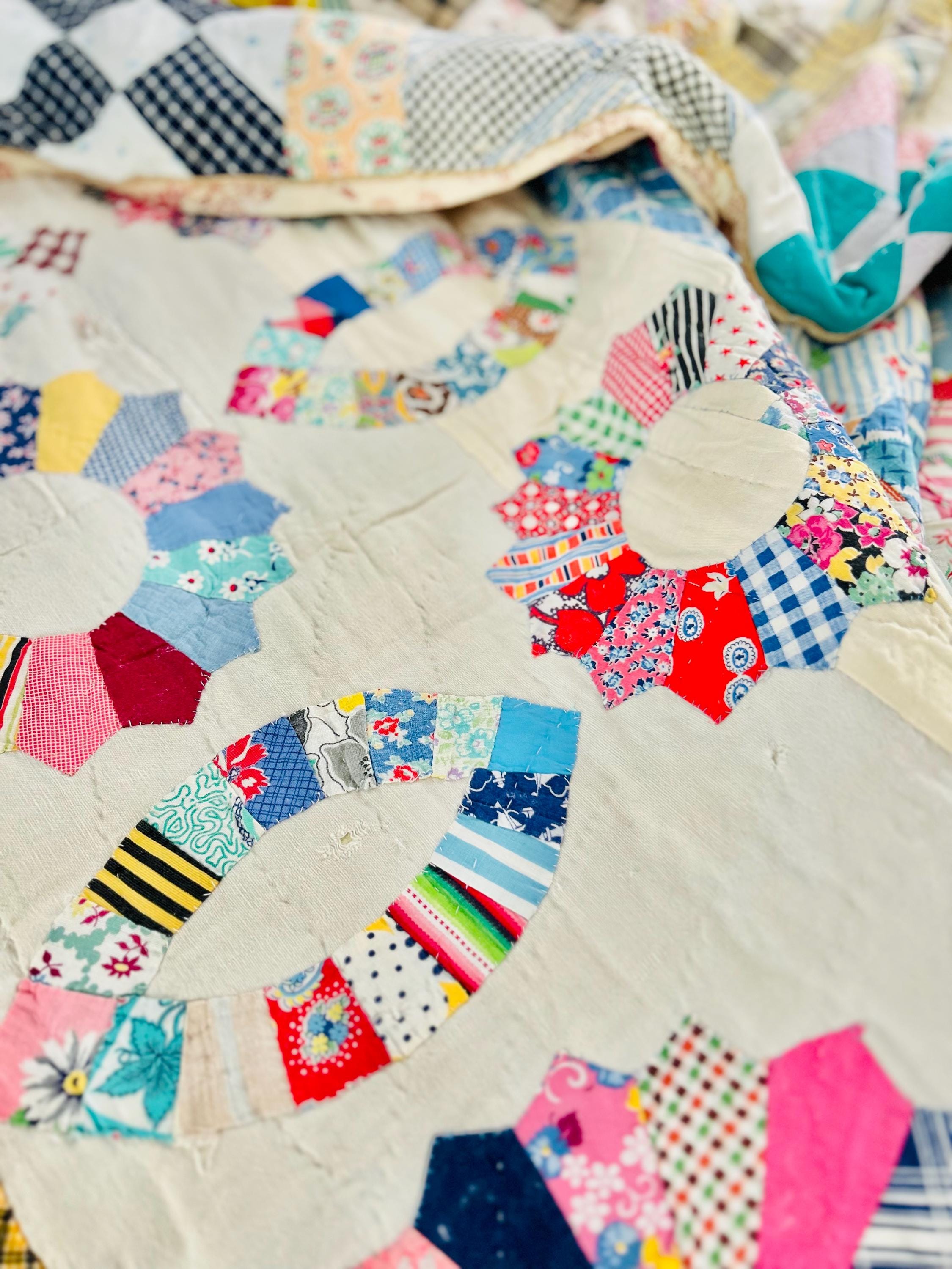 This early 20th Century Double-Sided Quilt is one-of-a-kind. One side is a patchwork Crow's Foot pattern while the other is a compilation of random blocks of Dresden Plate, Double-Wedding-Ring and even an embroidered basket of flowers along with a half-dozen big and small patches of historic fabrics in a Crazy-Quilt-type pattern.
