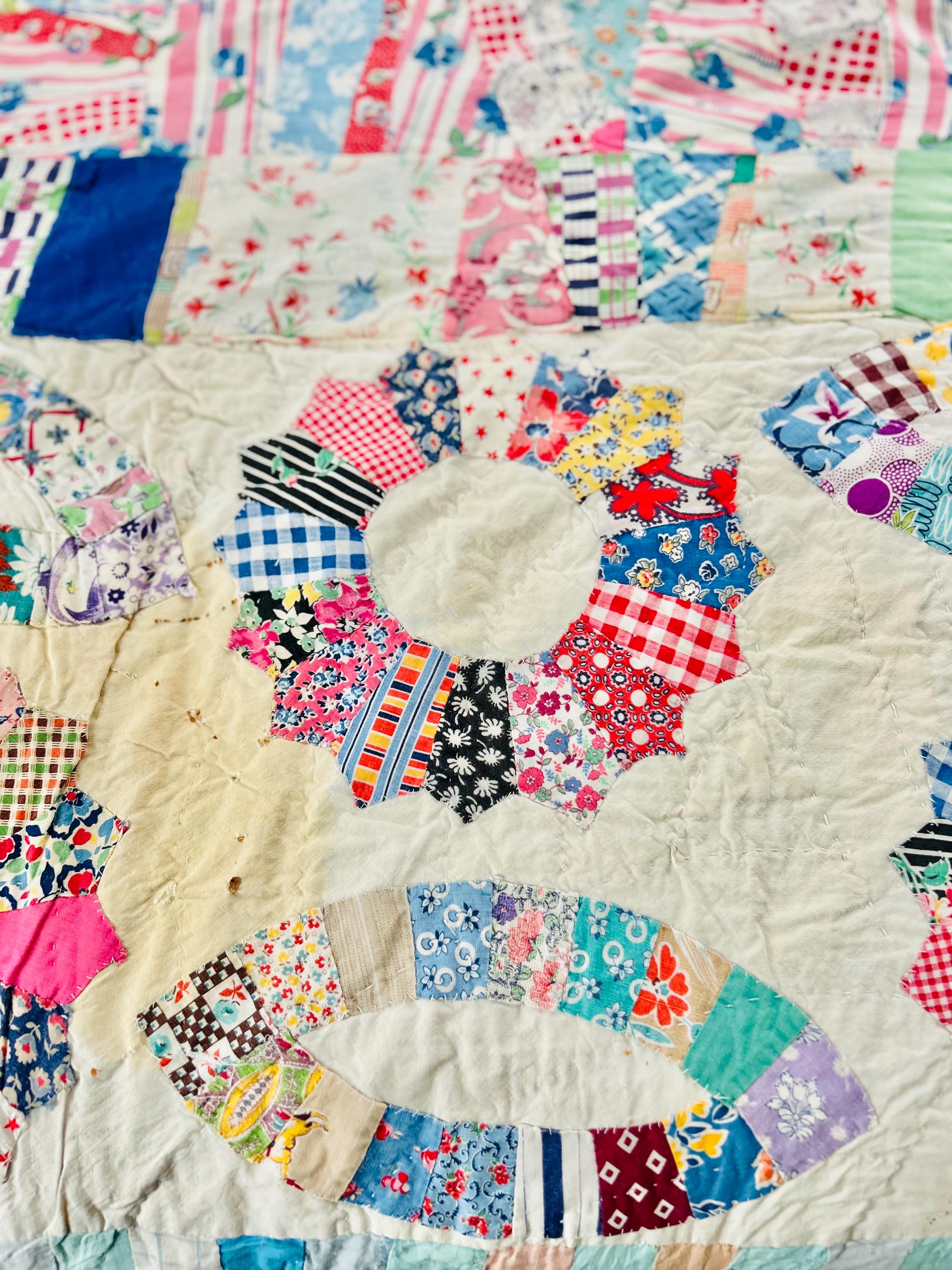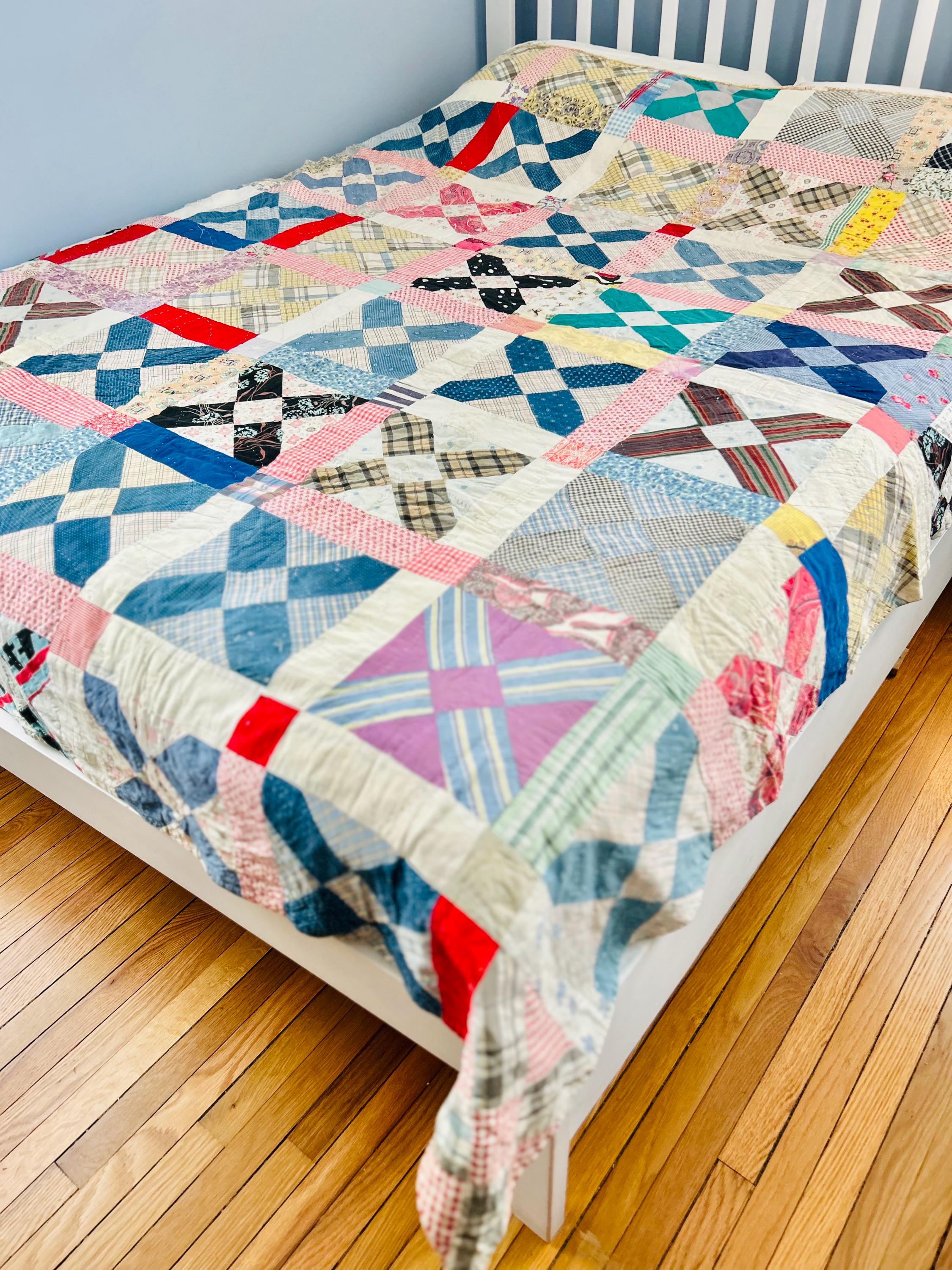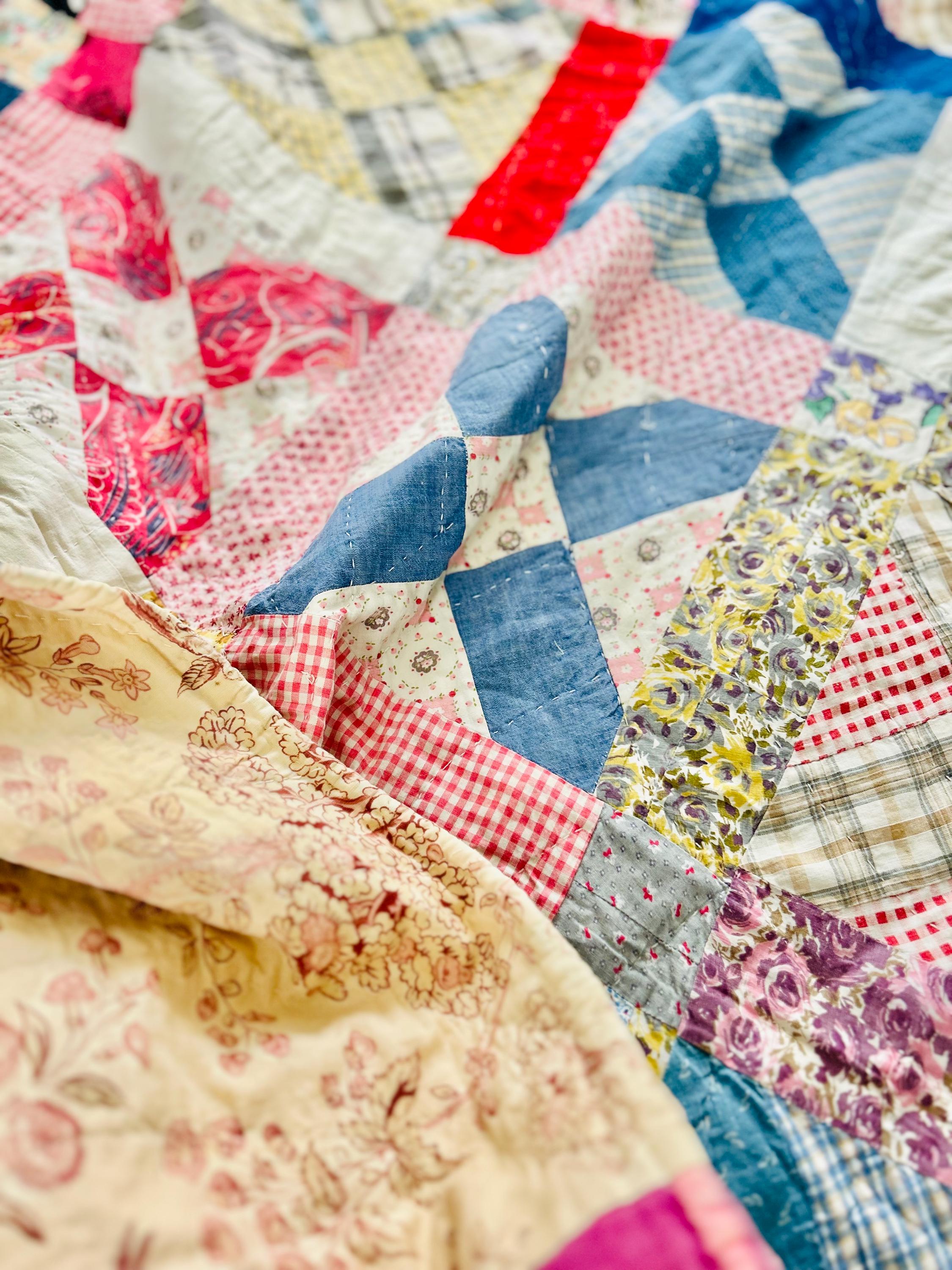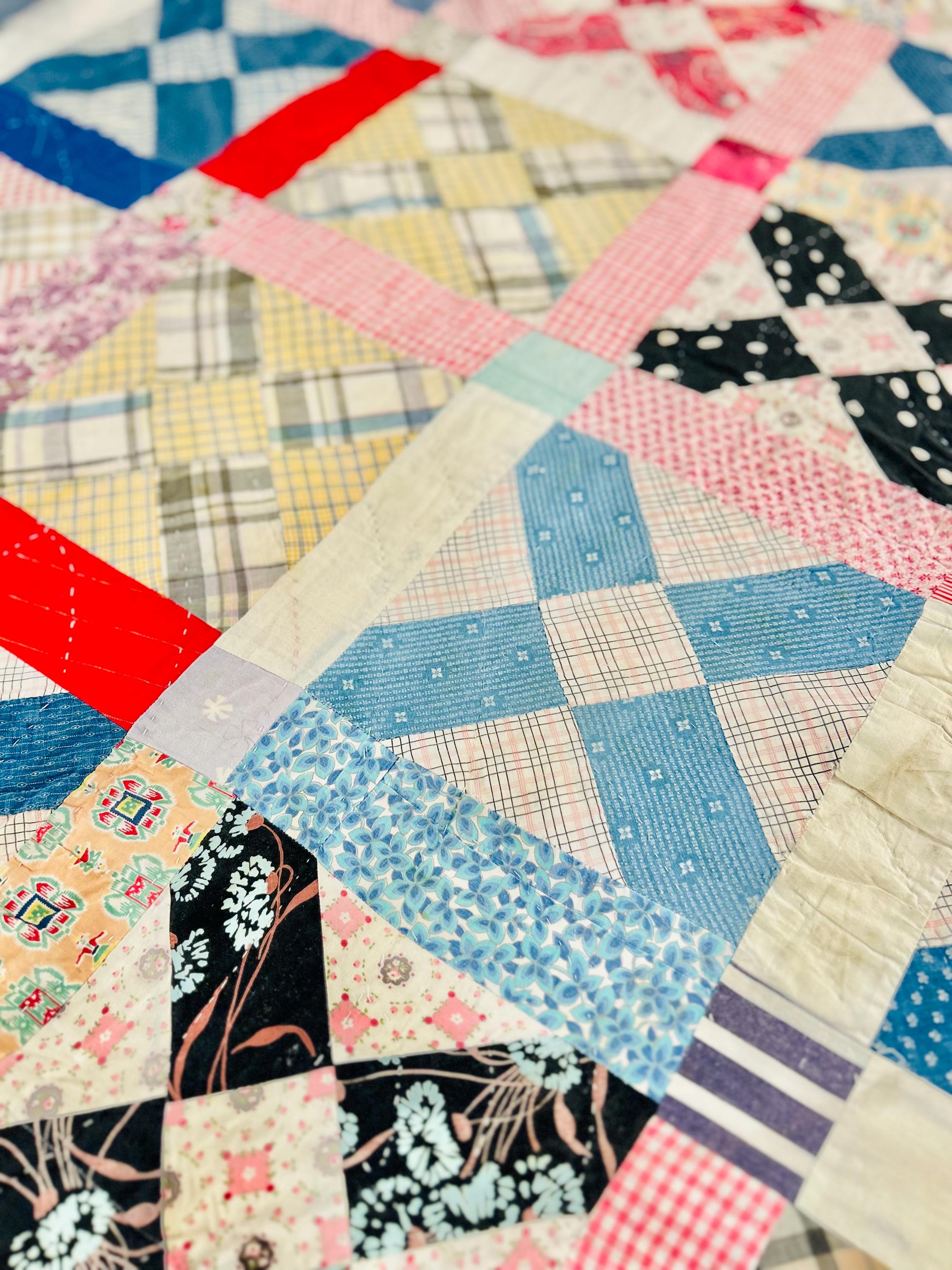 This early 20th Century Double-Sided Quilt is one-of-a-kind. One side is a patchwork Crow's Foot pattern while the other is a compilation of random blocks of Dresden Plate, Double-Wedding-Ring and even an embroidered basket of flowers along with a half-dozen big and small patches of historic fabrics in a Crazy-Quilt-type pattern.