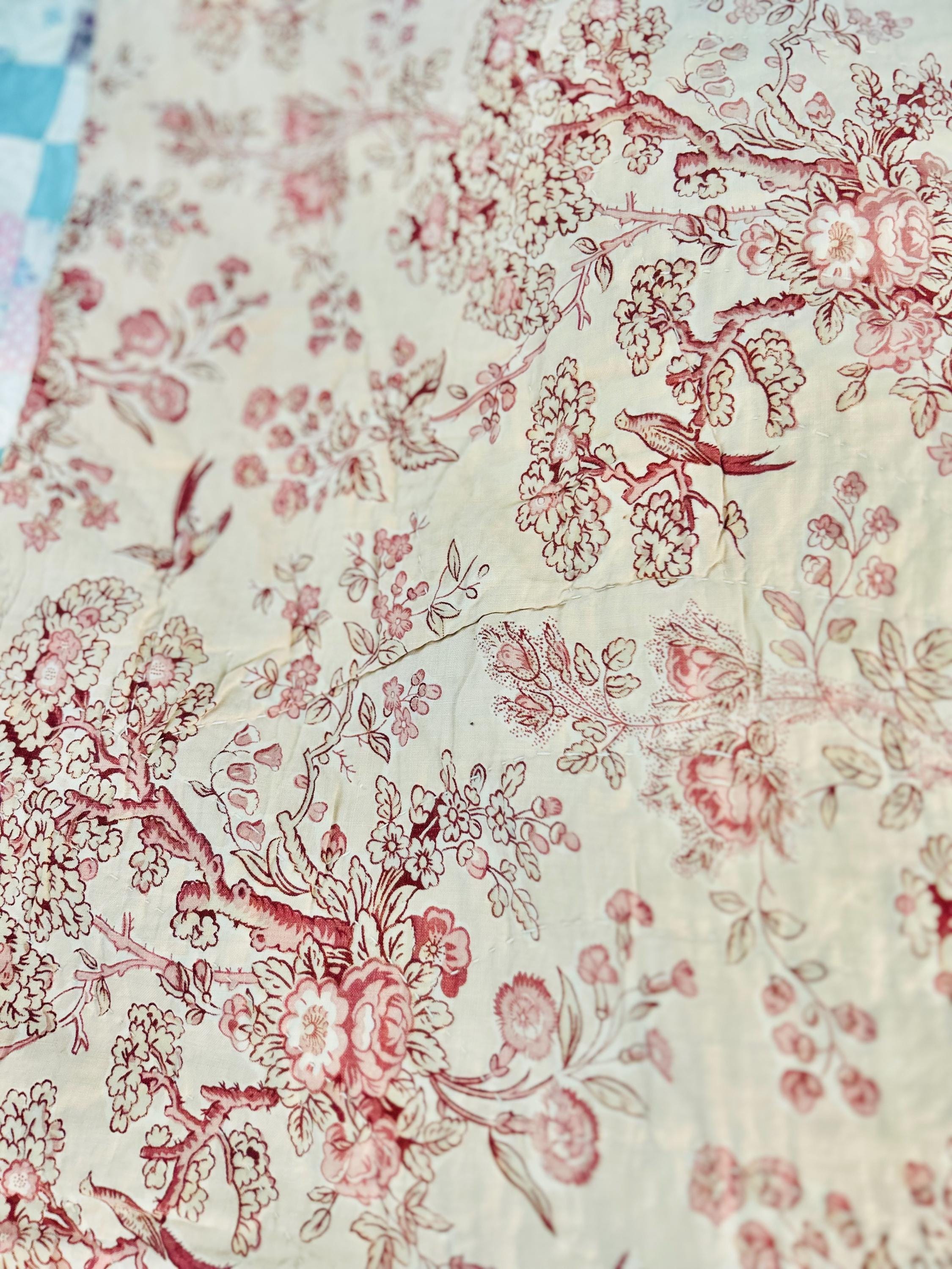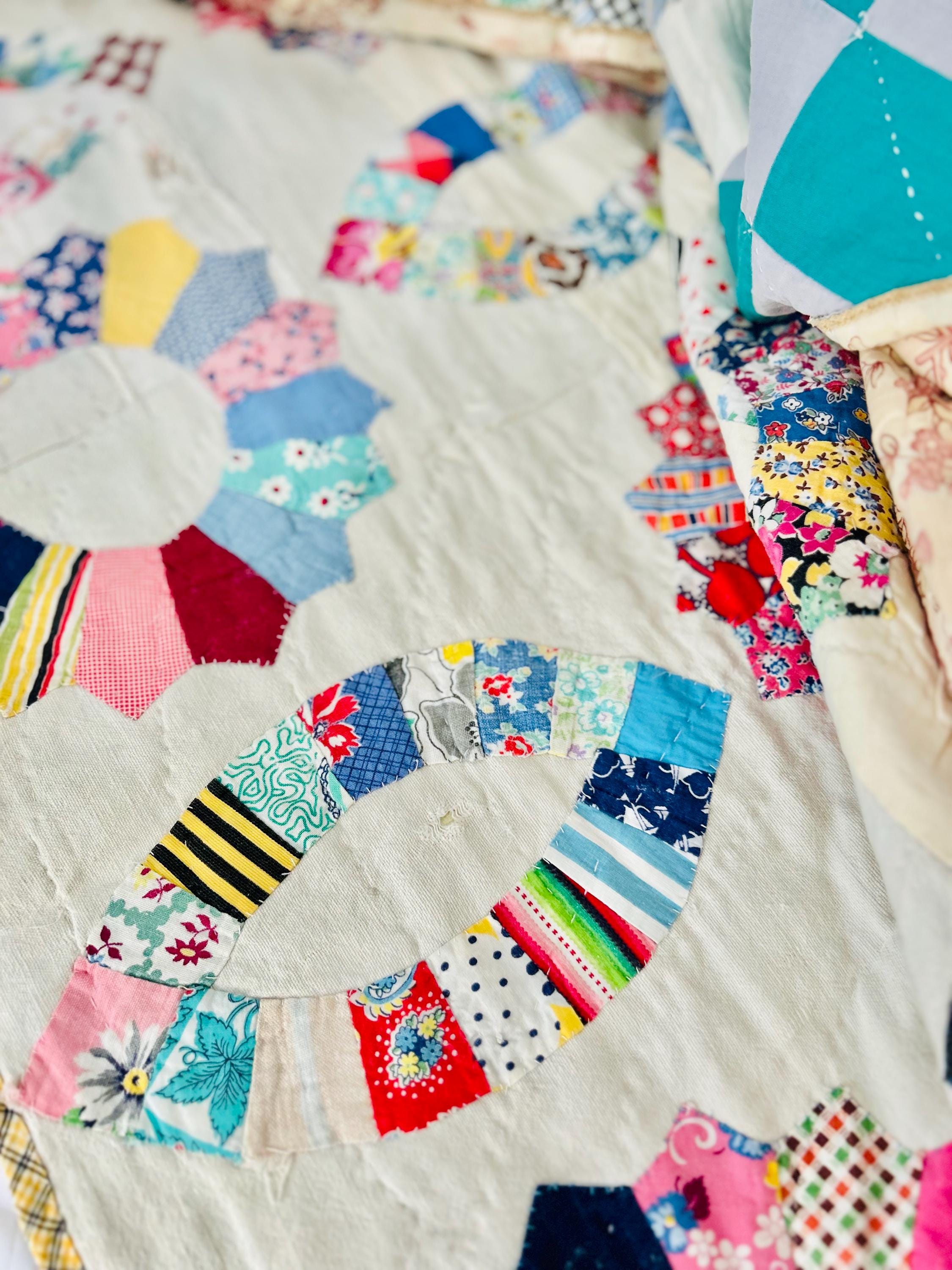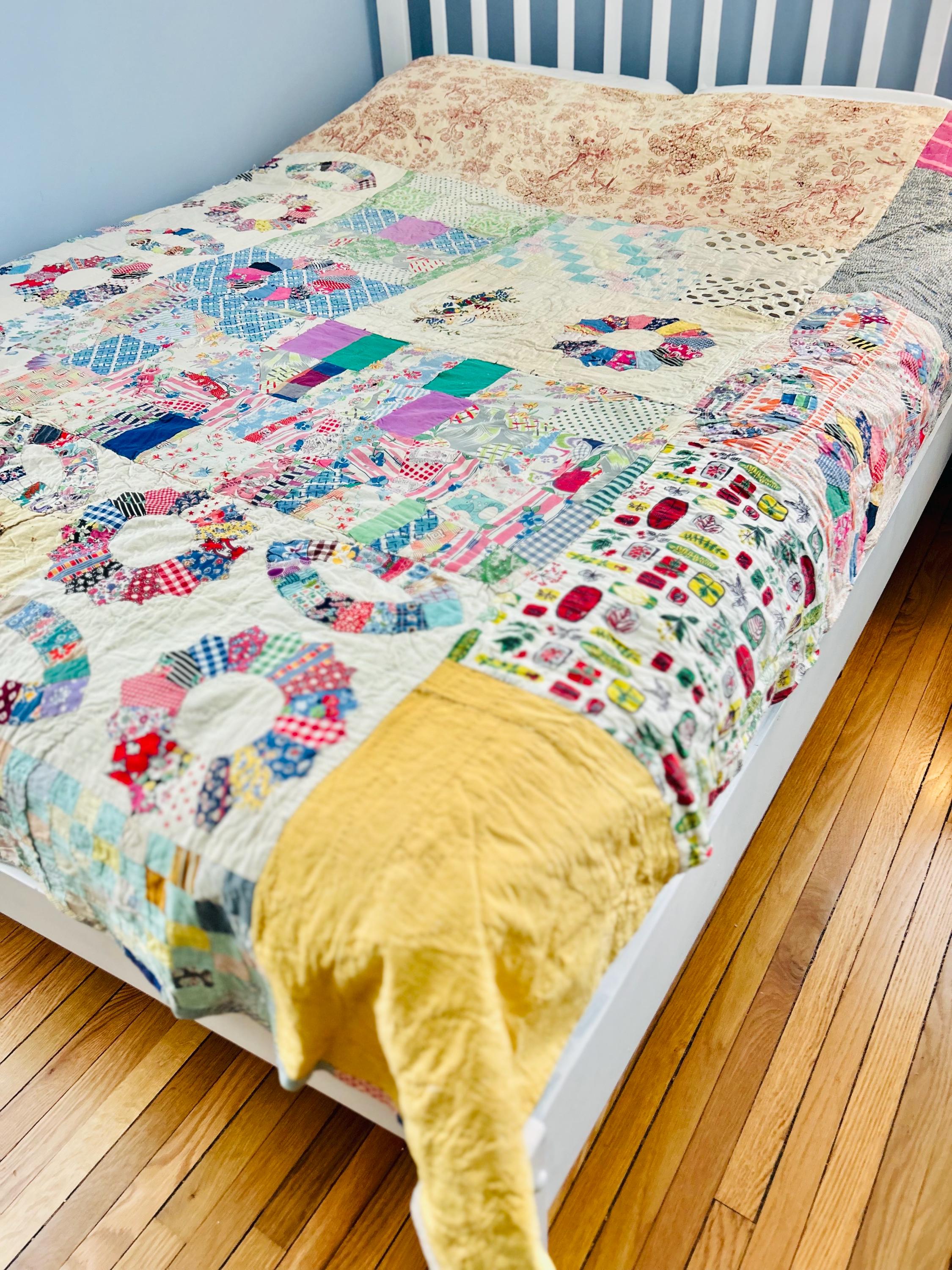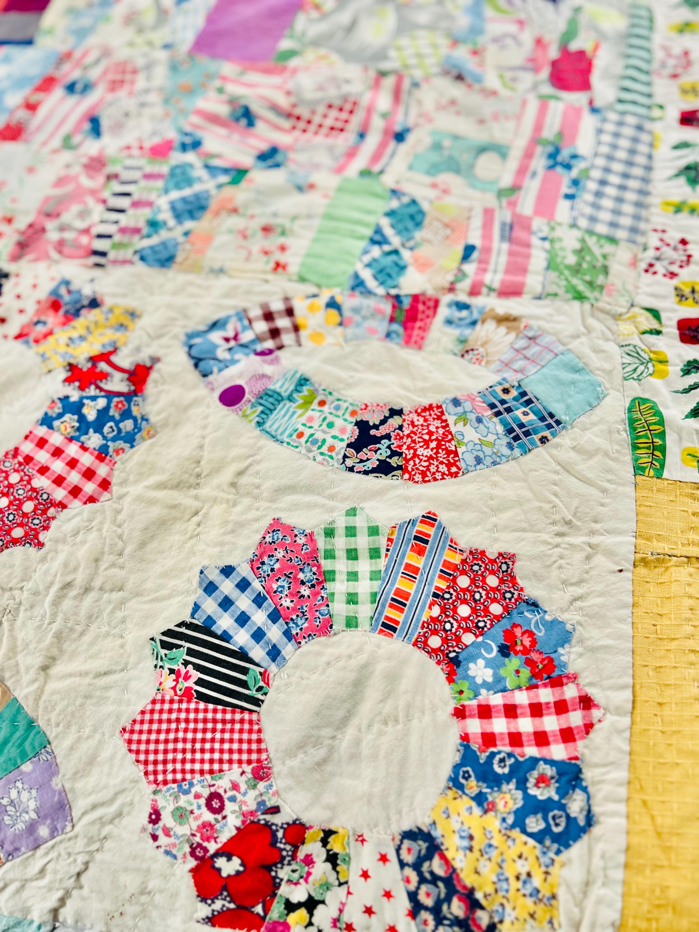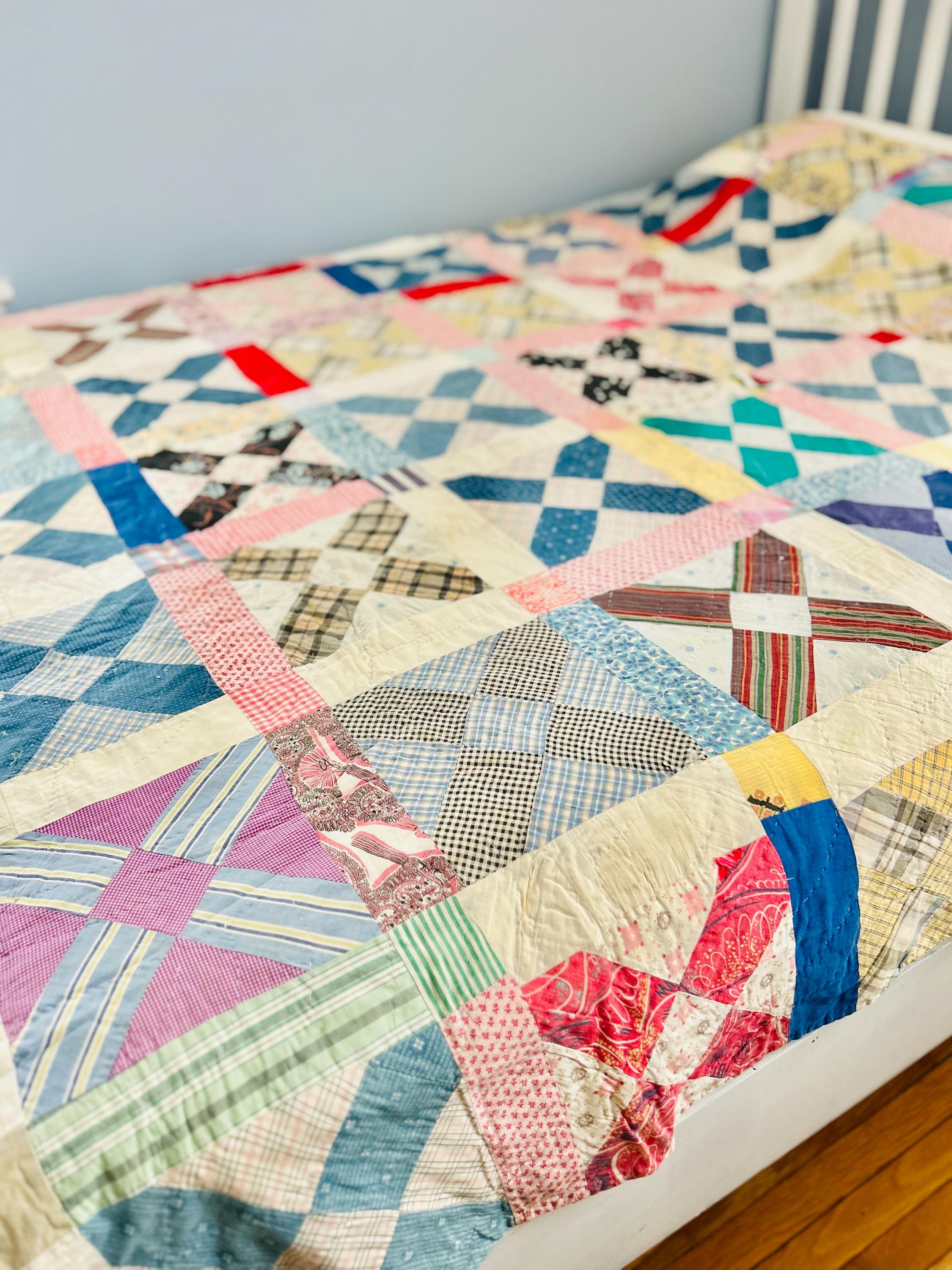 This early 20th Century Double-Sided Quilt is one-of-a-kind. One side is a patchwork Crow's Foot pattern while the other is a compilation of random blocks of Dresden Plate, Double-Wedding-Ring and even an embroidered basket of flowers along with a half-dozen big and small patches of historic fabrics in a Crazy-Quilt-type pattern.