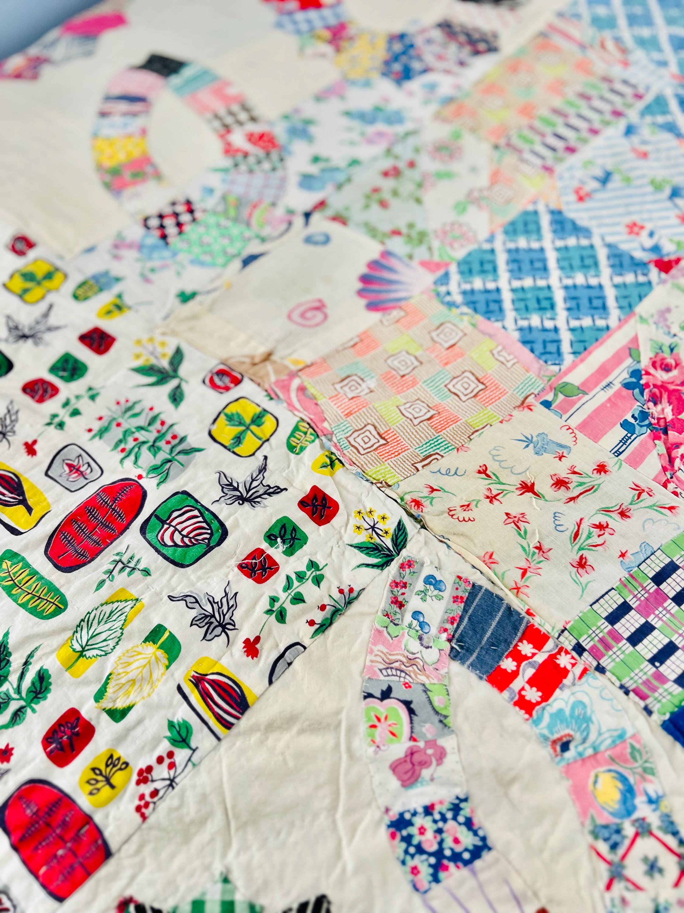The entire quilt is hand-quilted in a repeating shell pattern. Fabric from the Crow's Foot side has been turned to the "everything" side and hand-stitched to form the binding.