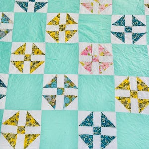This unique quilt is clean and soft and measures 73 inches by 82 inches. From a smoke-free, pet-free home. Shown on a queen bed. CL00078