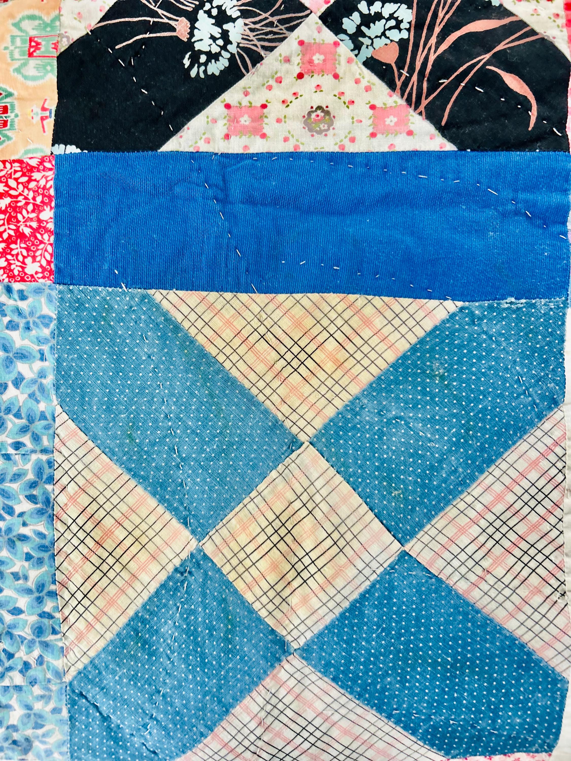 The quilt is in excellent antique condition, with some fabric loss of about an inch square of the muslin fabric on two of the blocks on the "everything" side. There are also some minor seam separations on the same side.