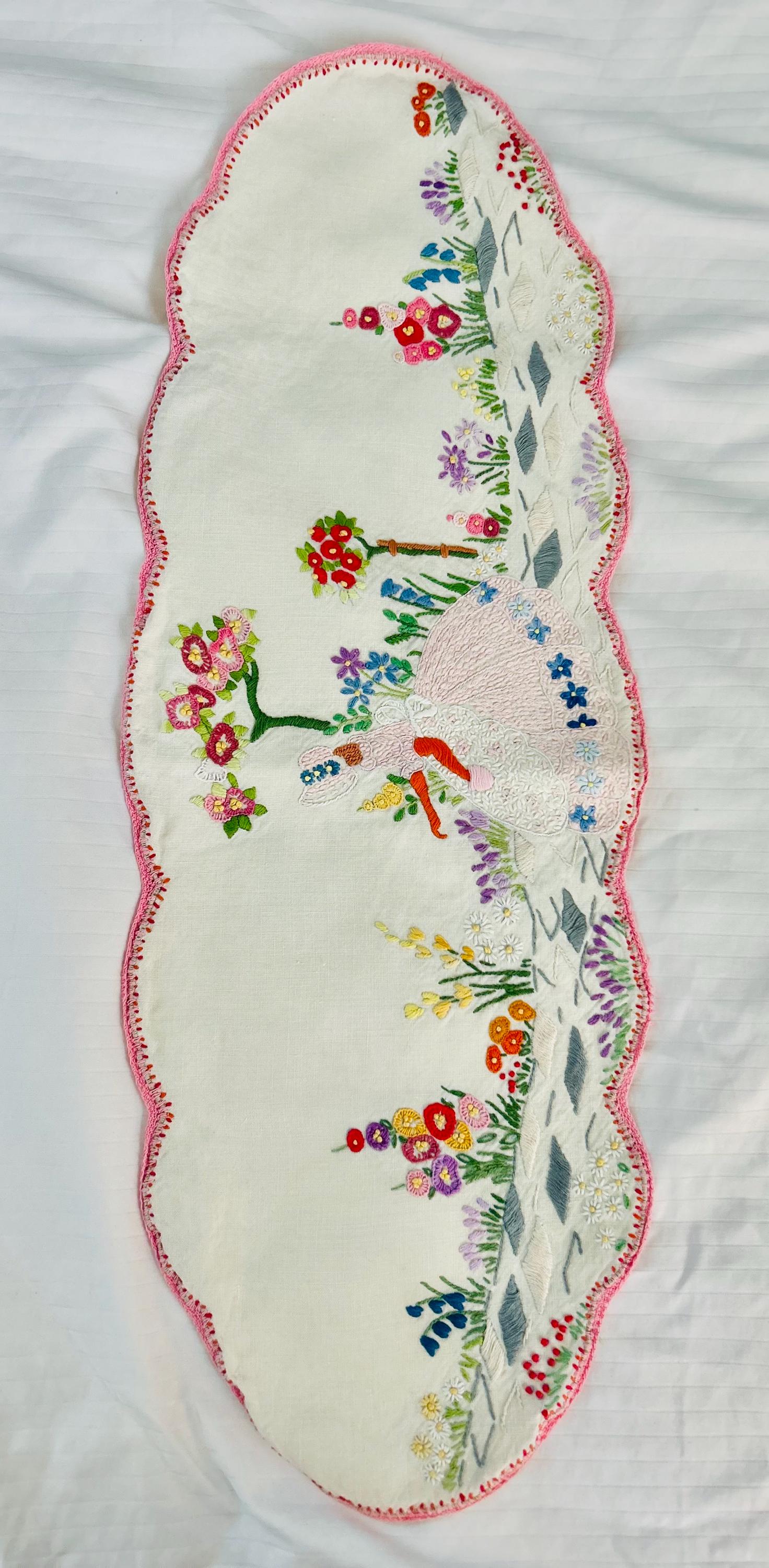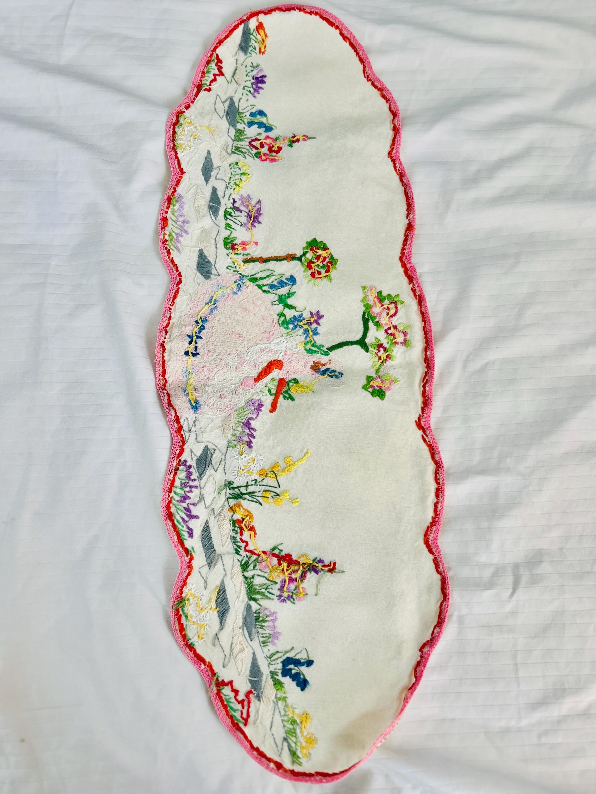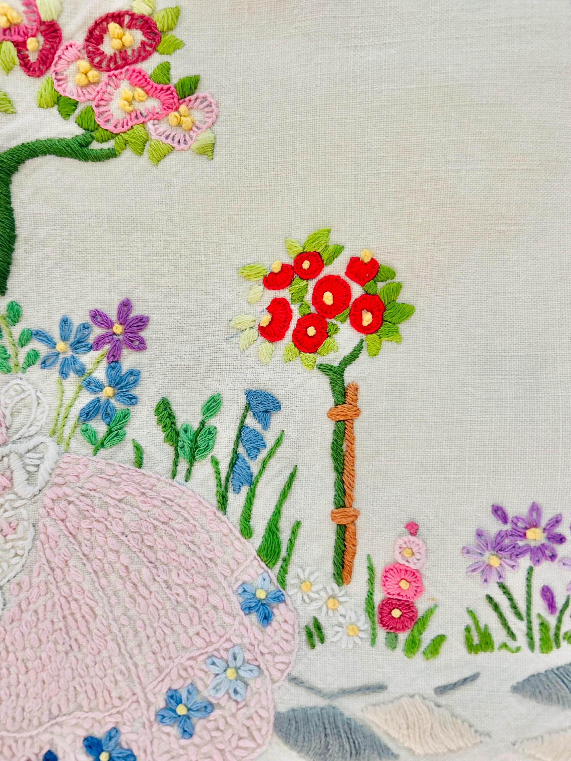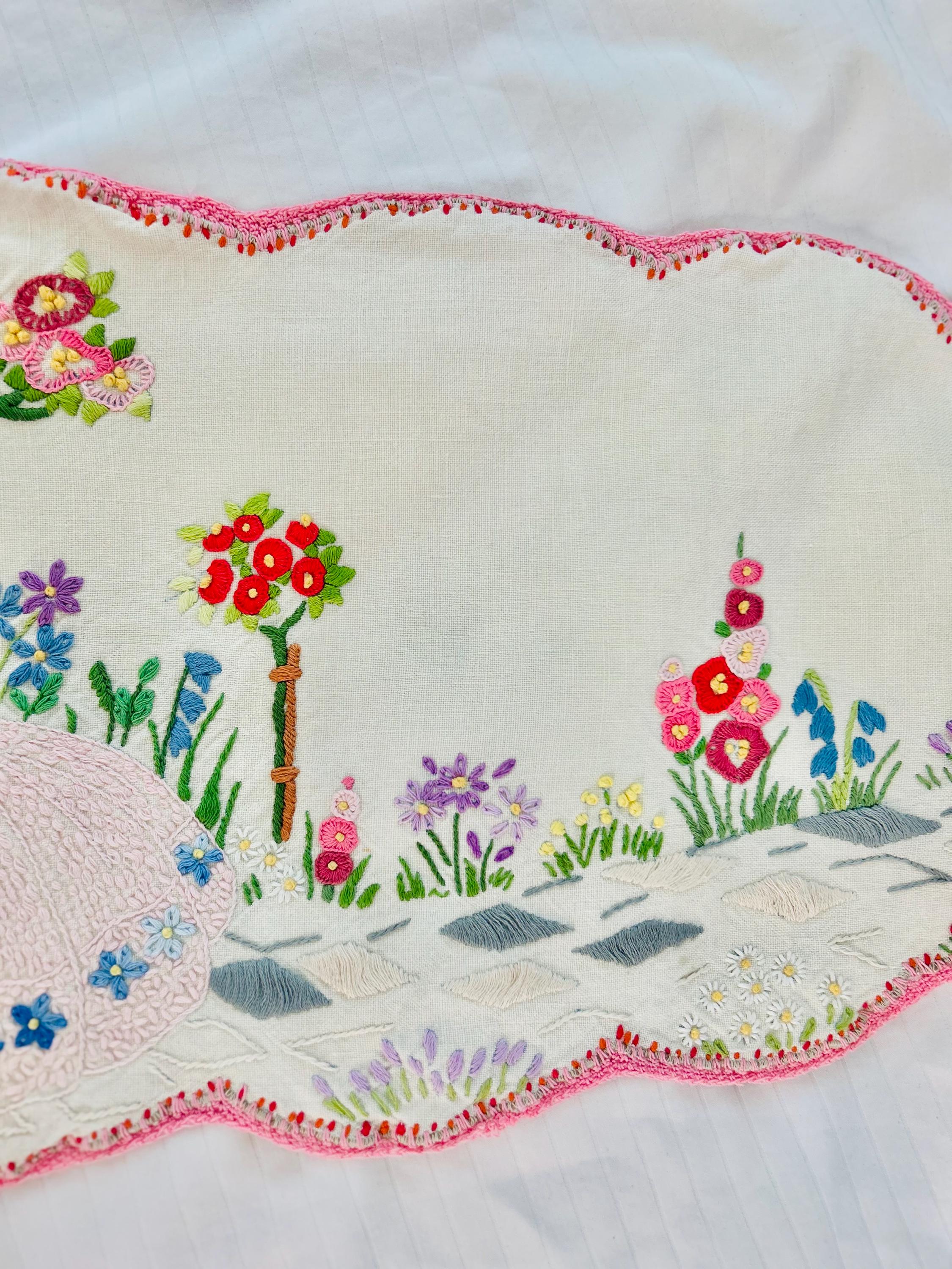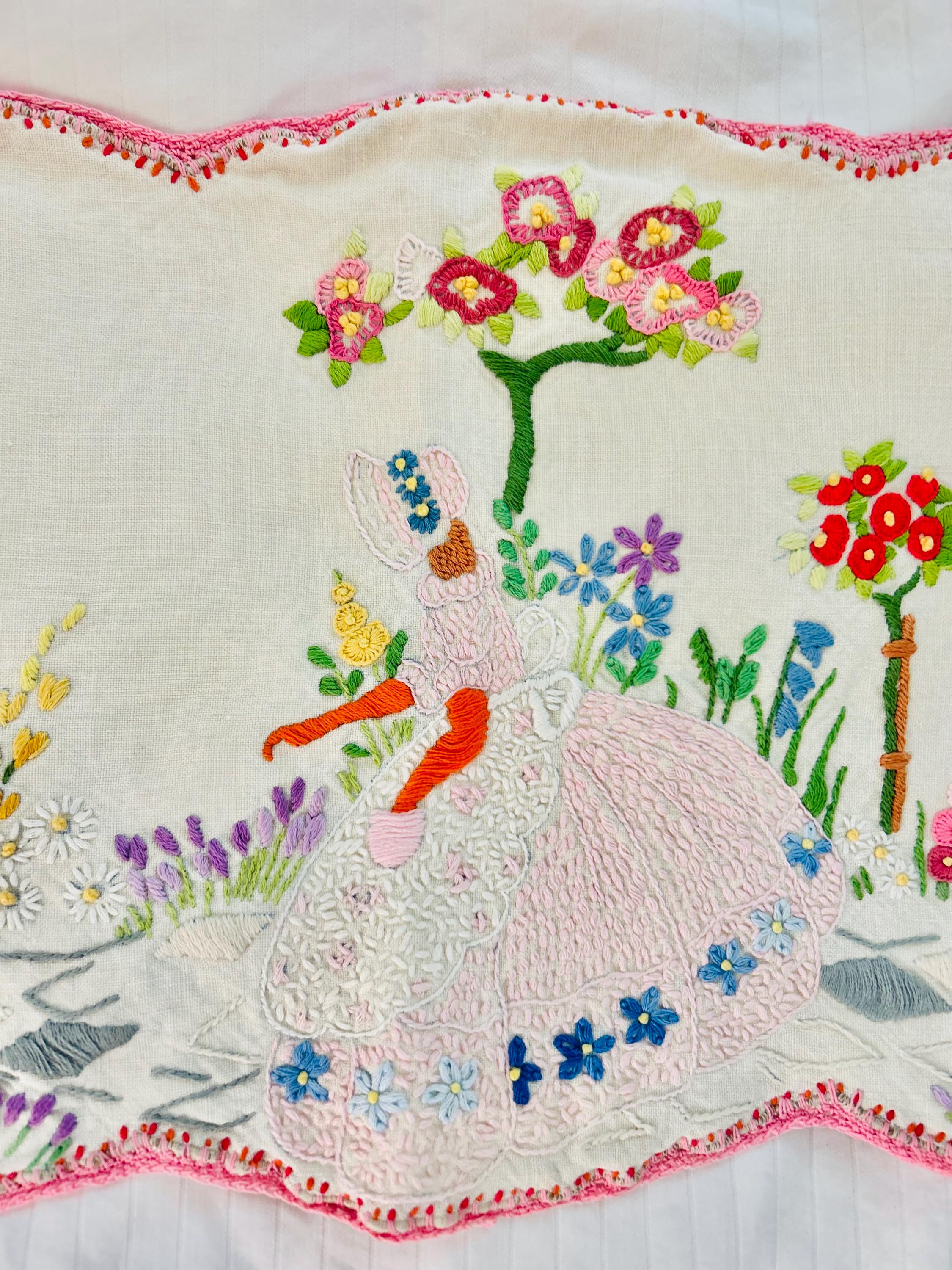 This beautifully and intricately hand-embroidered linen table runner or dresser scarf, circa 1940s, depicts a Southern Belle in a pink dress with white flowers walking in a lovely flower garden planted with flowers and trees of all colors. The border has been tatted.