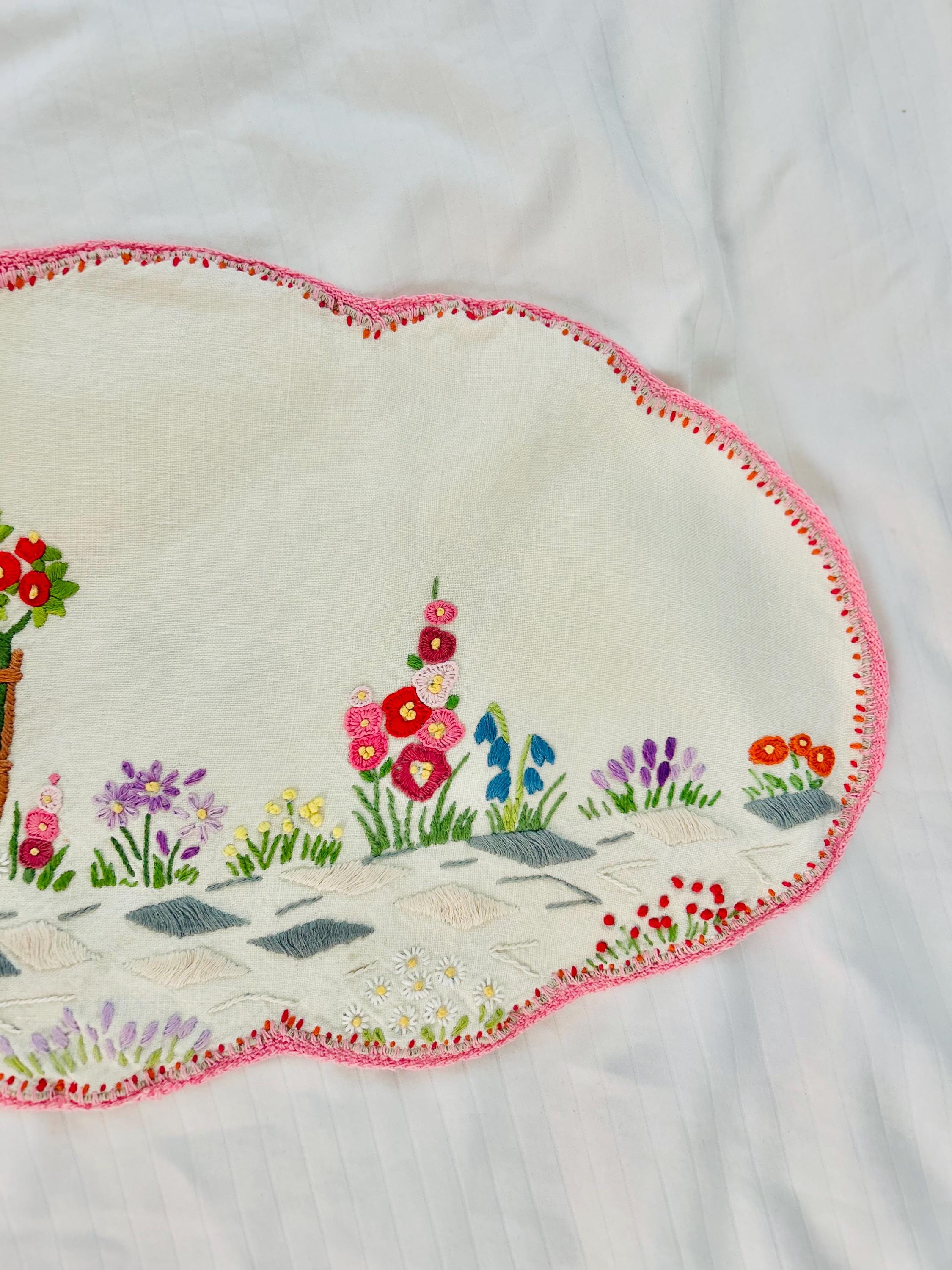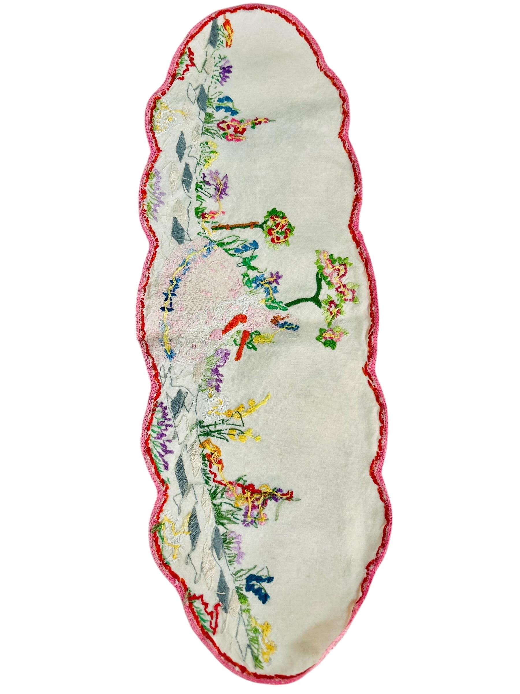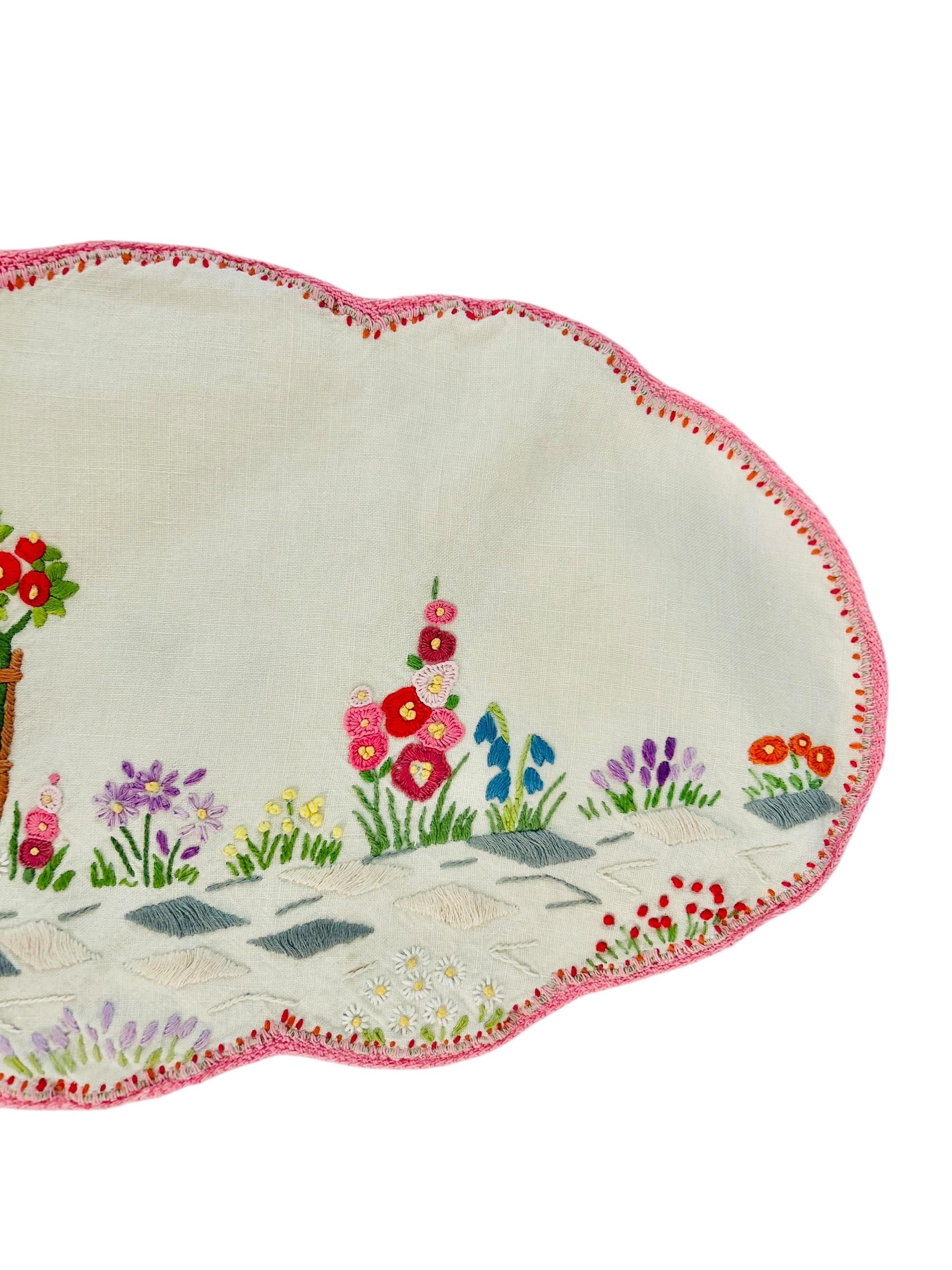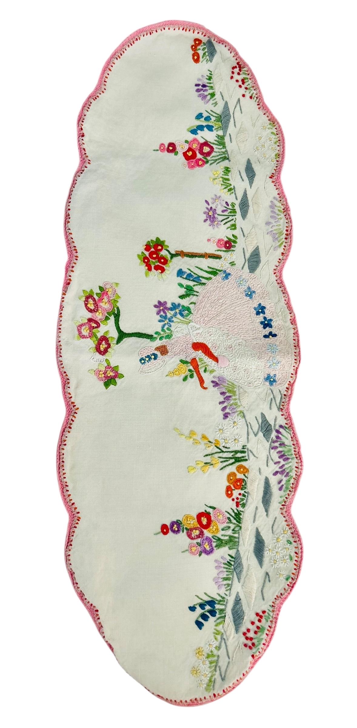 This beautifully and intricately hand-embroidered linen table runner or dresser scarf, circa 1940s, depicts a Southern Belle in a pink dress with white flowers walking in a lovely flower garden planted with flowers and trees of all colors. The border has been tatted.