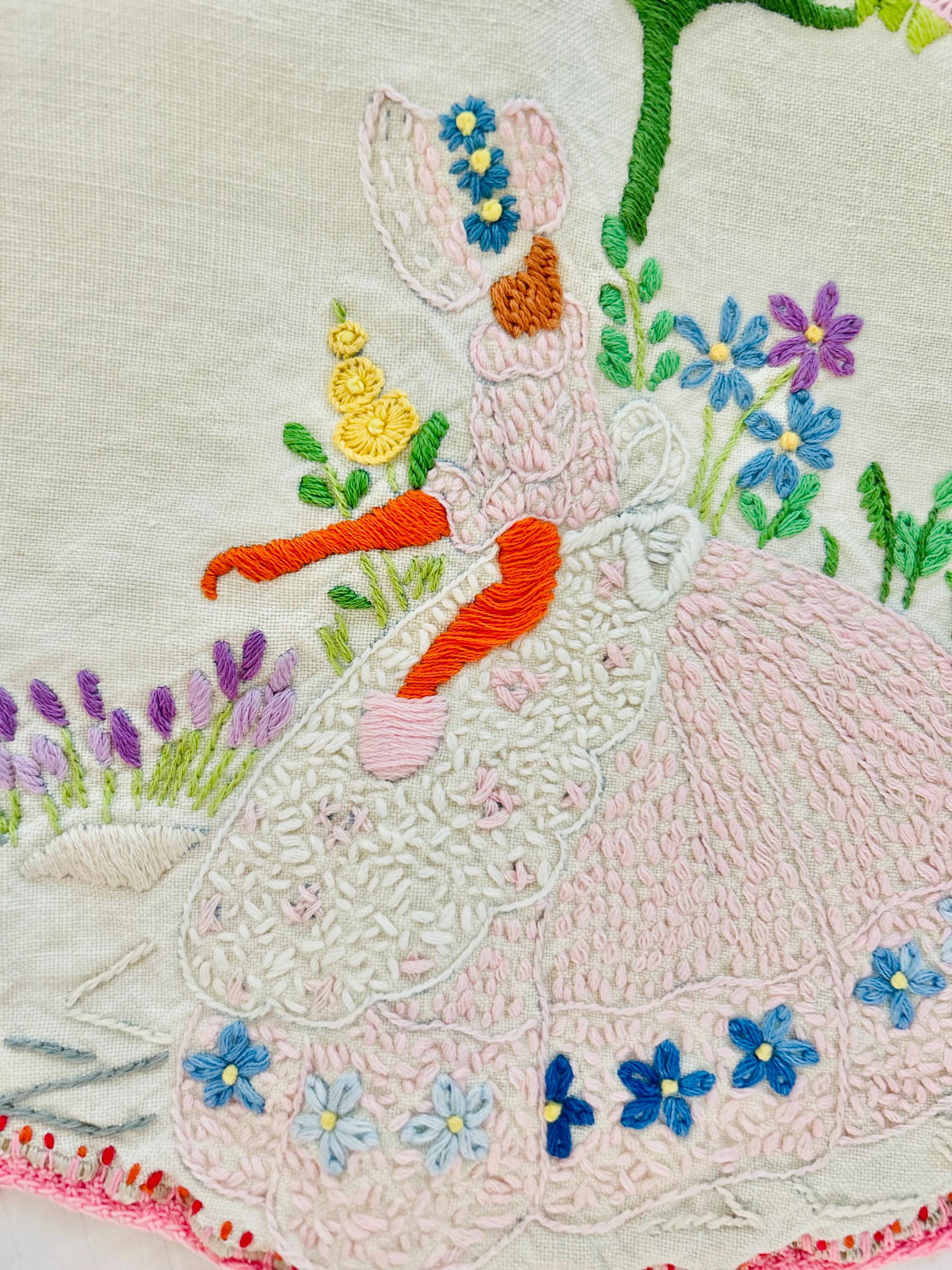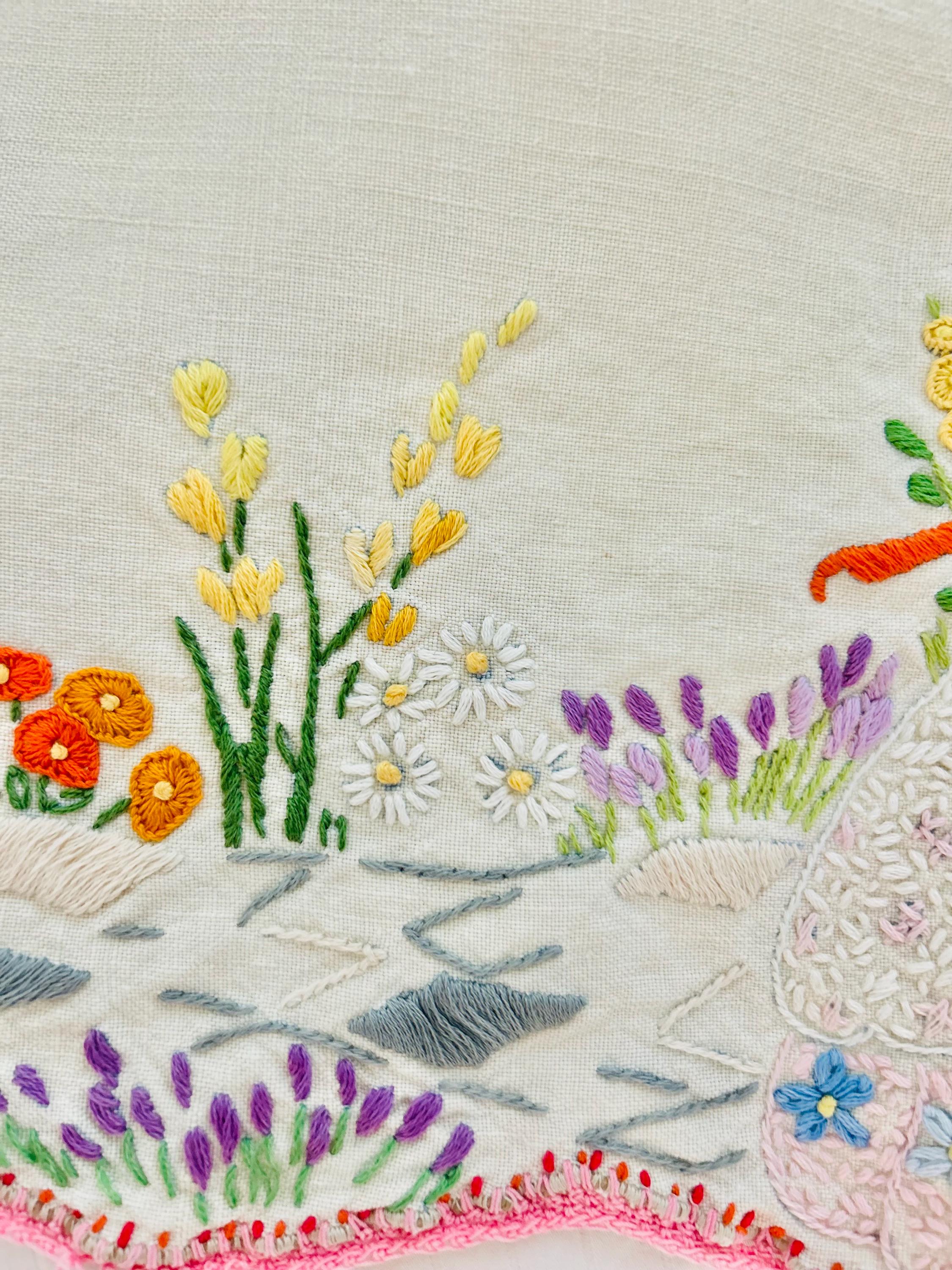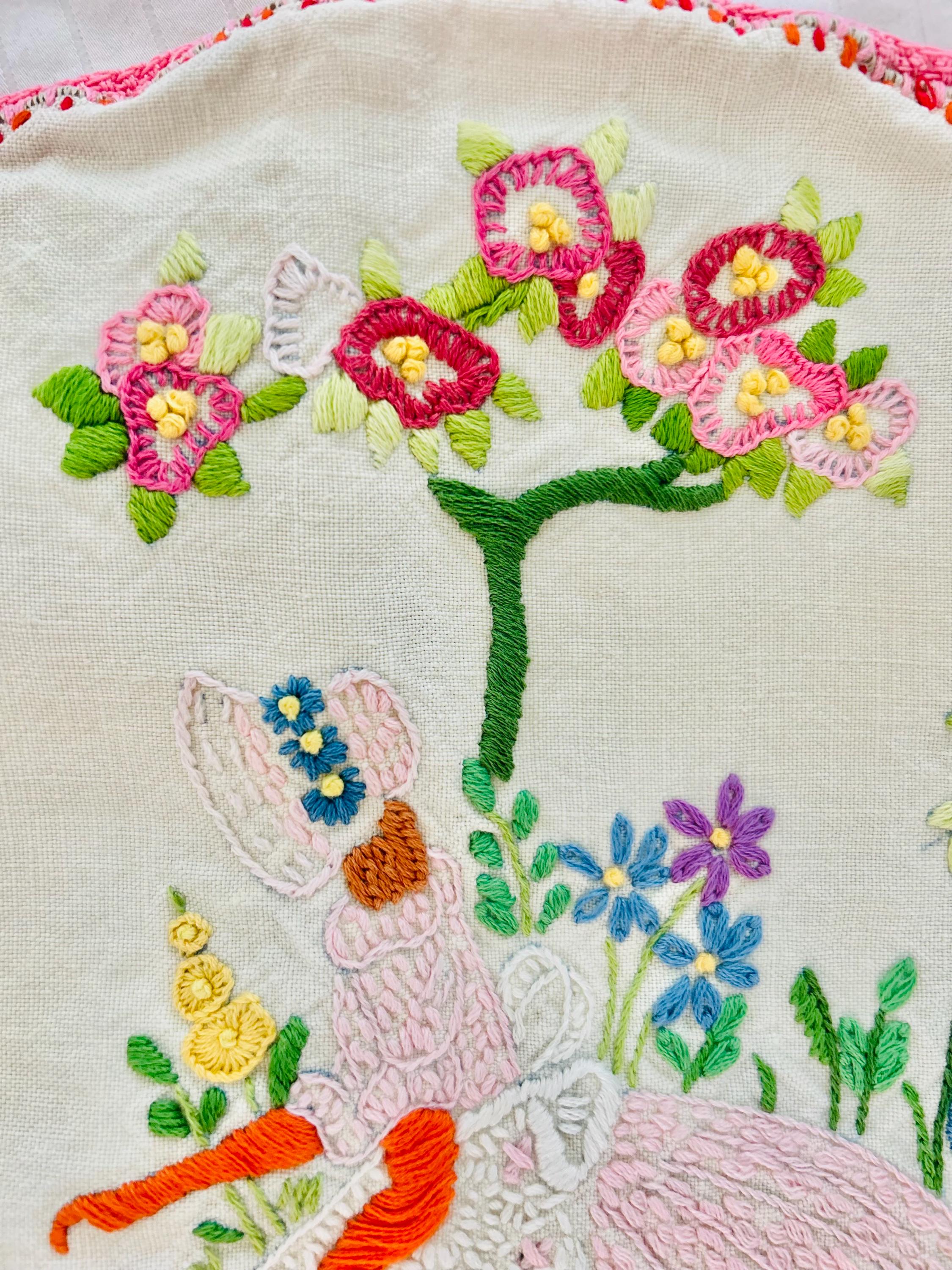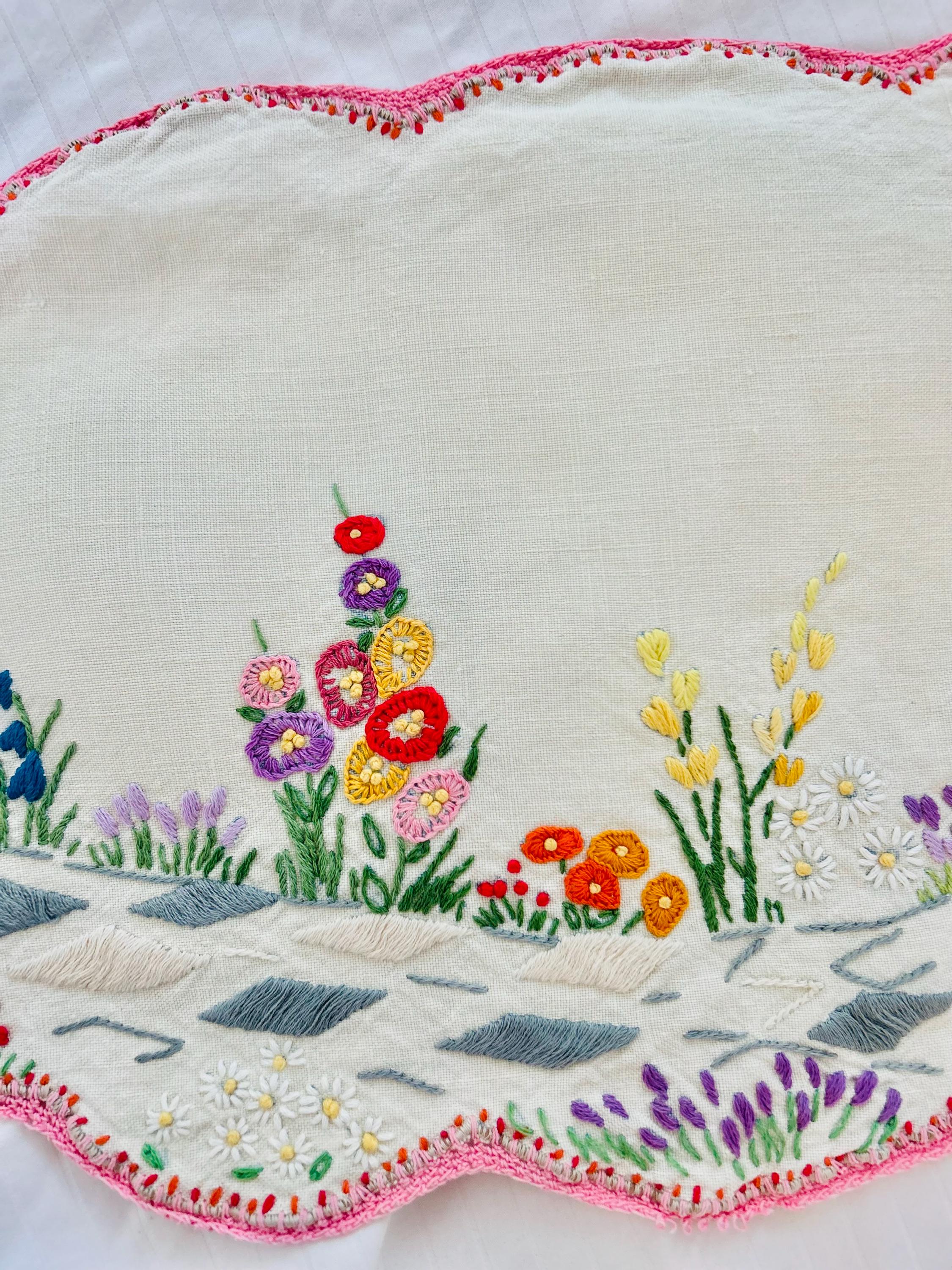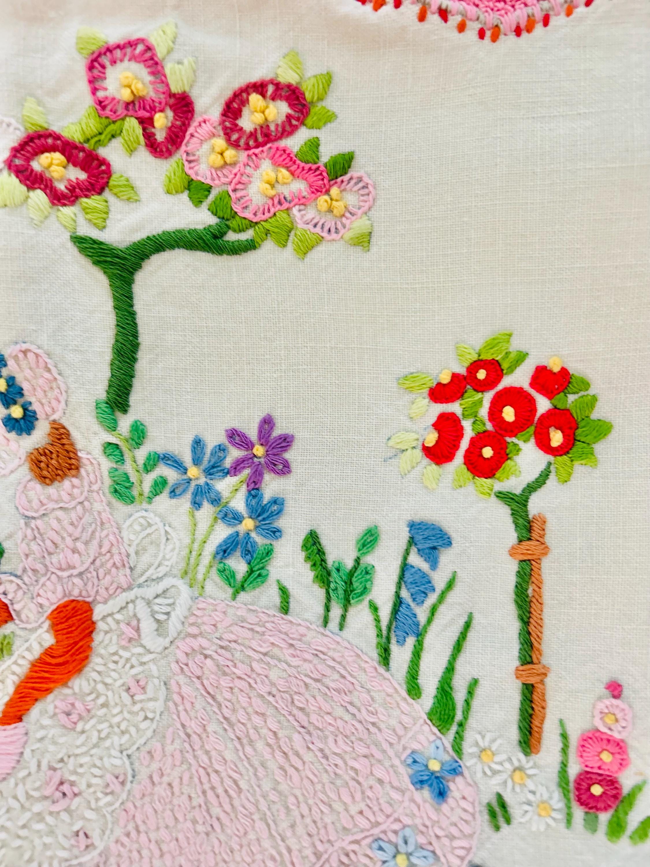 This beautifully and intricately hand-embroidered linen table runner or dresser scarf, circa 1940s, depicts a Southern Belle in a pink dress with white flowers walking in a lovely flower garden planted with flowers and trees of all colors. The border has been tatted.