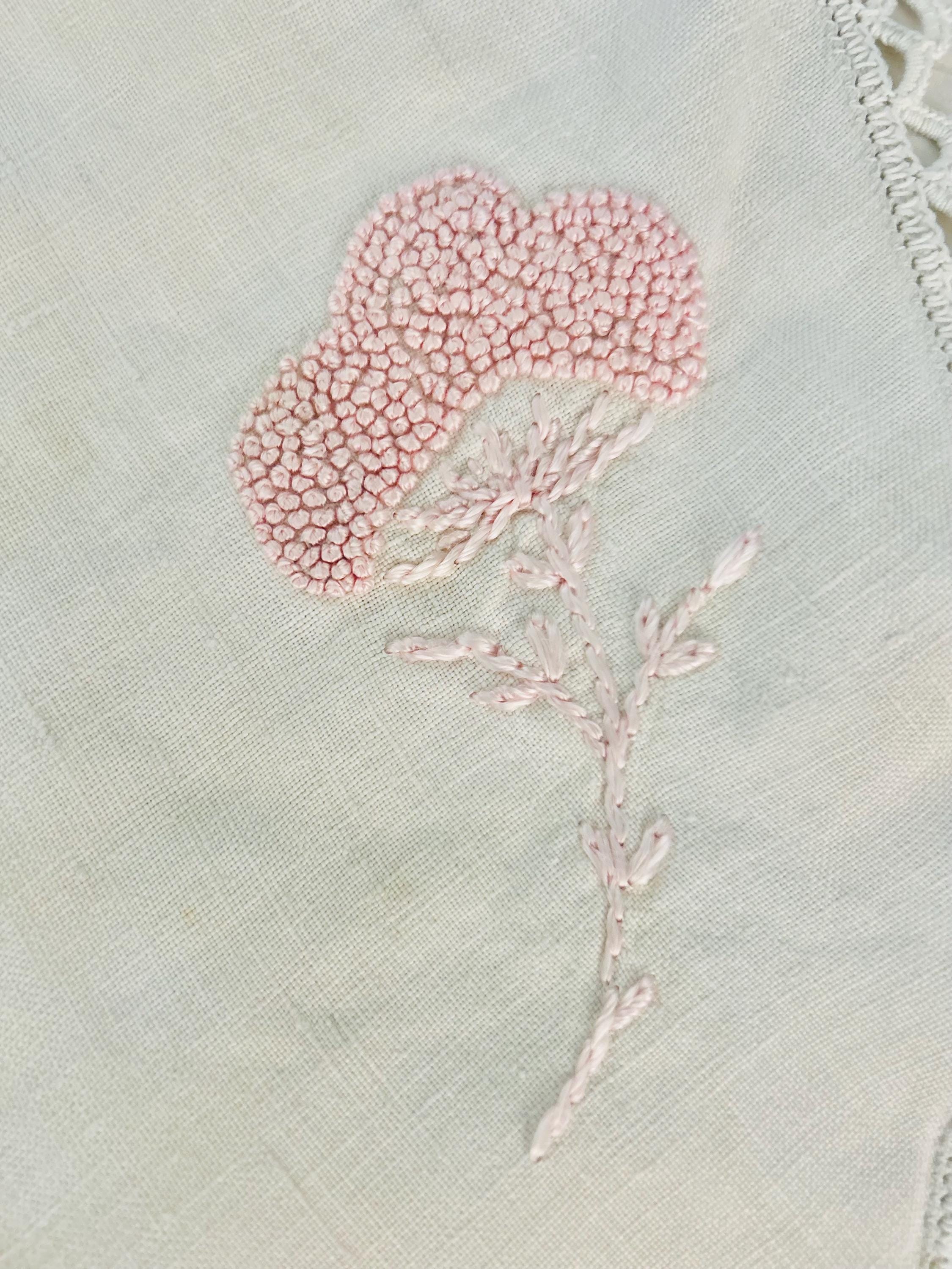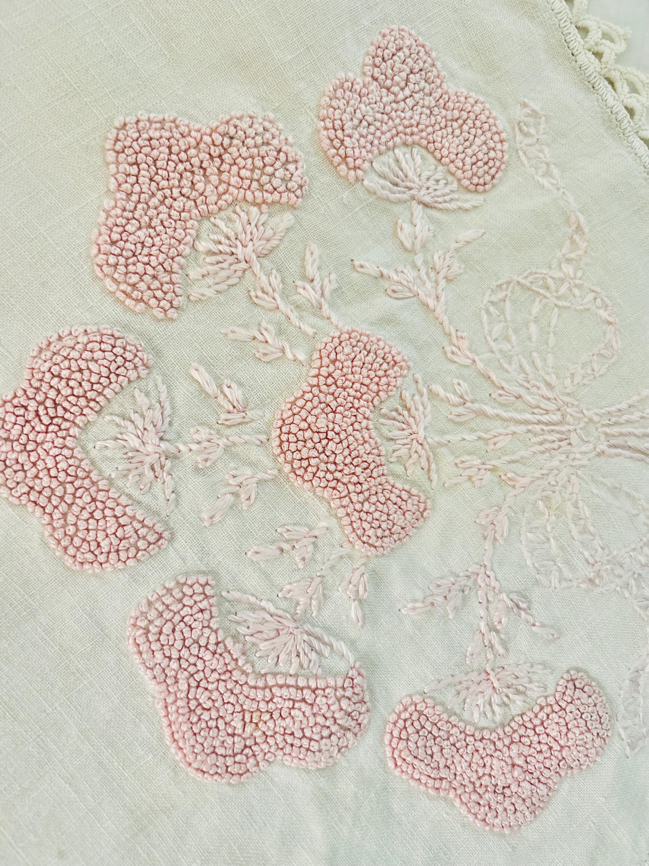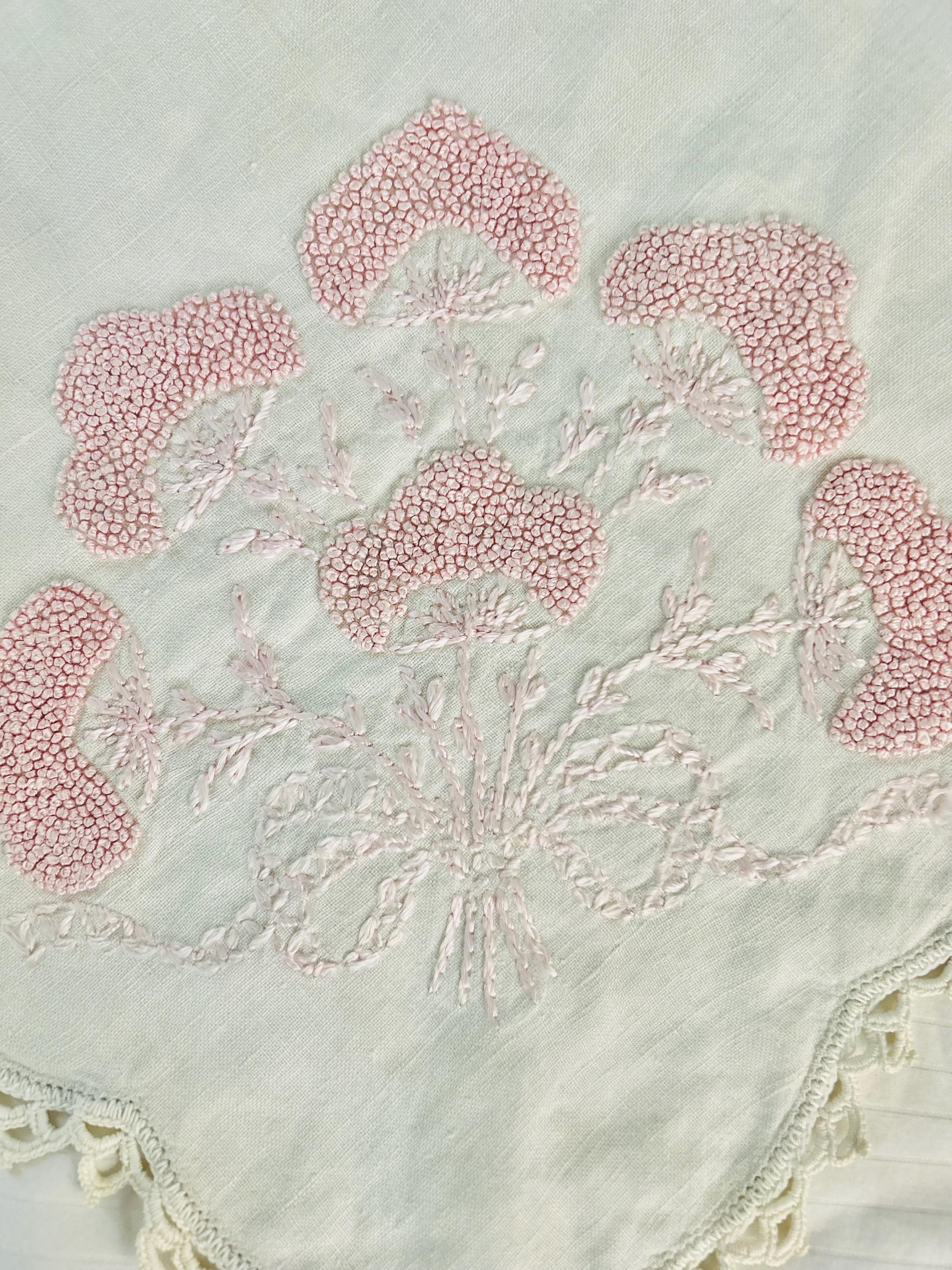 This French Knot Embroidered Table Runner or Dresser Scarf with tatted border, circa 1950s, has been well preserved. It is embroidered with light pink flower stems and elaborate French Knot flowers. As anyone who has ever tried it knows, French Knot is one of the most difficult embroidery stitches to master.