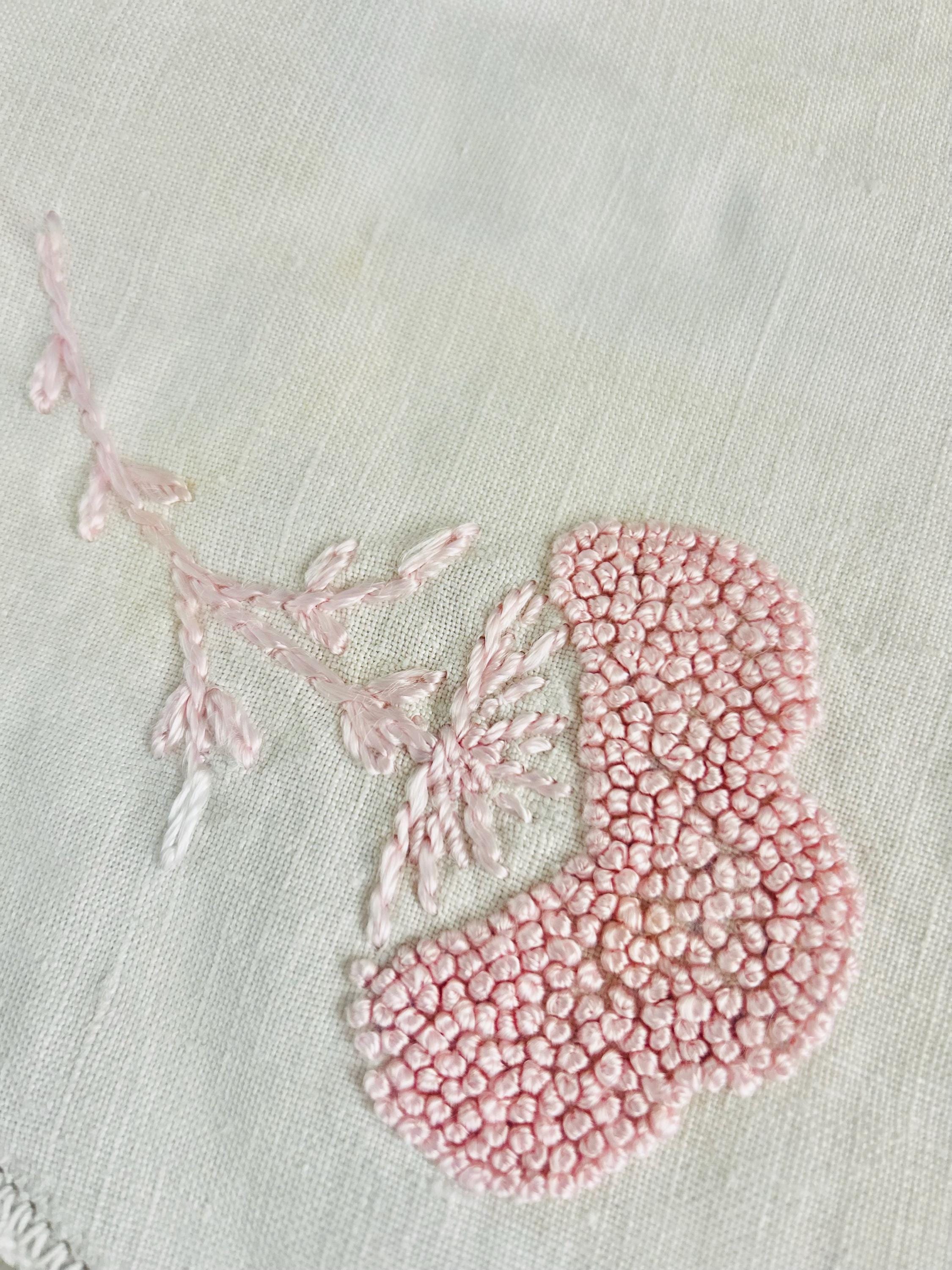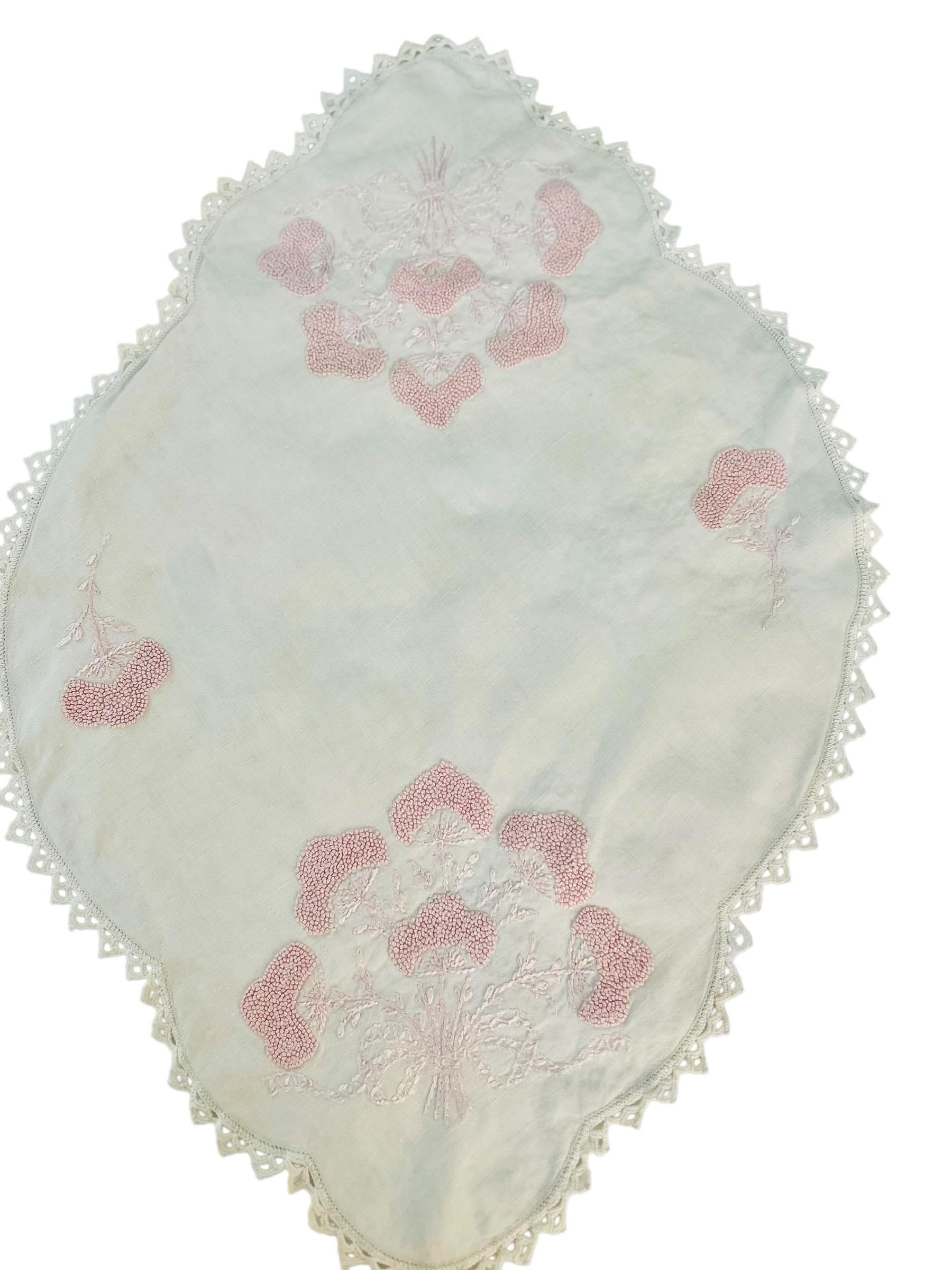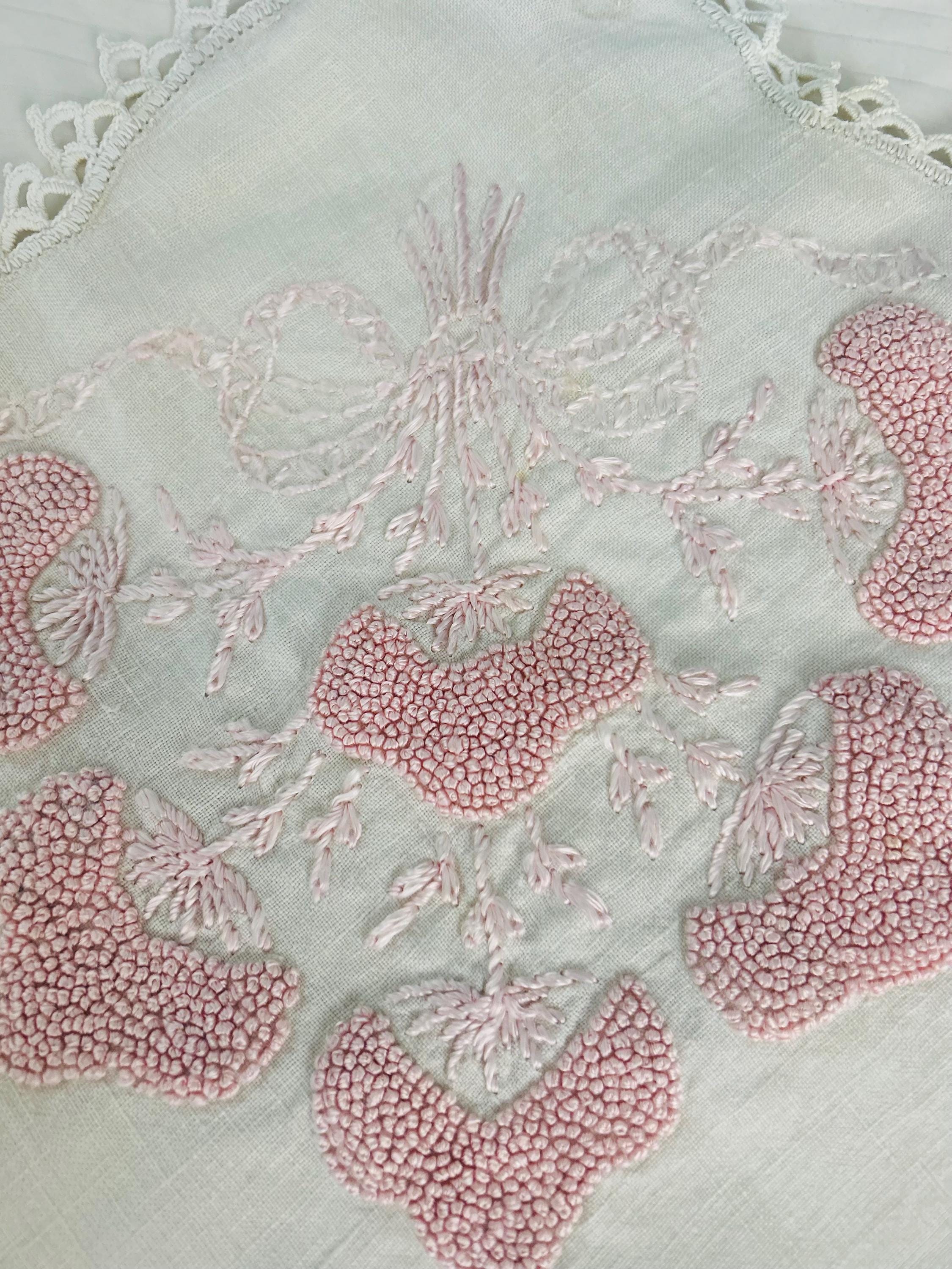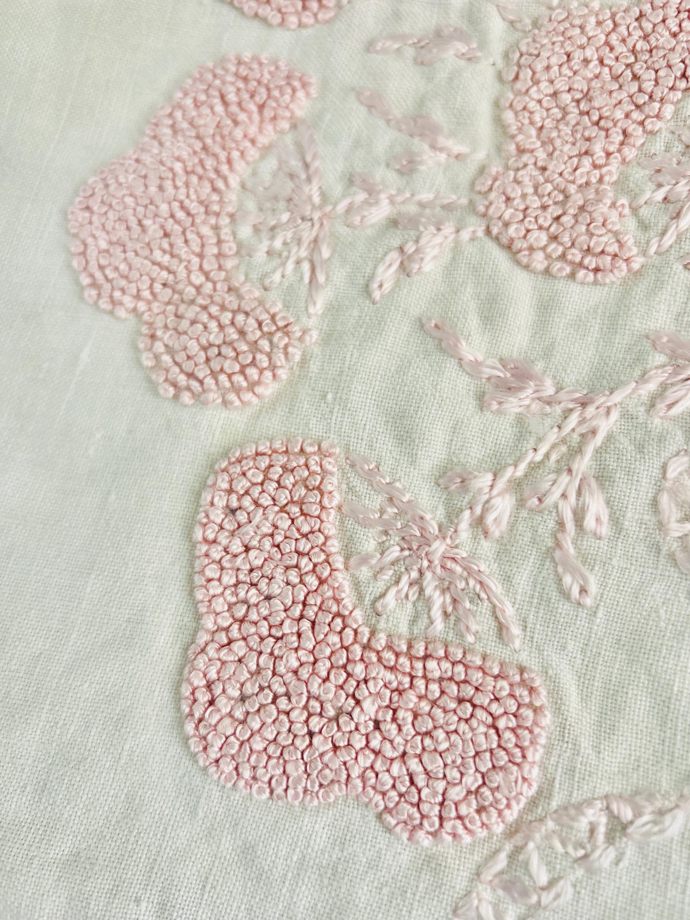 This French Knot Embroidered Table Runner or Dresser Scarf with tatted border, circa 1950s, has been well preserved. It is embroidered with light pink flower stems and elaborate French Knot flowers. As anyone who has ever tried it knows, French Knot is one of the most difficult embroidery stitches to master.