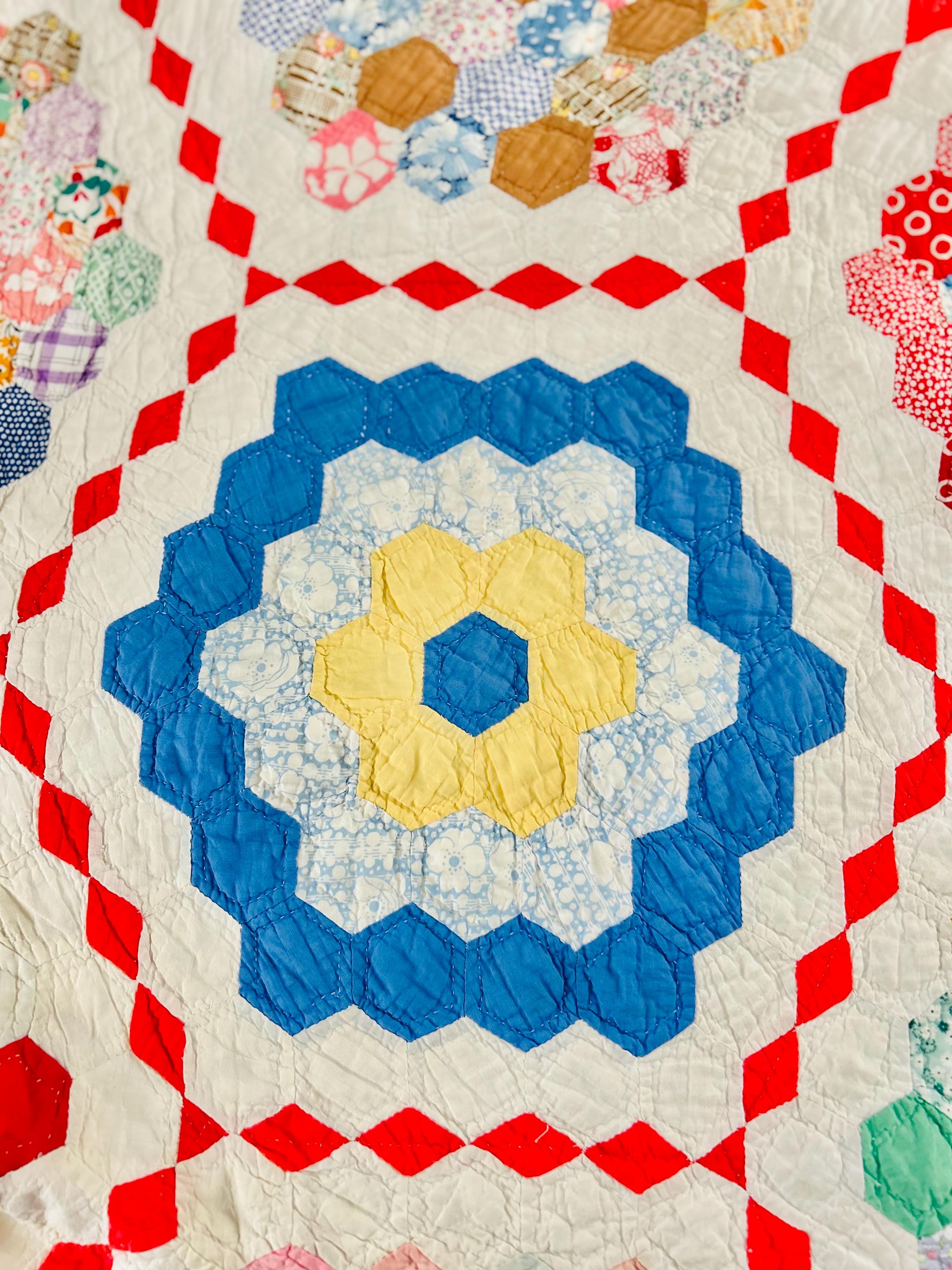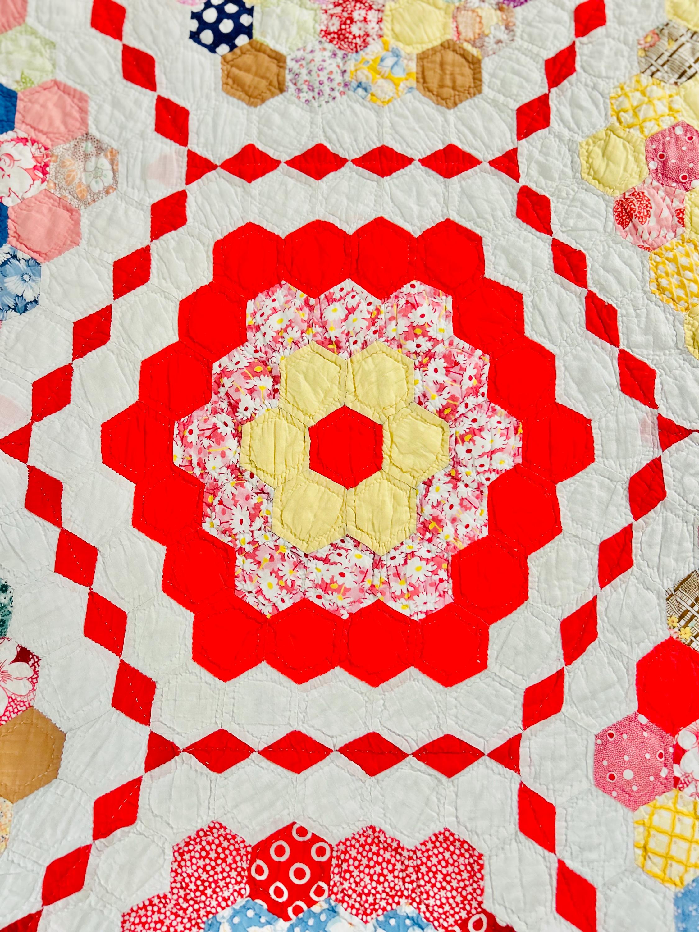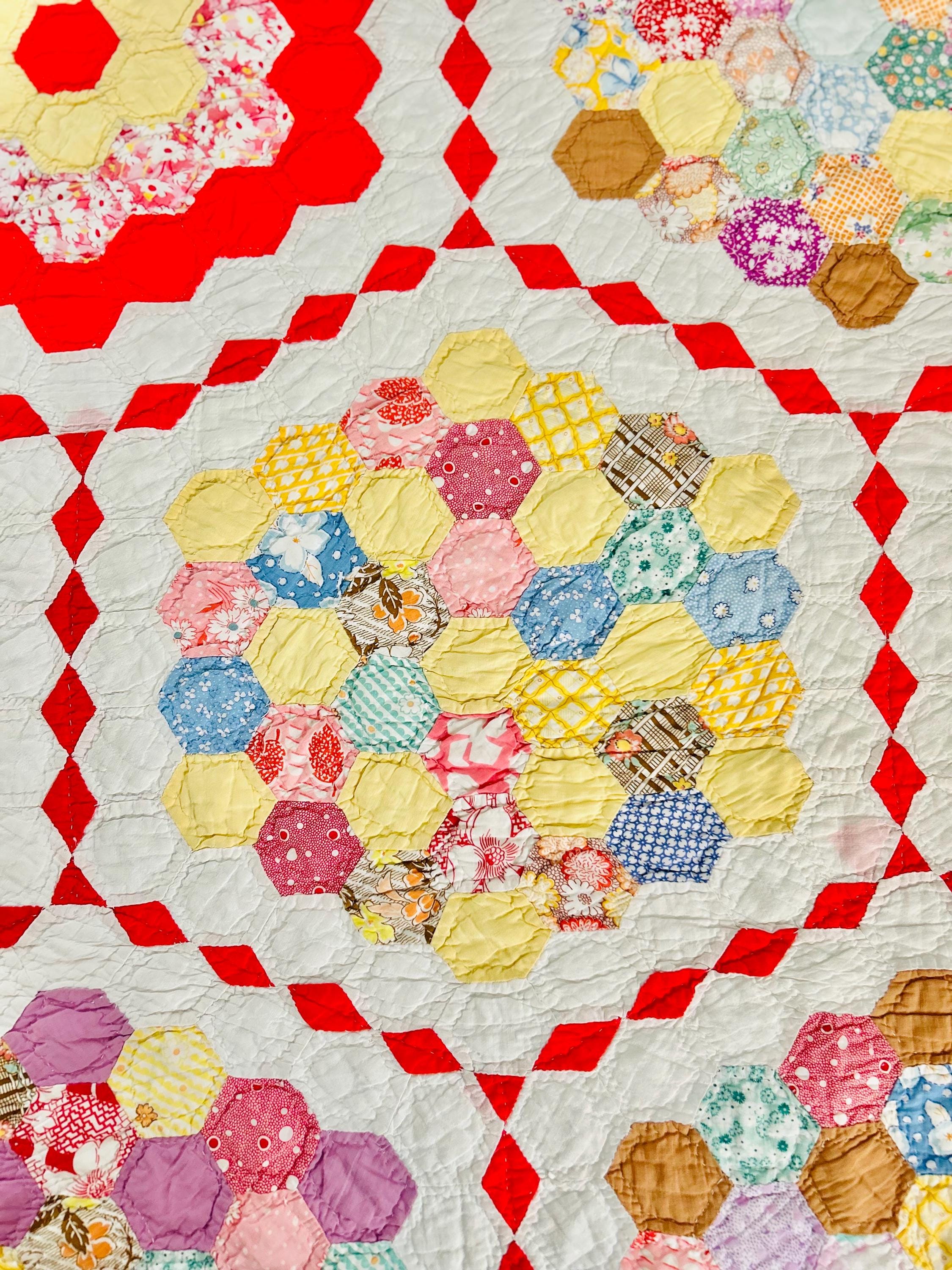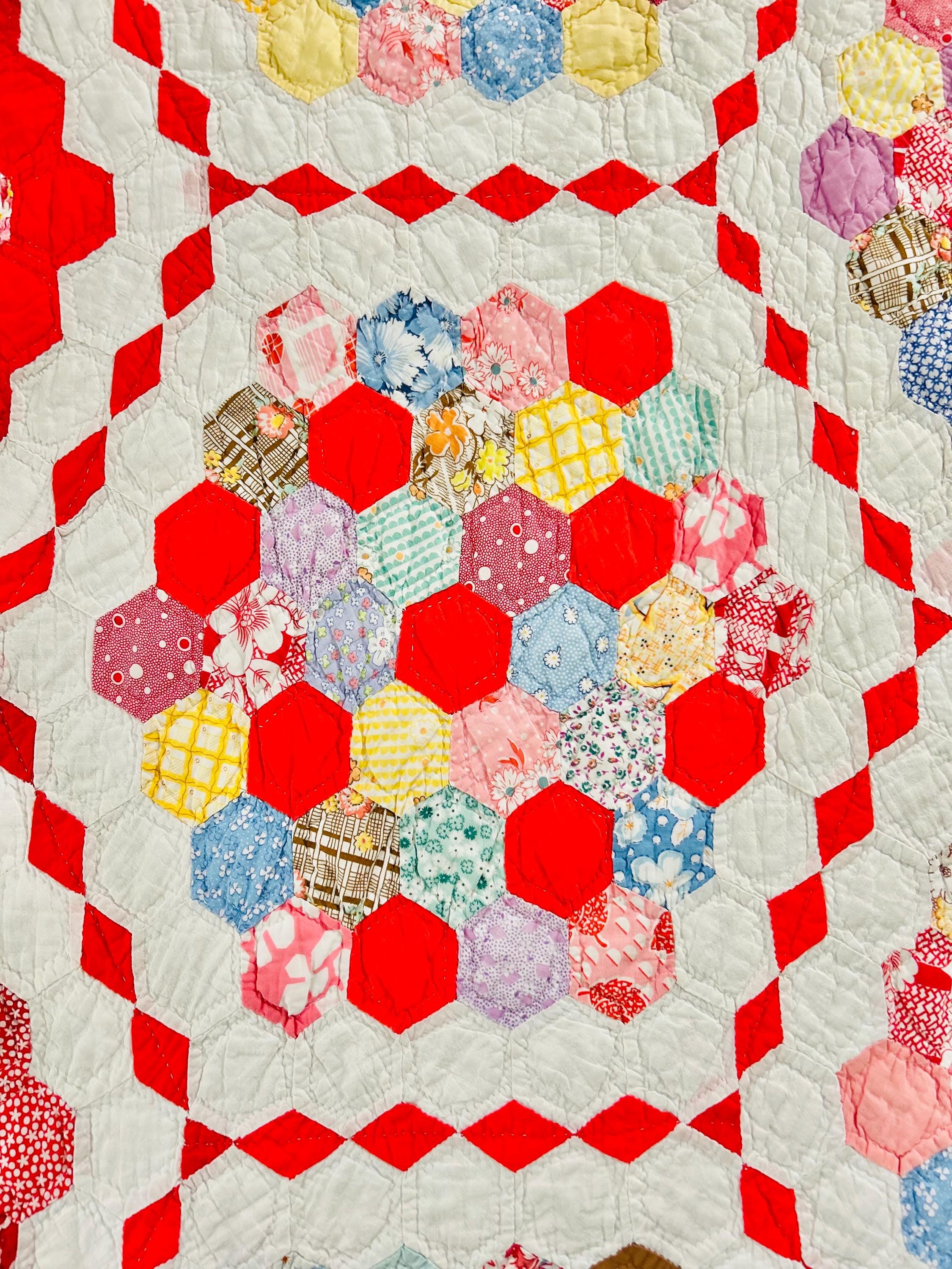 This Grandmother's Flower Garden Cutter Quilt, 1930s, is stunning with its red diamond borders around each large and colorful flower garden. It is beautifully pieced and meticulously hand-quilted in outlines of each of the thousands of hexagons that make up the quilt. The border of the quilt is scalloped, following the lines of the flower gardens.