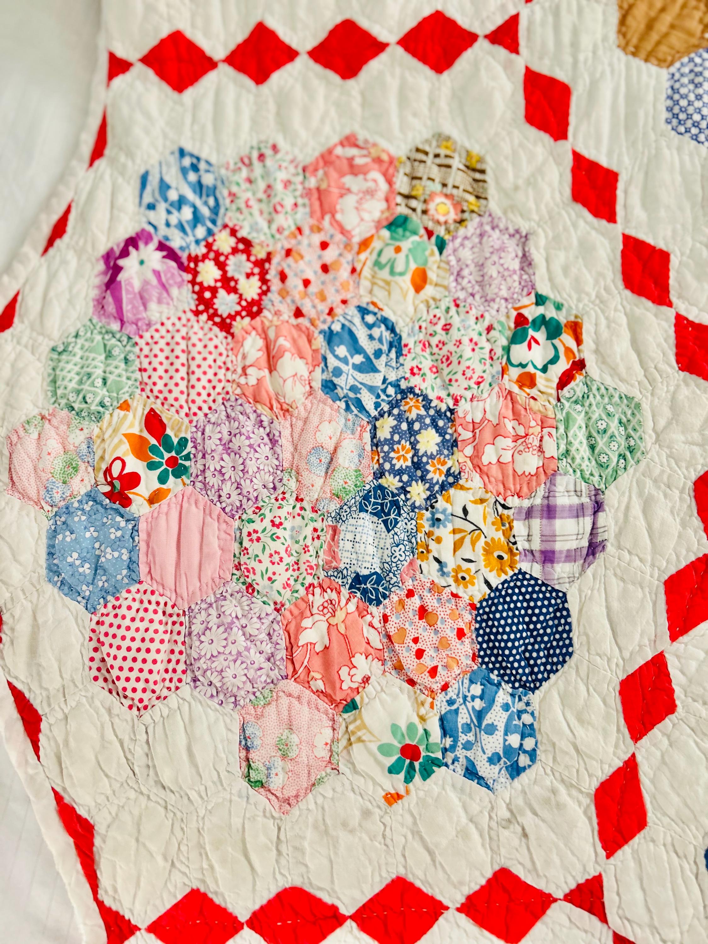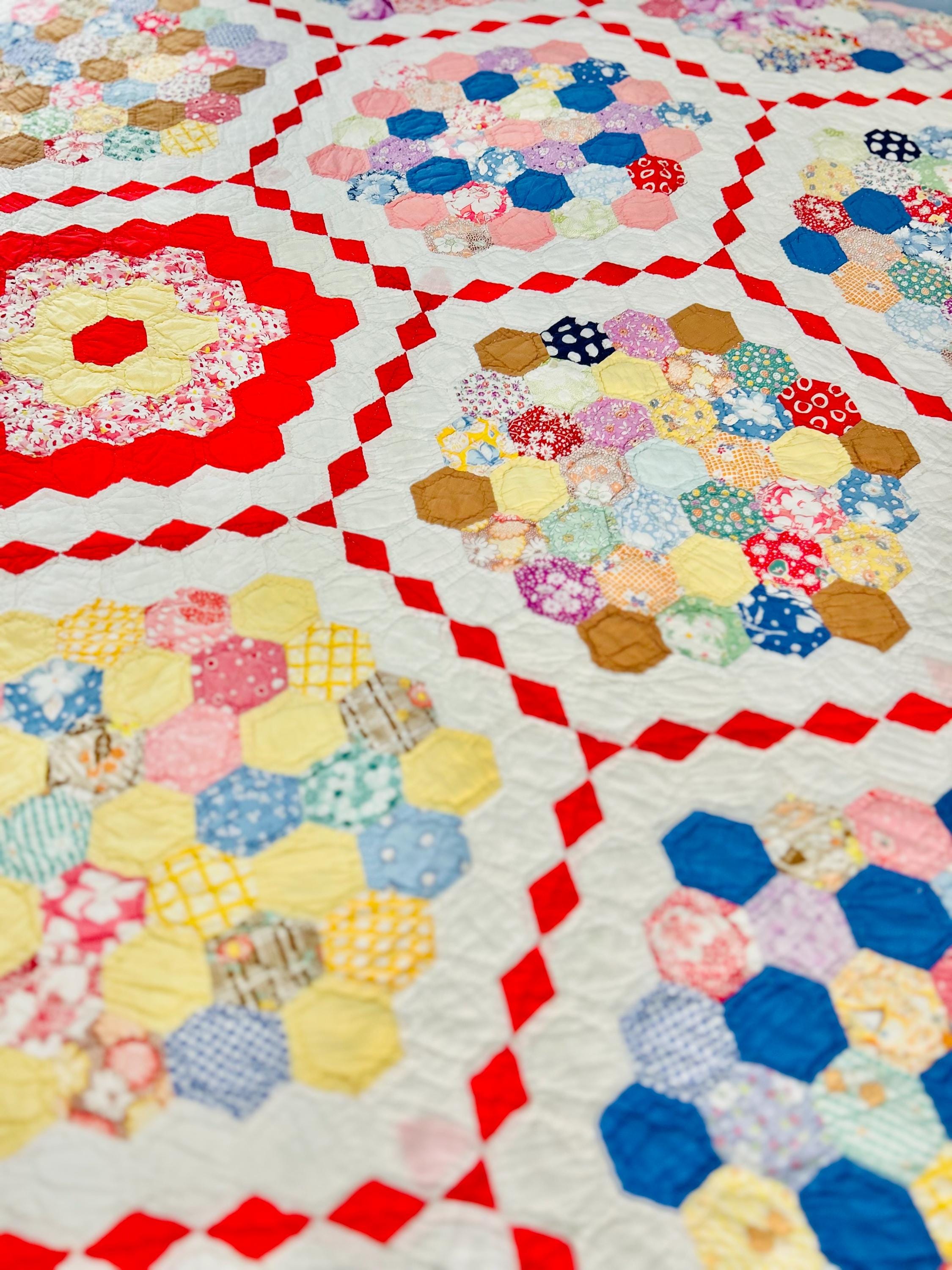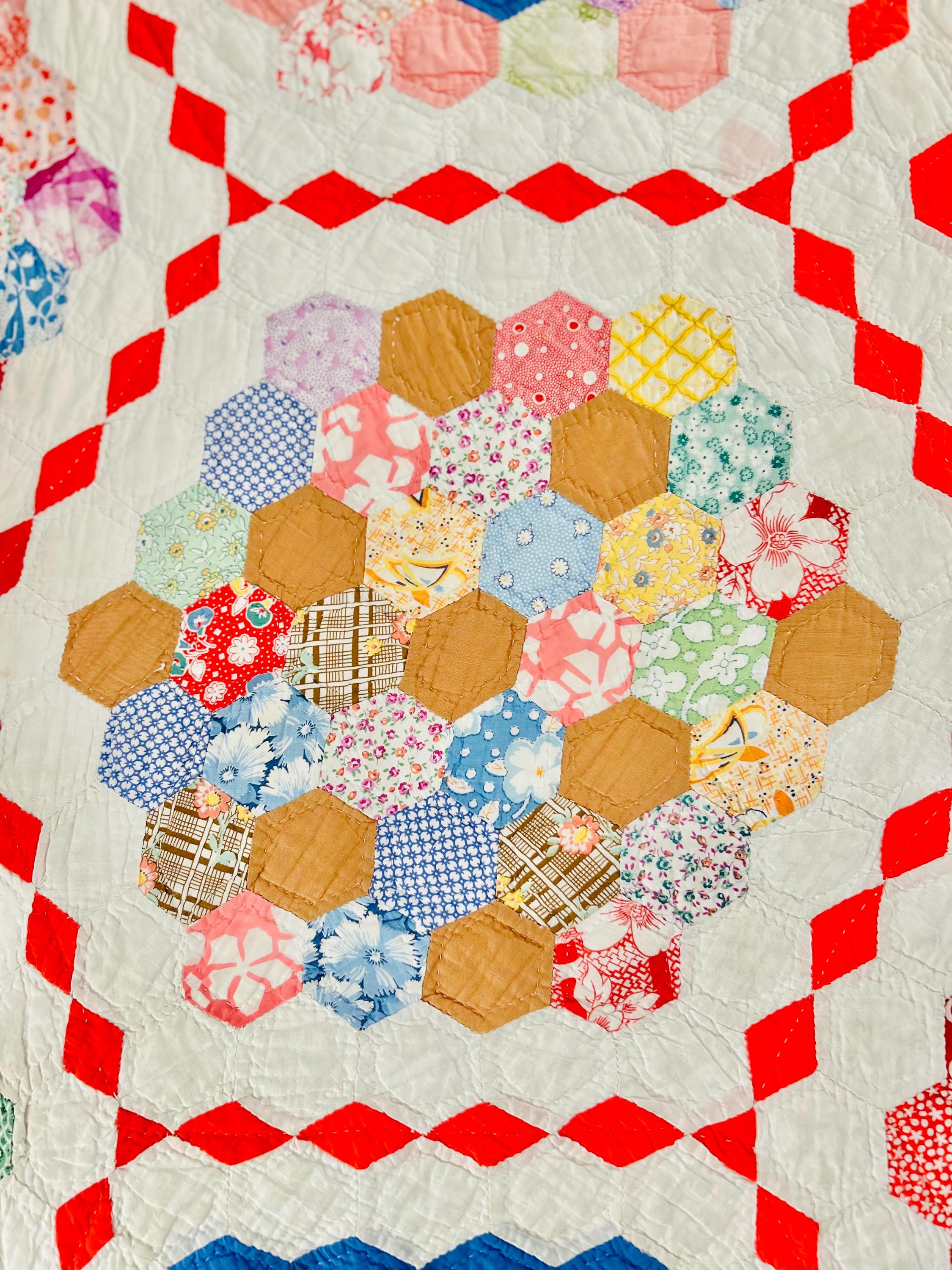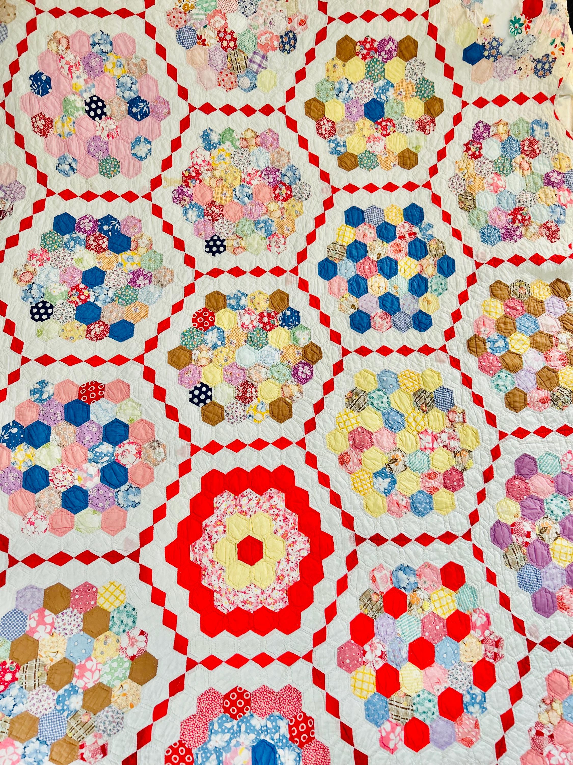 This Grandmother's Flower Garden Cutter Quilt, 1930s, is stunning with its red diamond borders around each large and colorful flower garden. It is beautifully pieced and meticulously hand-quilted in outlines of each of the thousands of hexagons that make up the quilt. The border of the quilt is scalloped, following the lines of the flower gardens.
