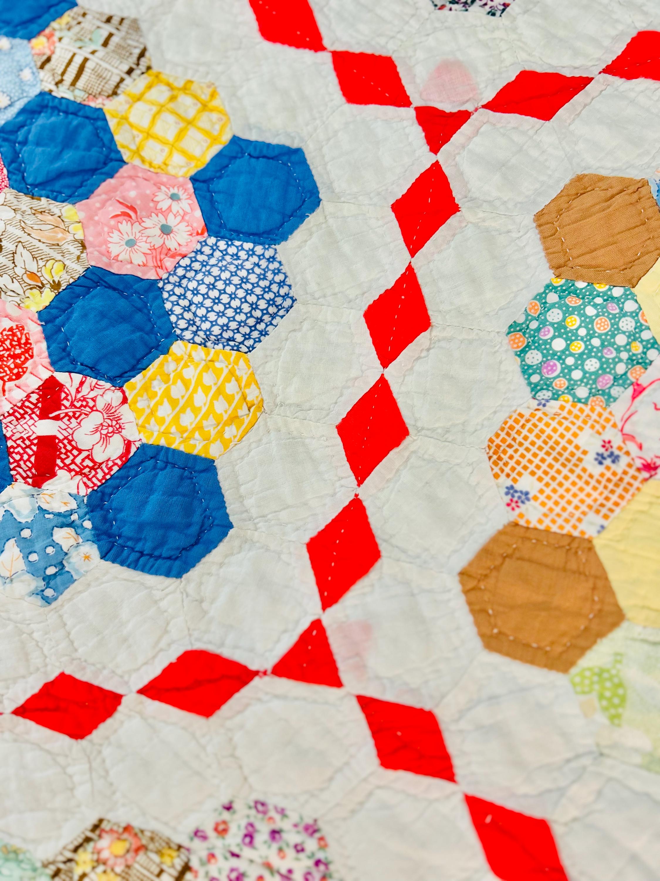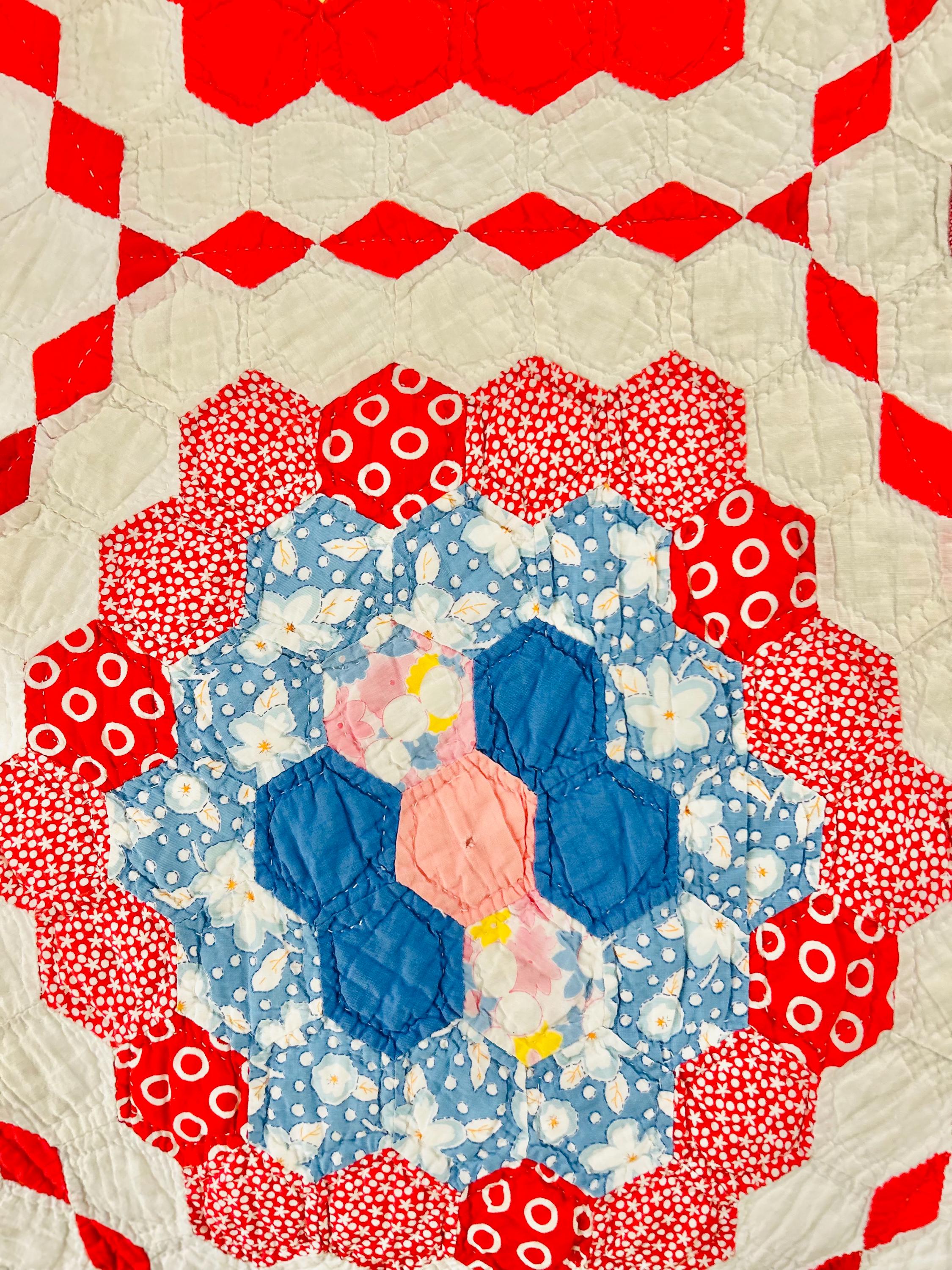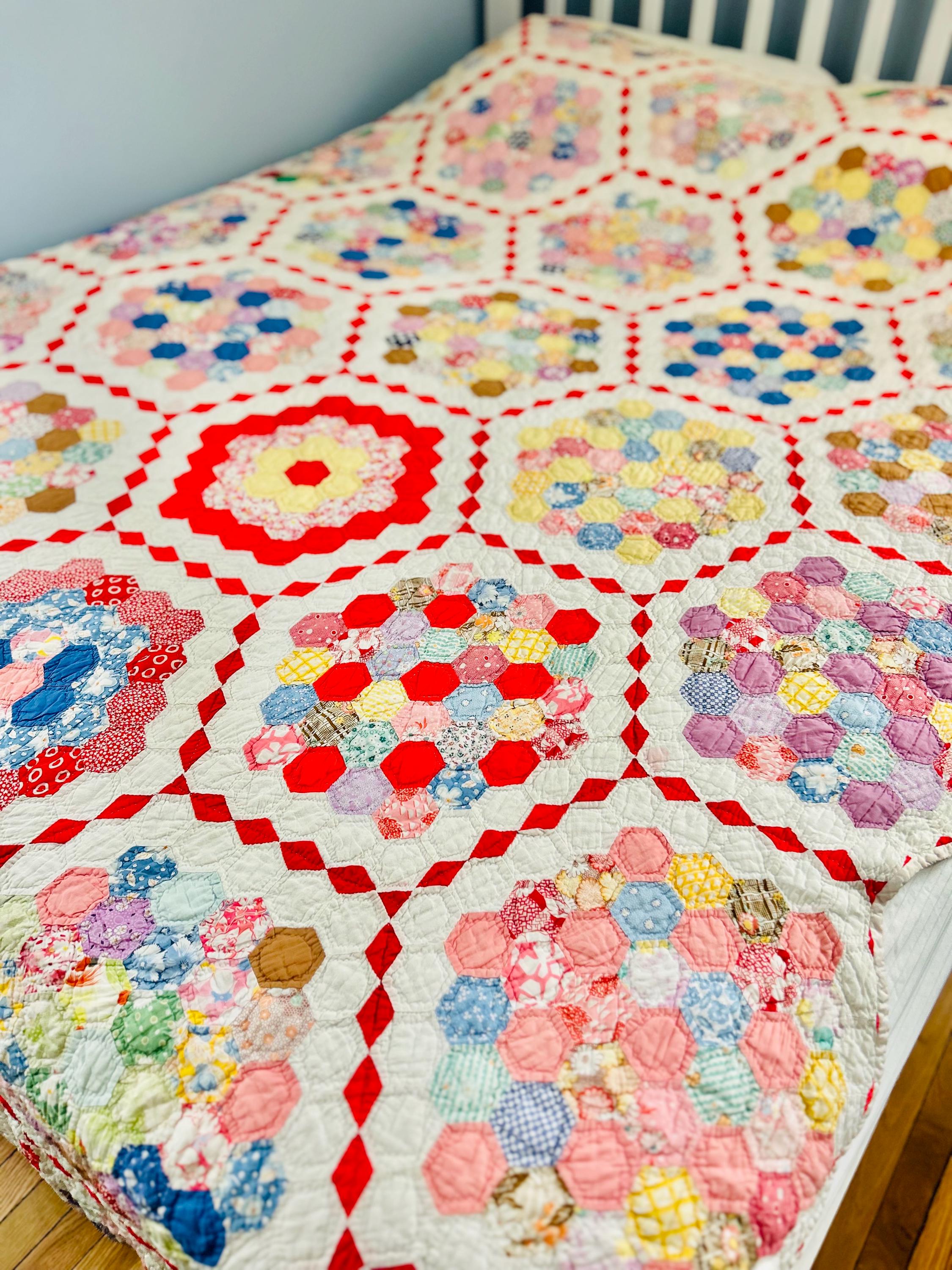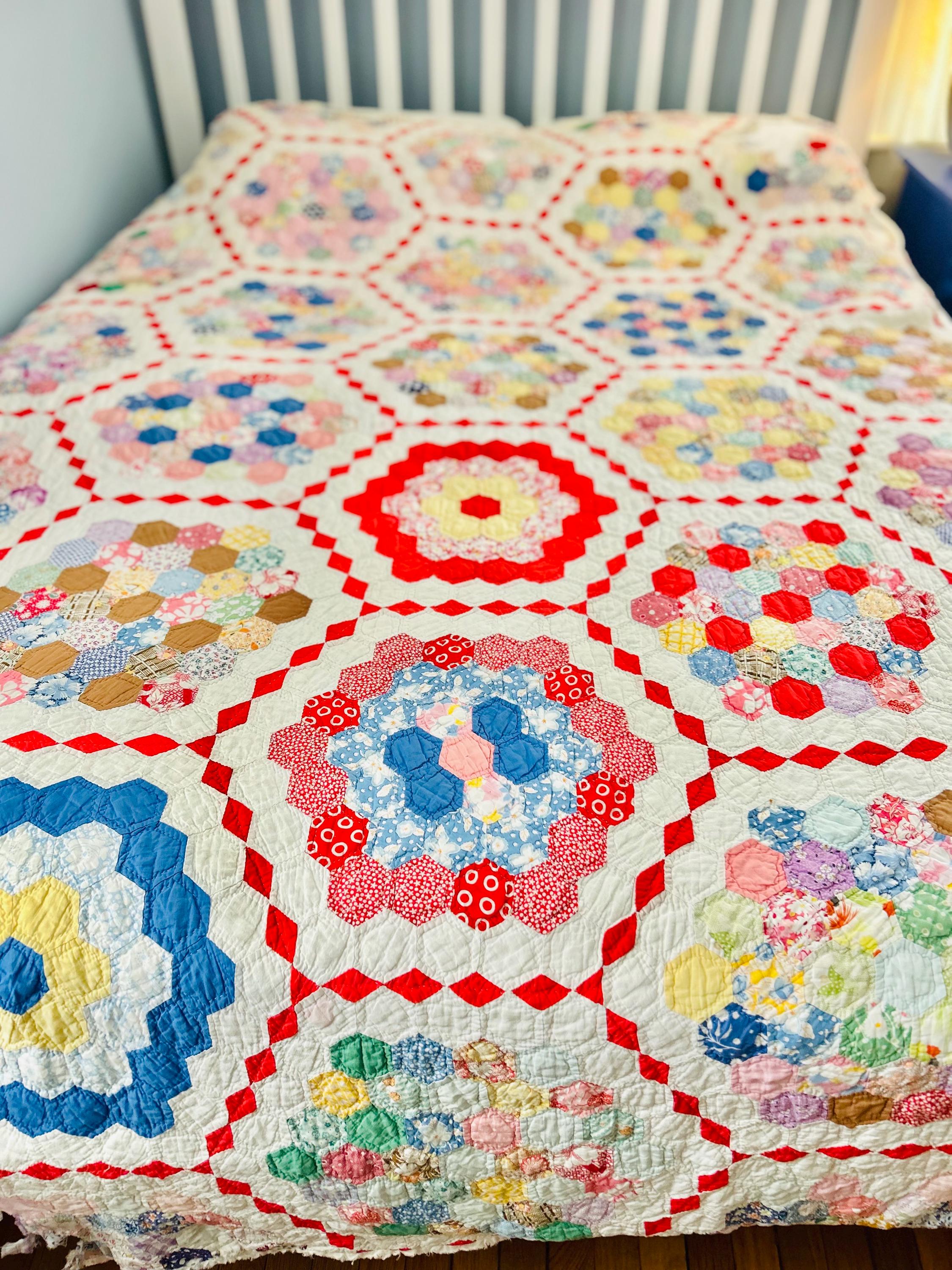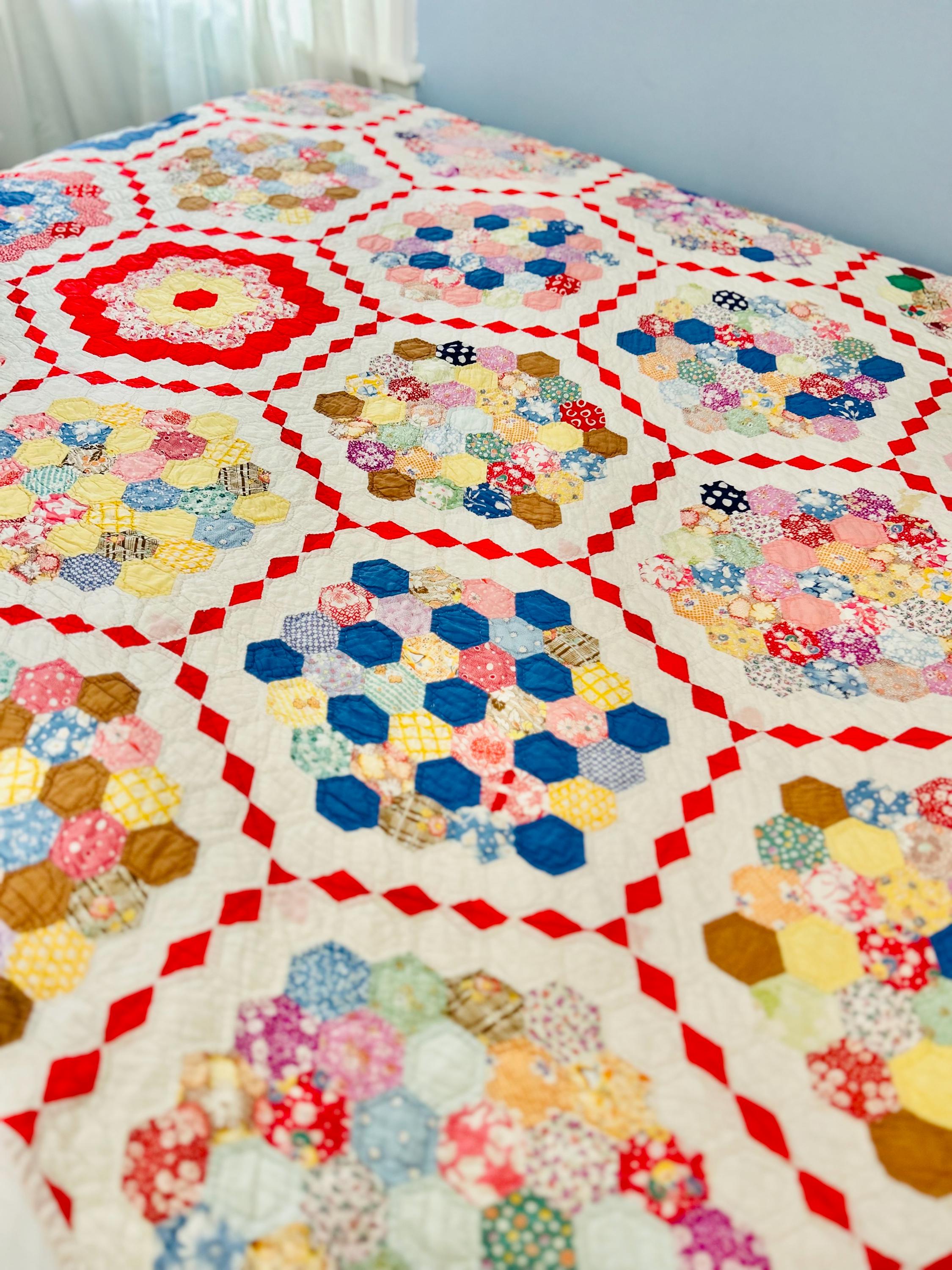 This Grandmother's Flower Garden Cutter Quilt, 1930s, is stunning with its red diamond borders around each large and colorful flower garden. It is beautifully pieced and meticulously hand-quilted in outlines of each of the thousands of hexagons that make up the quilt. The border of the quilt is scalloped, following the lines of the flower gardens.