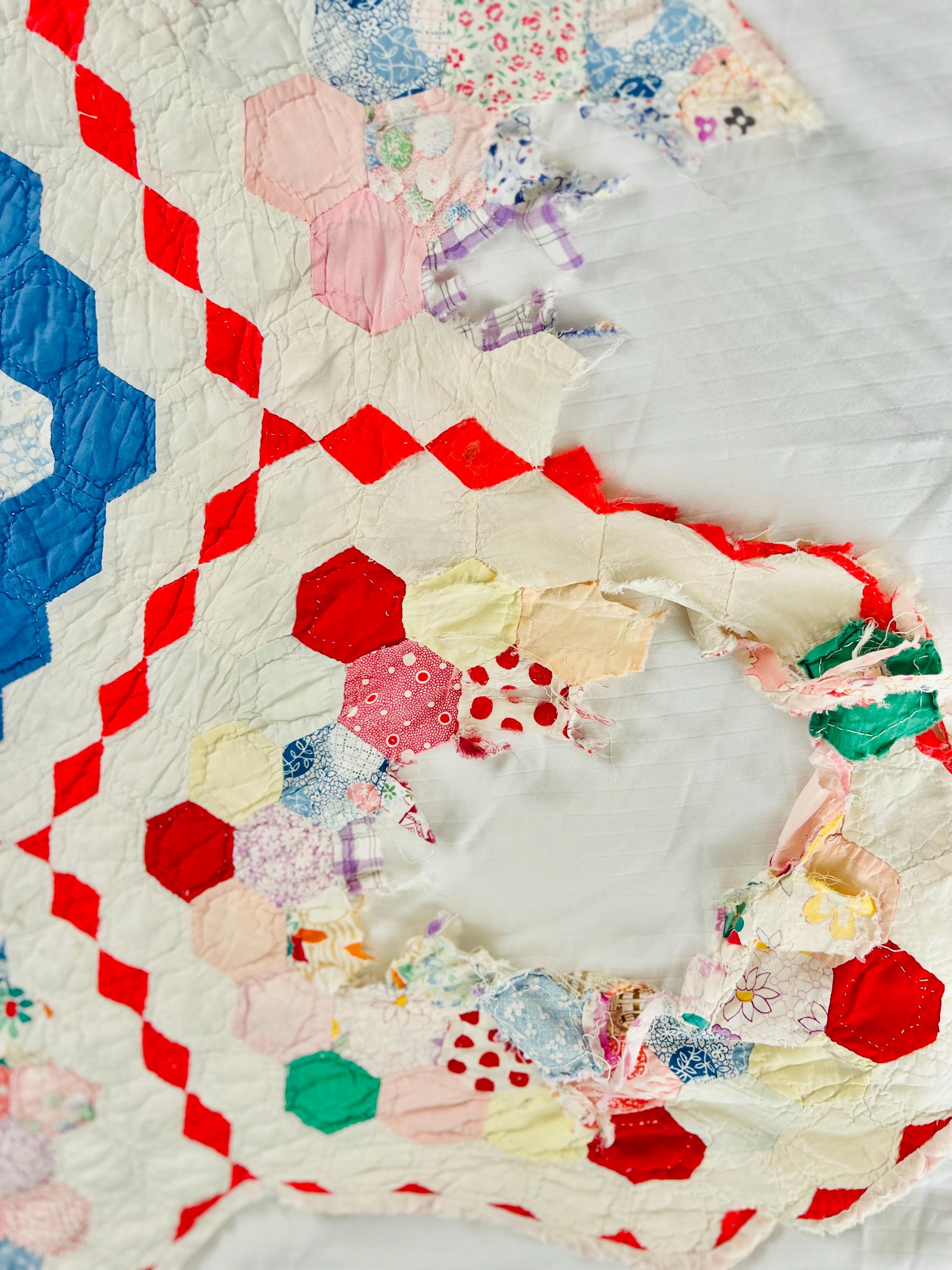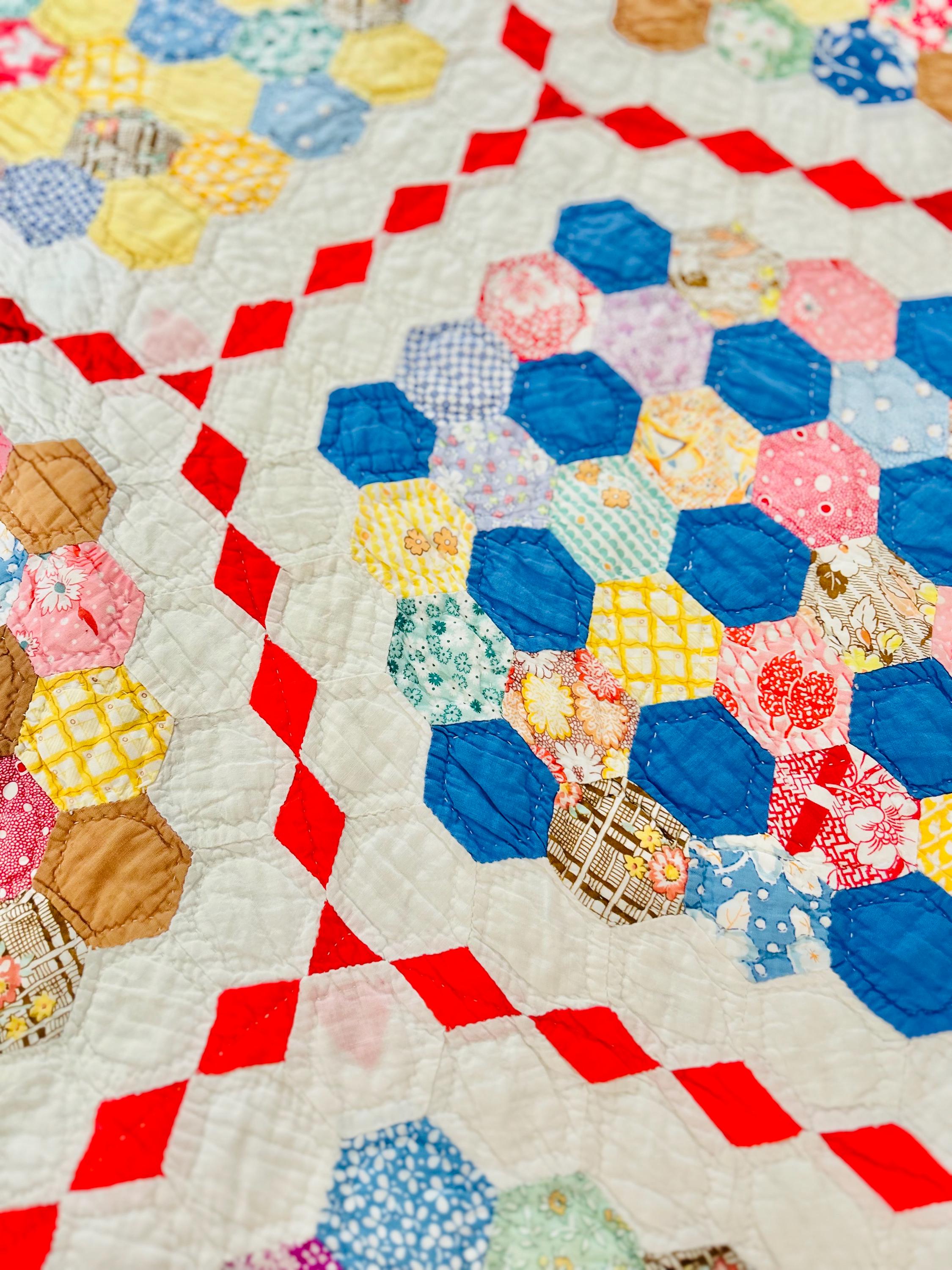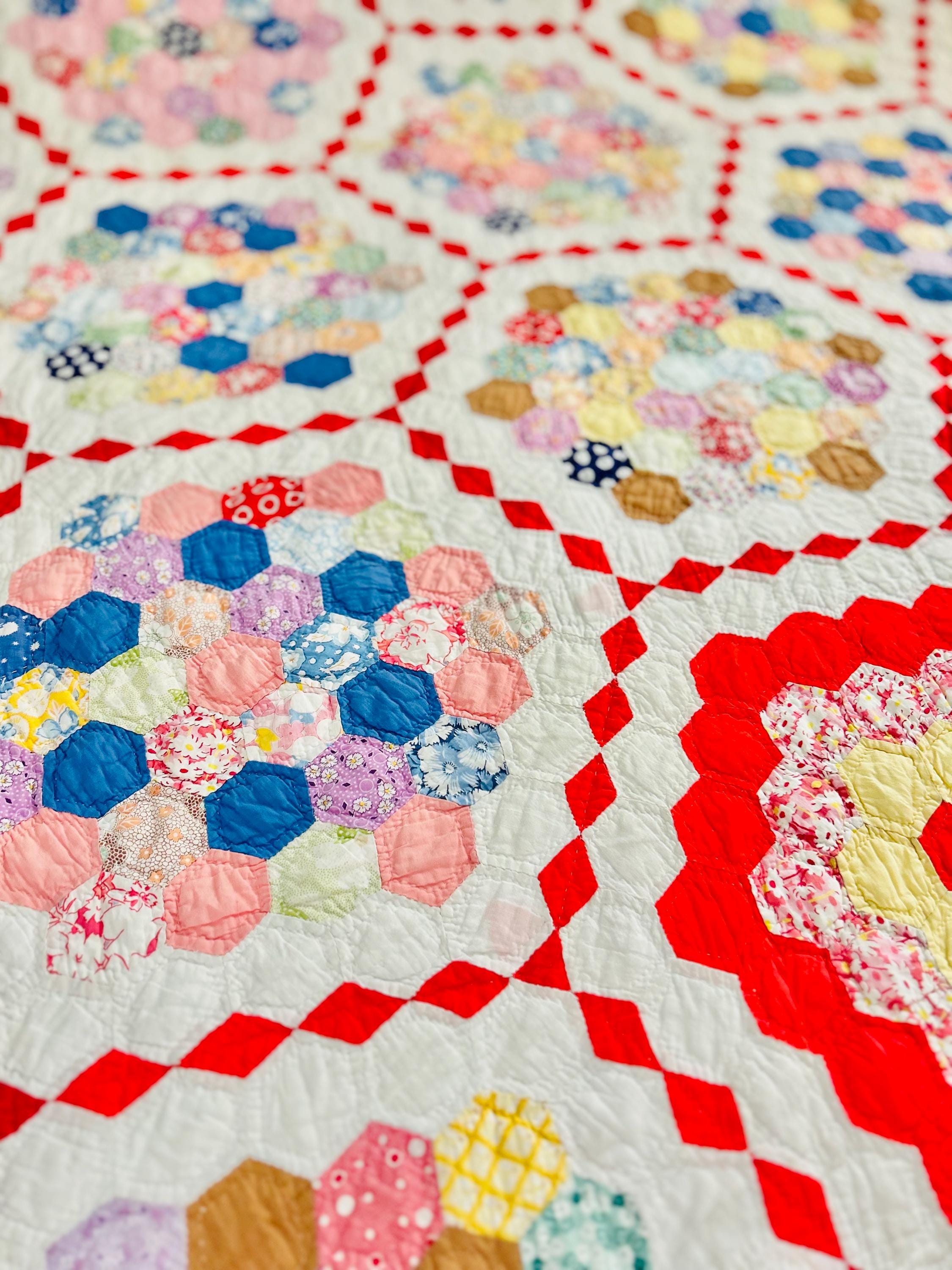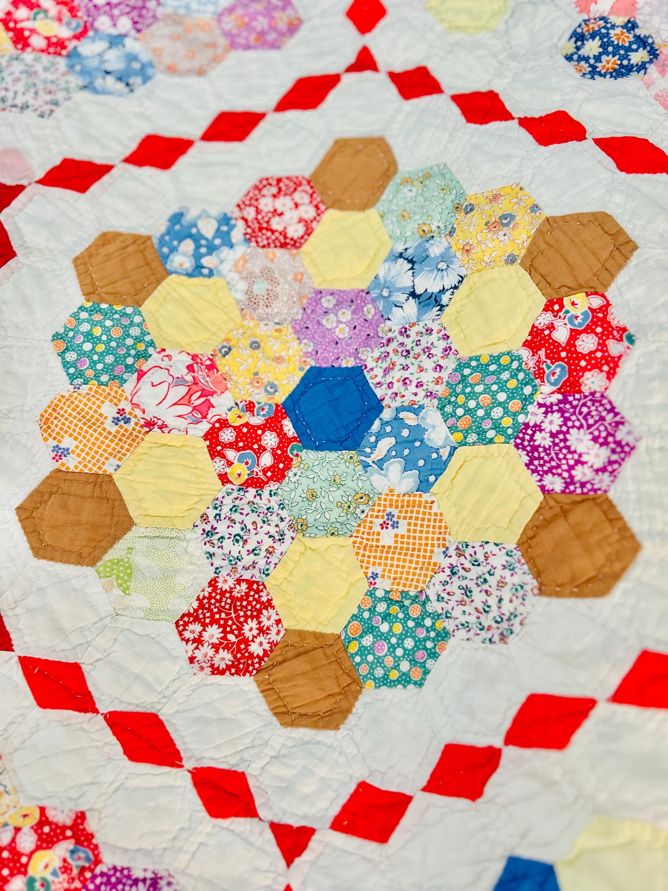 This Grandmother's Flower Garden Cutter Quilt, 1930s, is stunning with its red diamond borders around each large and colorful flower garden. It is beautifully pieced and meticulously hand-quilted in outlines of each of the thousands of hexagons that make up the quilt. The border of the quilt is scalloped, following the lines of the flower gardens.