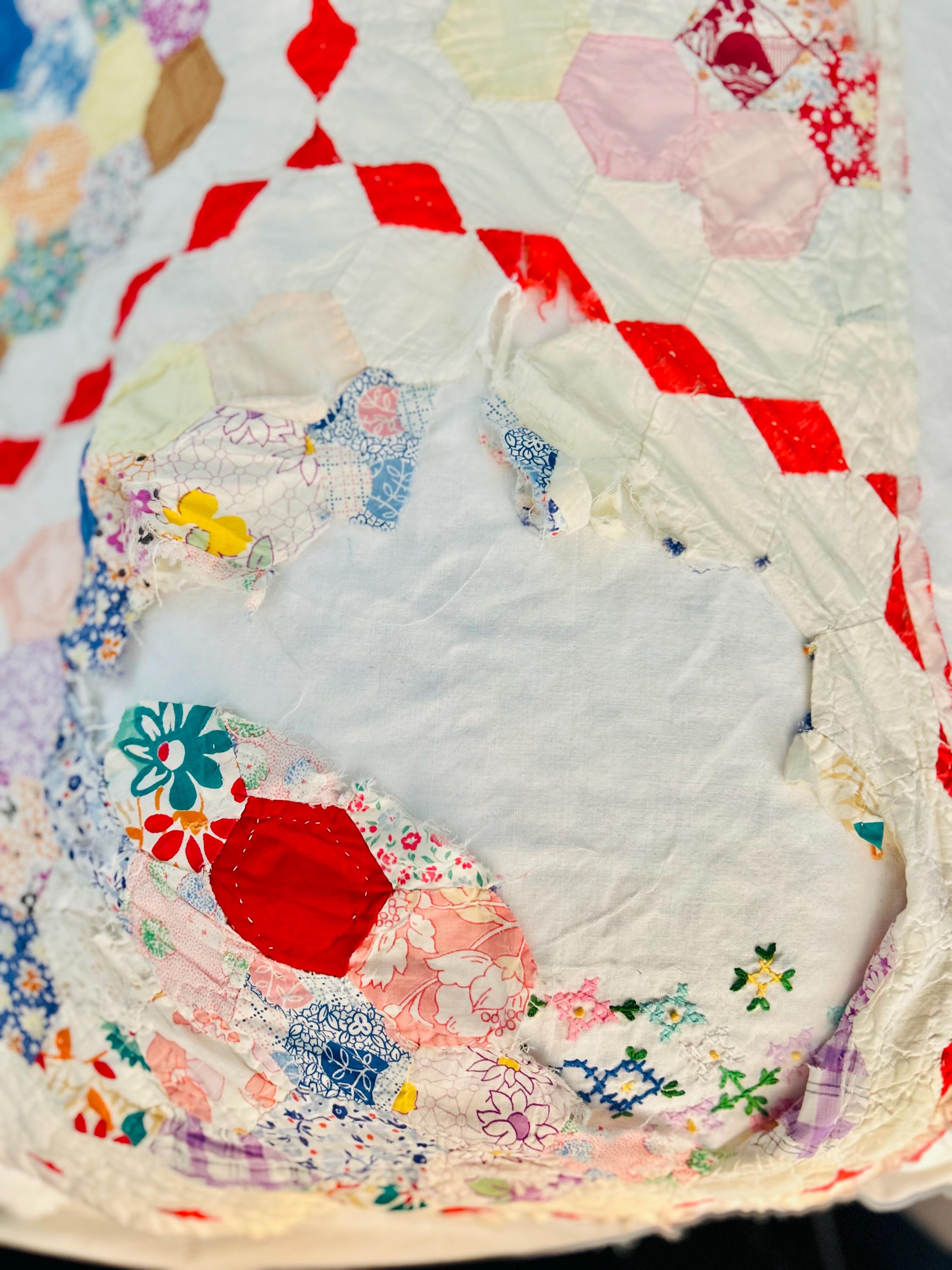 Ninety-percent of the quilt is in excellent condition, but unfortunately the quilt has suffered damage to two corners (on the top right and on the bottom left) - see photos -- which has left those corners in shreds (see photos). The binding in those two corners is gone, while in the rest of the quilt the binding shows beginning signs of fraying.