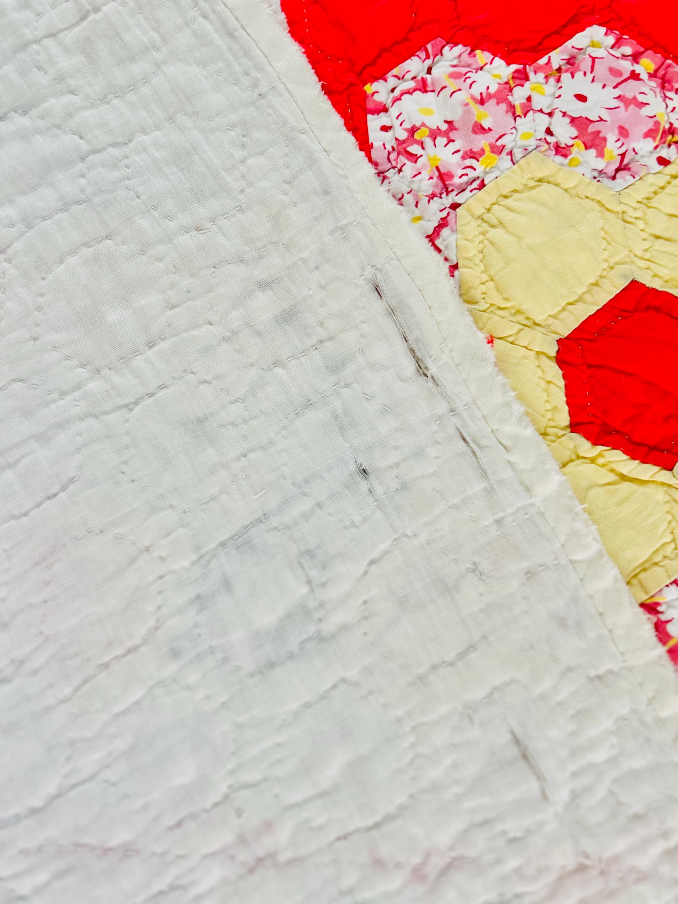 The back is white cotton as is the binding that has been machine stitched to the front and hand-stitched to the back. The cotton batting is lightweight.