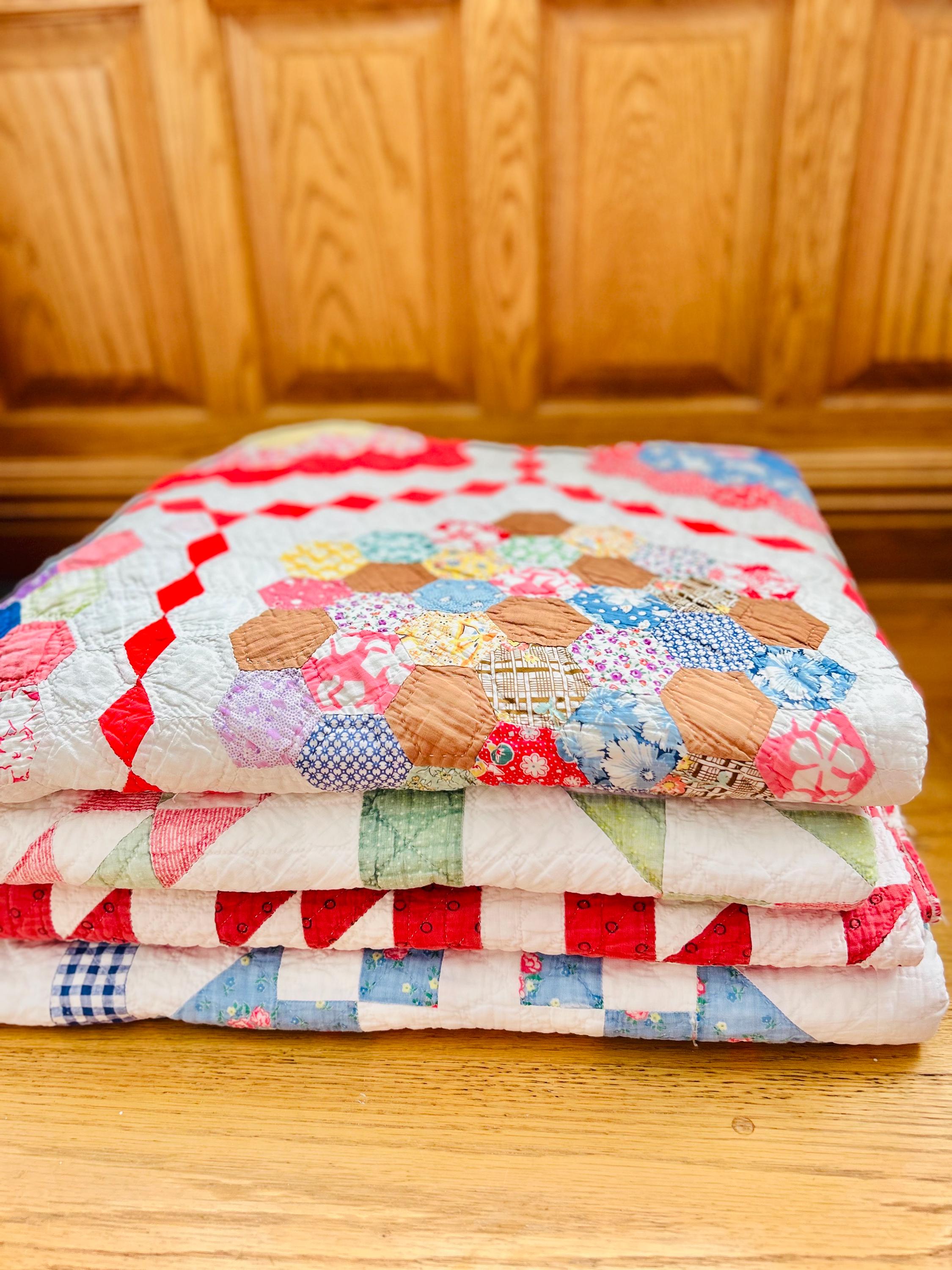 The quilt has been soaked, hand-washed and line-dried and it comes from a smoke-free and pet-free home. It measures 66 inches by 91 inches. Shown on a queen-size bed.