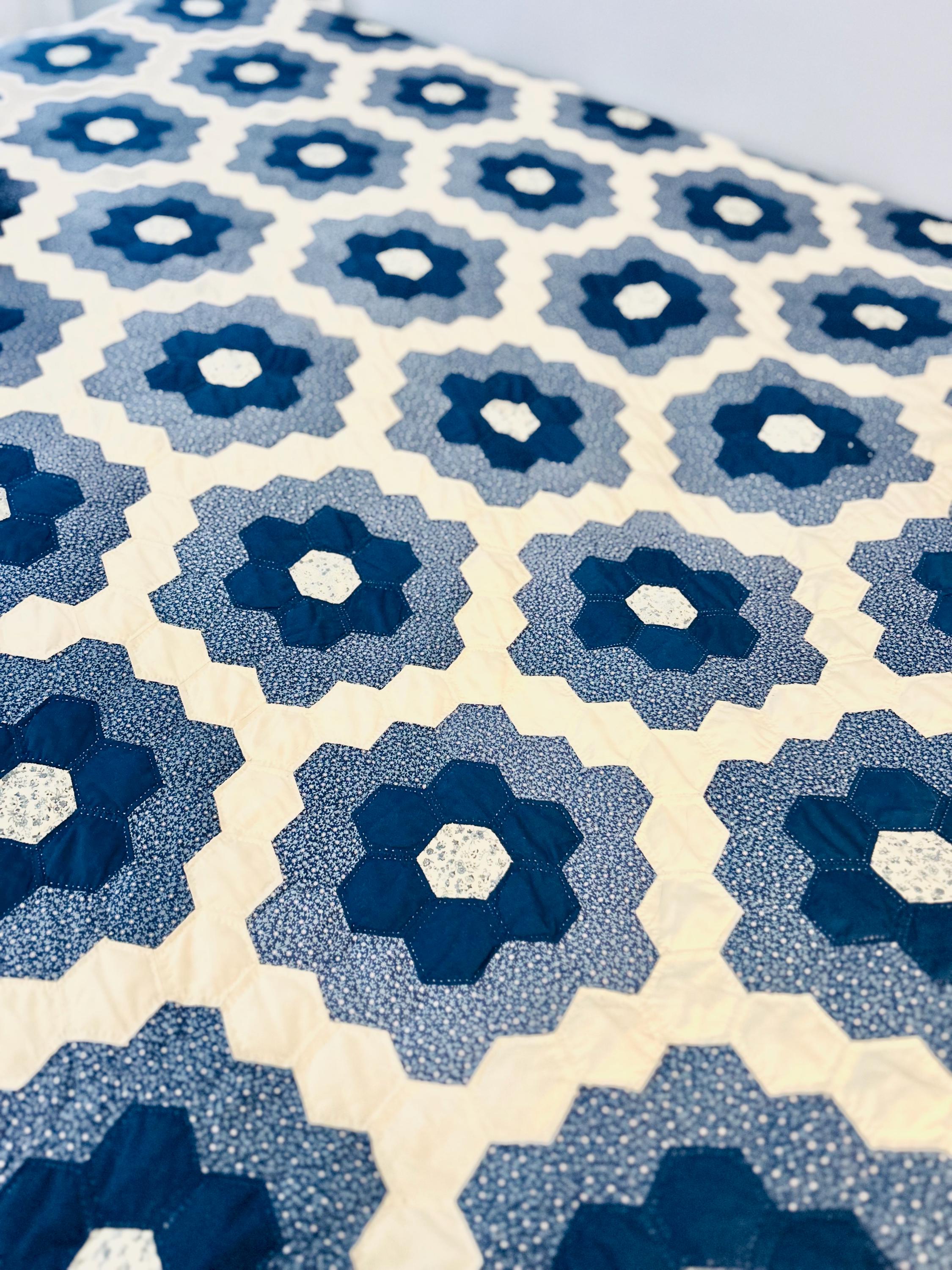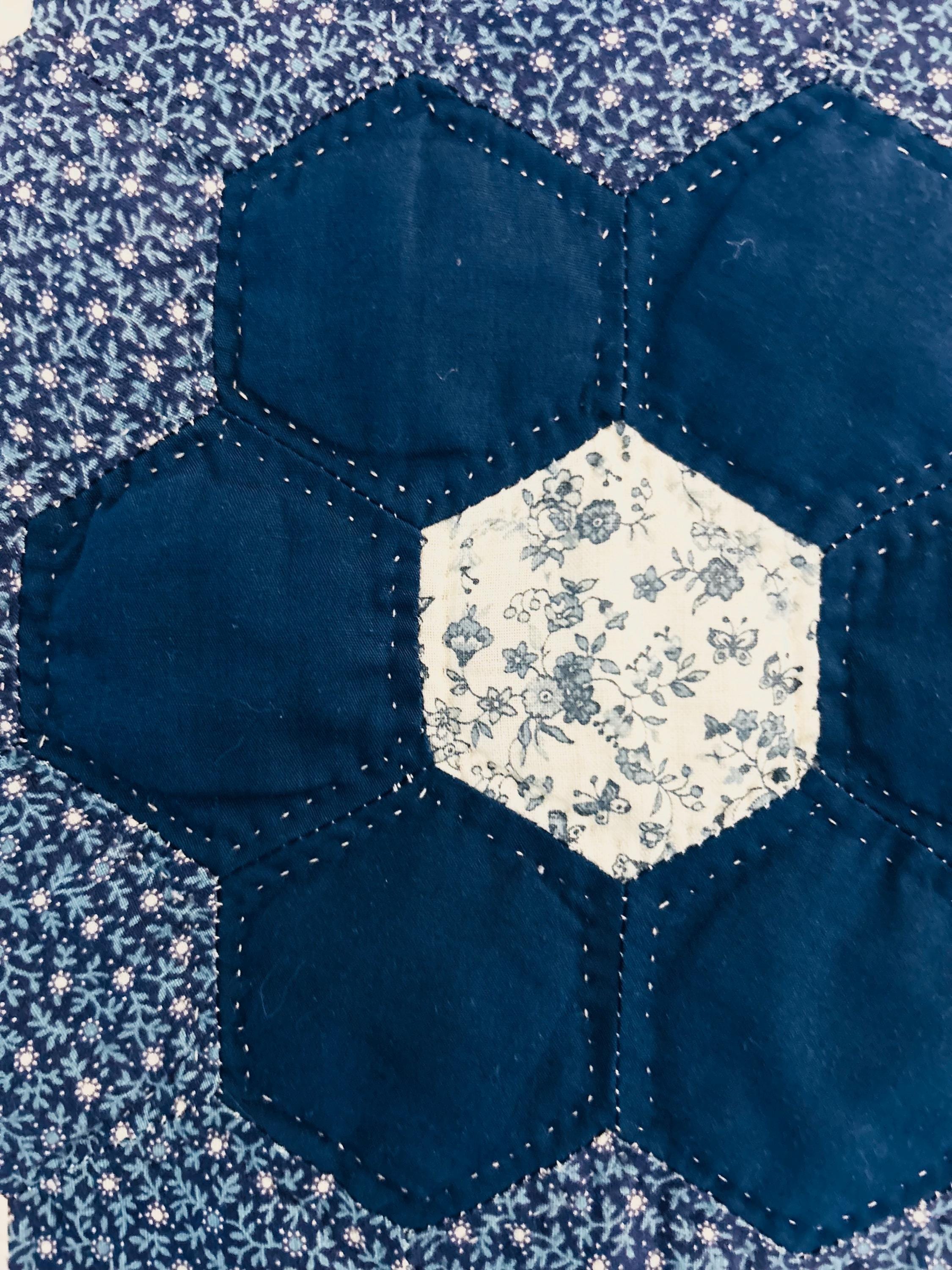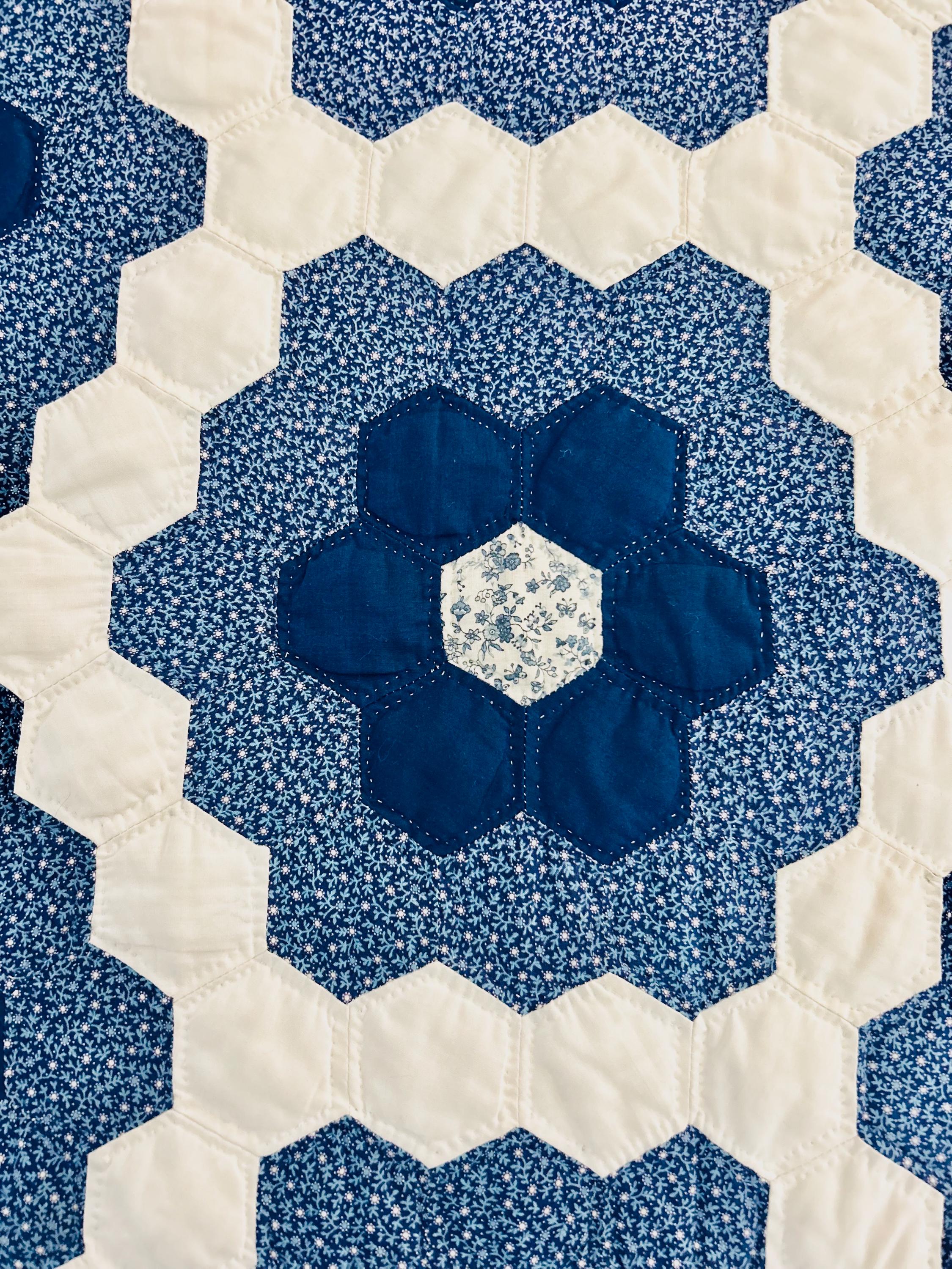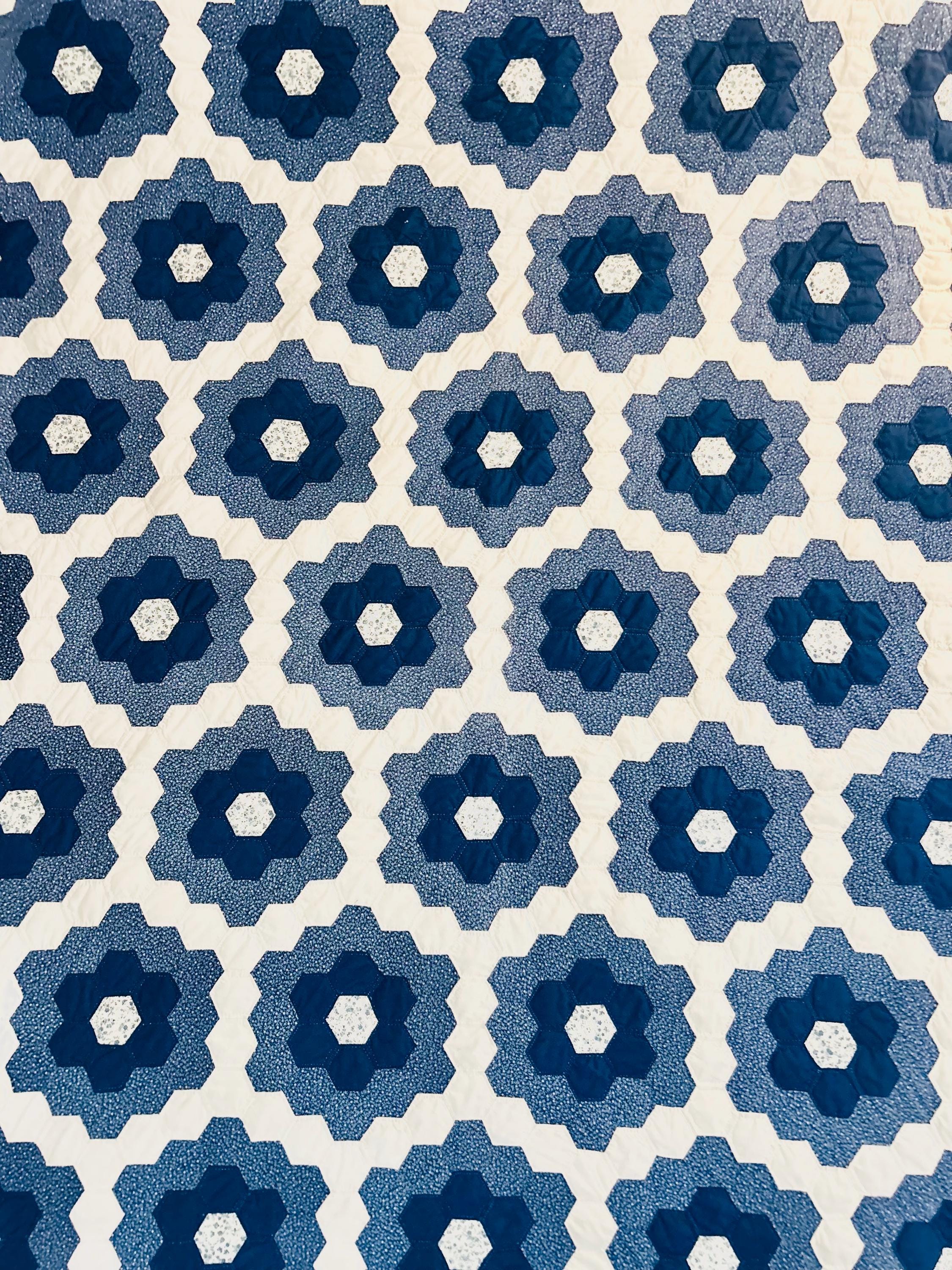 This very large Grandmother's Flower Garden Quilt is circa 1940-1950s and is made up of more than 5,000 hexagons, each of which has been hand-quilted in the shape of the hexagon.