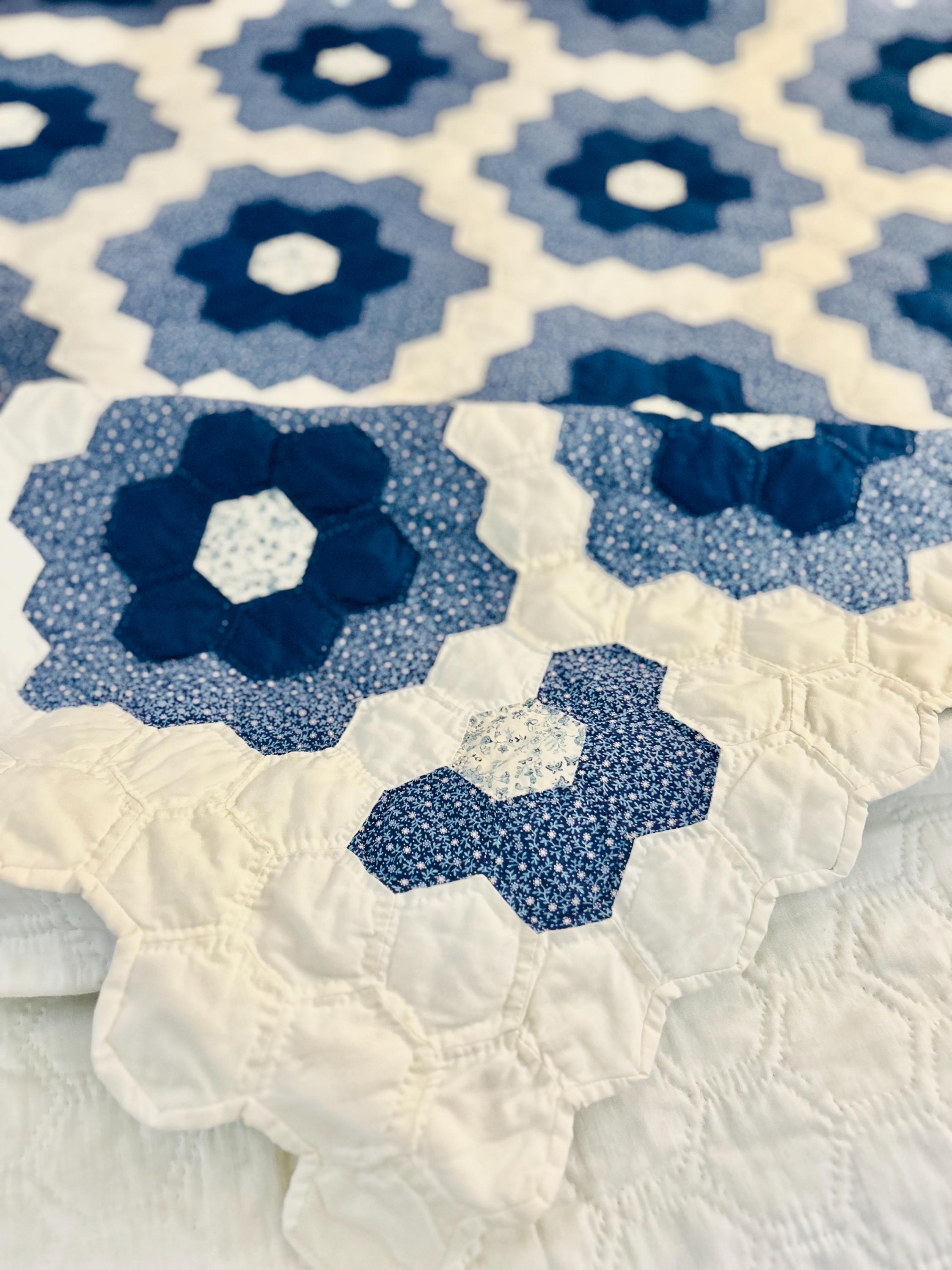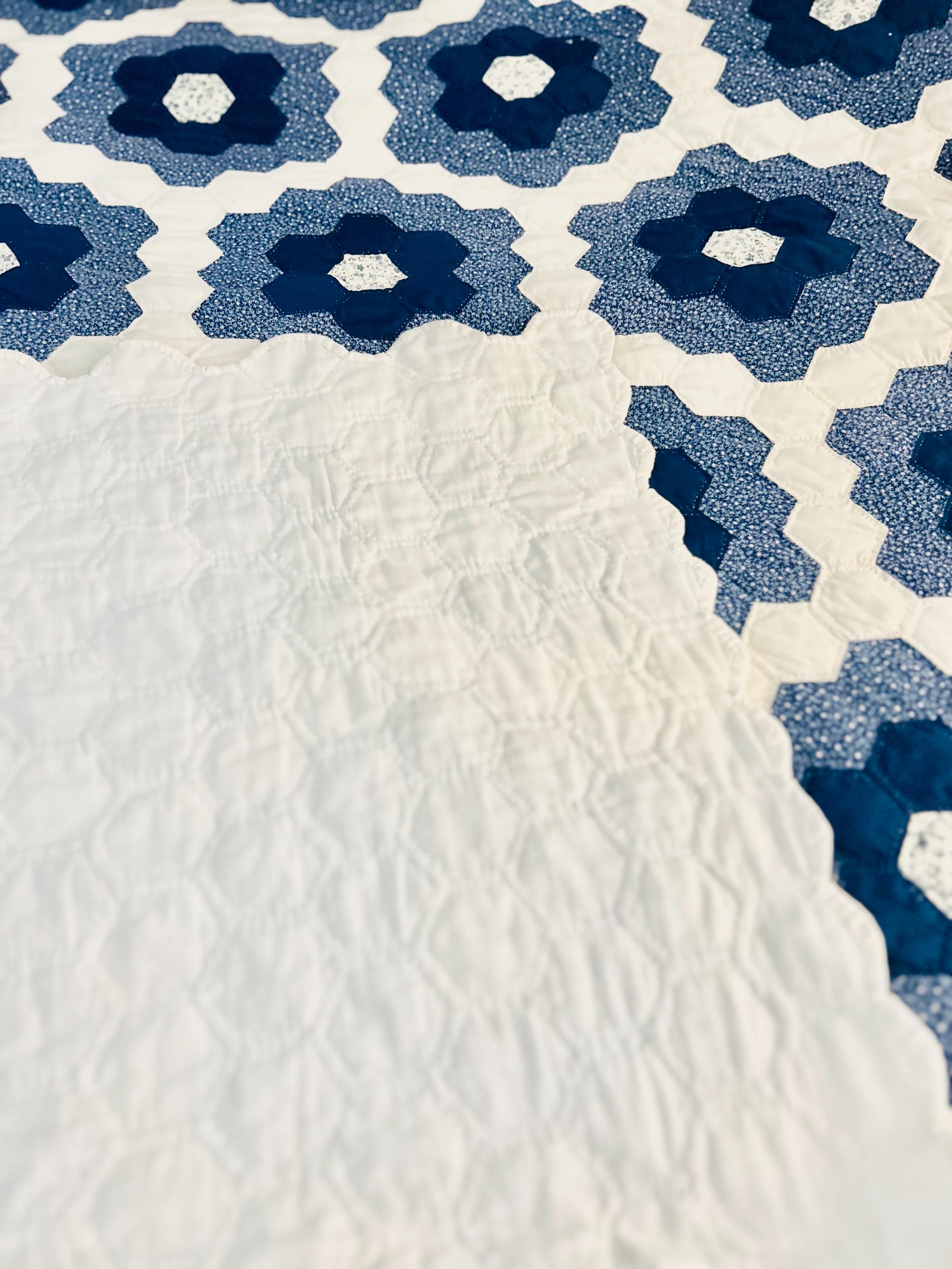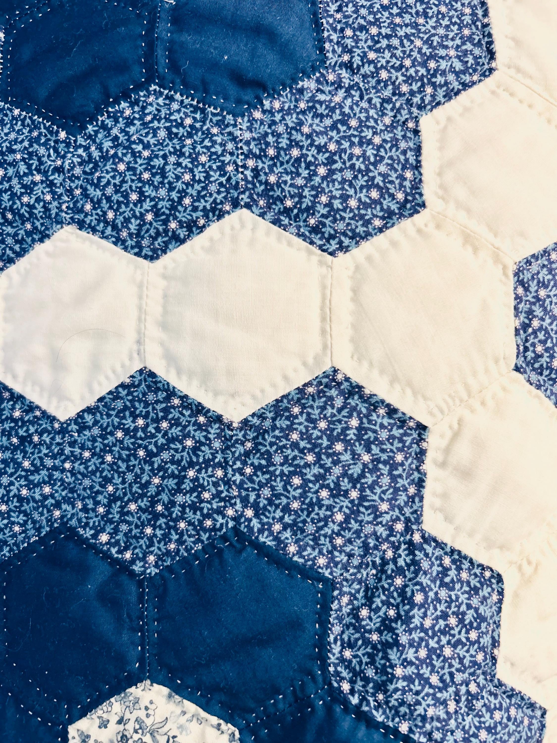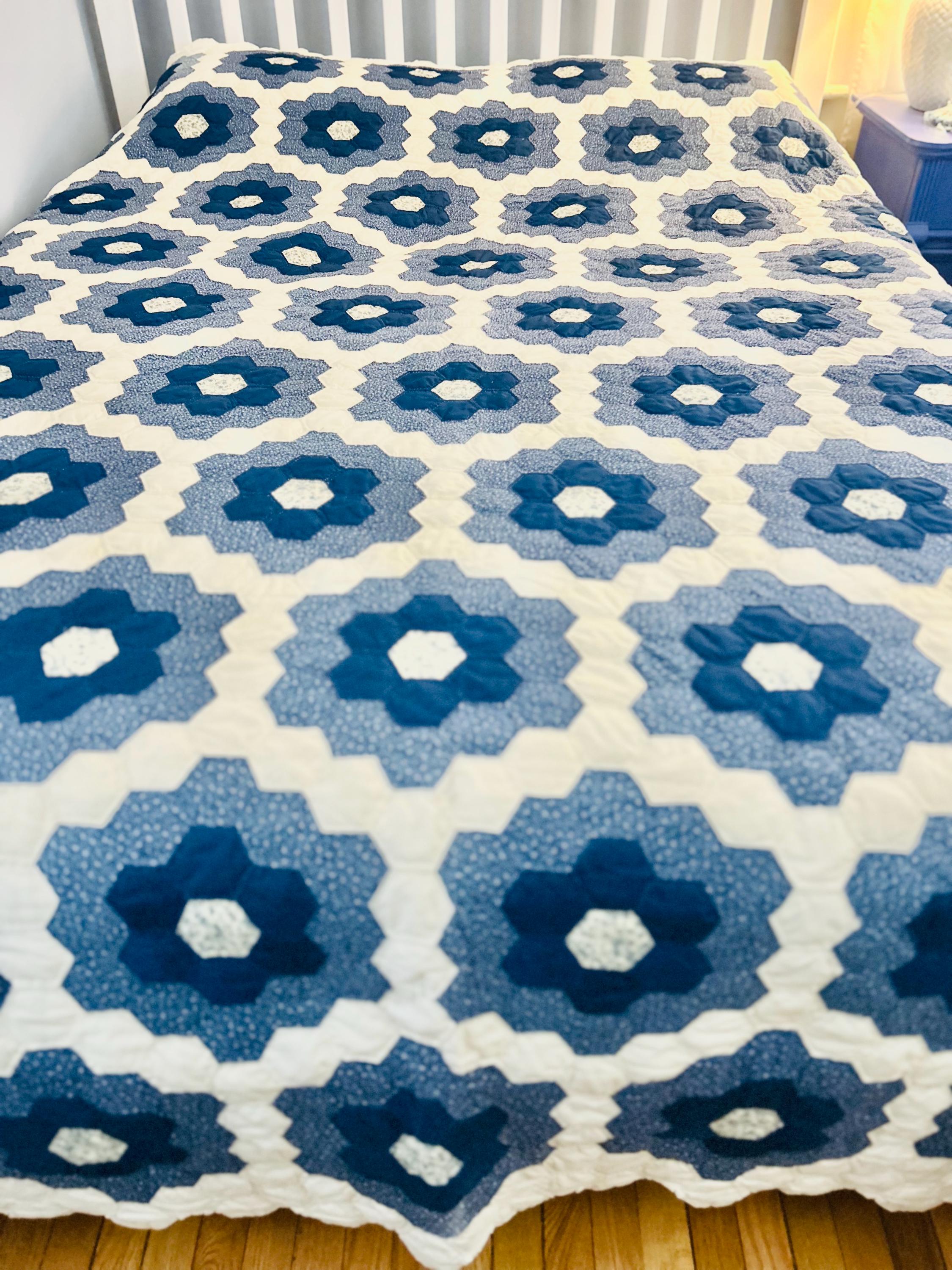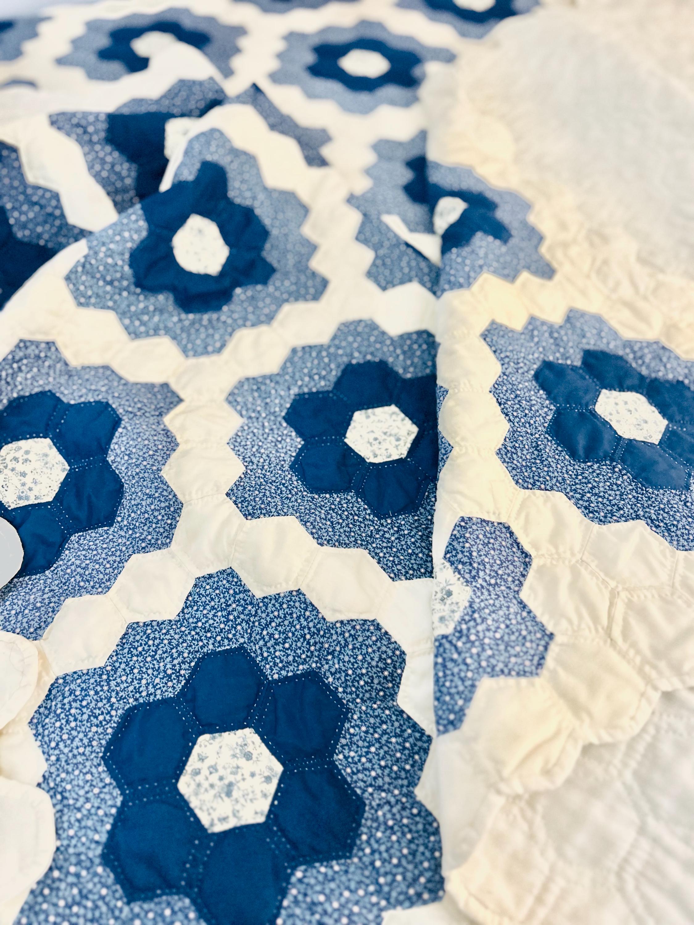 This very large Grandmother's Flower Garden Quilt is circa 1940-1950s and is made up of more than 5,000 hexagons, each of which has been hand-quilted in the shape of the hexagon.
